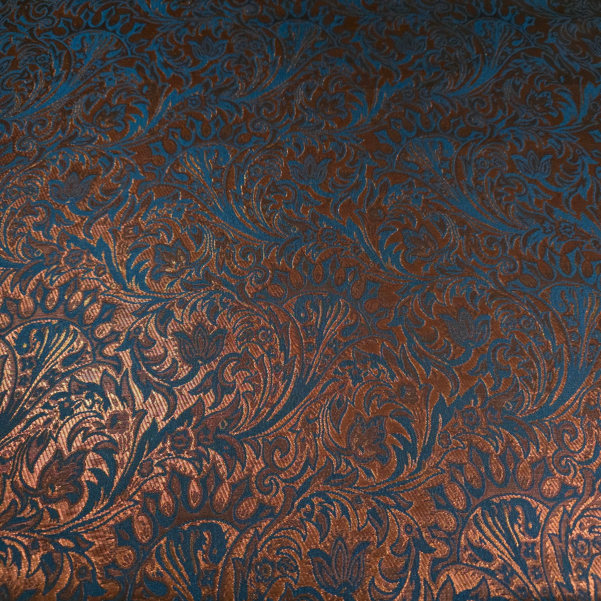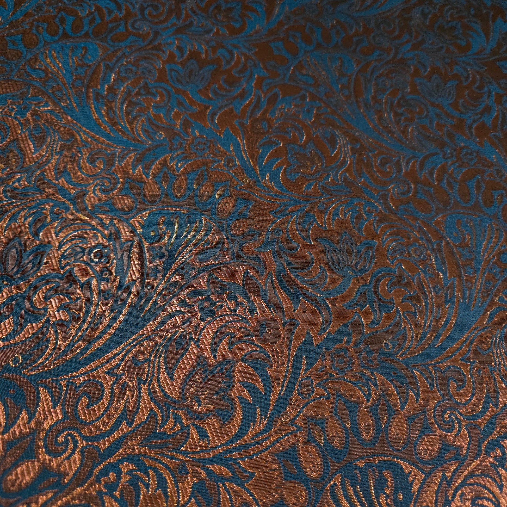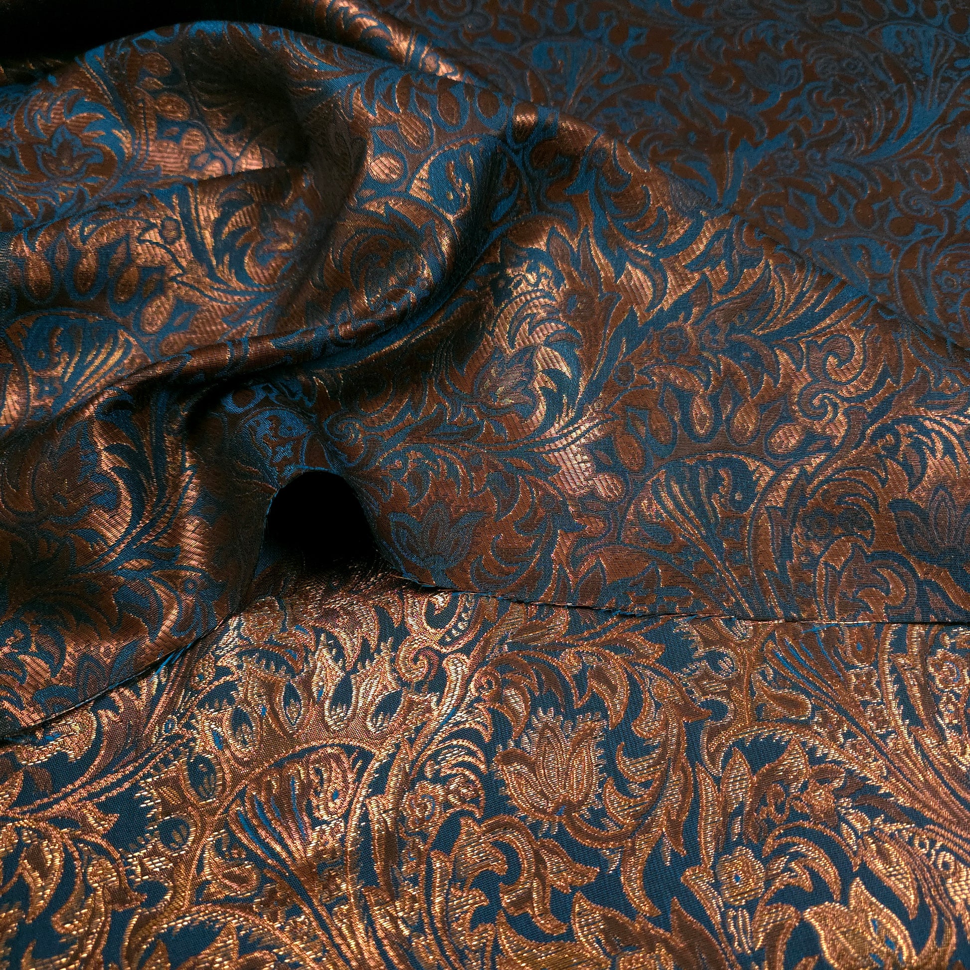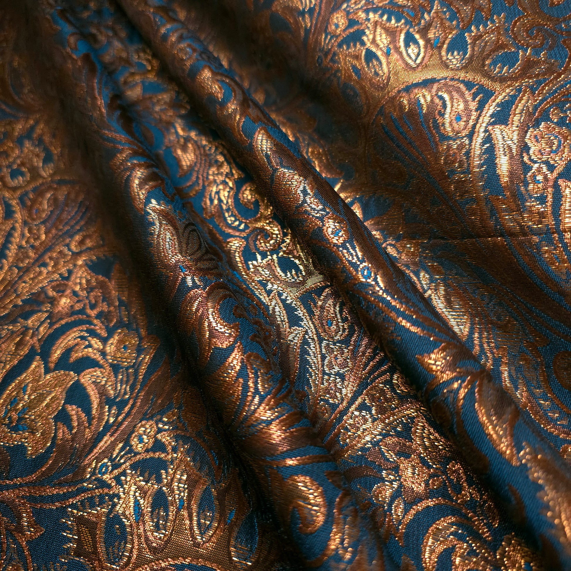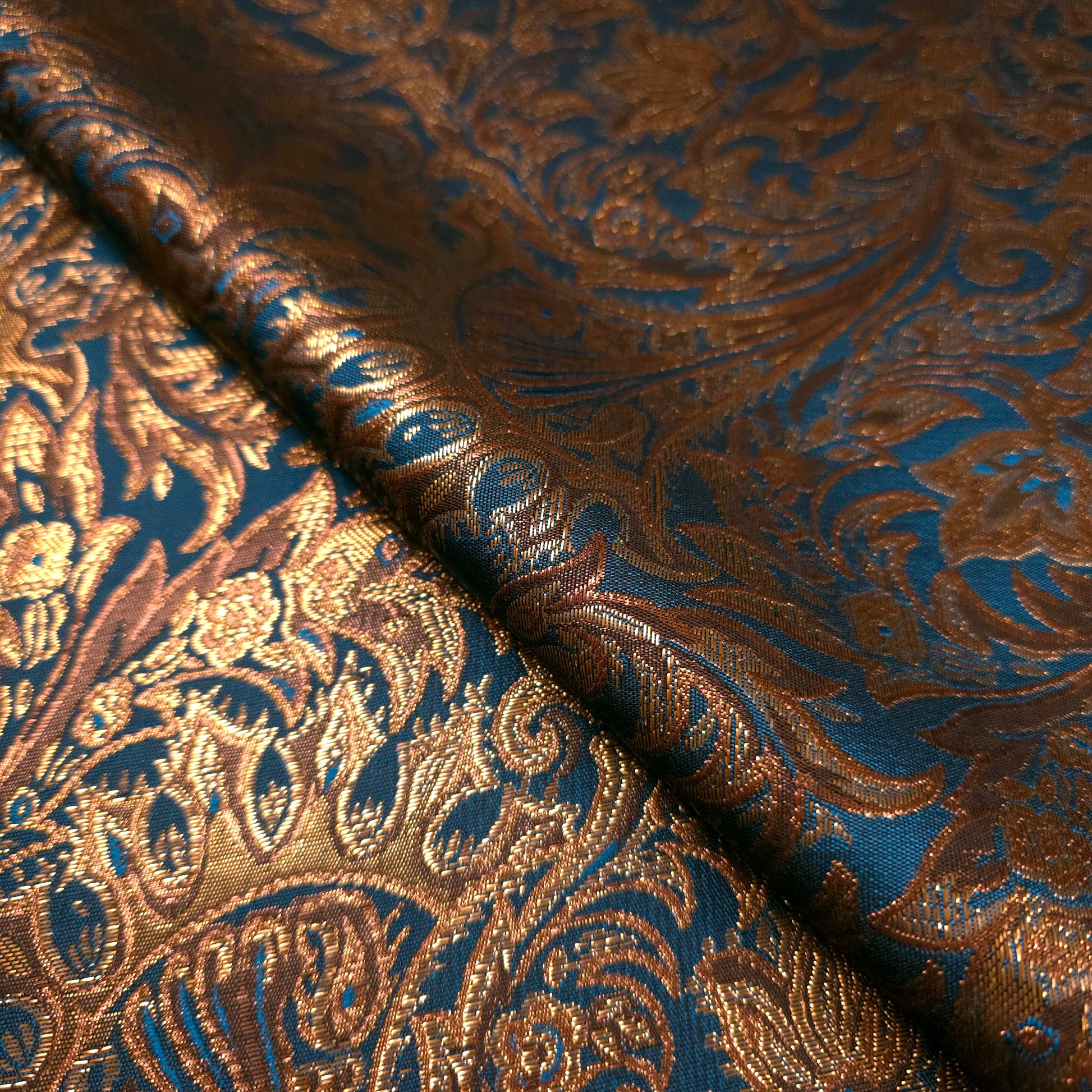 This stunning, medium-weight brocade jacquard fabric features an intricate, large-scale paisley and floral scrollwork pattern. Woven with deep teal and metallic bronze threads, this fabric is fully reversible, offering two distinct luxury looks in one textile. One side showcases a lustrous bronze pattern on a teal background, while the reverse features the teal pattern on a bronze background. It possesses a great, fluid drape making it ideal for elegant drapery, while its durable medium weight also suits statement upholstery, formal wear, and high-end accessory projects. This versatile fabric is 54 inches wide and is sold by the yard.