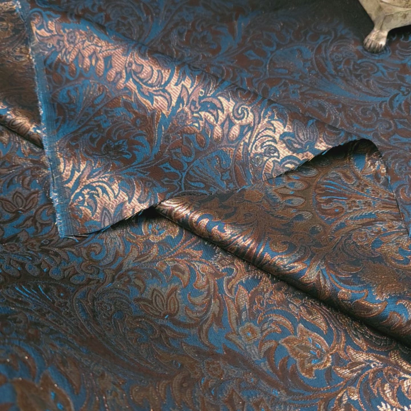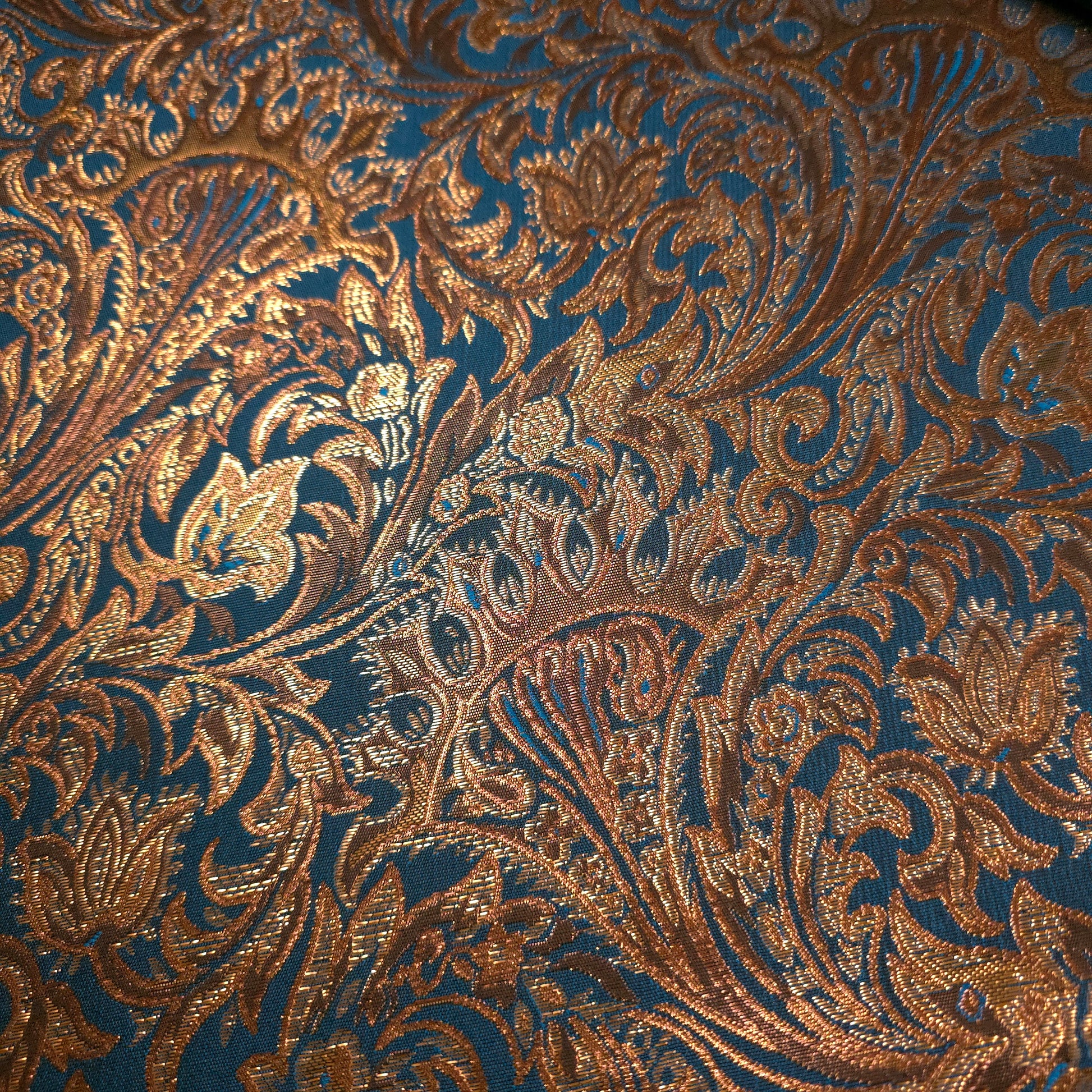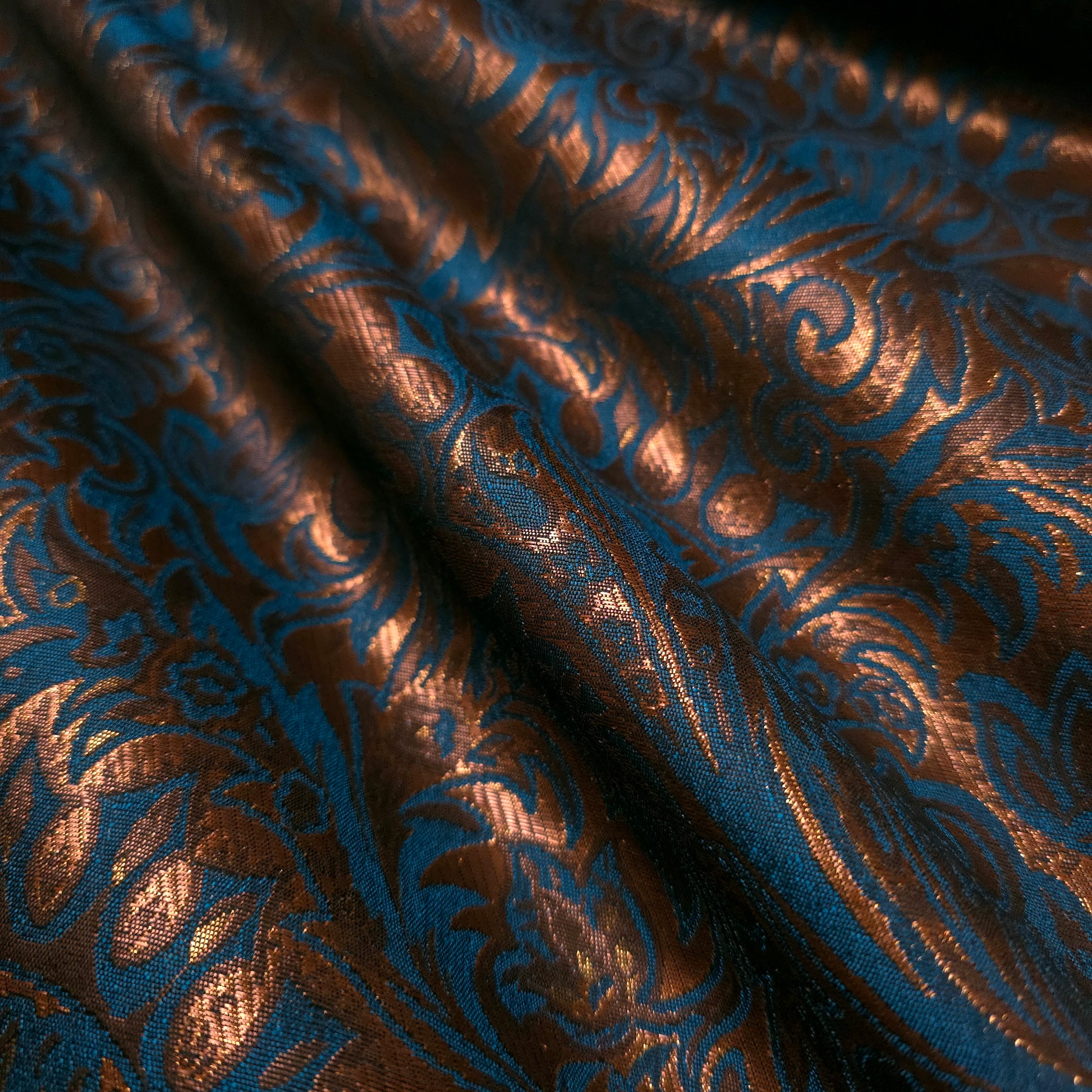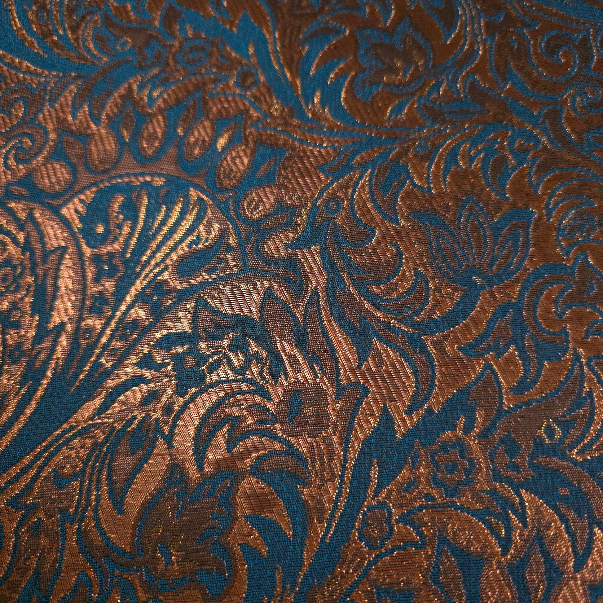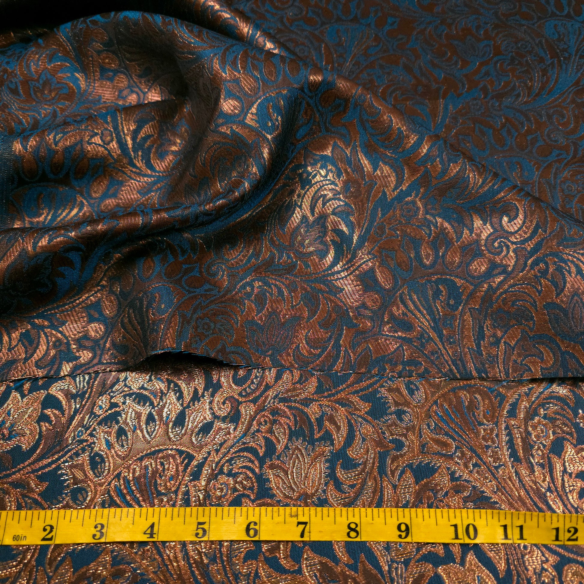 This stunning, medium-weight brocade jacquard fabric features an intricate, large-scale paisley and floral scrollwork pattern. Woven with deep teal and metallic bronze threads, this fabric is fully reversible, offering two distinct luxury looks in one textile. One side showcases a lustrous bronze pattern on a teal background, while the reverse features the teal pattern on a bronze background. It possesses a great, fluid drape making it ideal for elegant drapery, while its durable medium weight also suits statement upholstery, formal wear, and high-end accessory projects. This versatile fabric is 54 inches wide and is sold by the yard.