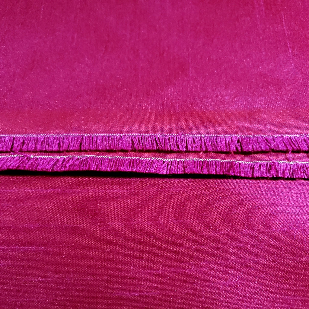 Dupioni fabric is a plain-woven fabric. Using a fine yard on the warp and an uneven yarn on the weft. This creates visual and textural raised thin stripes in the fabric. The thread used here has a subtle sheen to it. giving it a subtle color refracting iridescence.