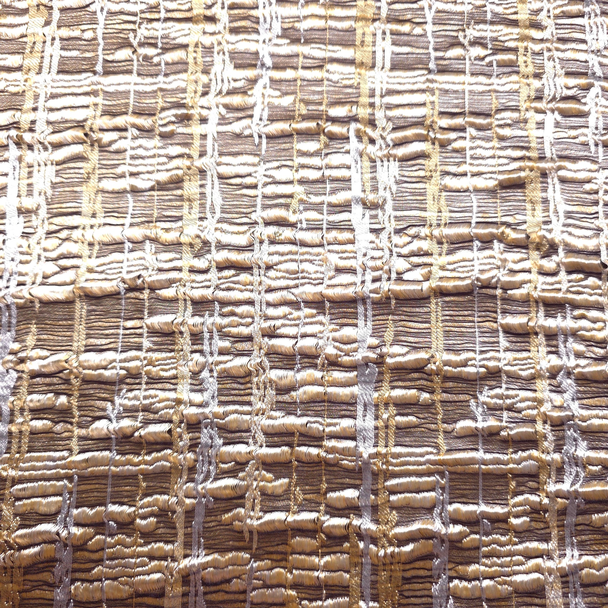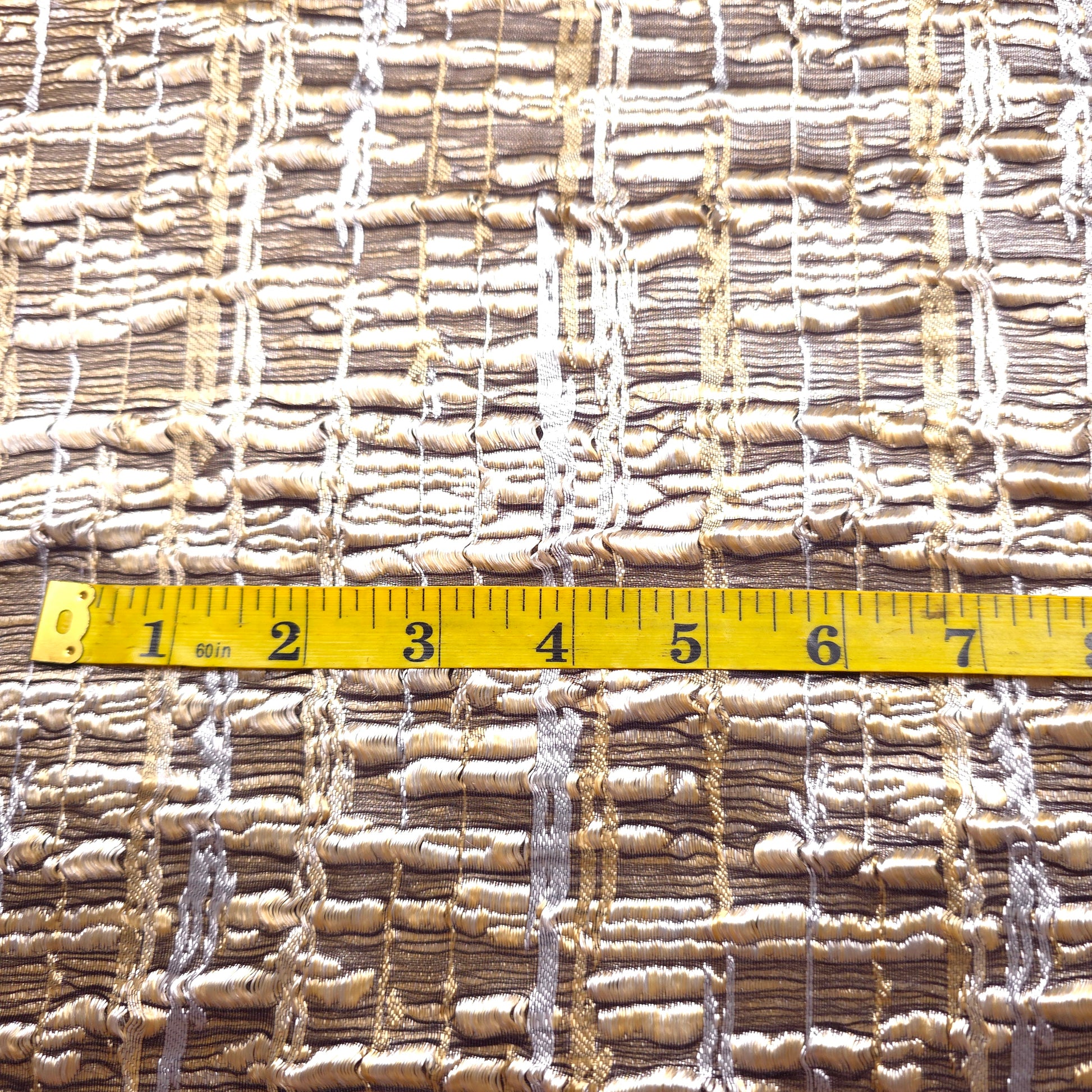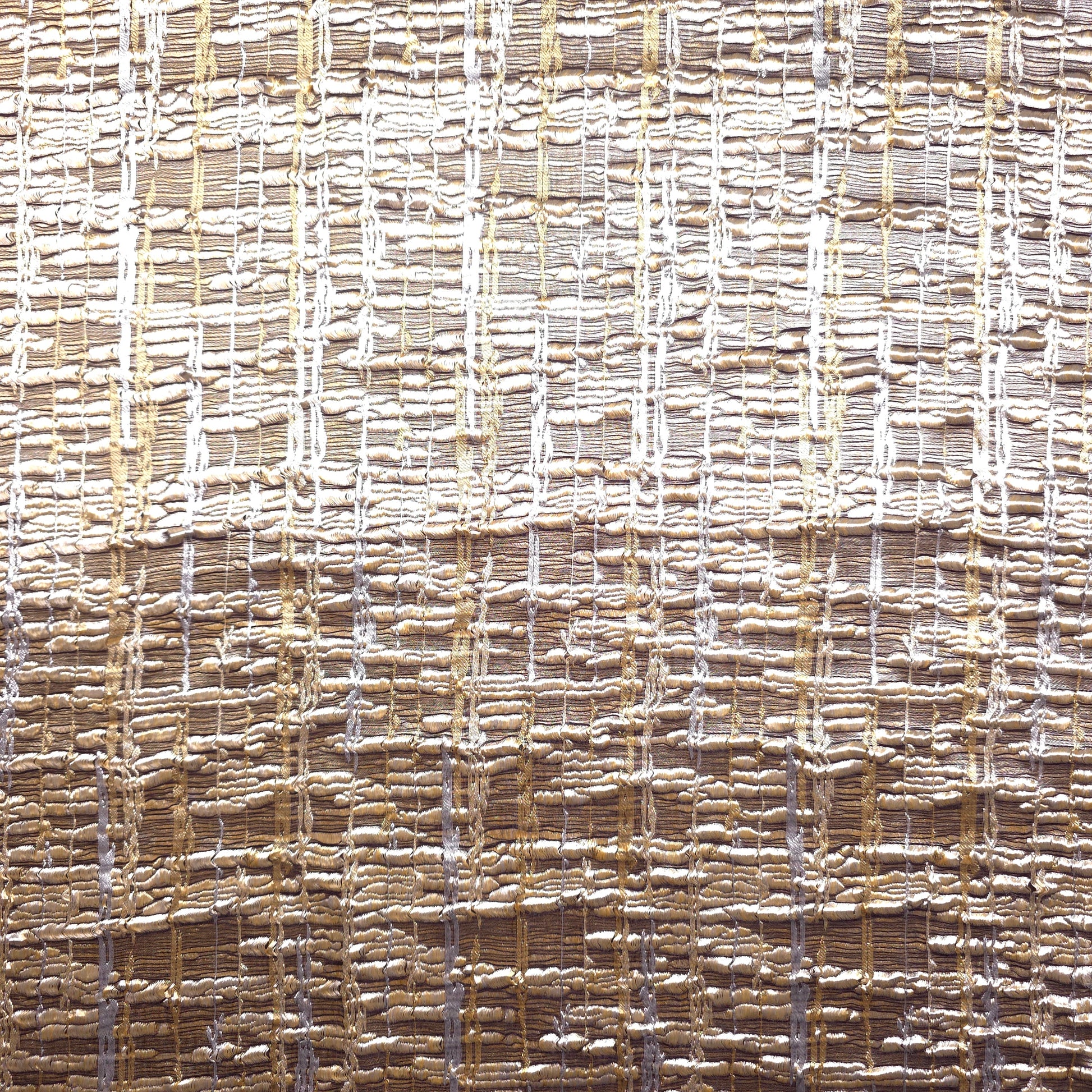 Elevate your interior with our spectacular extra-wide drapery fabric. This material features a sophisticated, three-dimensional texture composed of embossed lines in a shimmering palette of gold and brass. Specifically designed for high-impact applications, its 118-inch width allows for the creation of stunning, seamless drapes that exude modern luxury. The medium-weight polyester construction ensures the fabric drapes beautifully, making it a premier choice for designers and homeowners alike.