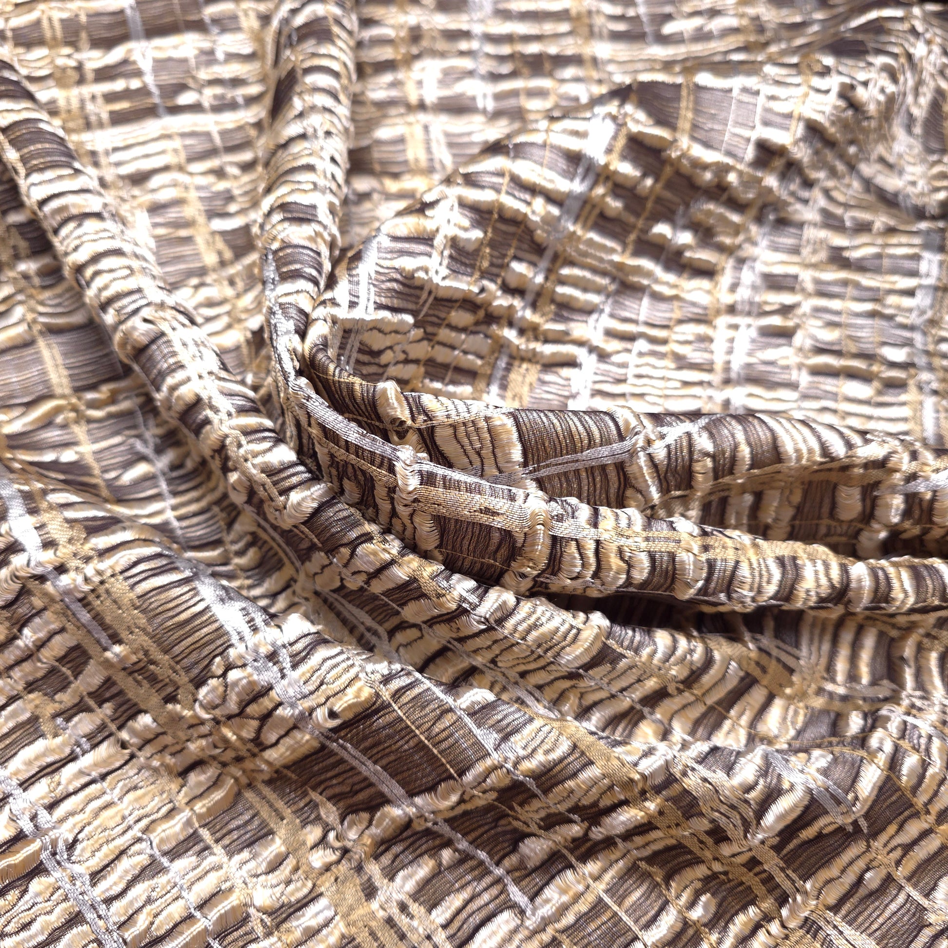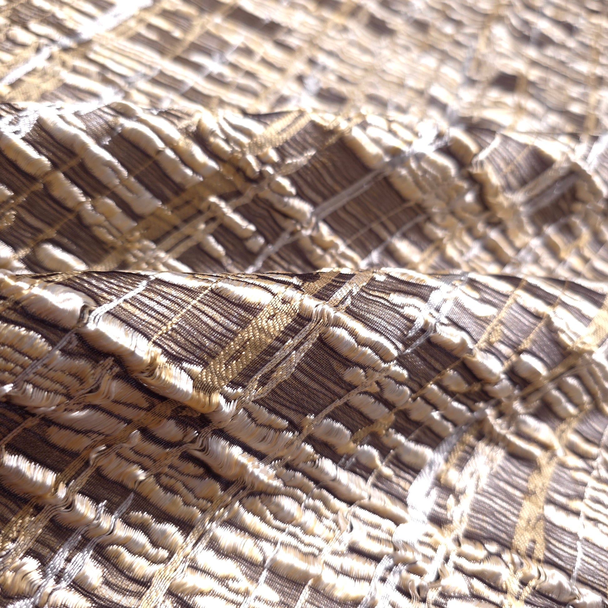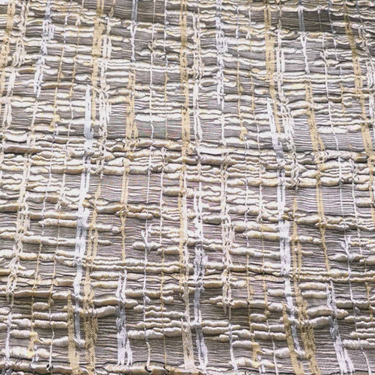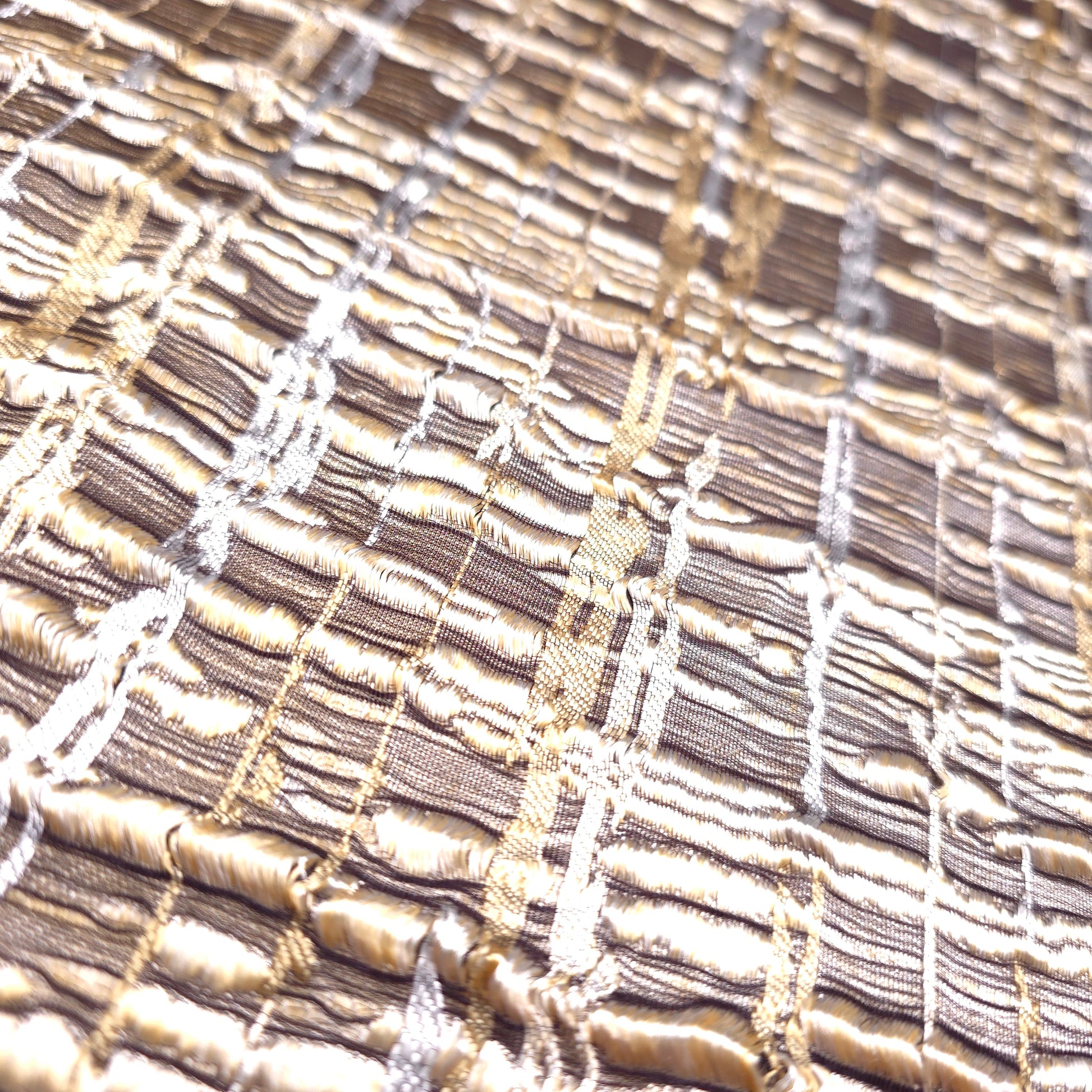 Elevate your interior with our spectacular extra-wide drapery fabric. This material features a sophisticated, three-dimensional texture composed of embossed lines in a shimmering palette of gold and brass. Specifically designed for high-impact applications, its 118-inch width allows for the creation of stunning, seamless drapes that exude modern luxury. The medium-weight polyester construction ensures the fabric drapes beautifully, making it a premier choice for designers and homeowners alike.