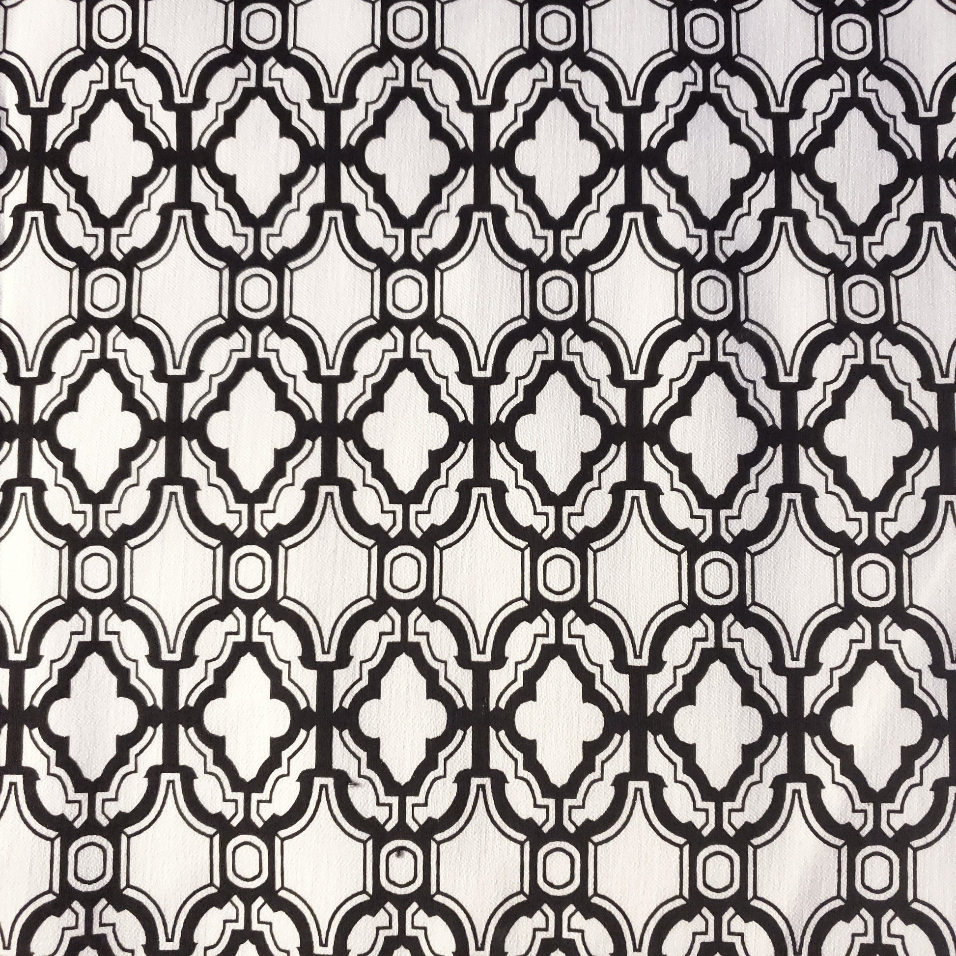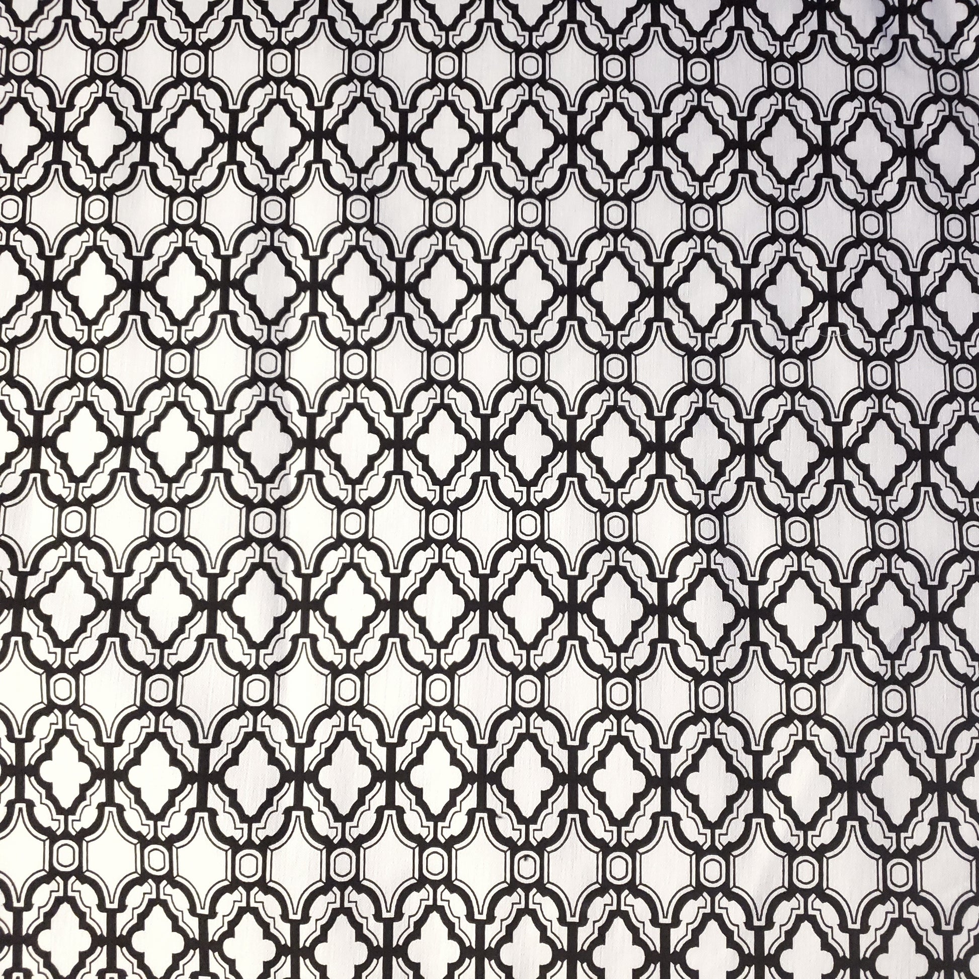 This medium weight stretch cotton fabric features a bold matte black lattice design printed onto a solid white background. This fabric features a very good 2 way stretch from cut end to cut end. It has a stiff starched feel. We do not know the percentage of Lycra in this, it is a closeout fabric in limited supply, once it is gone it is gone.