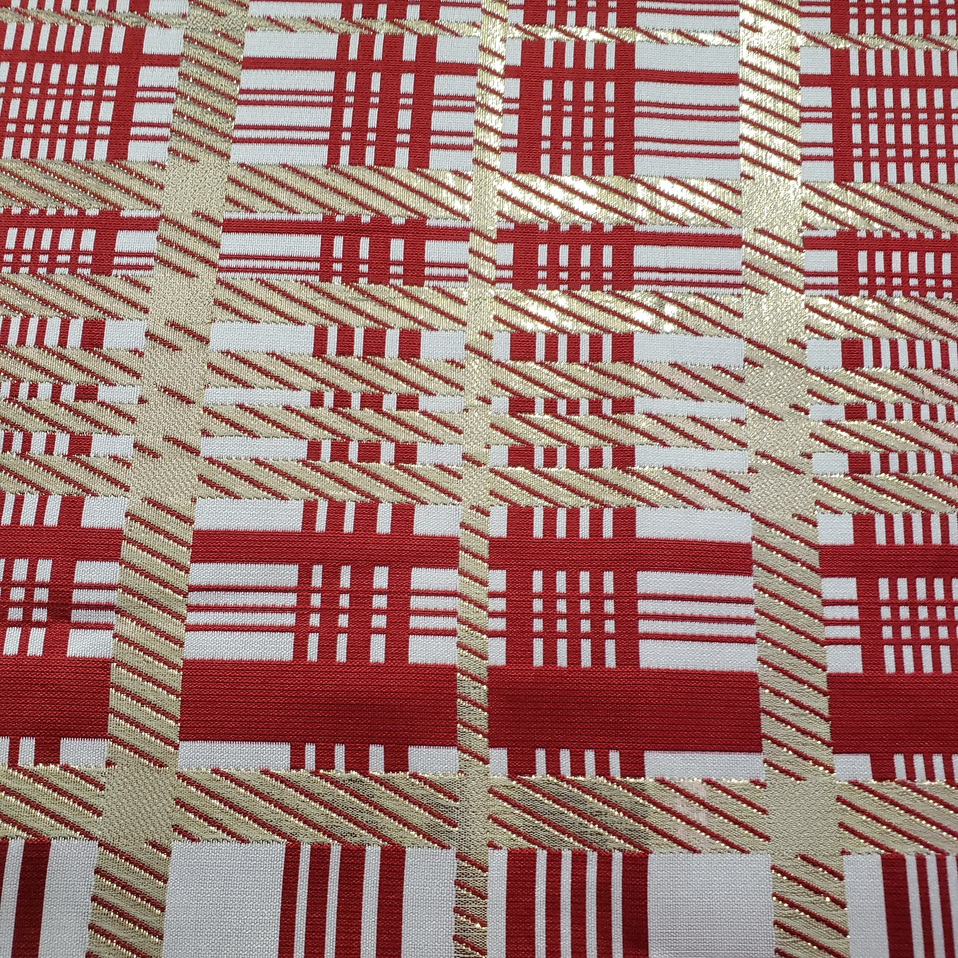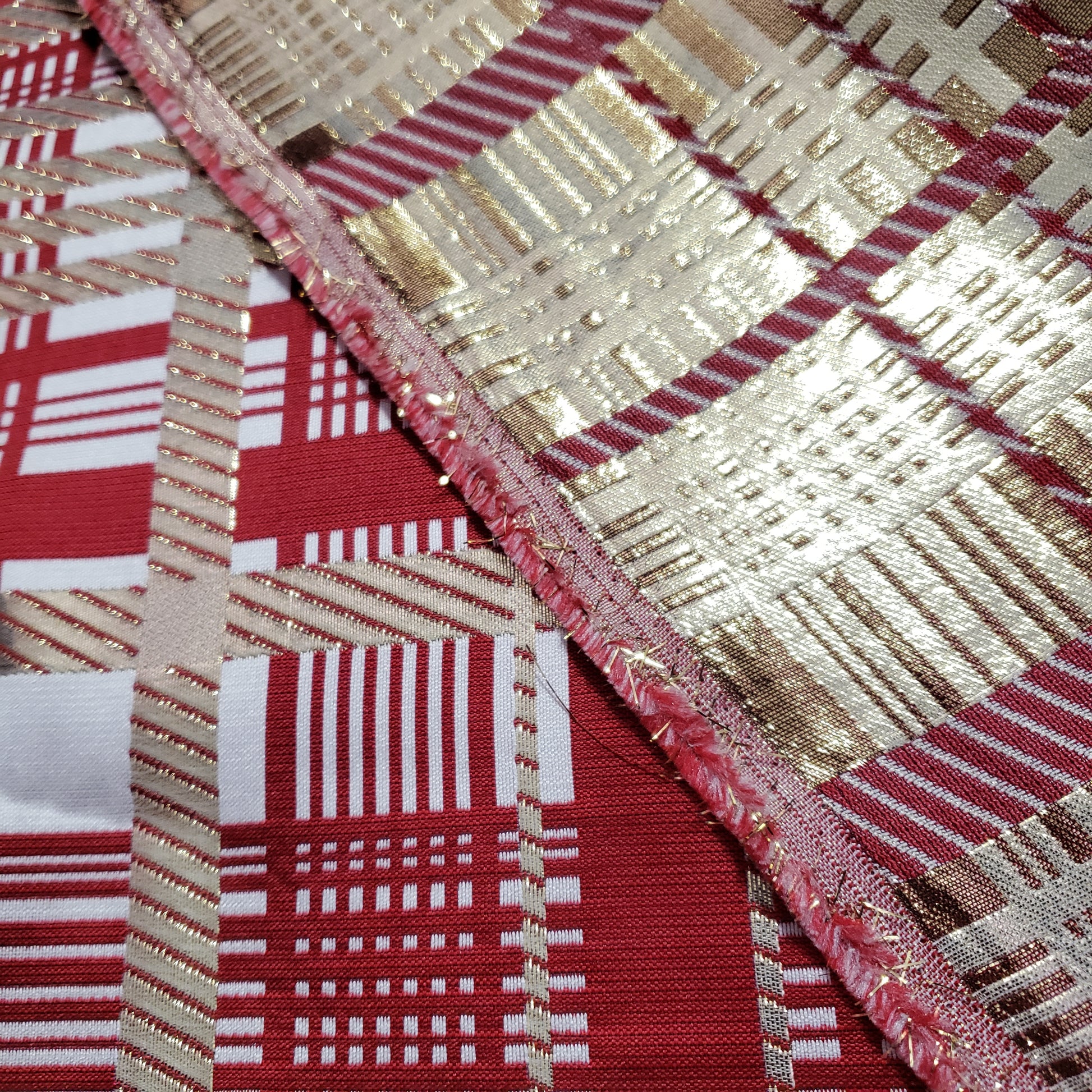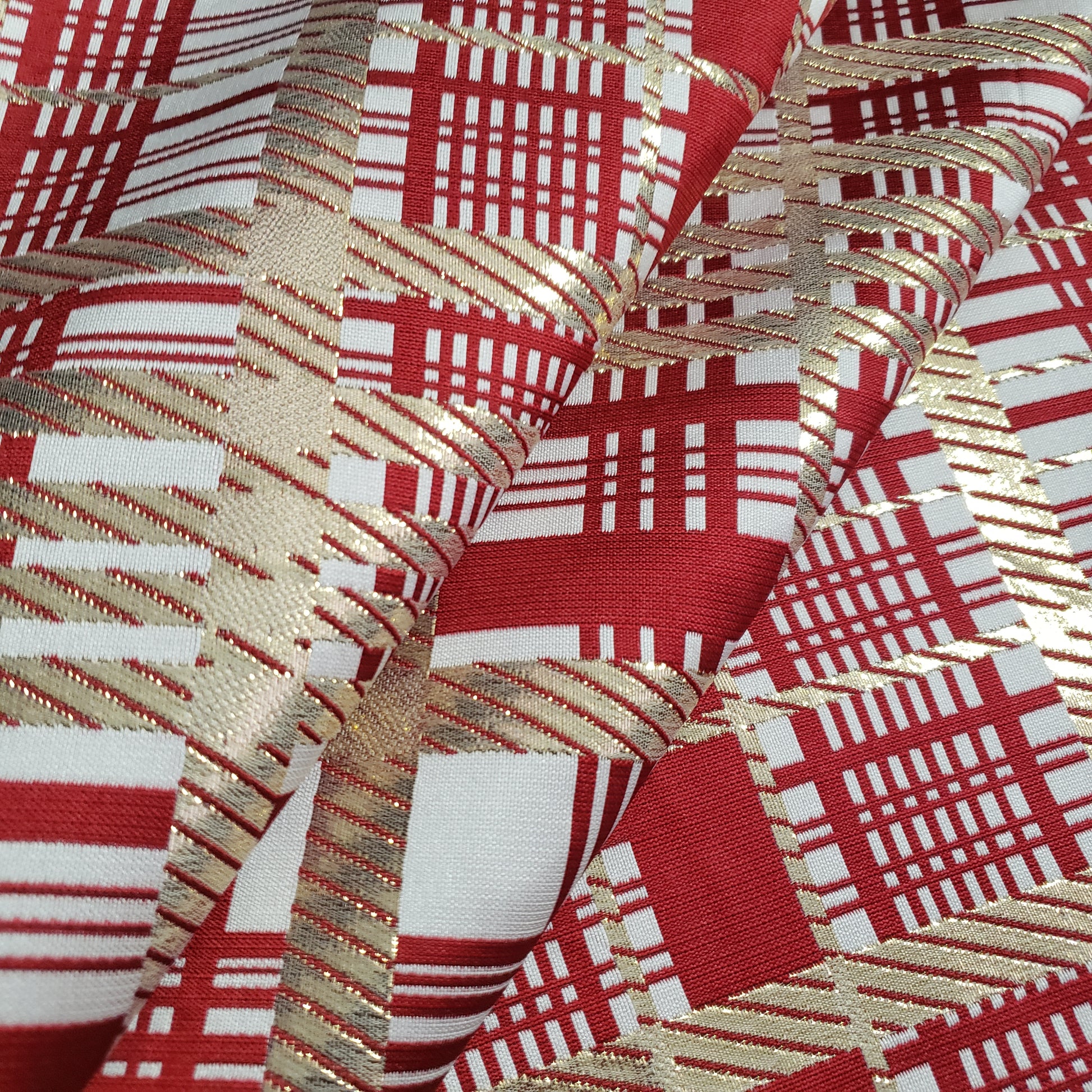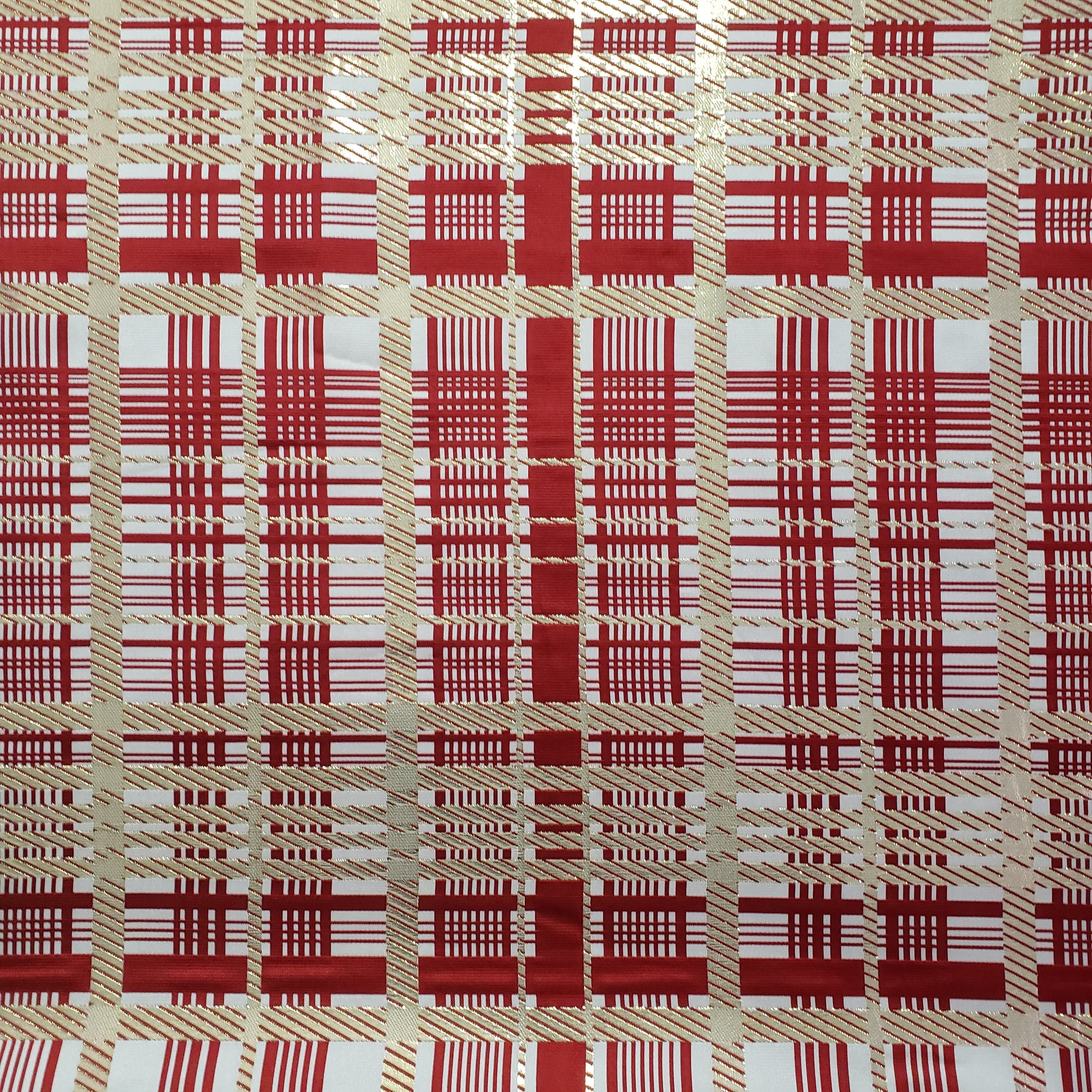 Deck the halls with gilded tartan. This high-end brocade fabric features a metallic gold red and white plaid tartan print. The gold and read appear as a slightly raised texture above the white backing. This is ideal for all types of Christmas decor, ranging from Tree Skirts, Drapery, Tablecloths and Table Runners, Valances, Dresses, Jackets and more. This is a single sided print; The backside shows the thread weave of the design. It is a medium to heavy weight fabric