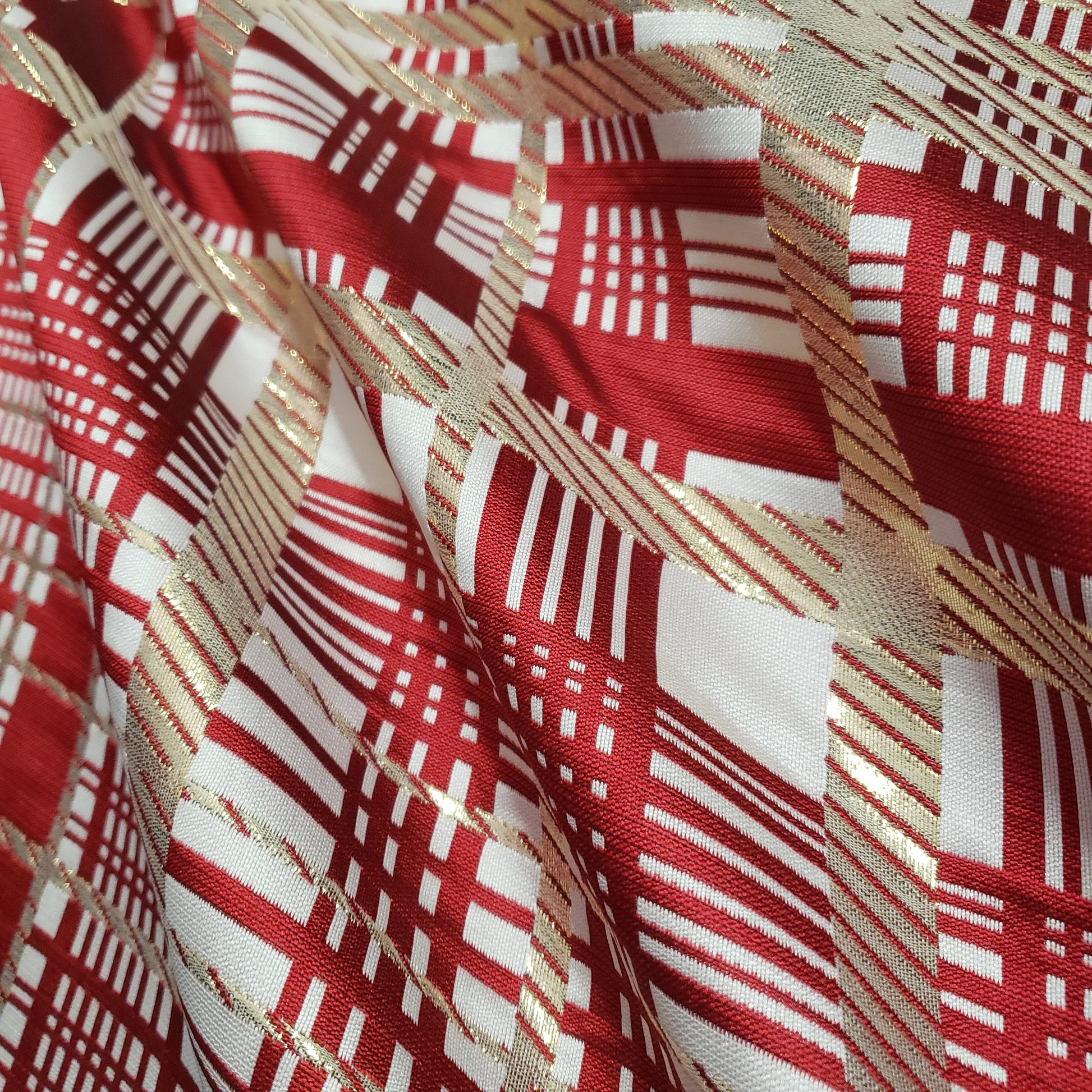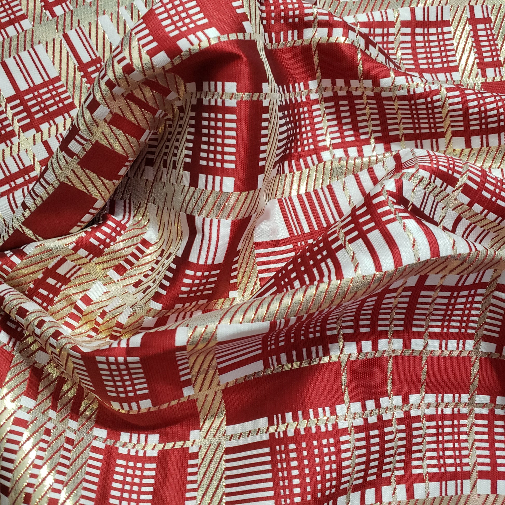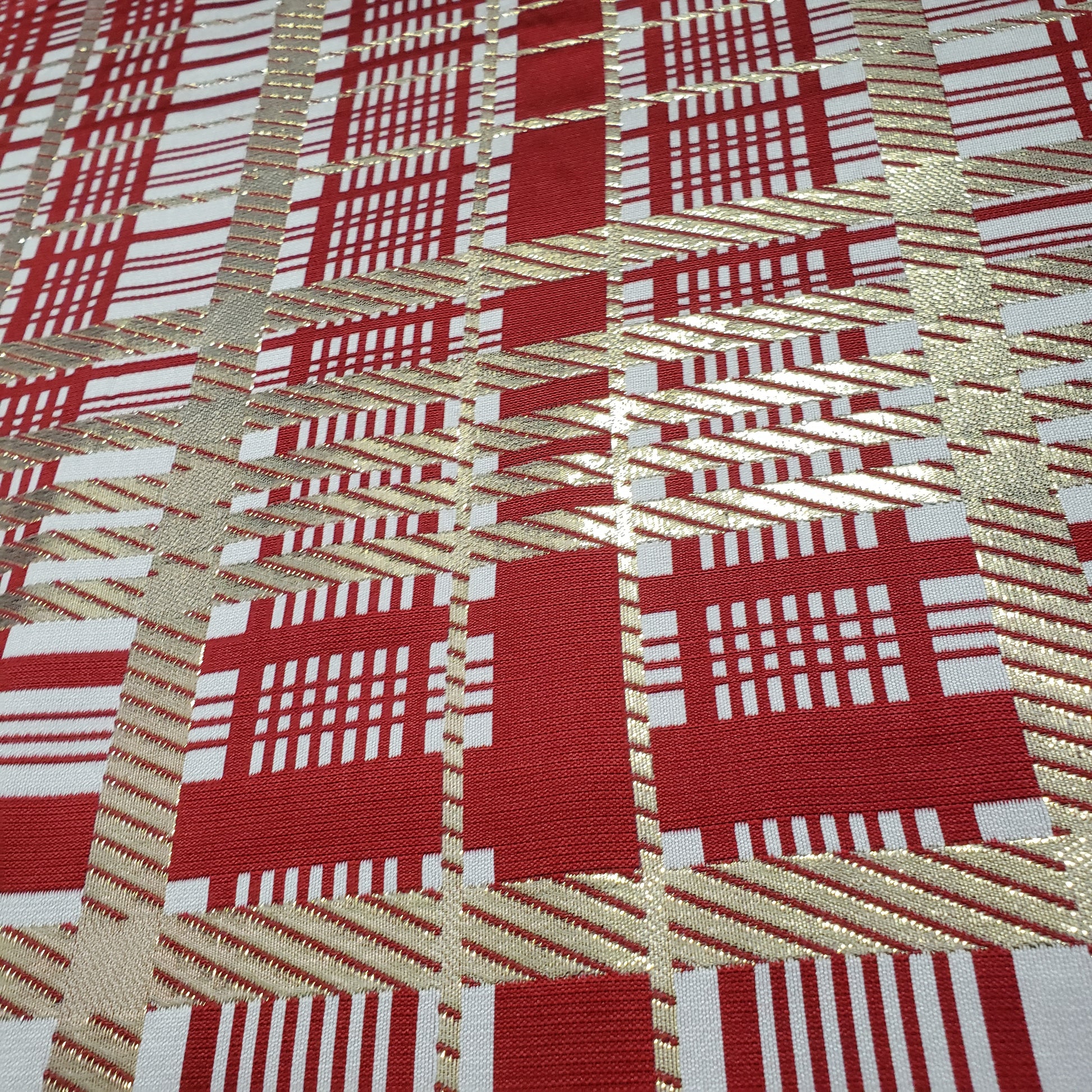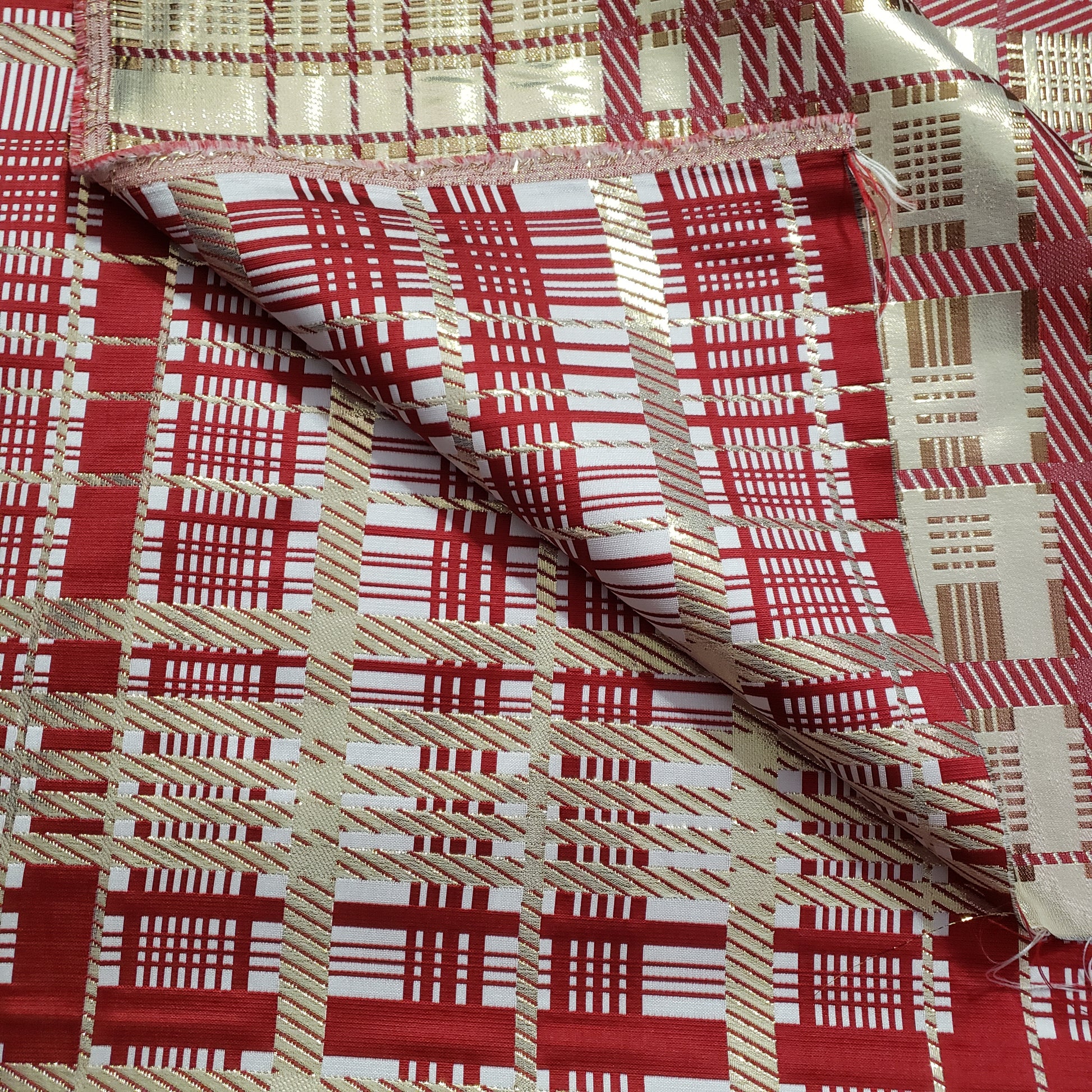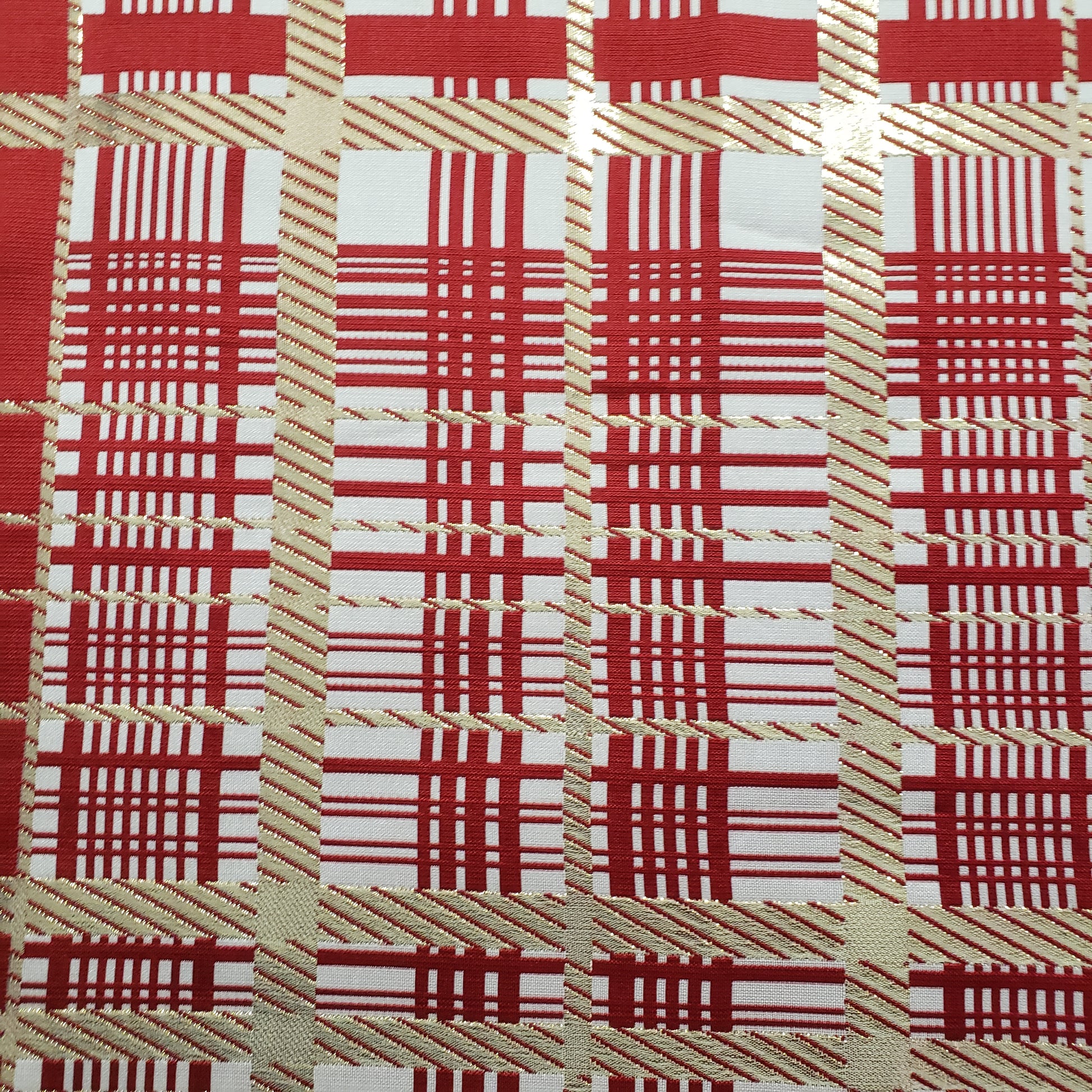 Deck the halls with gilded tartan. This high-end brocade fabric features a metallic gold red and white plaid tartan print. The gold and read appear as a slightly raised texture above the white backing. This is ideal for all types of Christmas decor, ranging from Tree Skirts, Drapery, Tablecloths and Table Runners, Valances, Dresses, Jackets and more. This is a single sided print; The backside shows the thread weave of the design. It is a medium to heavy weight fabric