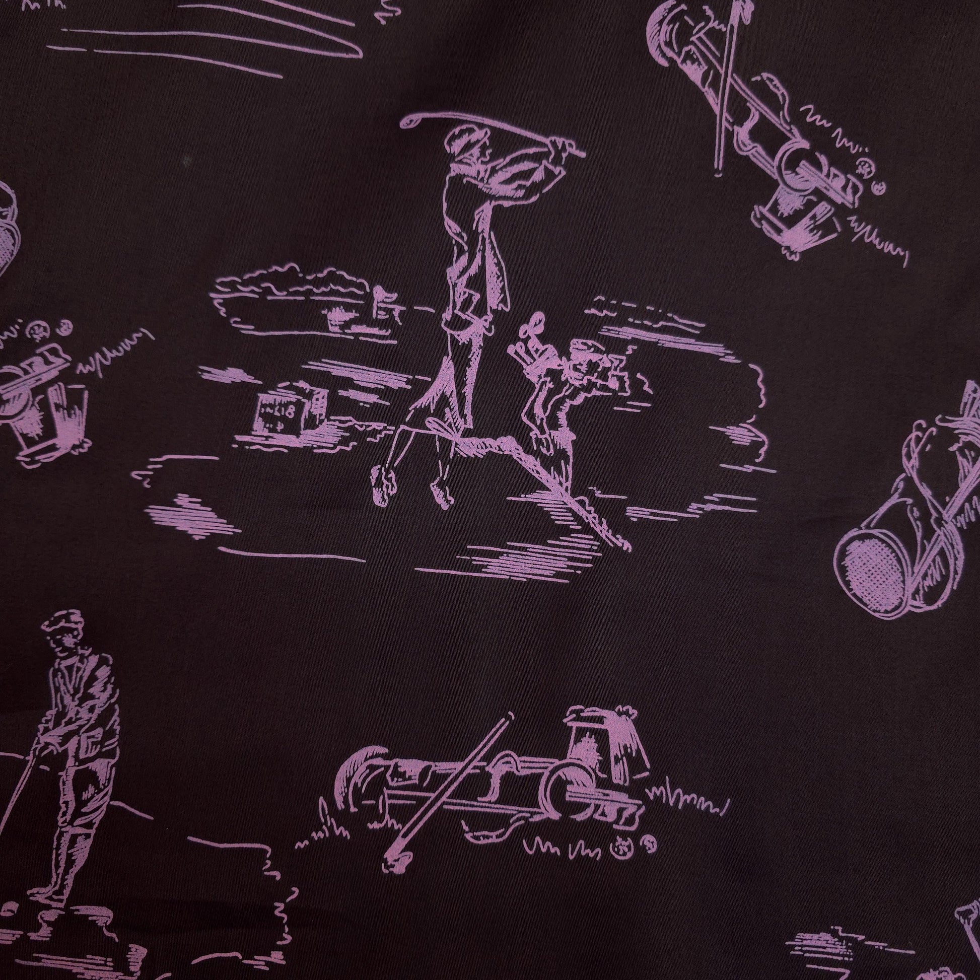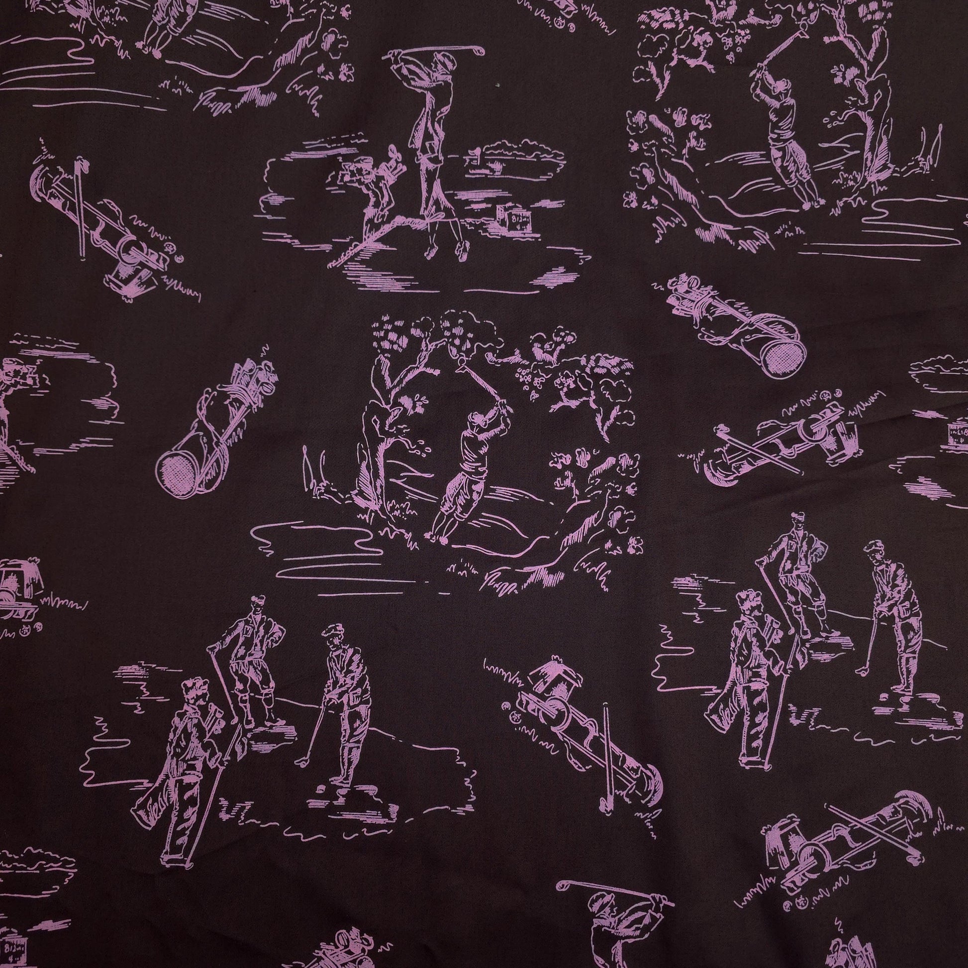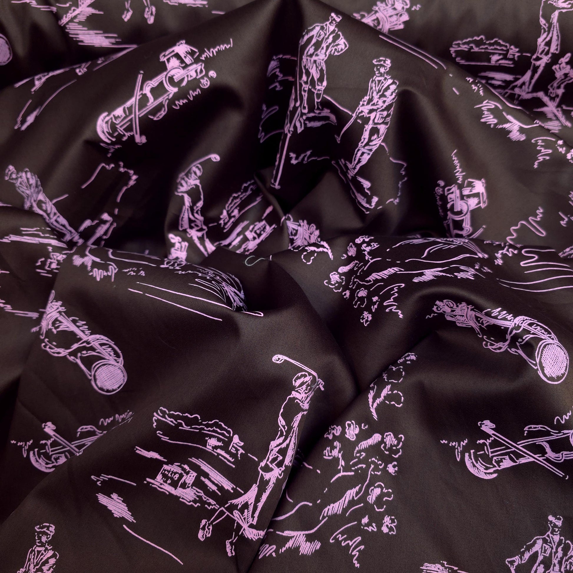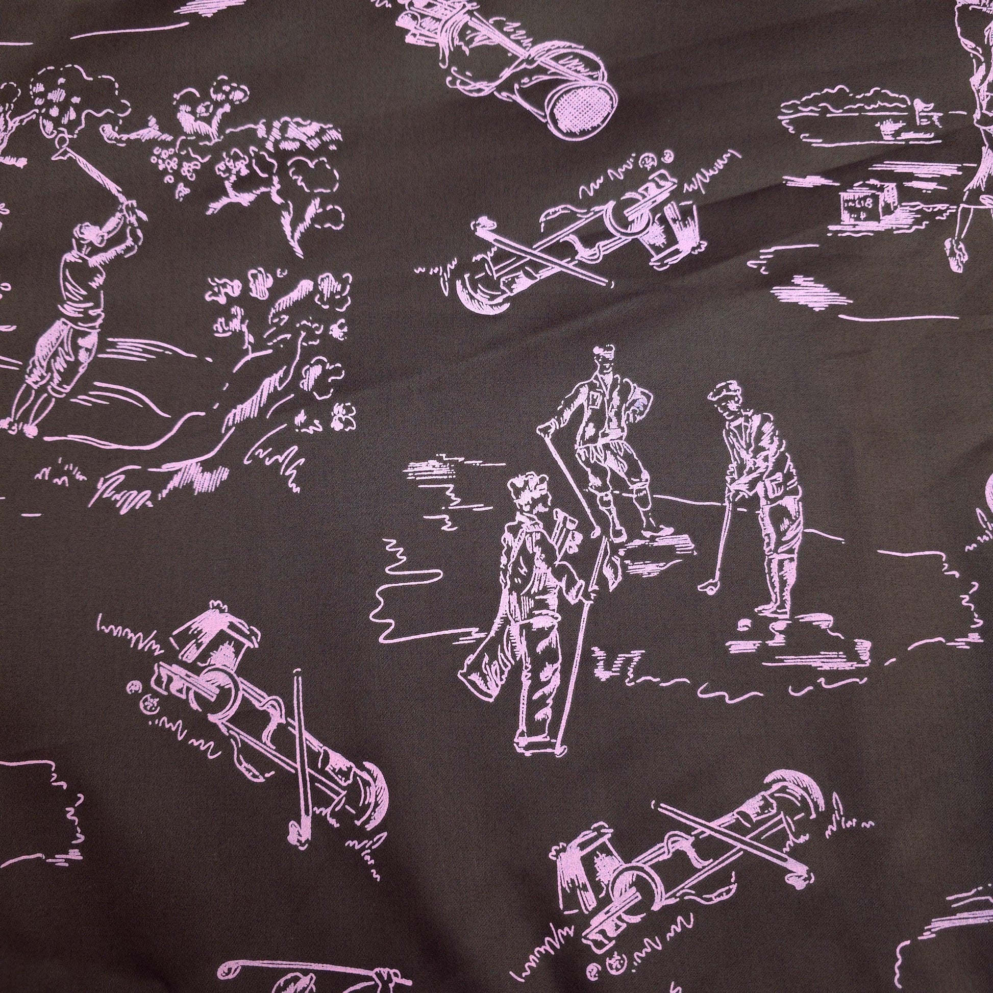 This is a sateen microfiber fabric featuring a toile-style print of various golf-themed scenes and elements. The design is rendered in a light sorbet pink outline on a dark chocolate brown background. The sateen weave gives the fabric a smooth, subtle sheen. The print is single sided. This fabric has no stretch.
