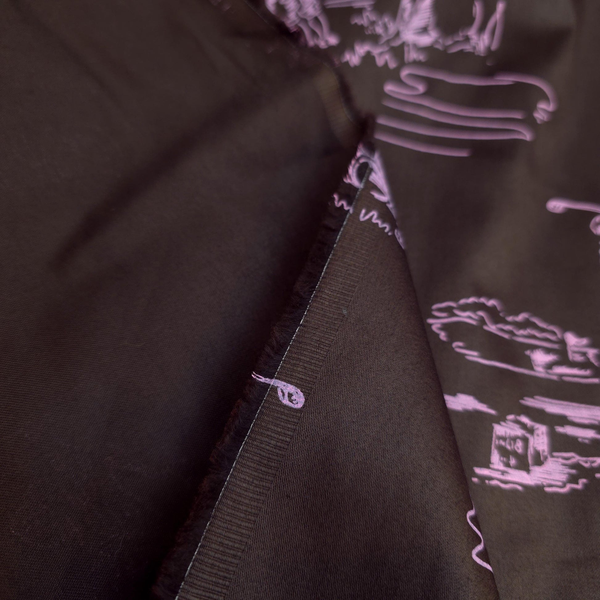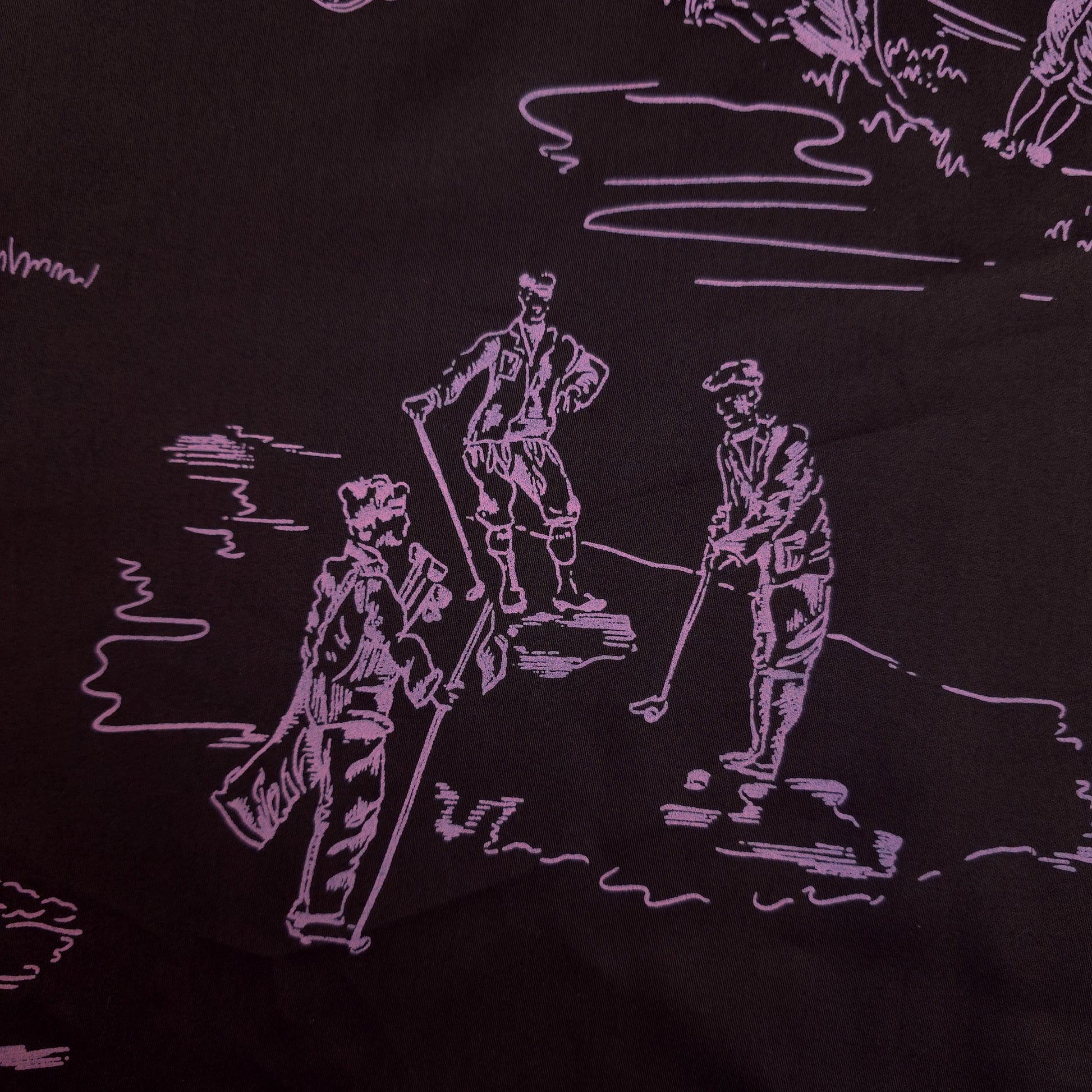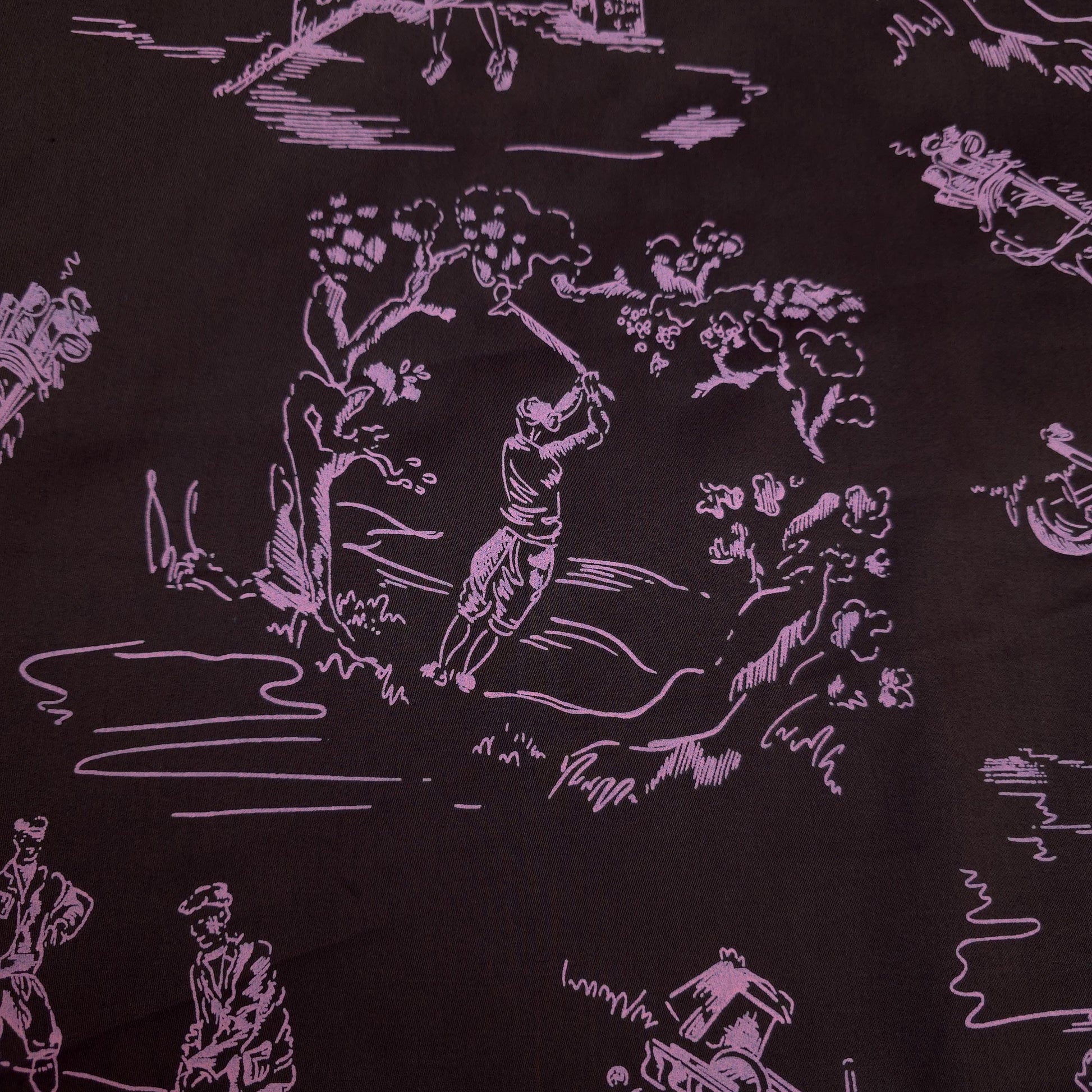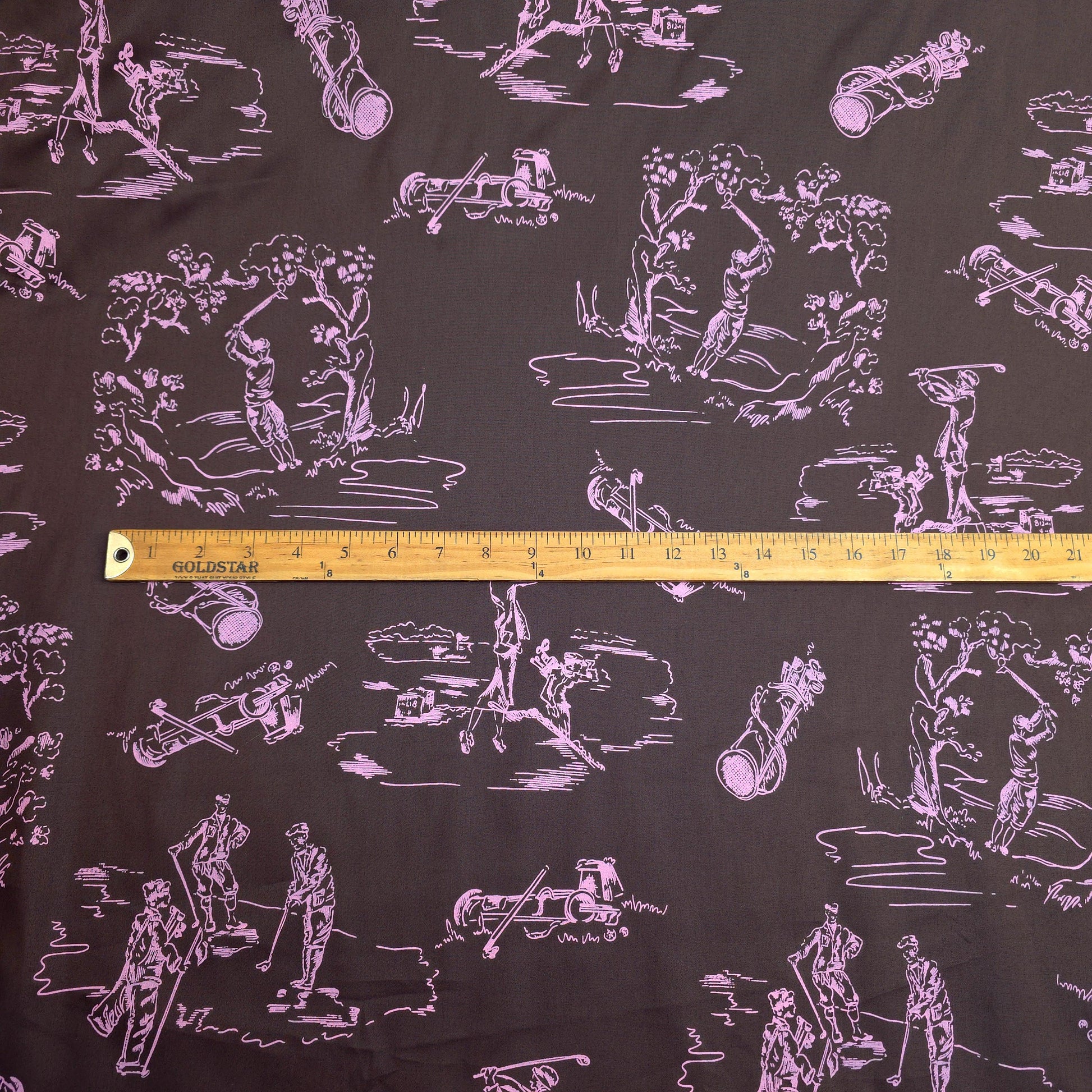 This is a sateen microfiber fabric featuring a toile-style print of various golf-themed scenes and elements. The design is rendered in a light sorbet pink outline on a dark chocolate brown background. The sateen weave gives the fabric a smooth, subtle sheen. The print is single sided. This fabric has no stretch.