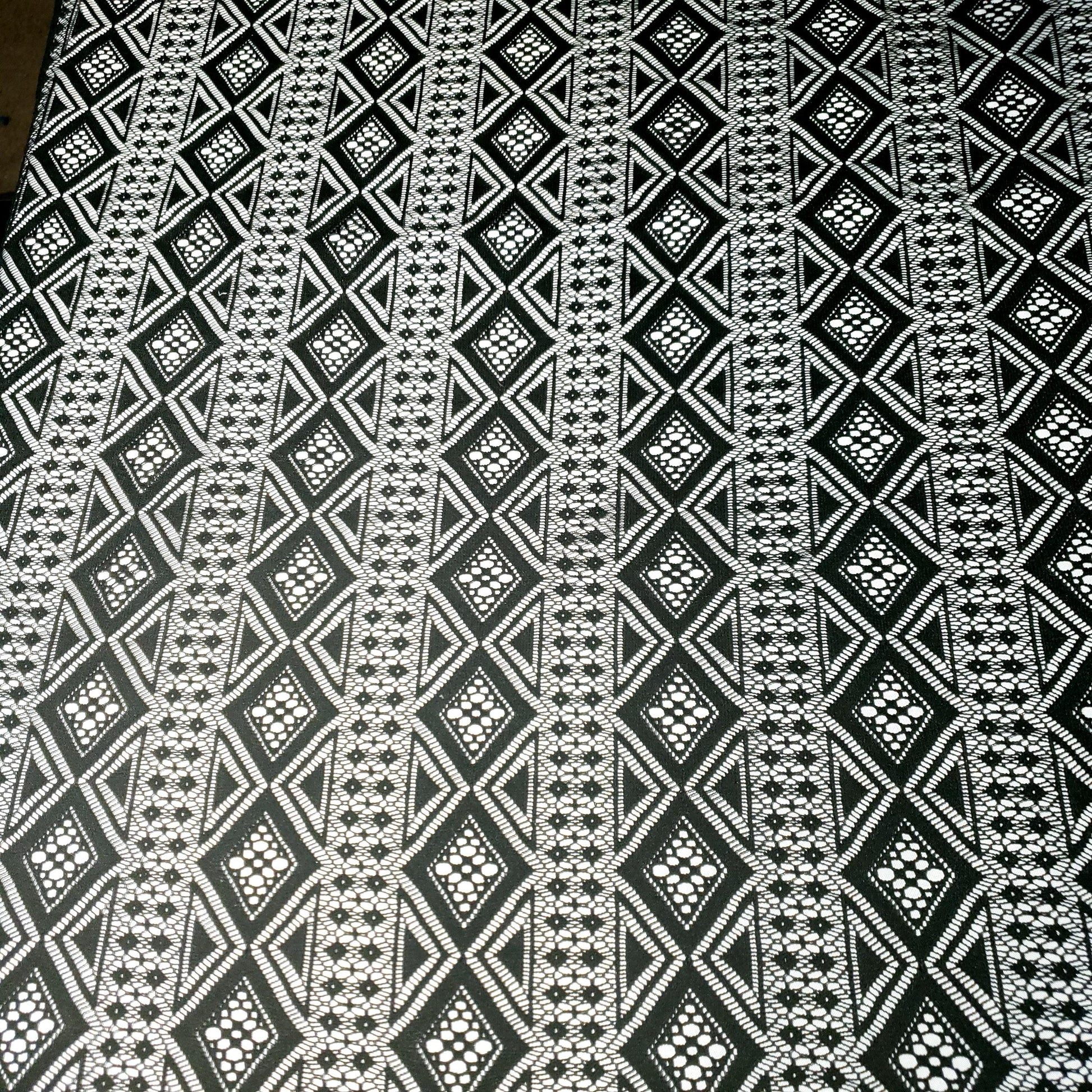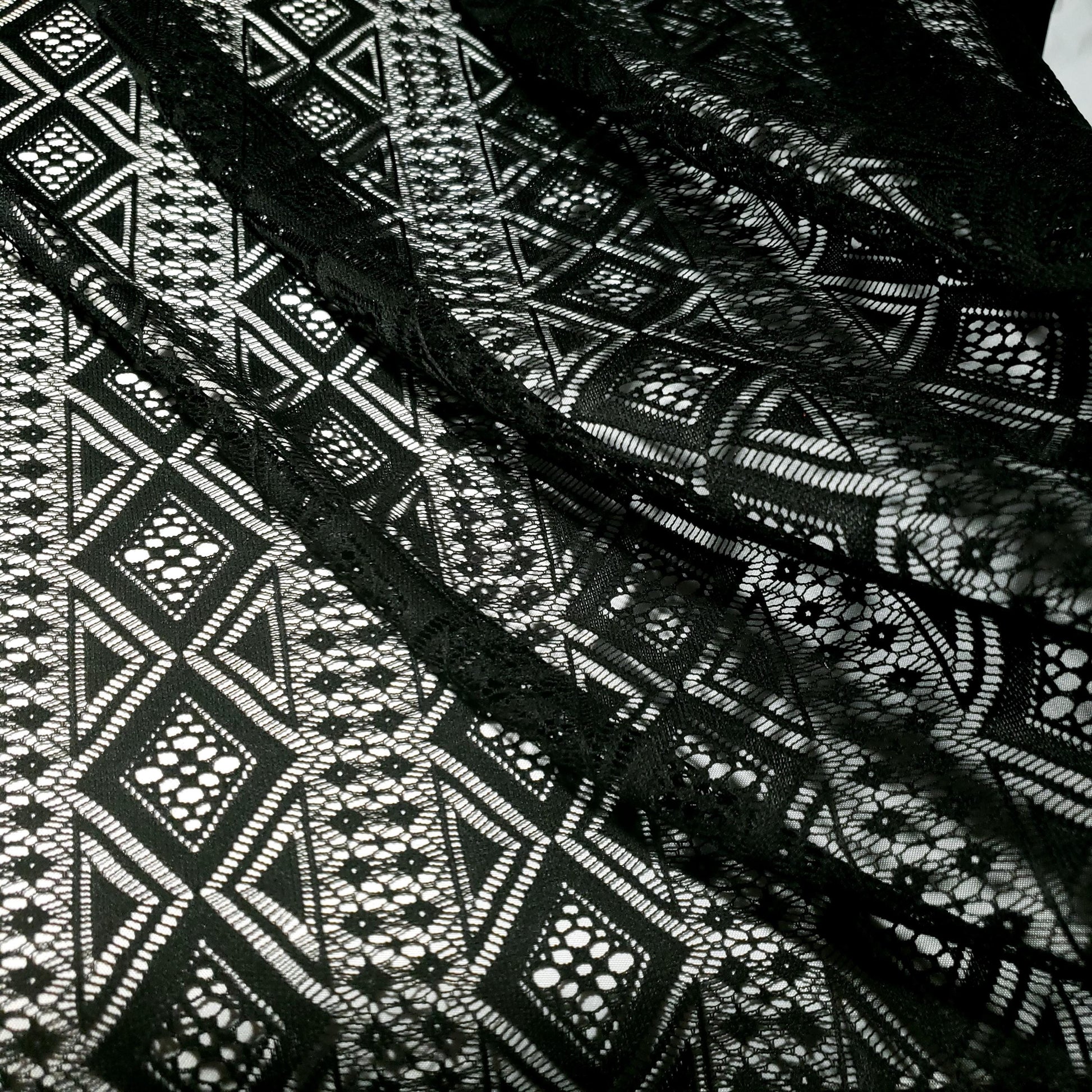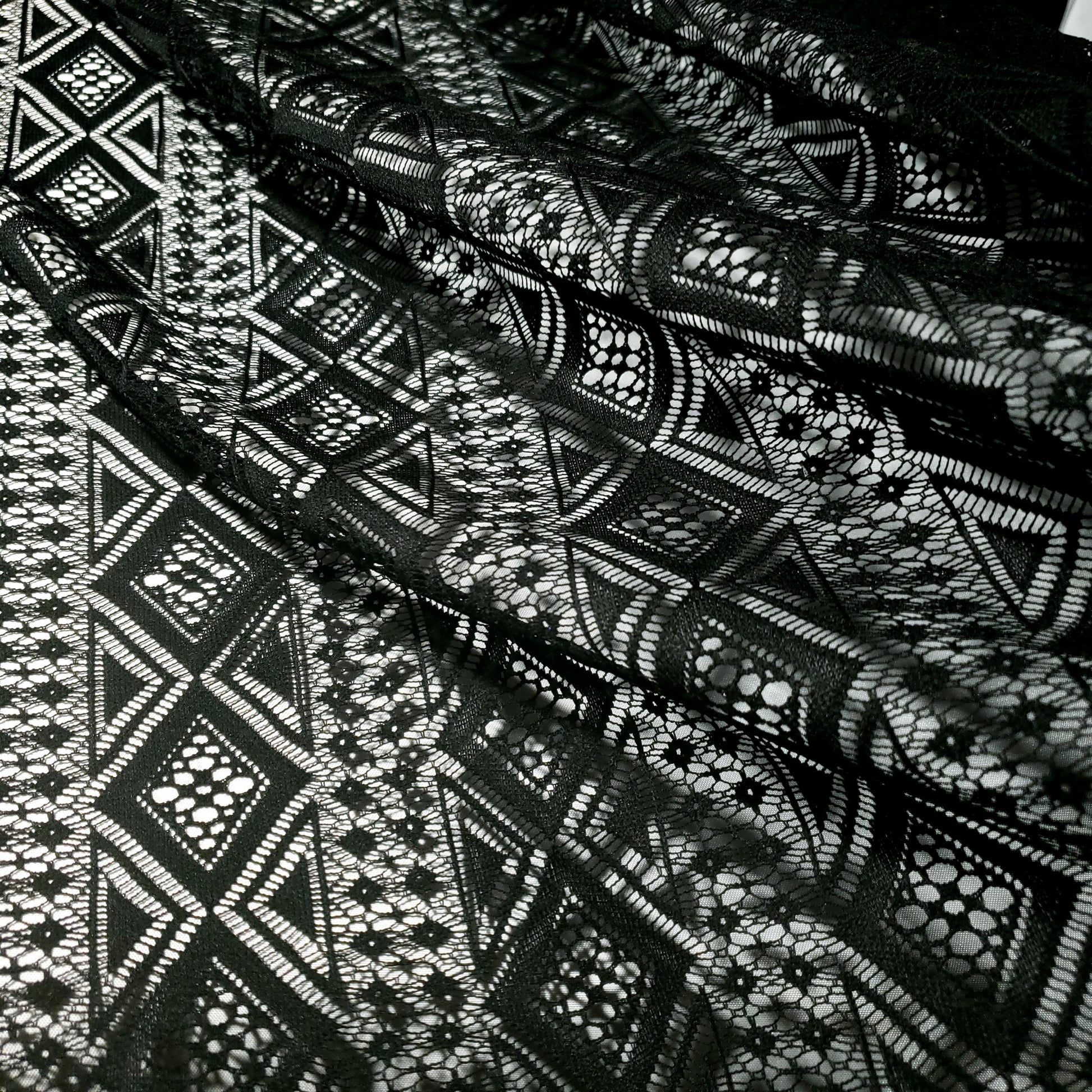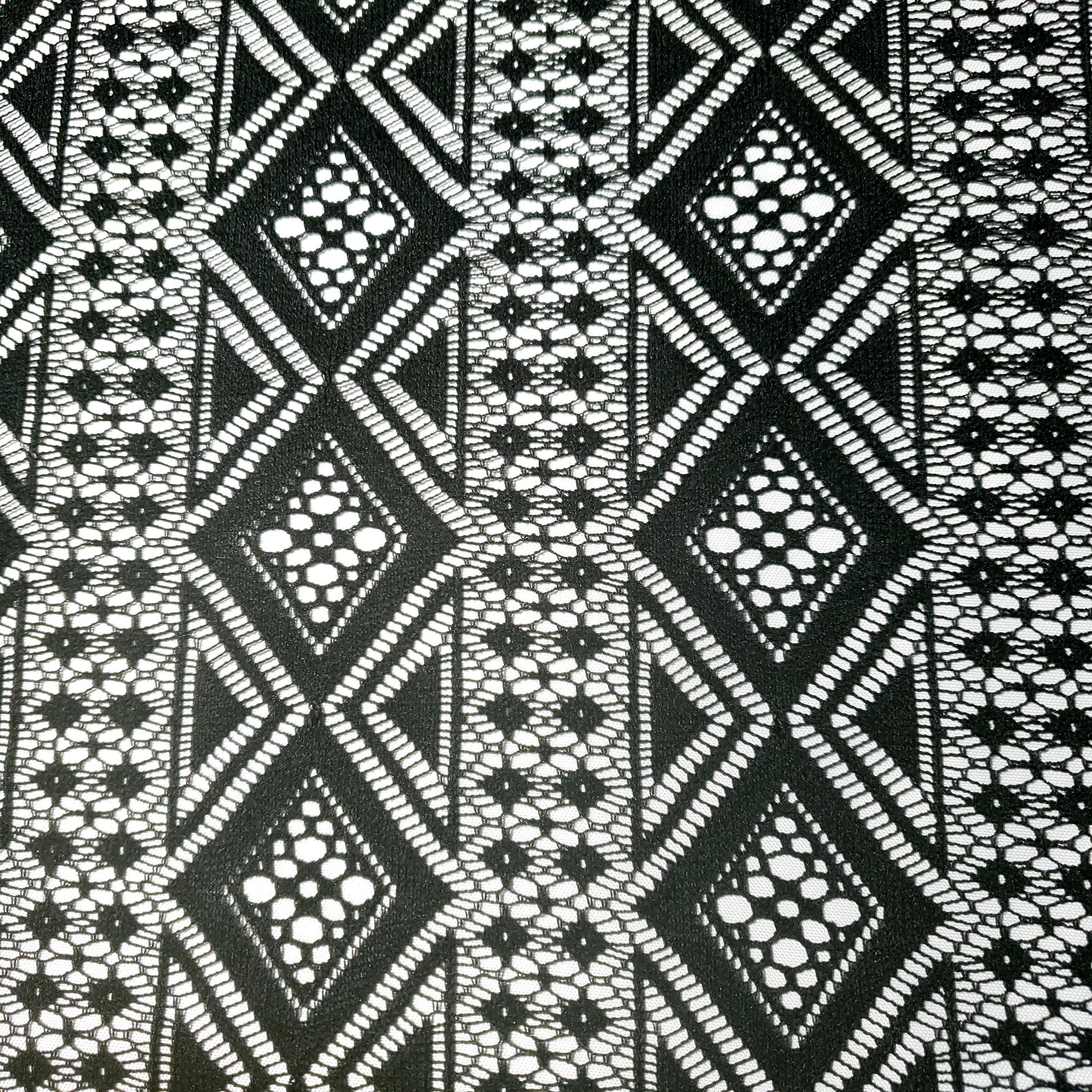 Make a bold statement with this stunning black lace fabric. The vibrant color and intricate, geometric diamond pattern create a modern, eye-catching look. Perfect for dresses, skirts, and tops 54"