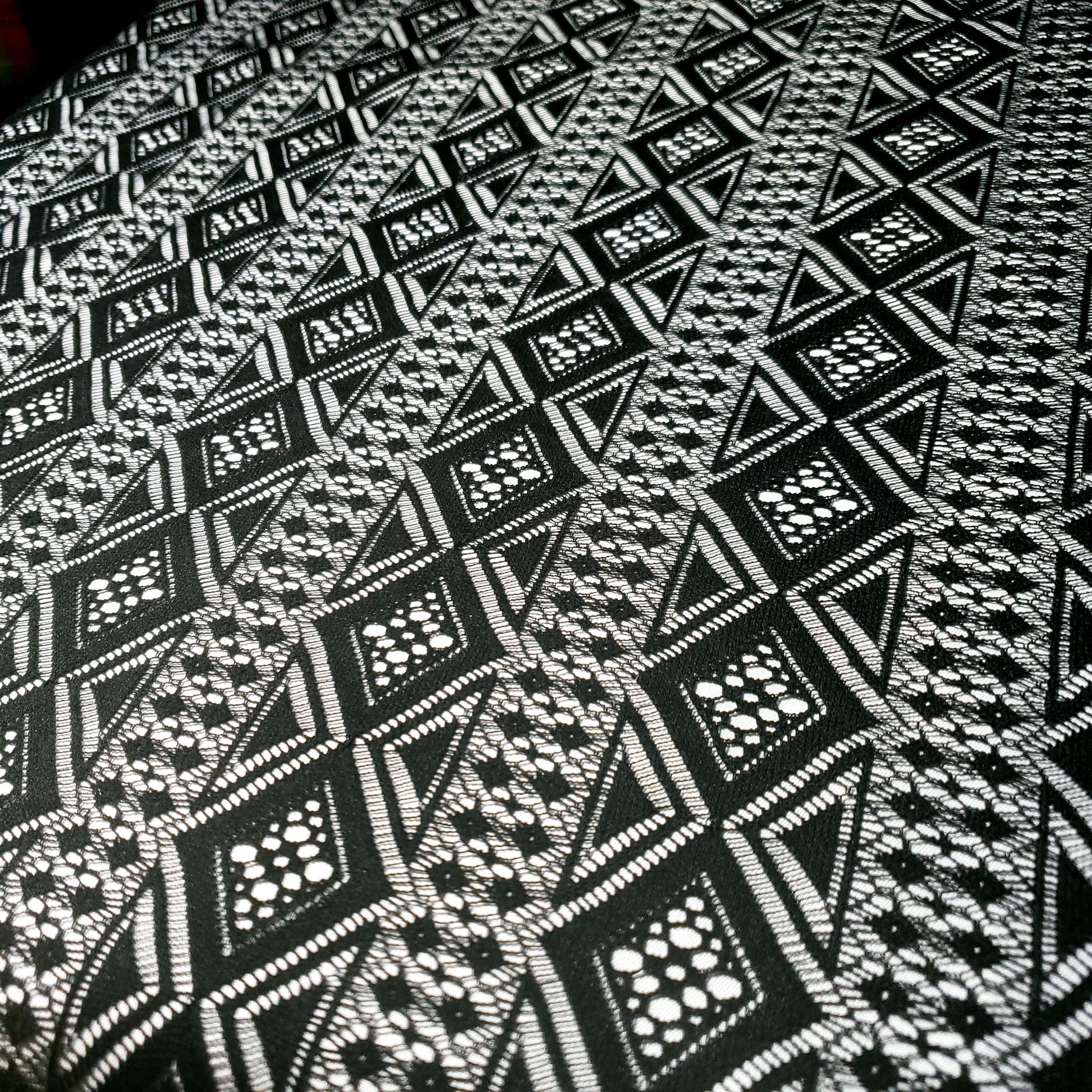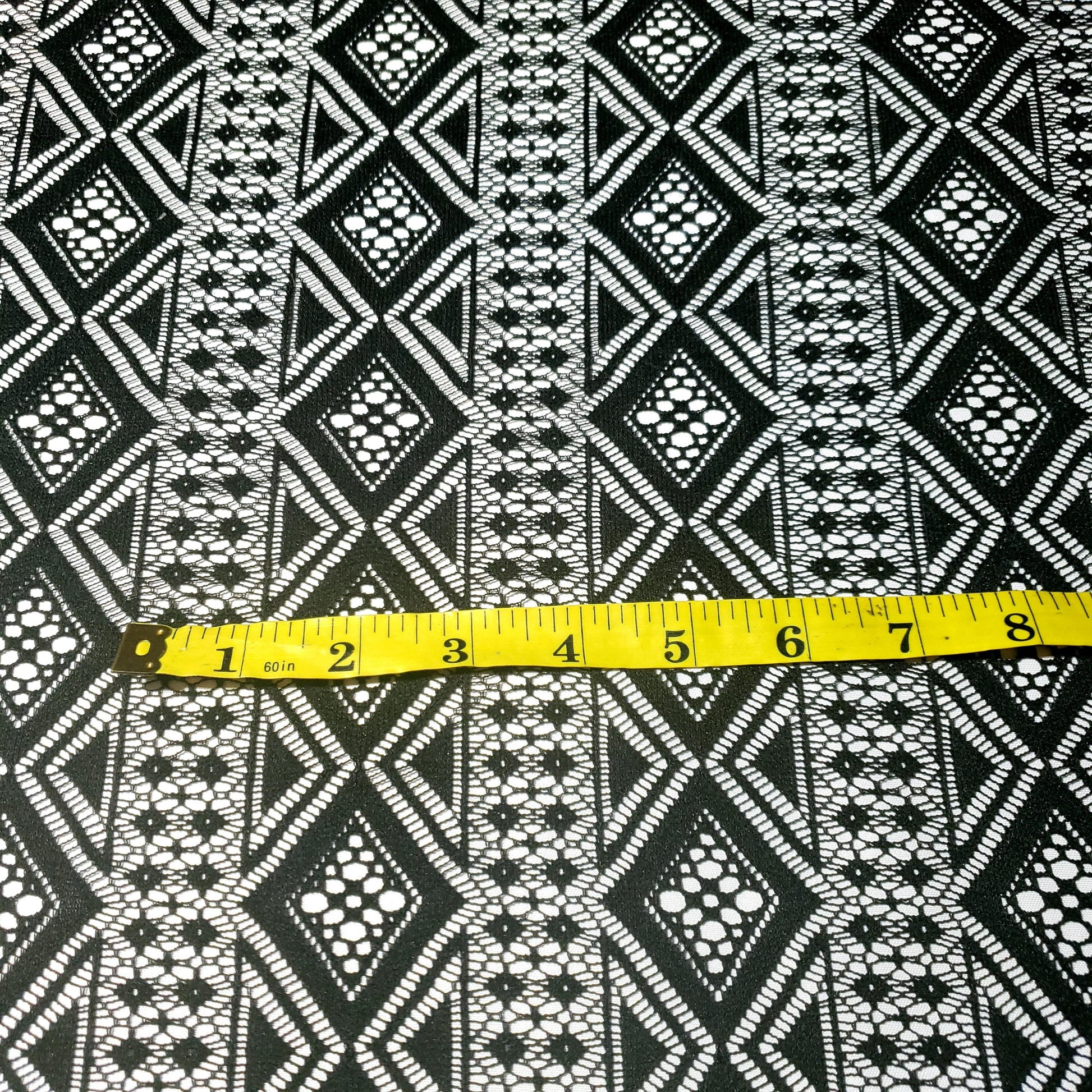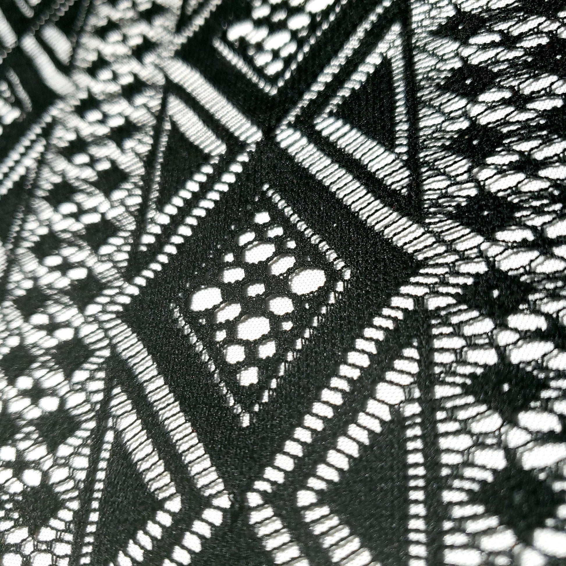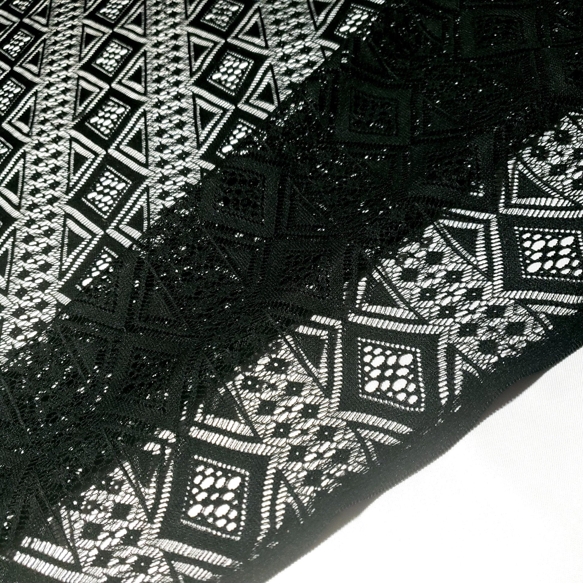 Make a bold statement with this stunning black lace fabric. The vibrant color and intricate, geometric diamond pattern create a modern, eye-catching look. Perfect for dresses, skirts, and tops 54"
