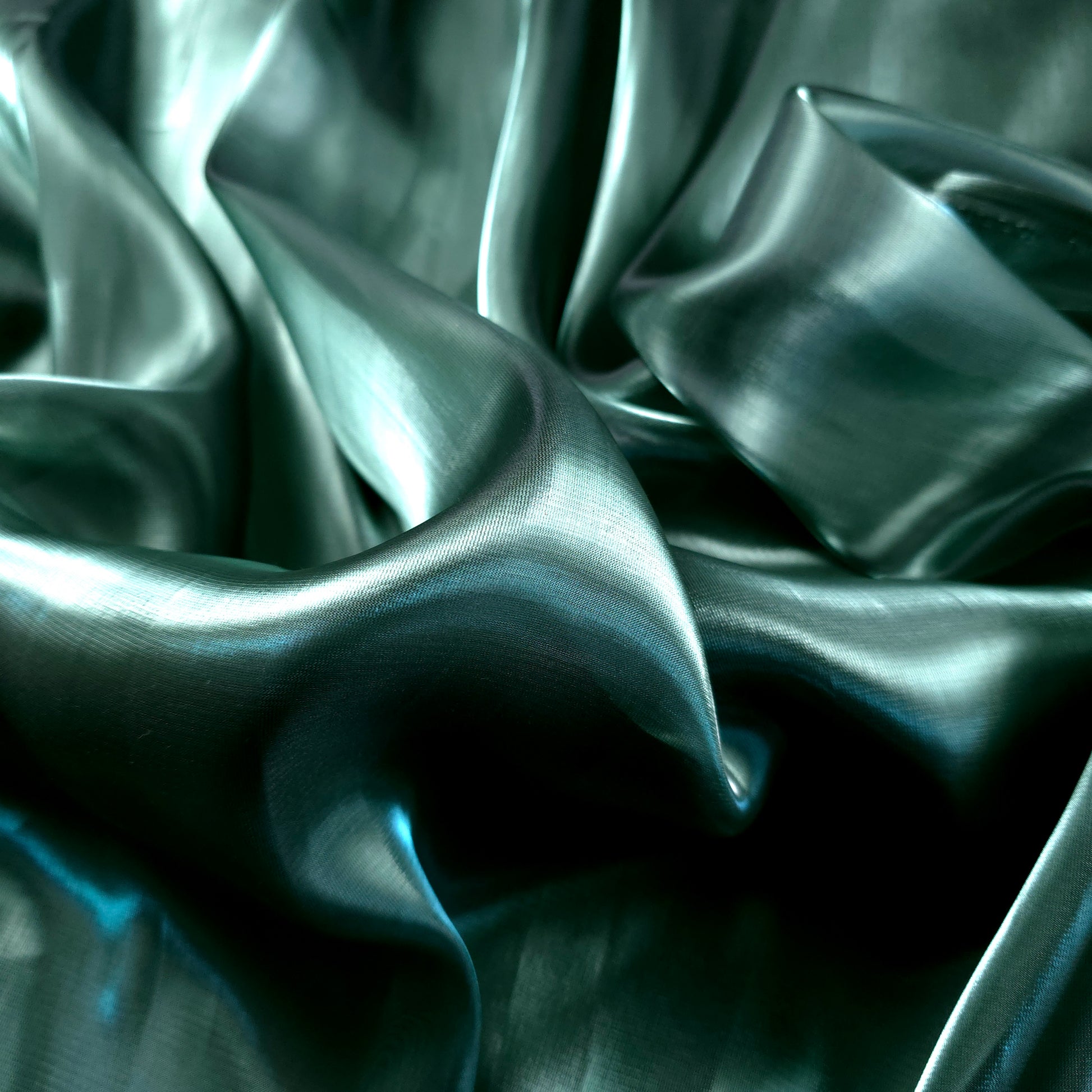 This 58-inch wide organza fabric features a striking "liquid shine" finish that creates a vibrant, shimmering effect. It is a lightweight, sheer material with a crisp, structured drape that holds its shape well. The unique black and green cross-weave produces an iridescent, two-tone appearance that shifts with light and movement, adding depth and visual interest.