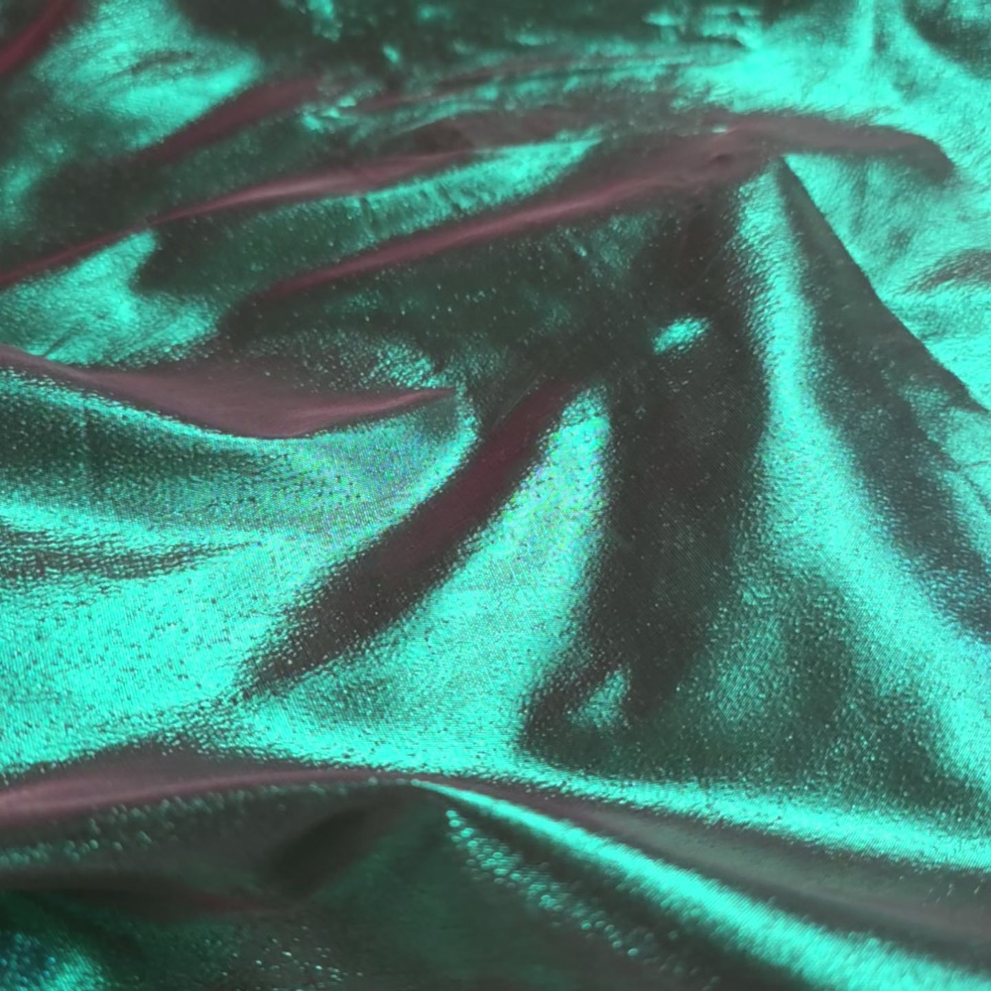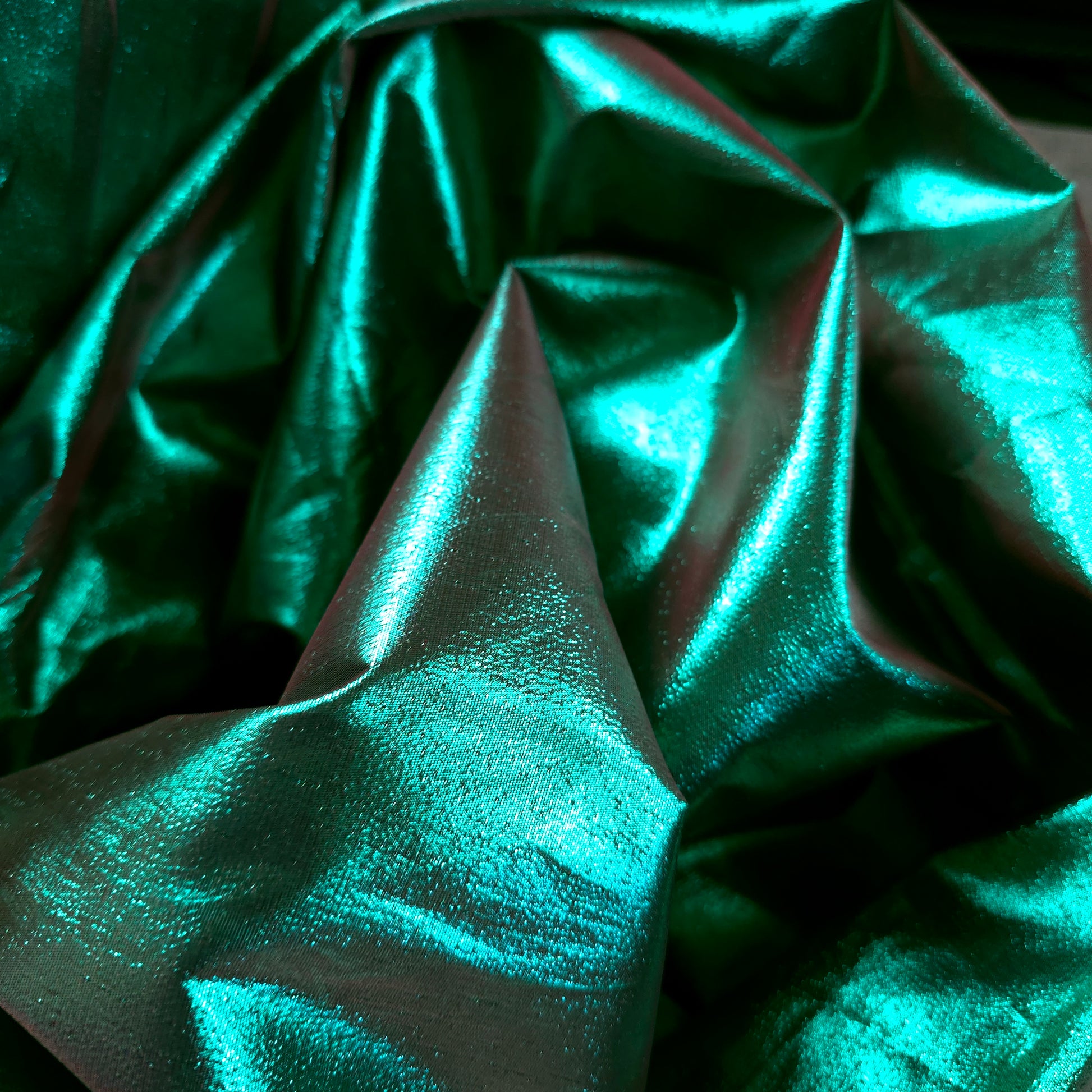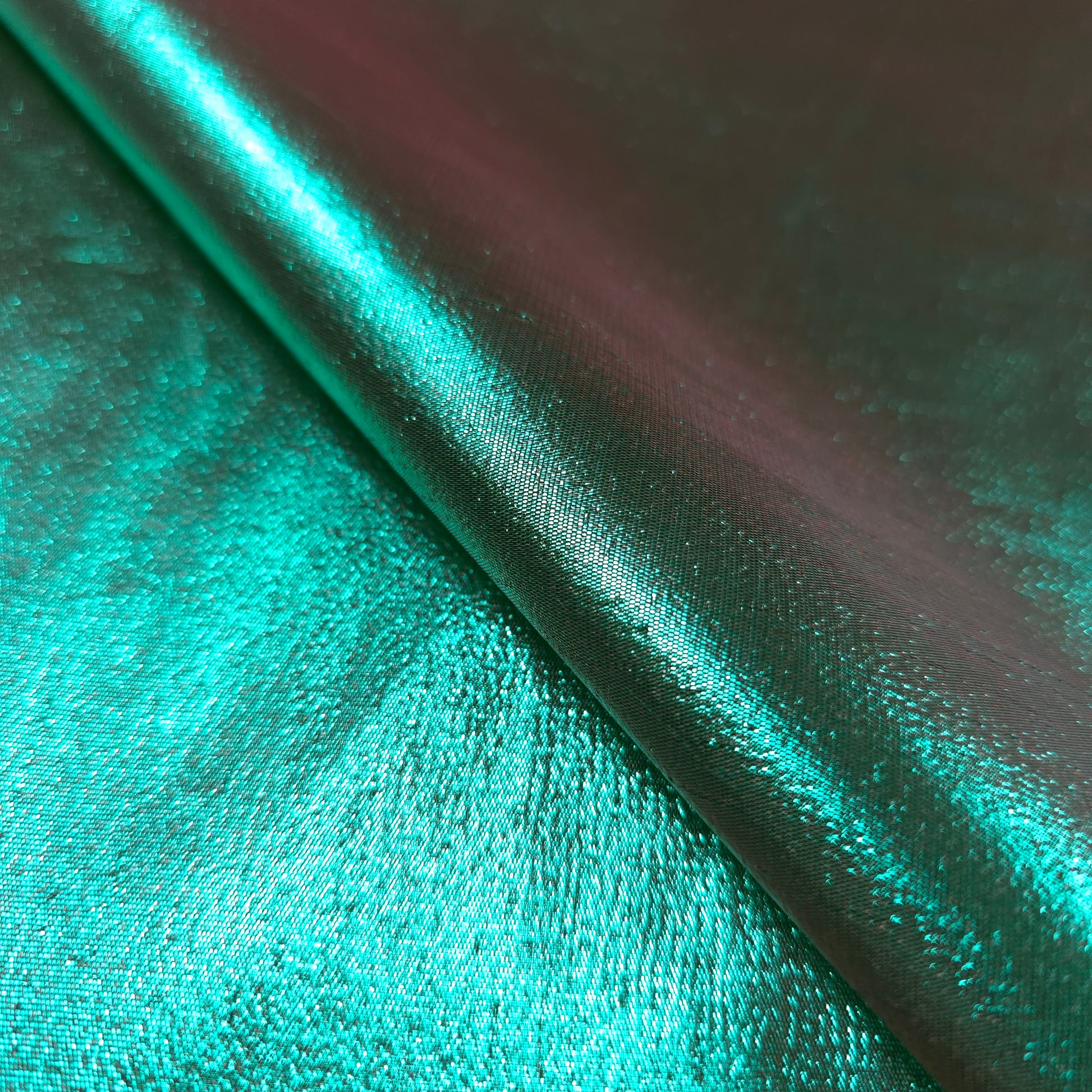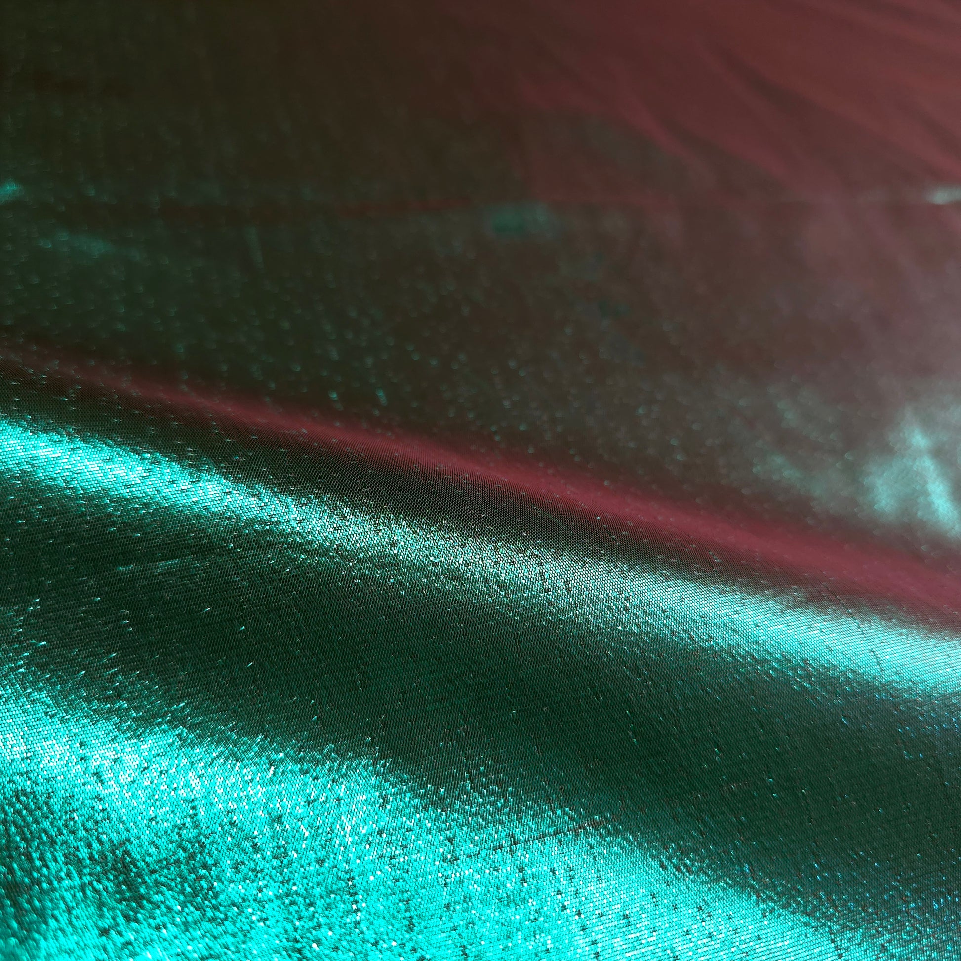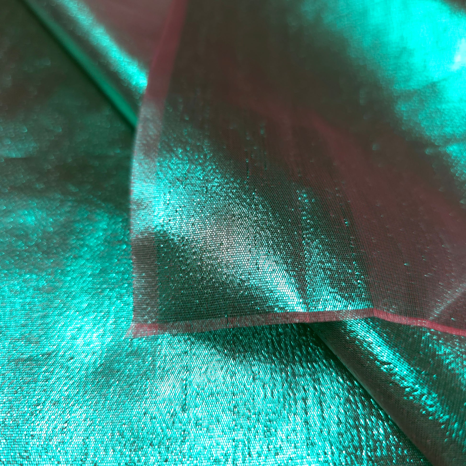 This ultra-lightweight tissue lamé fabric features a brilliant metallic sheen and a stunning two-tone iridescent effect. The color dynamically shifts from a vibrant green to undertones of red depending on the light and angle. It has a characteristic crisp, paper-like feel and a finely crinkled texture.