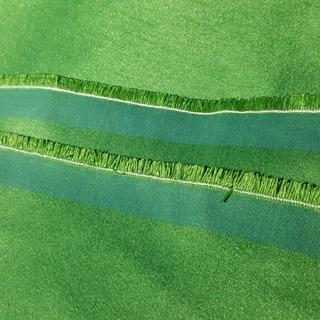 Dupioni fabric is a plain-woven fabric. Using a fine yard on the warp and an uneven yarn on the weft. This creates visual and textural raised thin stripes in the fabric. The thread used here has a subtle sheen to it. giving it a subtle color refracting iridescence.