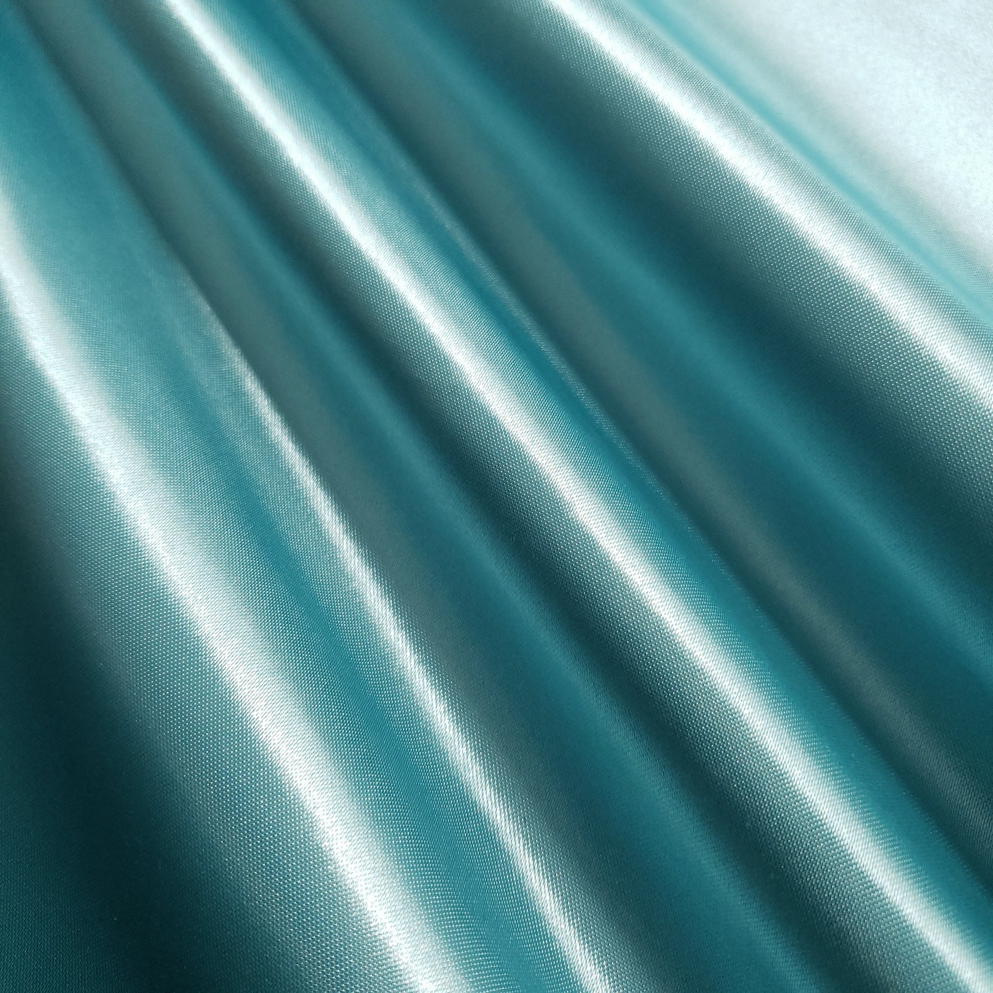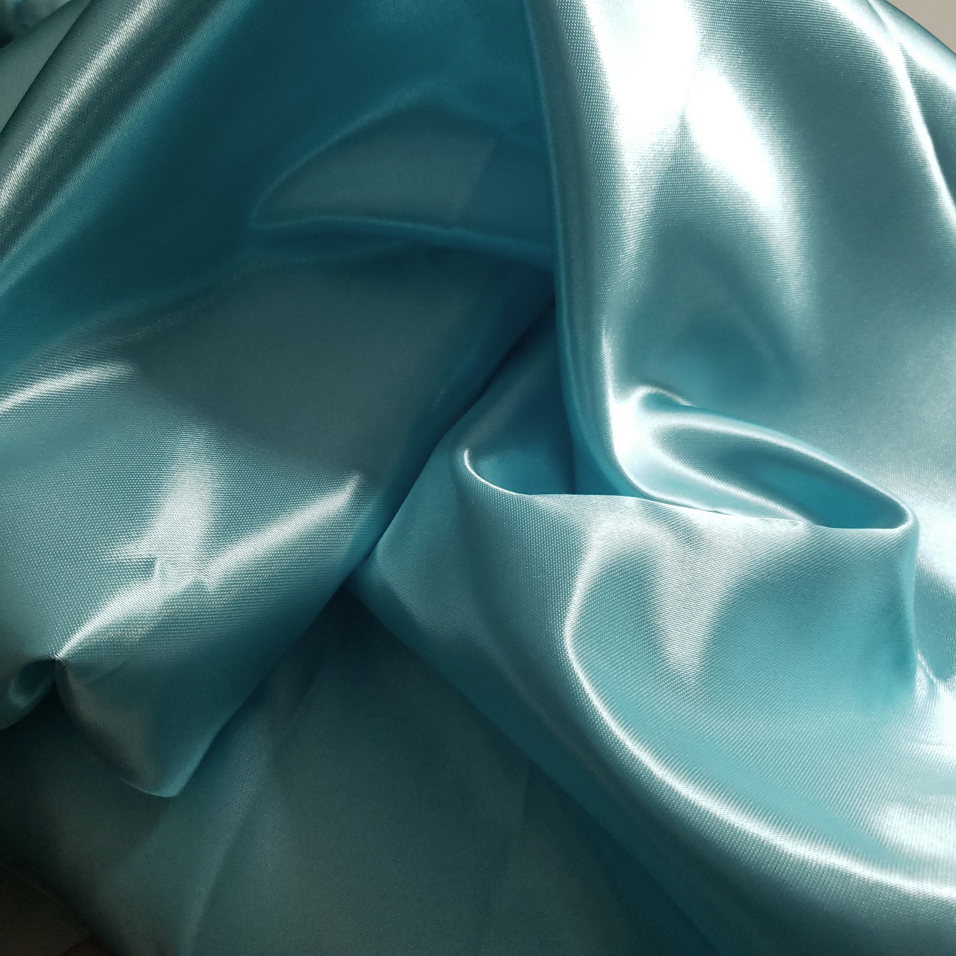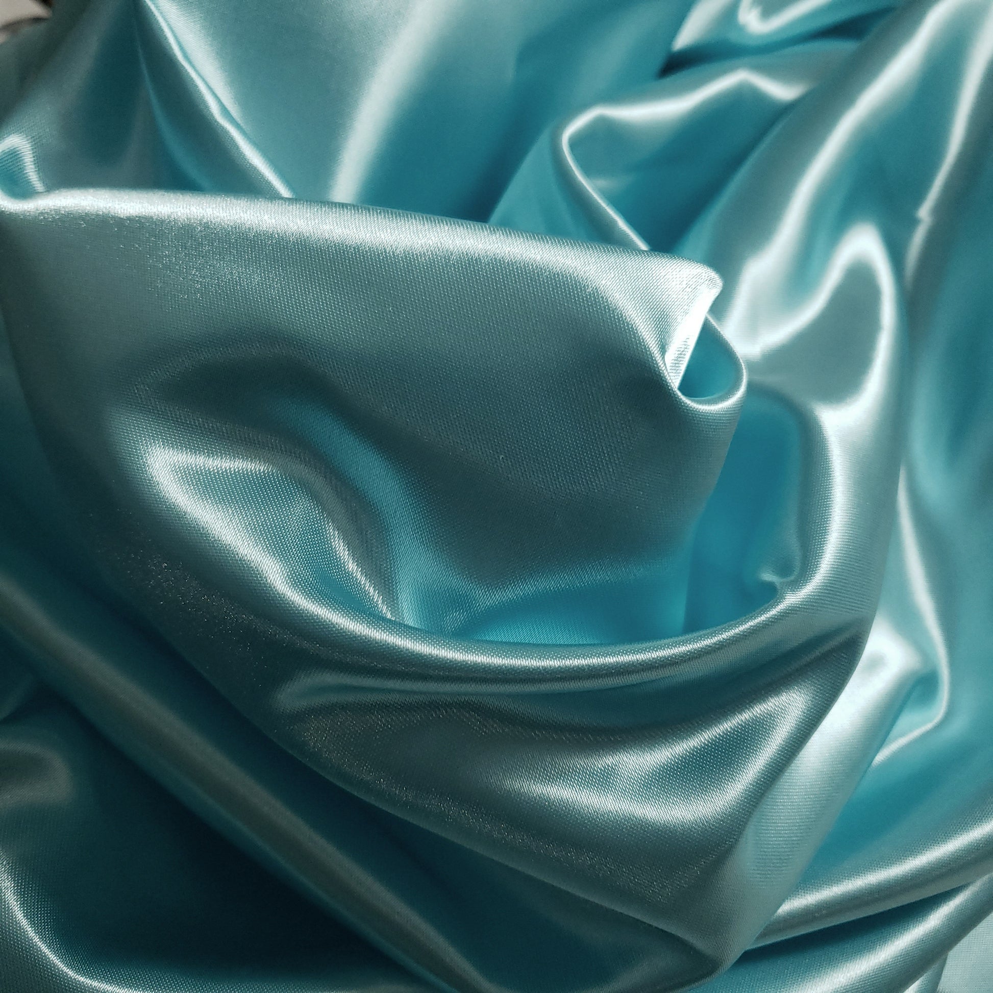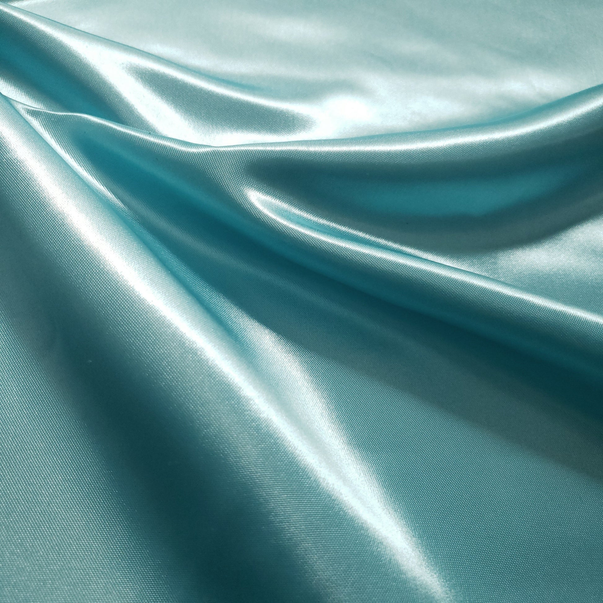 This is our light turquoise heavyweight Structure Satin. At 8oz per yard, this sturdy, high-sheen satin offers a billowy drape and a silky-smooth, glossy finish. Its supportive structure and luxurious feel make it perfect for bridal gowns and special occasion dresses