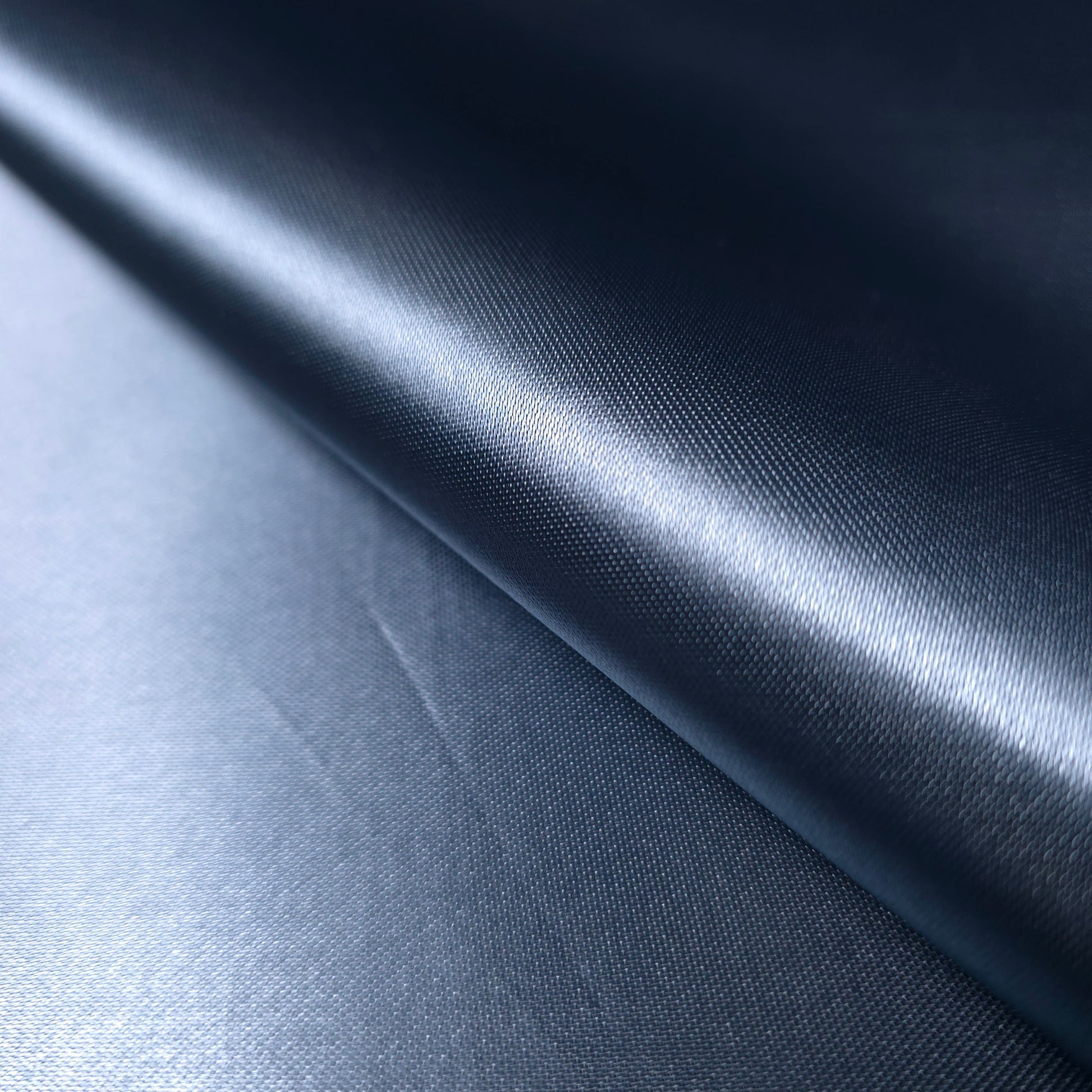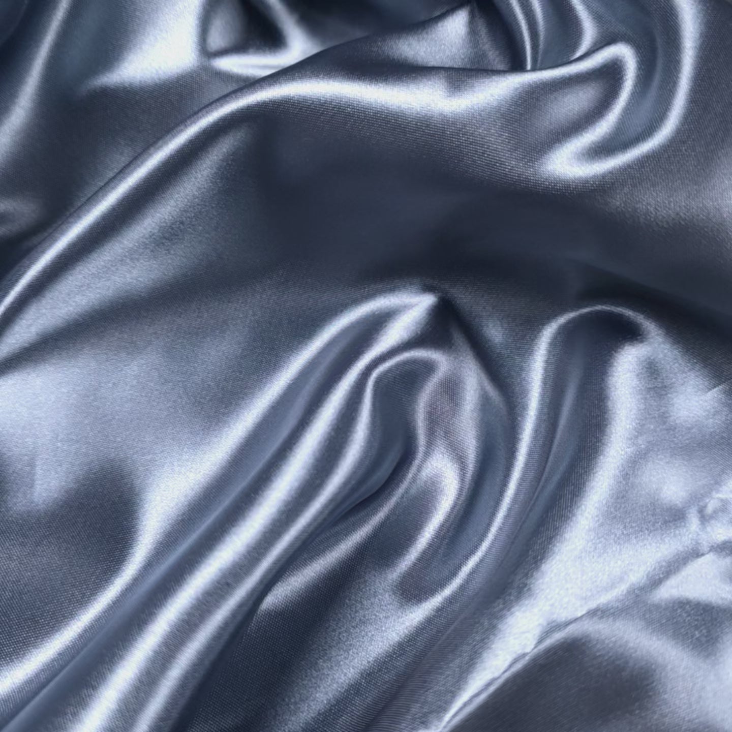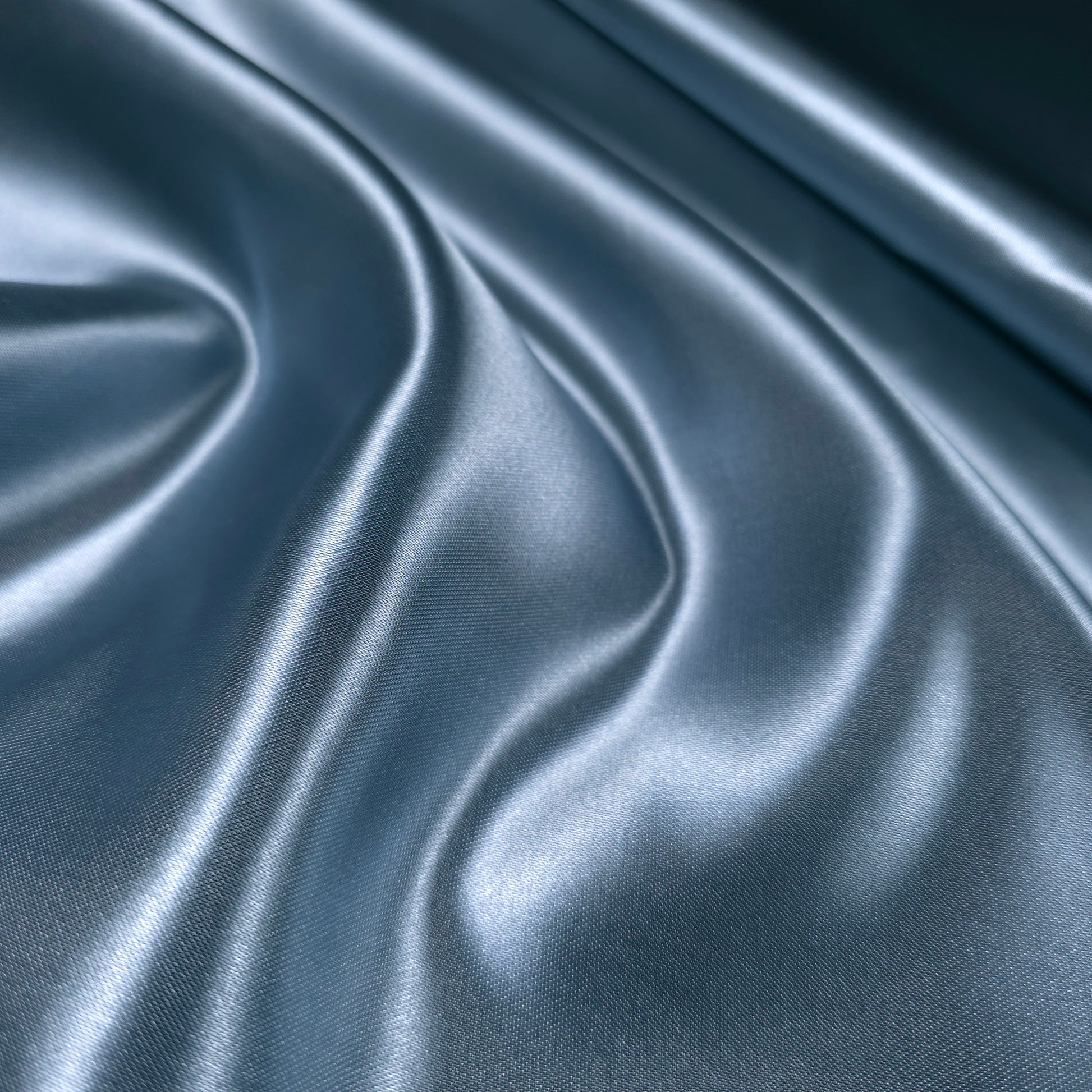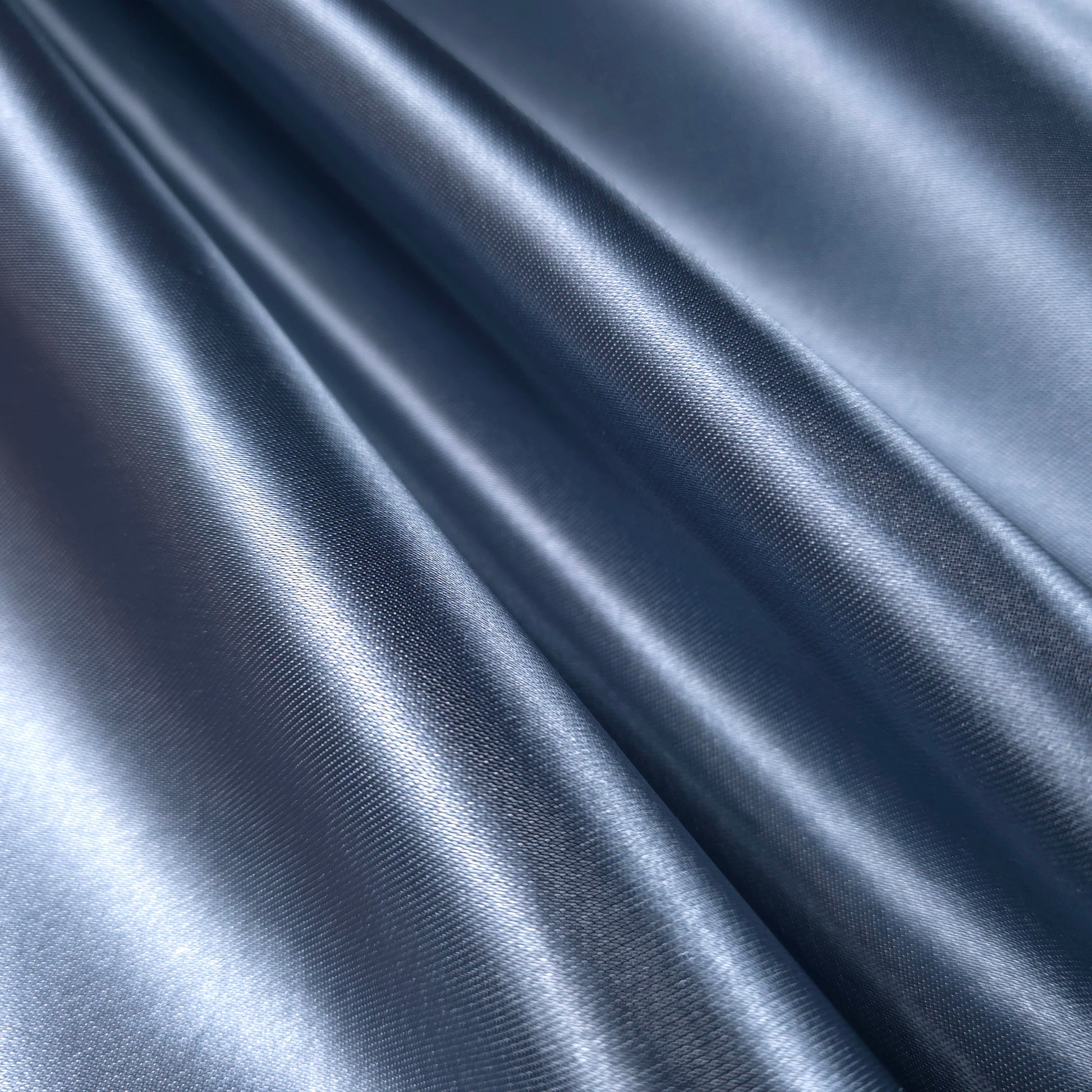 This is our denim blue heavyweight Structure Satin. At 8oz per yard, this sturdy, high-sheen satin offers a billowy drape and a silky-smooth, glossy finish. Its supportive structure and luxurious feel make it perfect for bridal gowns and special occasion dresses