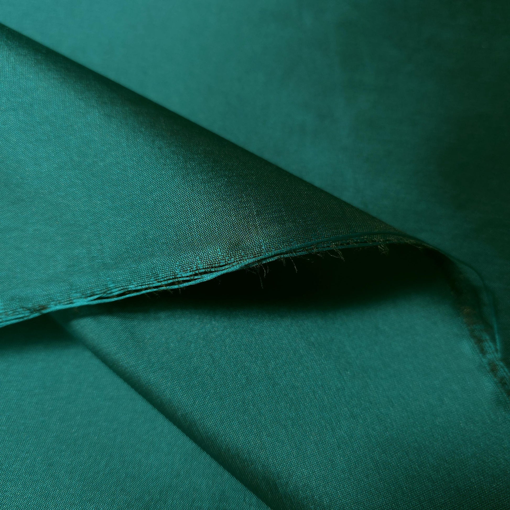 This fabric transcends typical polyester taffeta by replicating the texture and sheen of machine-woven silk taffeta. Lightweight and crisp, it tends to billow rather than drape, lending an elegant dimension to garments and projects. Presented in a deep green teal, it features a subtle black thread woven through, creating a bold, mildly iridescent effect with dark undertones that enhance its visual depth. Measuring 58" wide with no stretch and weighing 5 oz per yard, this versatile fabric is ideal for high-end fashion, linings, home décor, millinery, event decoration, and more.