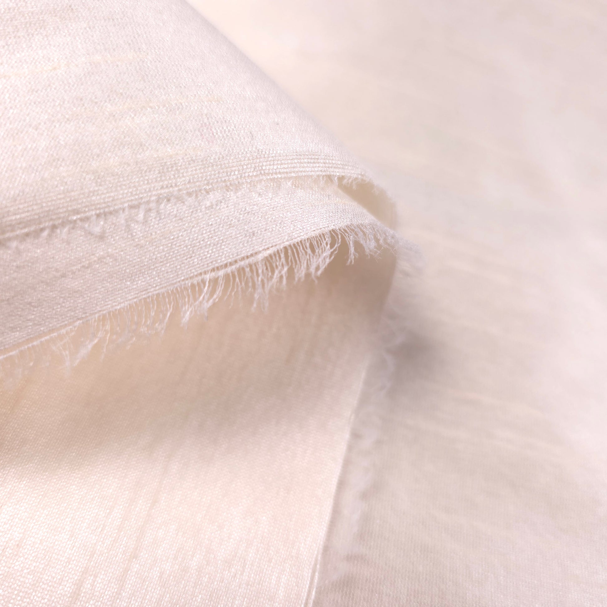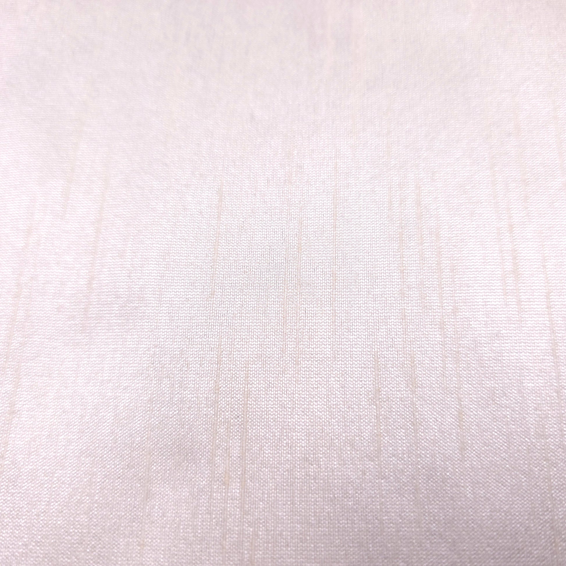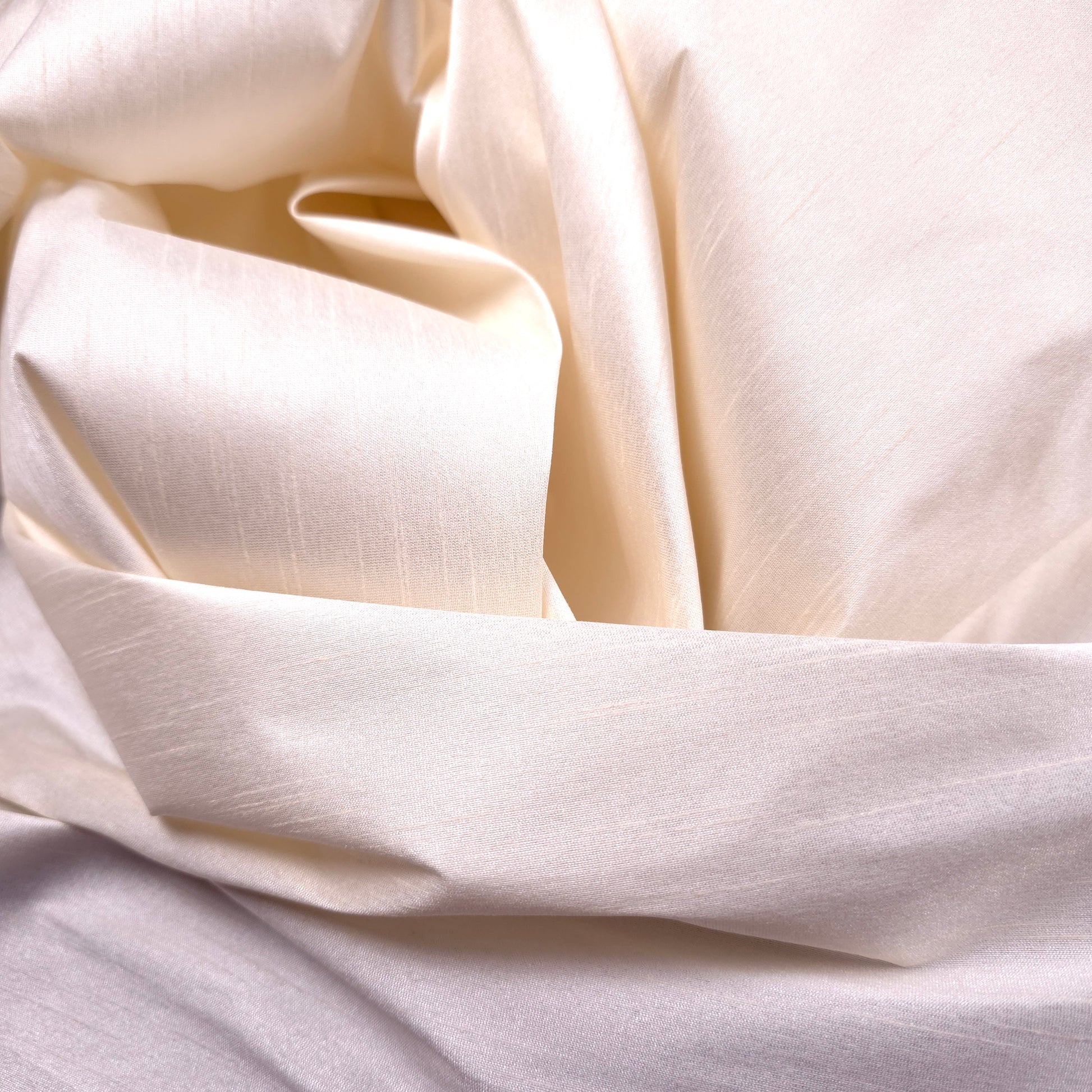 Dupioni fabric is a plain-woven fabric. Using a fine yard on the warp and an uneven yarn on the weft. This creates visual and textural raised thin stripes in the fabric. The thread used here has a subtle sheen to it. giving it a subtle color refracting iridescence.