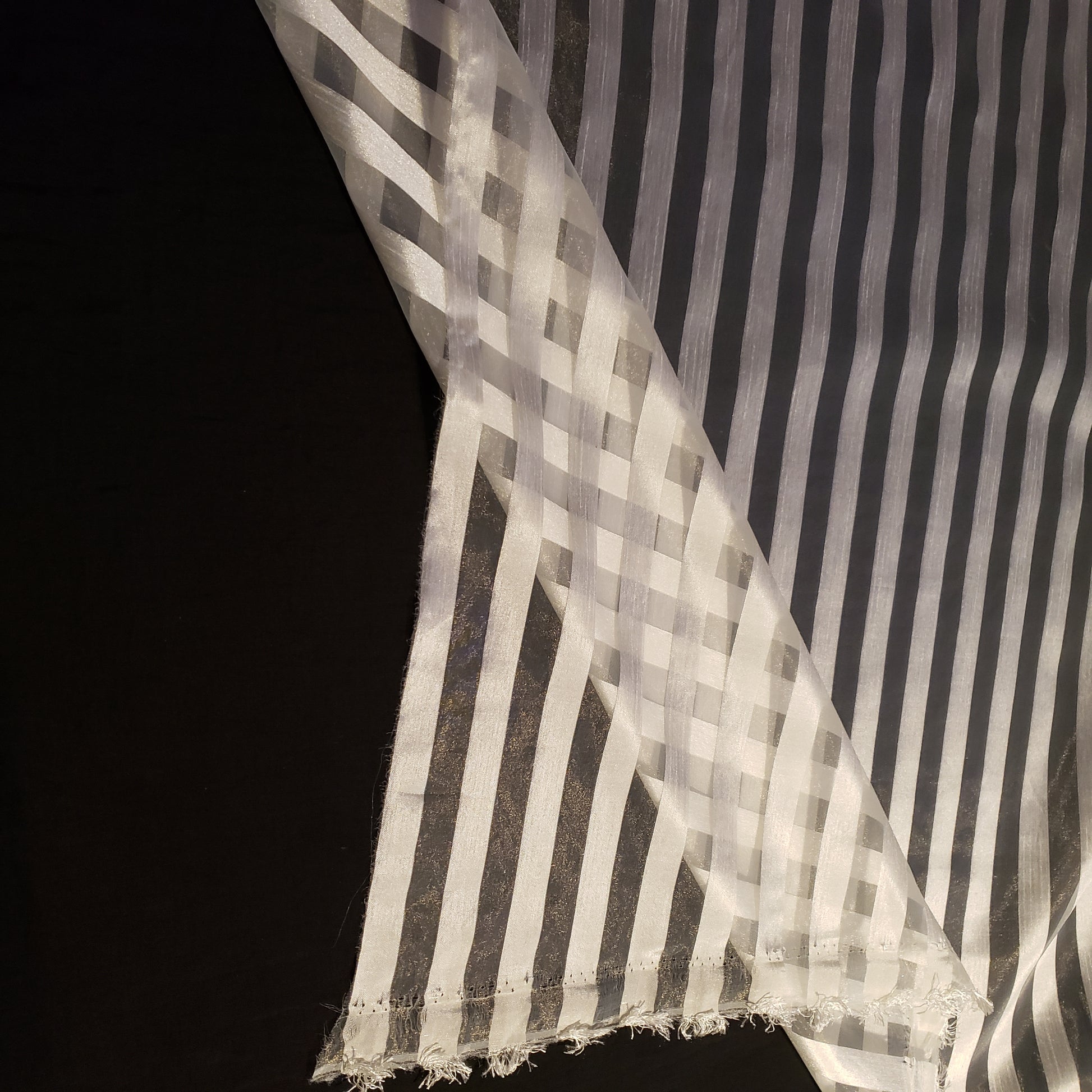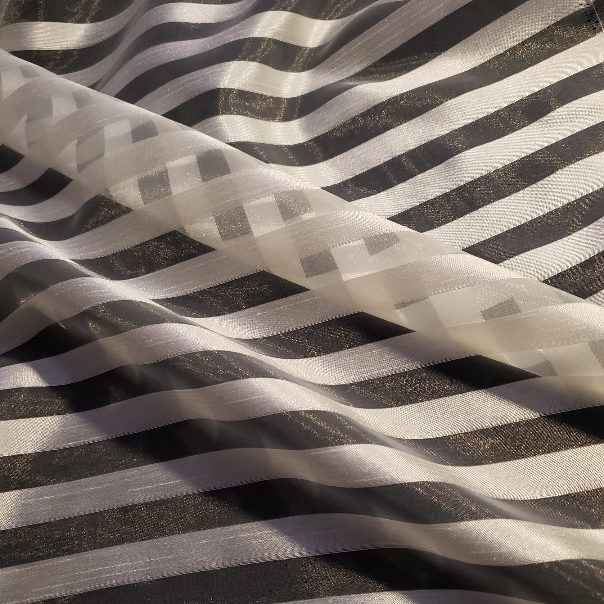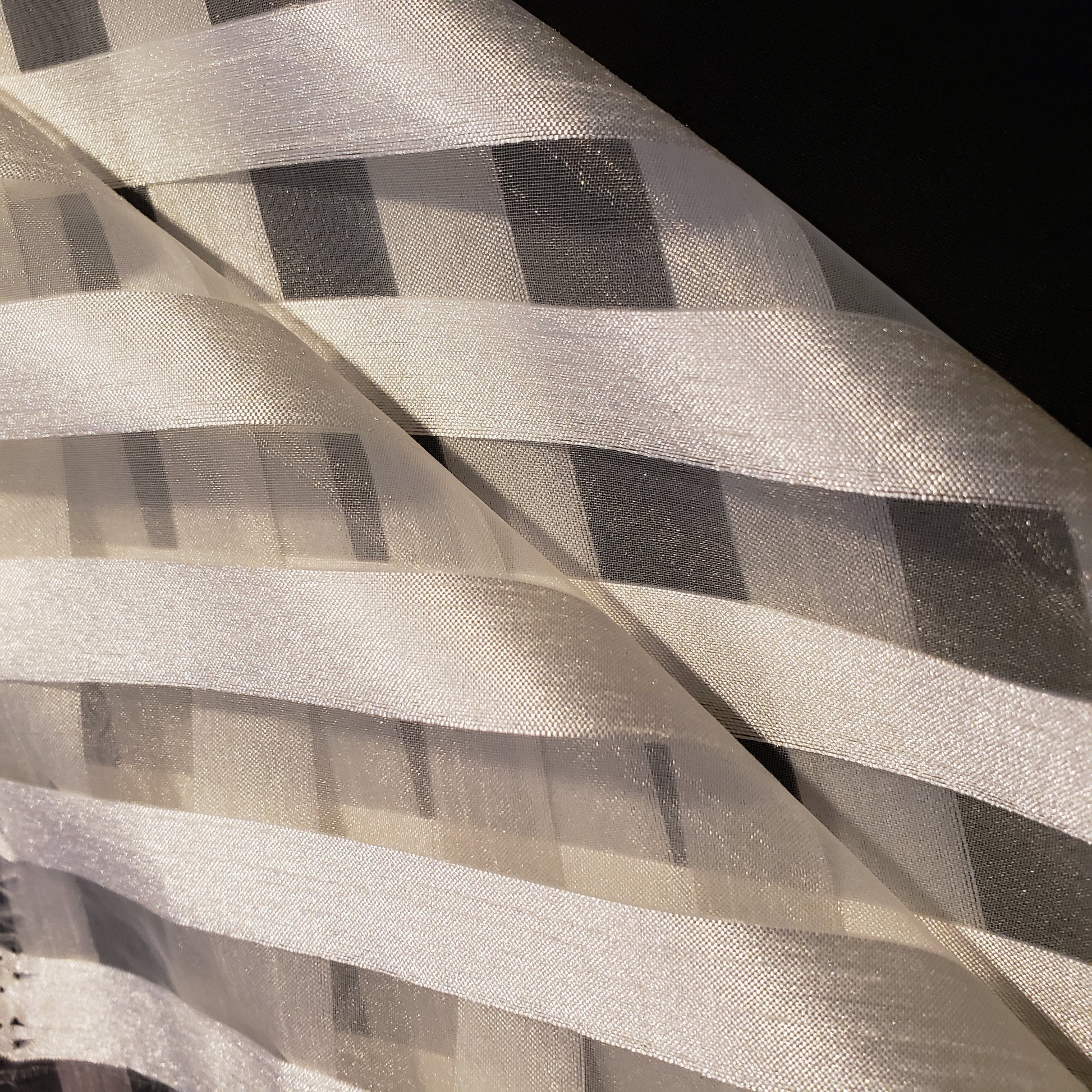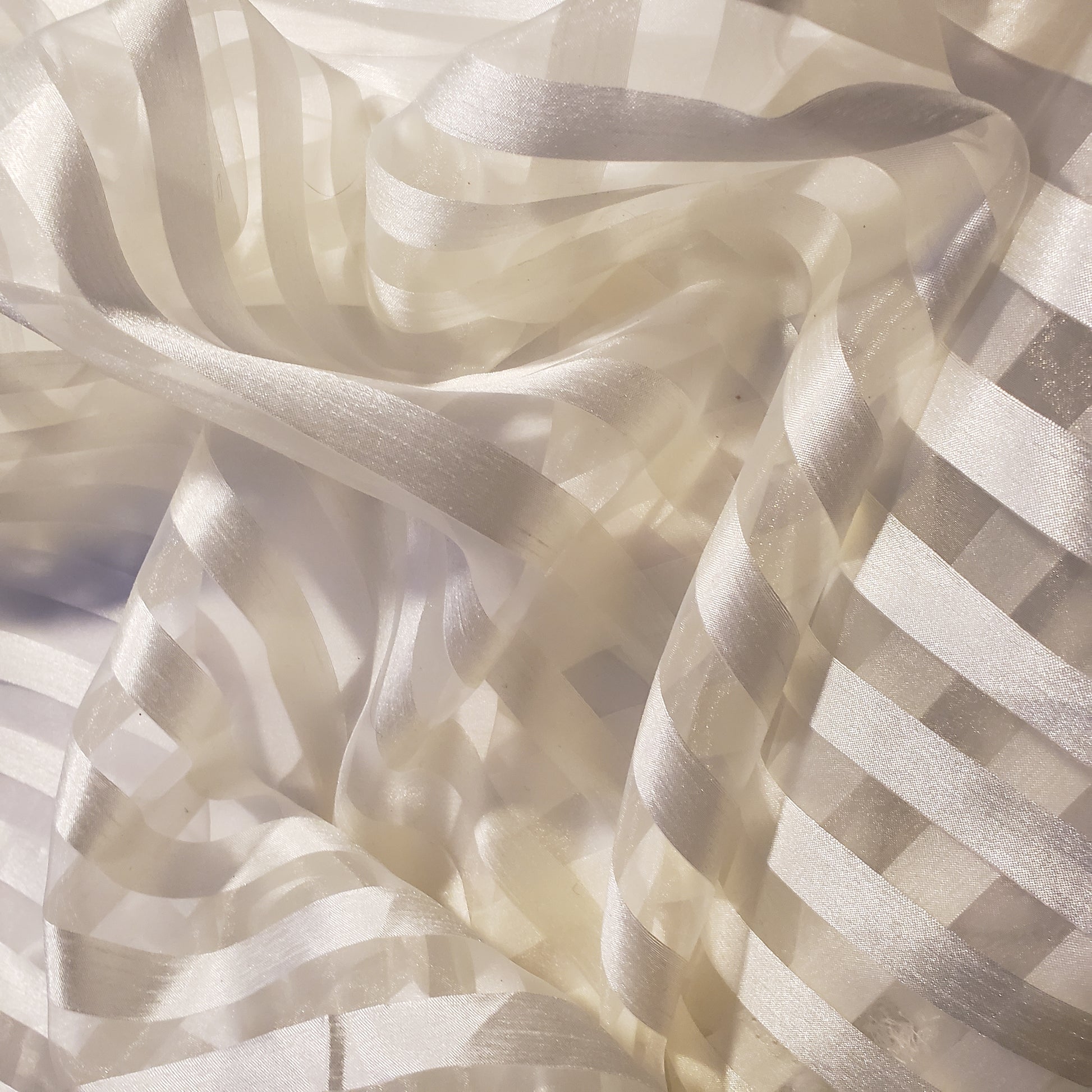 This lightweight organza features a design that alternates between a glossy solid ribbon and a sheer crystal organza stripe. The stripe runs from selvage edge to selvage edge.