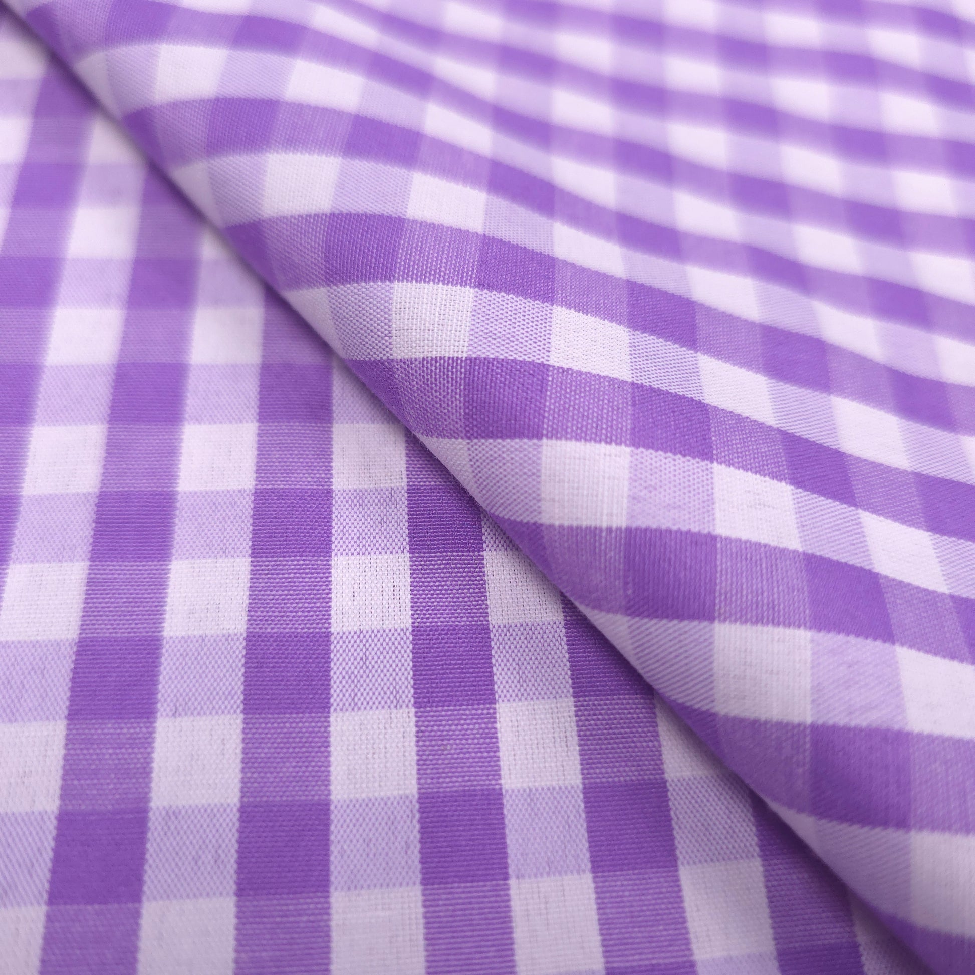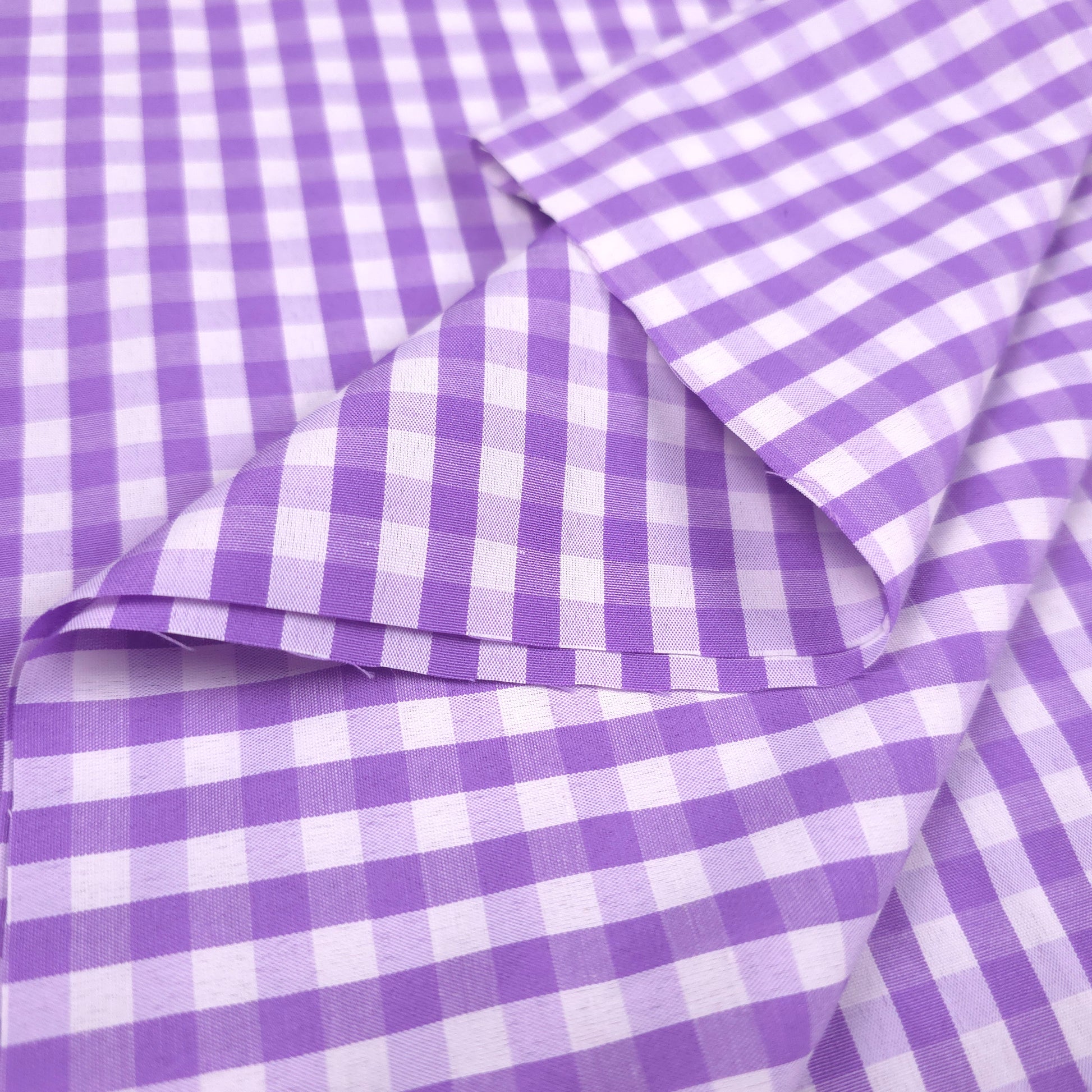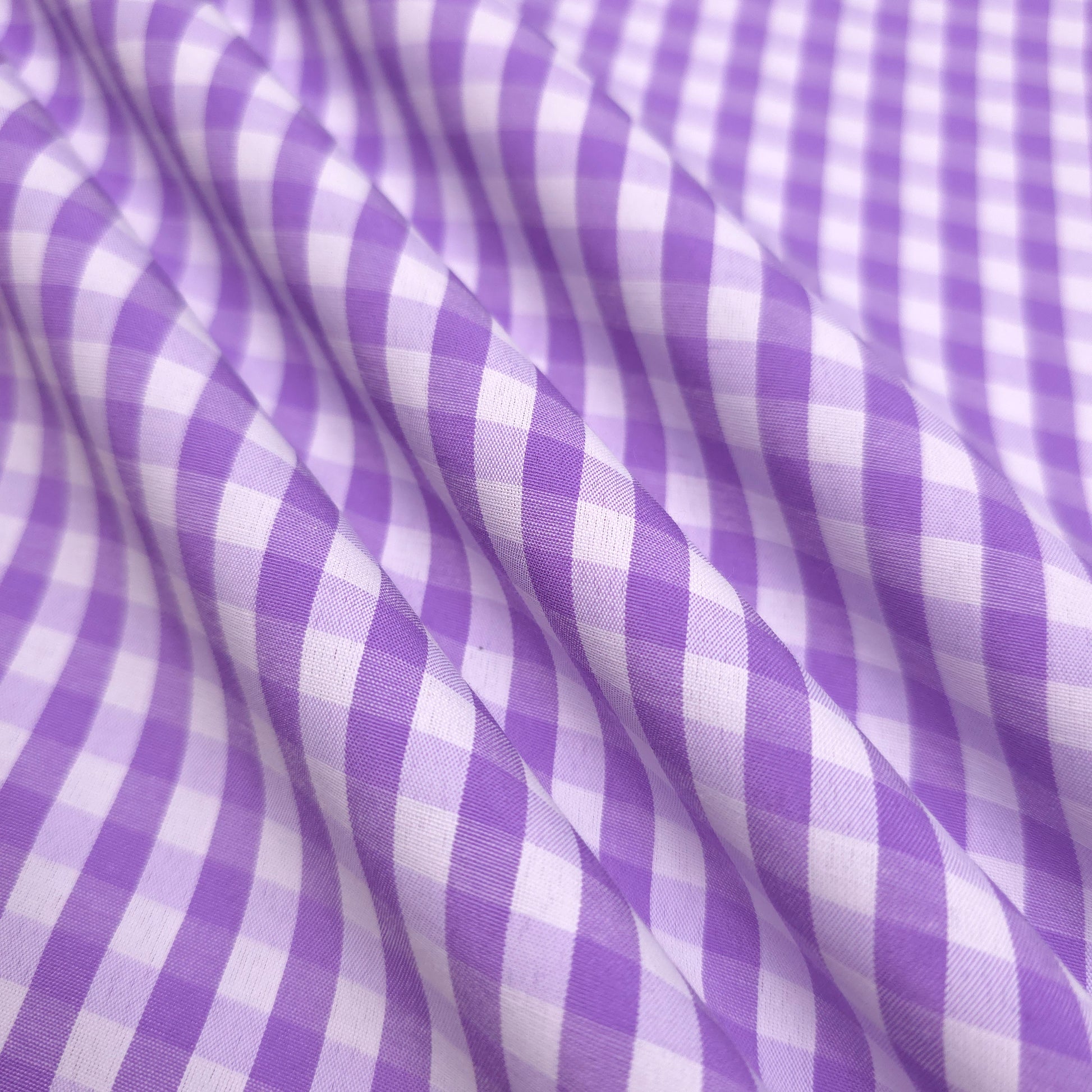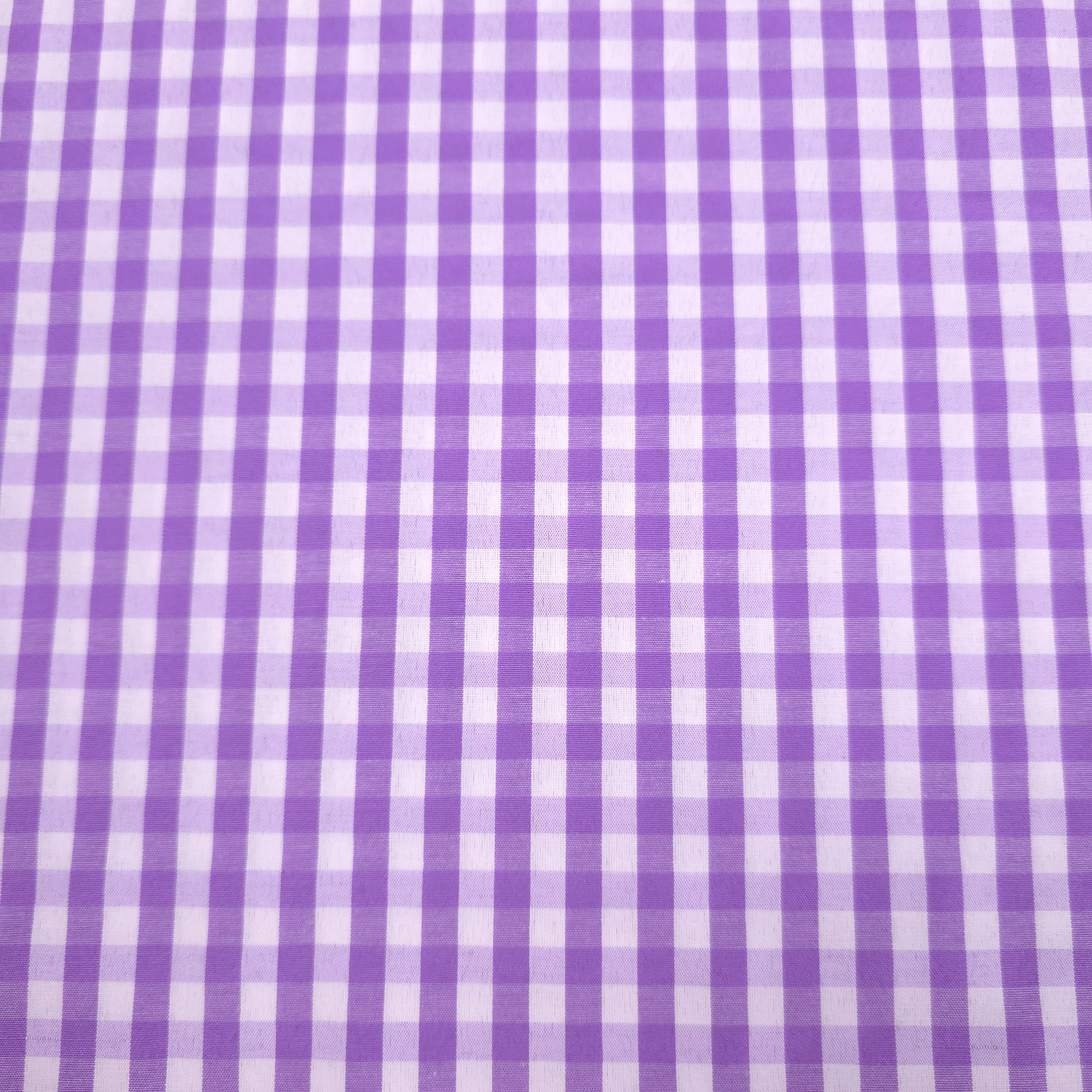 This fabric features a 1/4 inch lilac purple gingham pattern. Crafted from a durable 80/20 poly-cotton blend, this material offers the benefits of both fibers: the crispness and wrinkle-resistance of polyester with the soft, breathable touch of cotton. Its versatile light-to-medium weight and smooth finish suit a variety of projects, including charming children's wear, delightful spring and summer blouses, and attractive home accents like kitchen curtains and nursery decor. This no-stretch fabric is 58 inches wide and sold by the yard for all your creative needs.