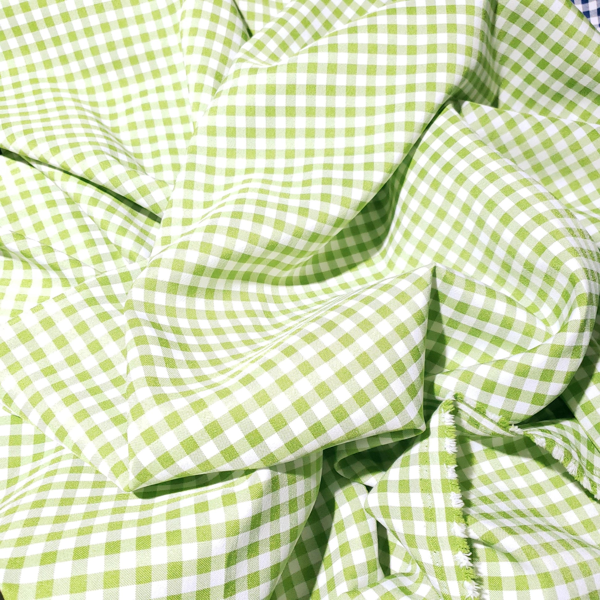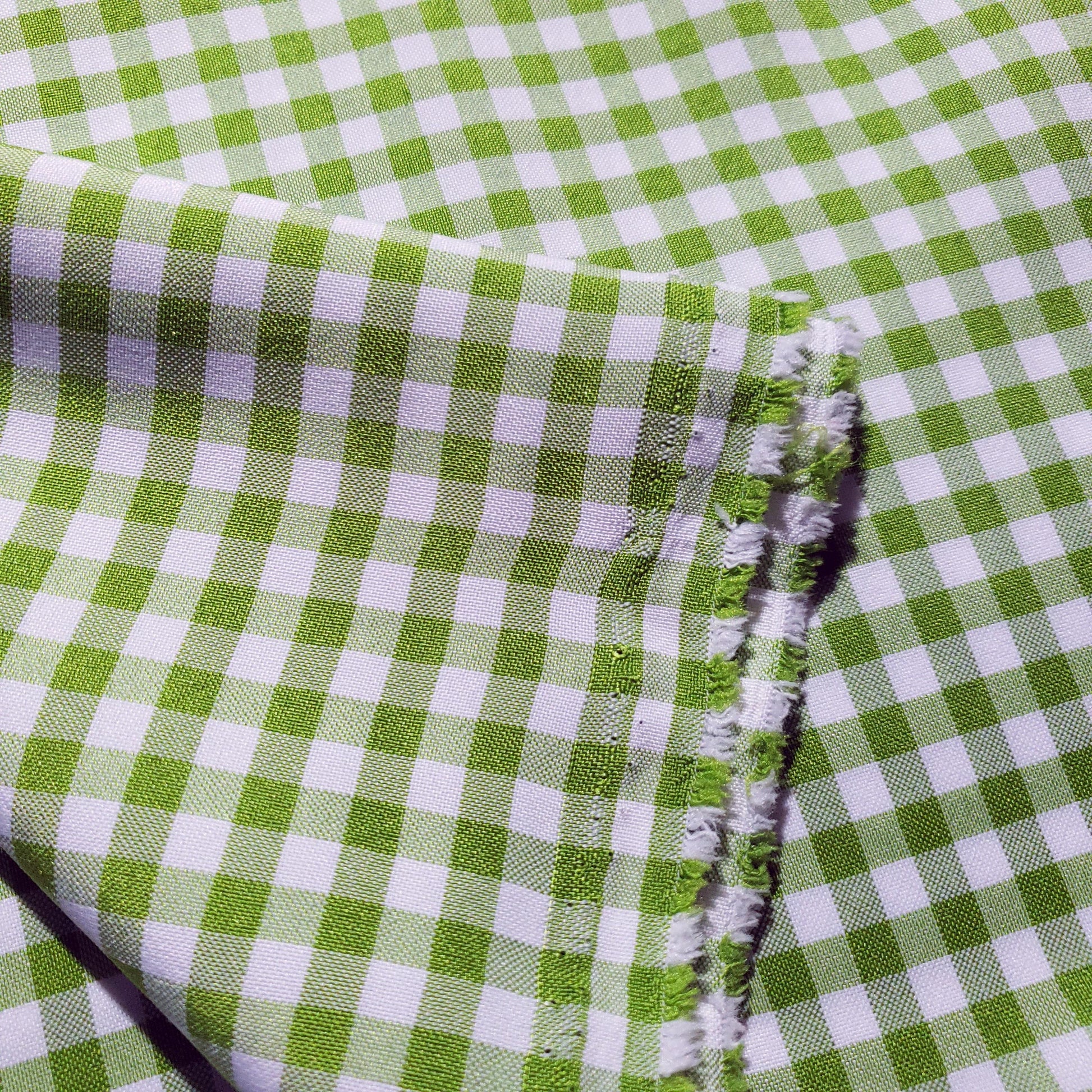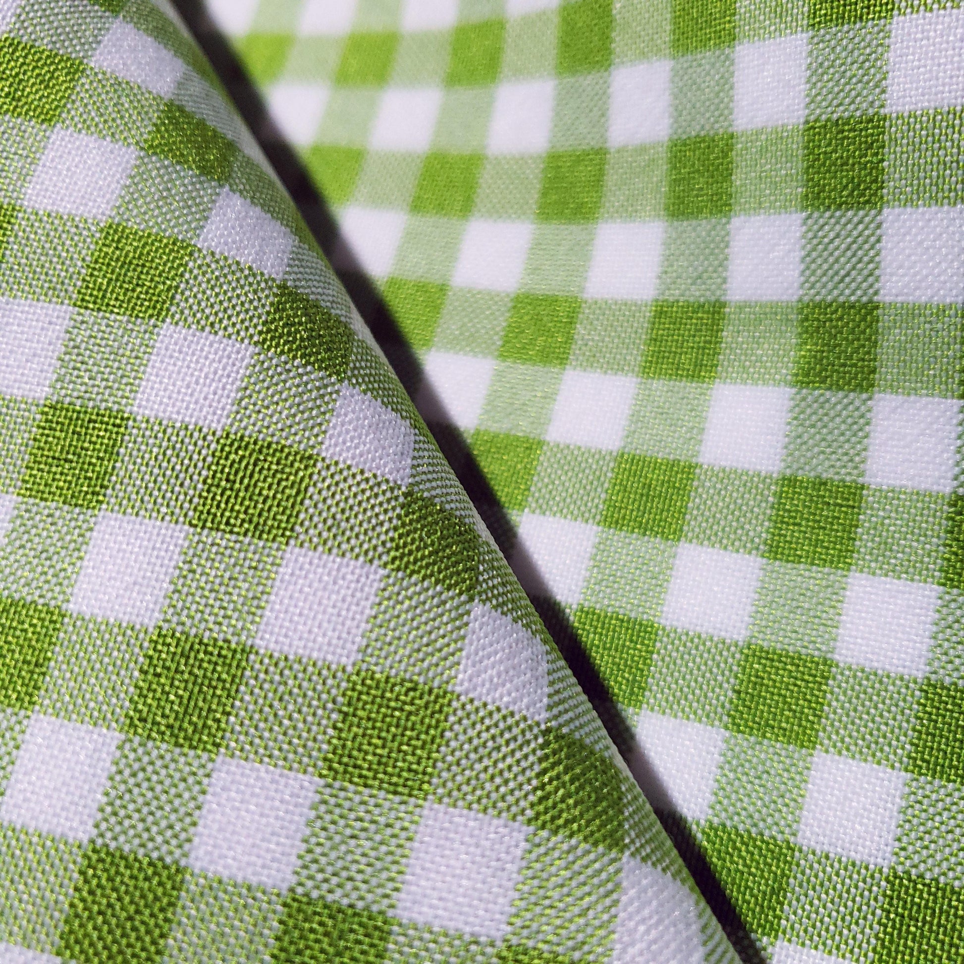 This is a lime green gingham poly poplin fabric. It features a classic checkered pattern in a 1/4-inch stripe, made up of alternating squares of bright green and crisp white. The poly poplin weave gives the fabric a smooth surface and a good body, making it durable and easy to work with. The colors are bright and consistent, offering a fresh and cheerful aesthetic. This fabric has a matte finish and holds its shape well.