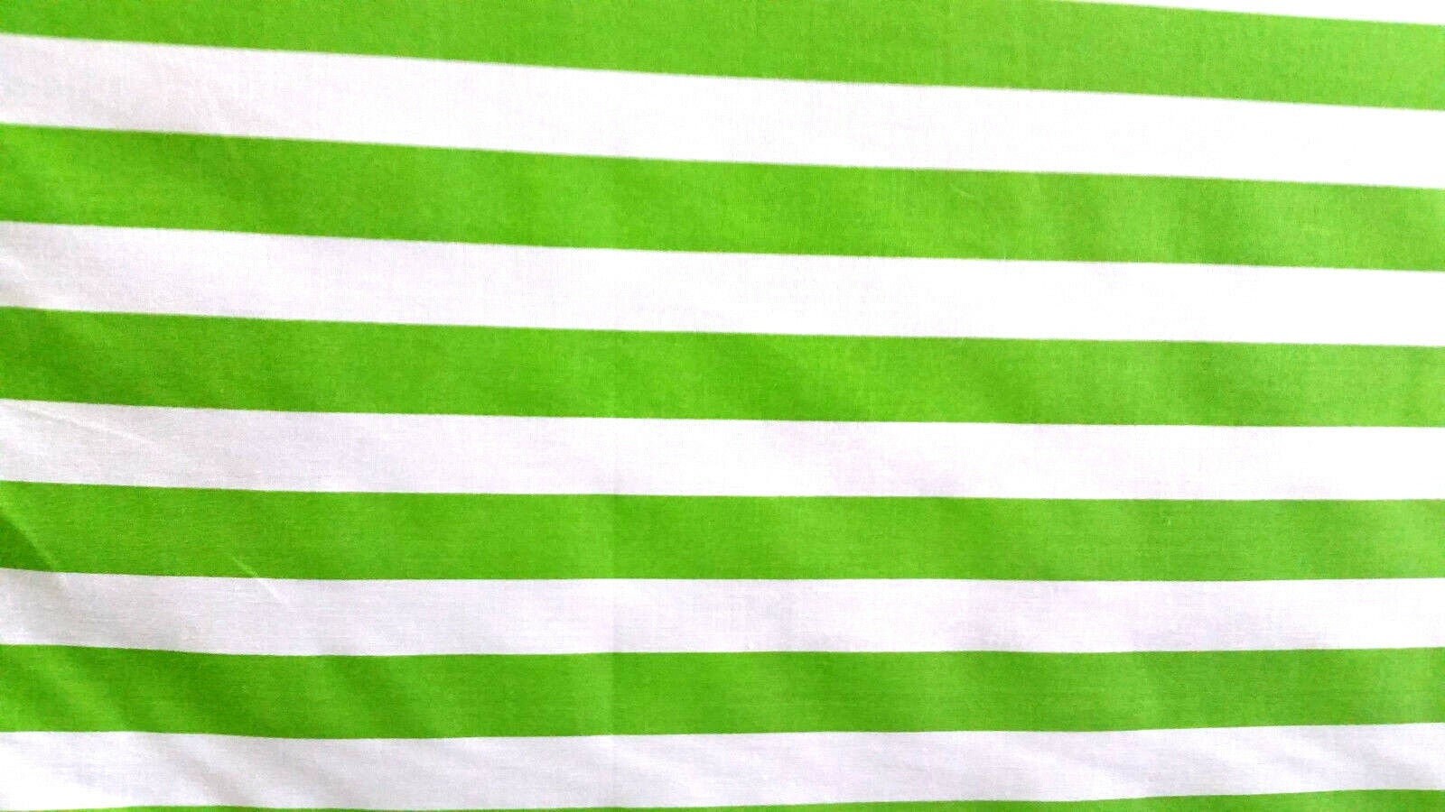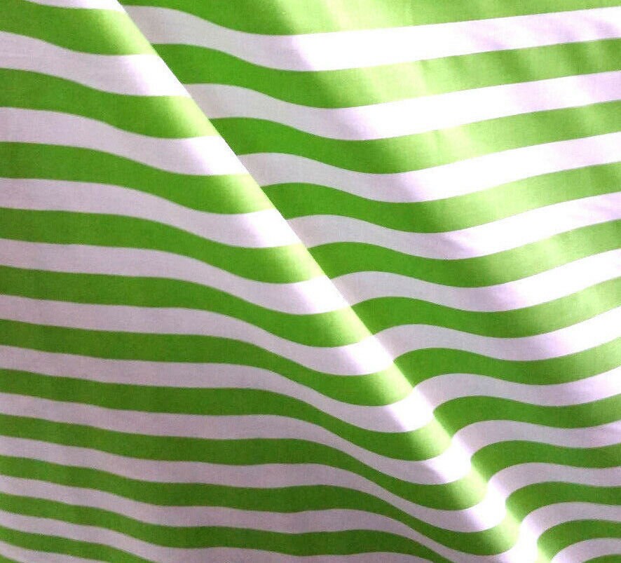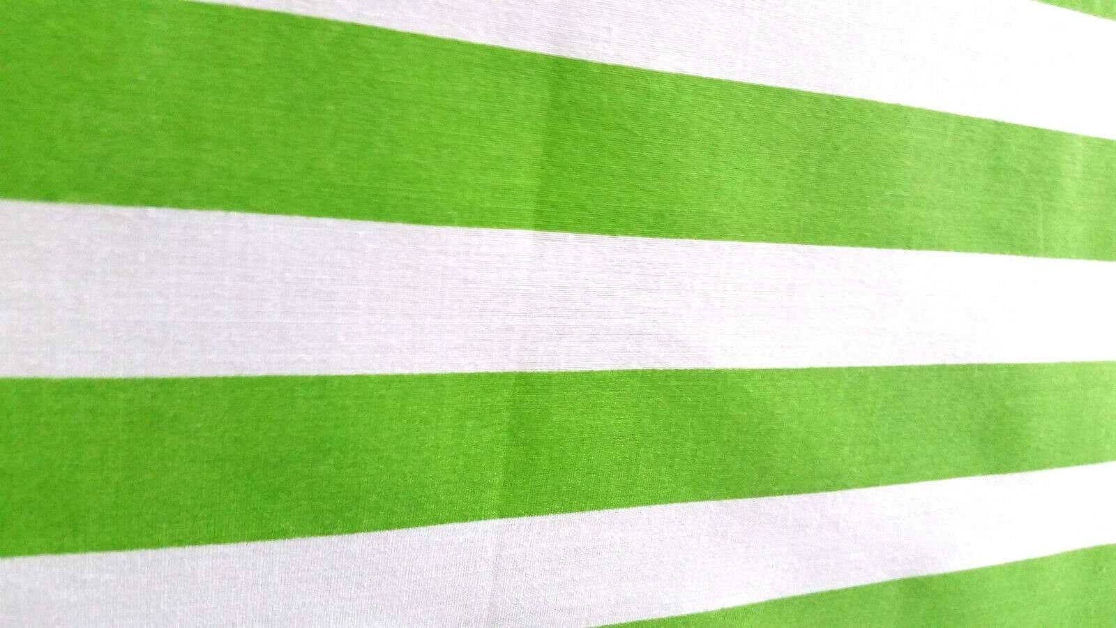 This fabric showcases a one-inch lime green and white stripe running lengthwise. Crafted from a lightweight cotton blend, it offers excellent drape and breathability, making it ideal for versatile applications.