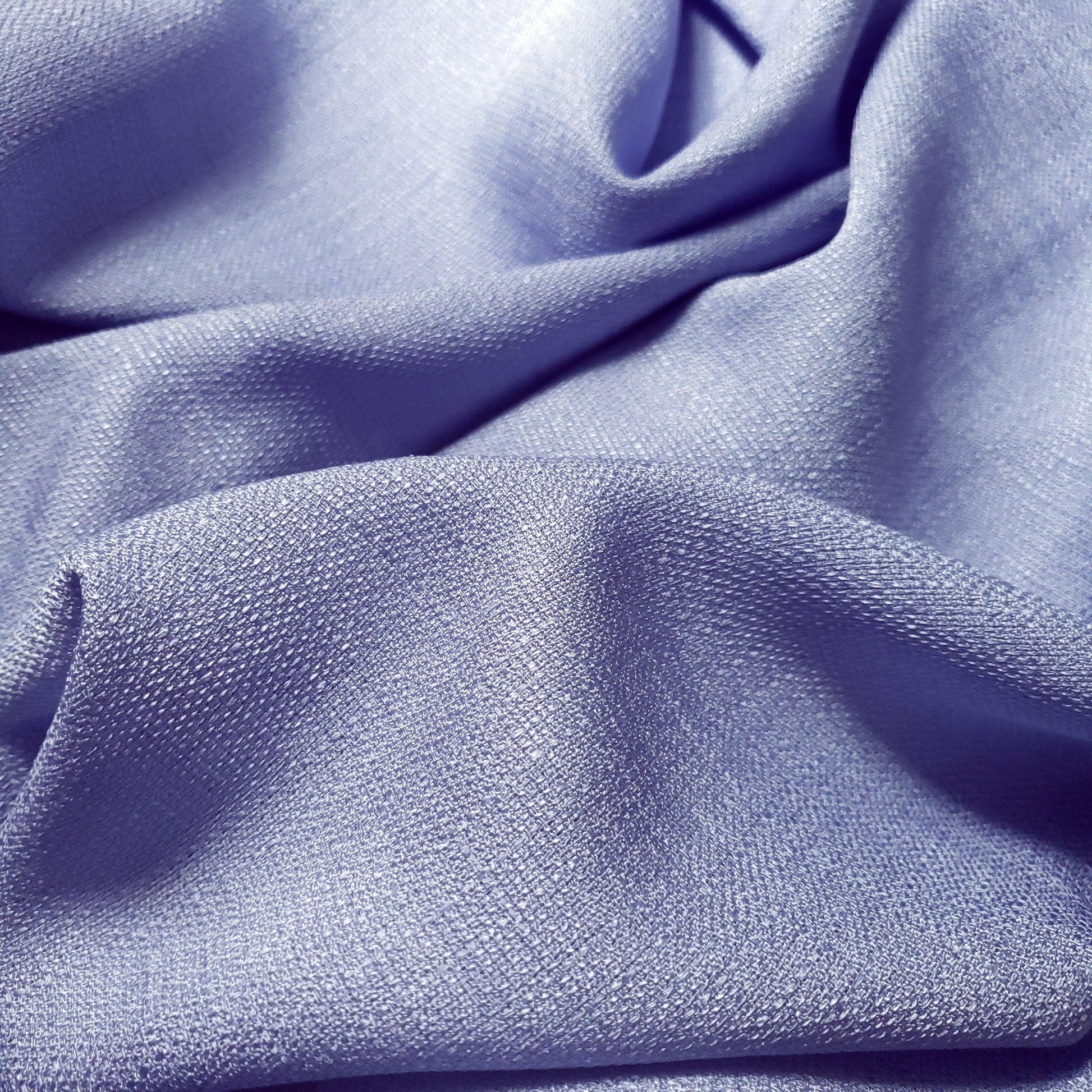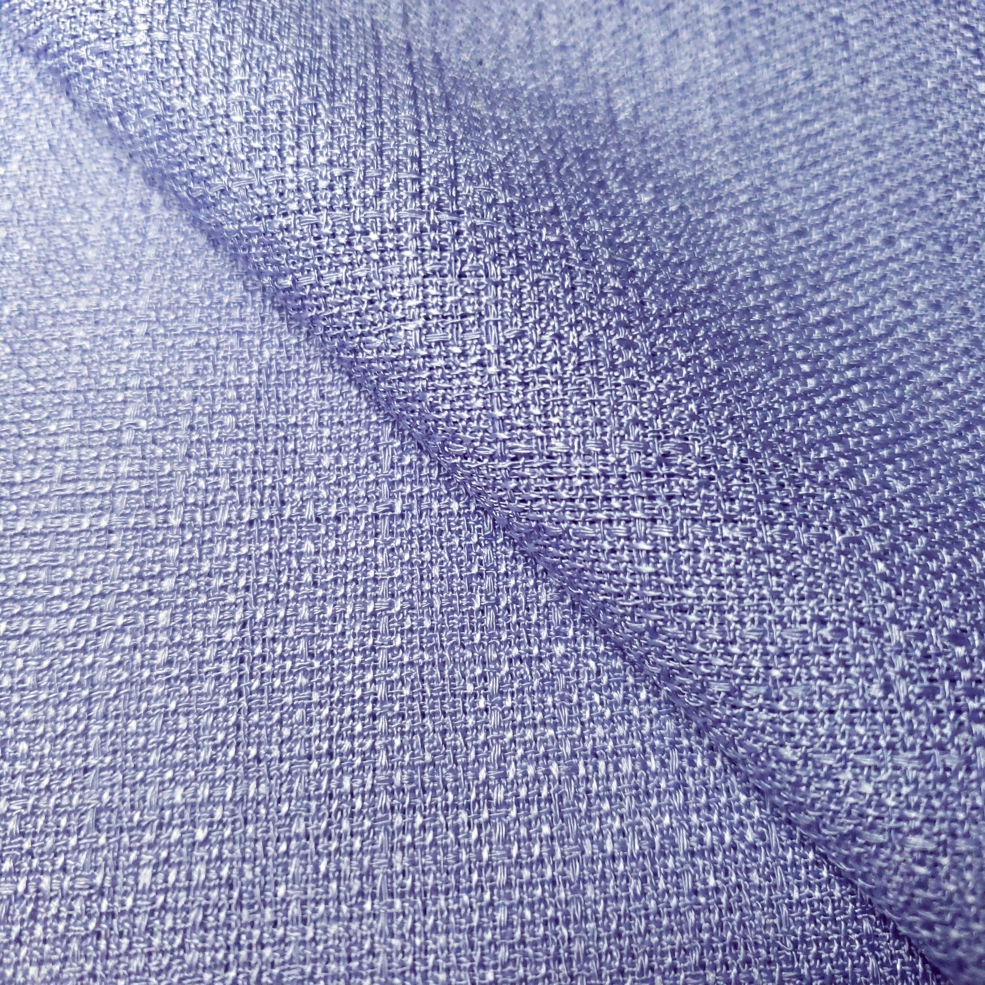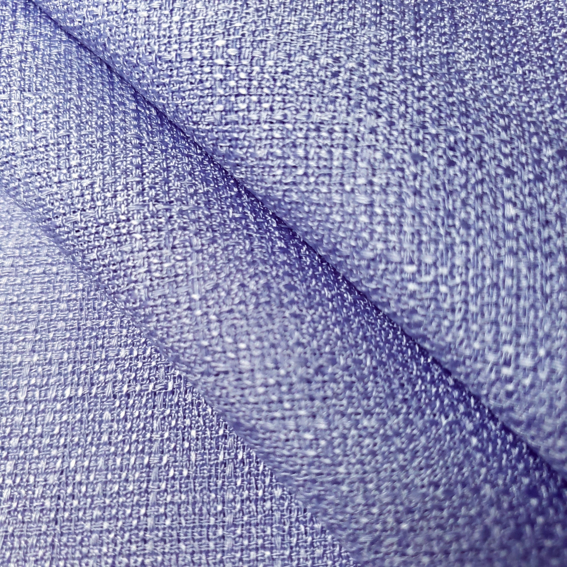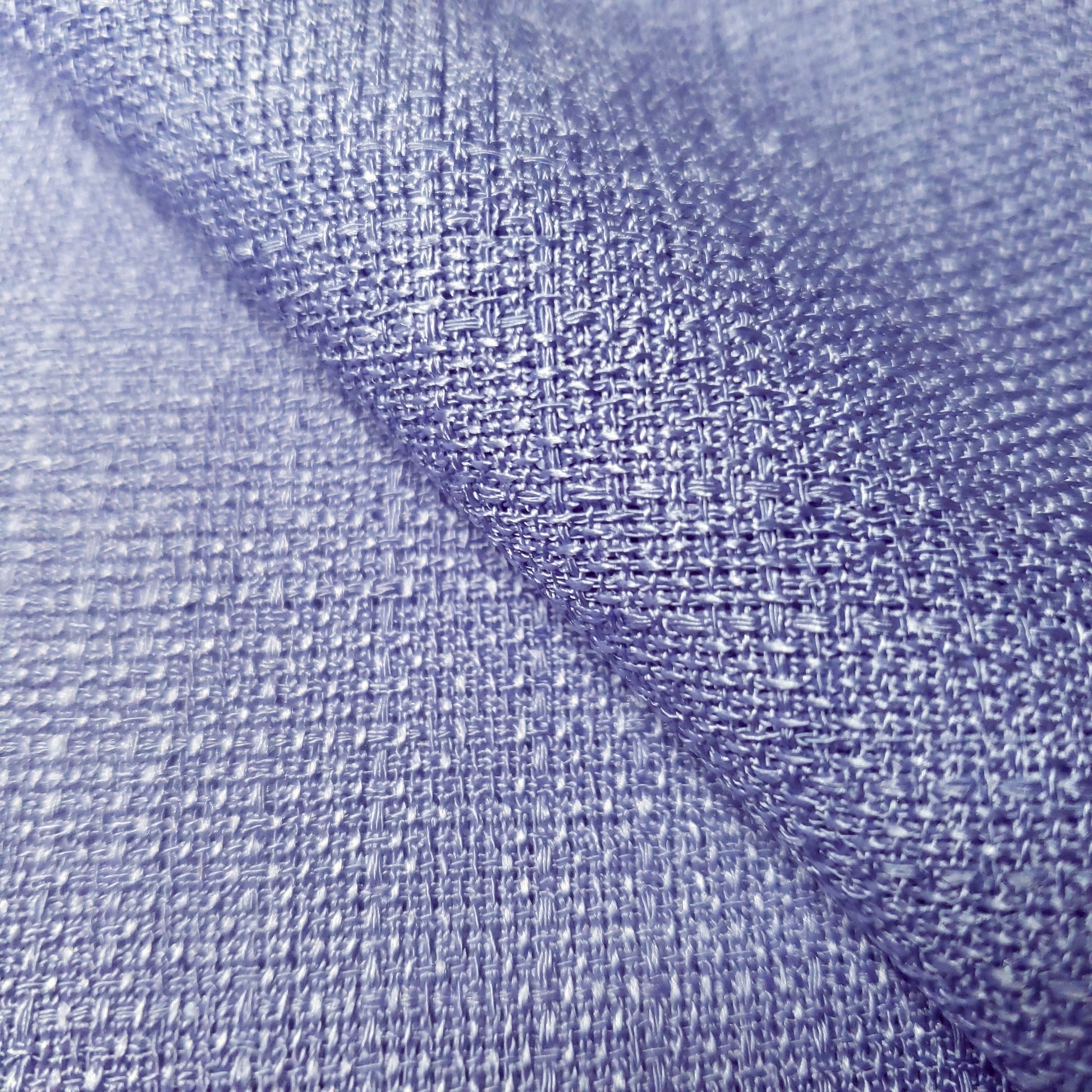 This polyester faux linen fabric is wrinkle resistant with a cool hand and a excellent drape. The surface texture has a well pronounced rustic weave. This color borders between blue and lilac. It as a medium weight fabric. It is wrinkle resistant making it ideal for tablecloths.
