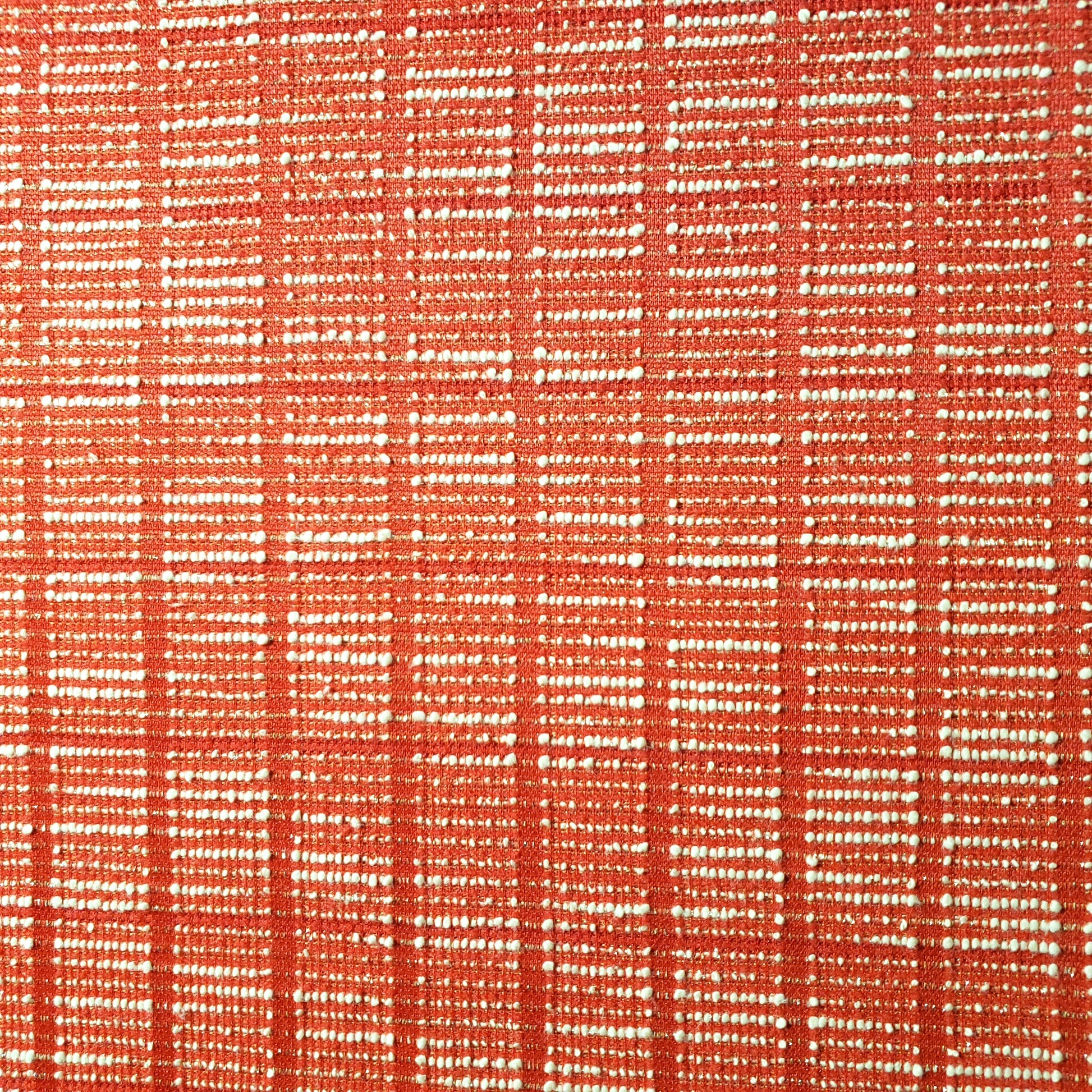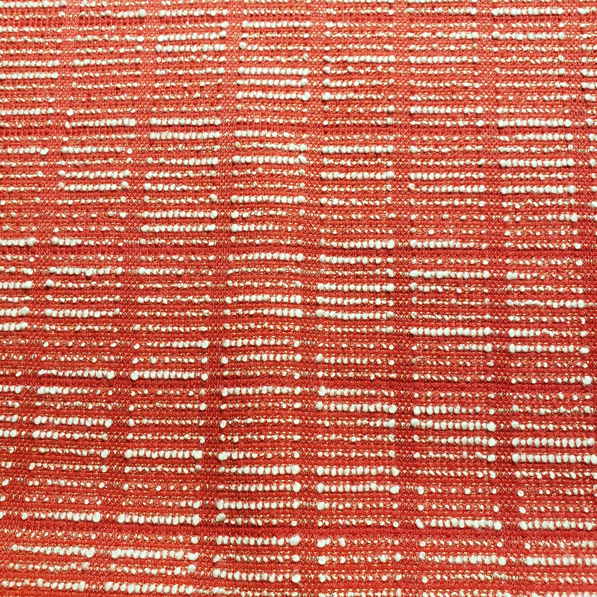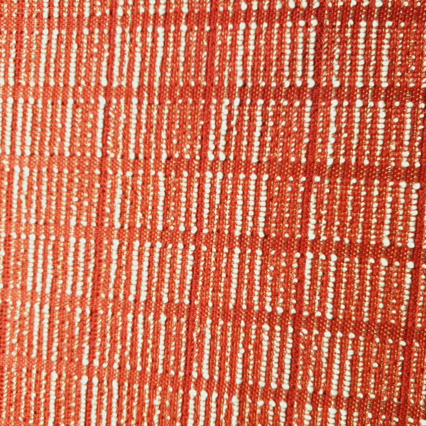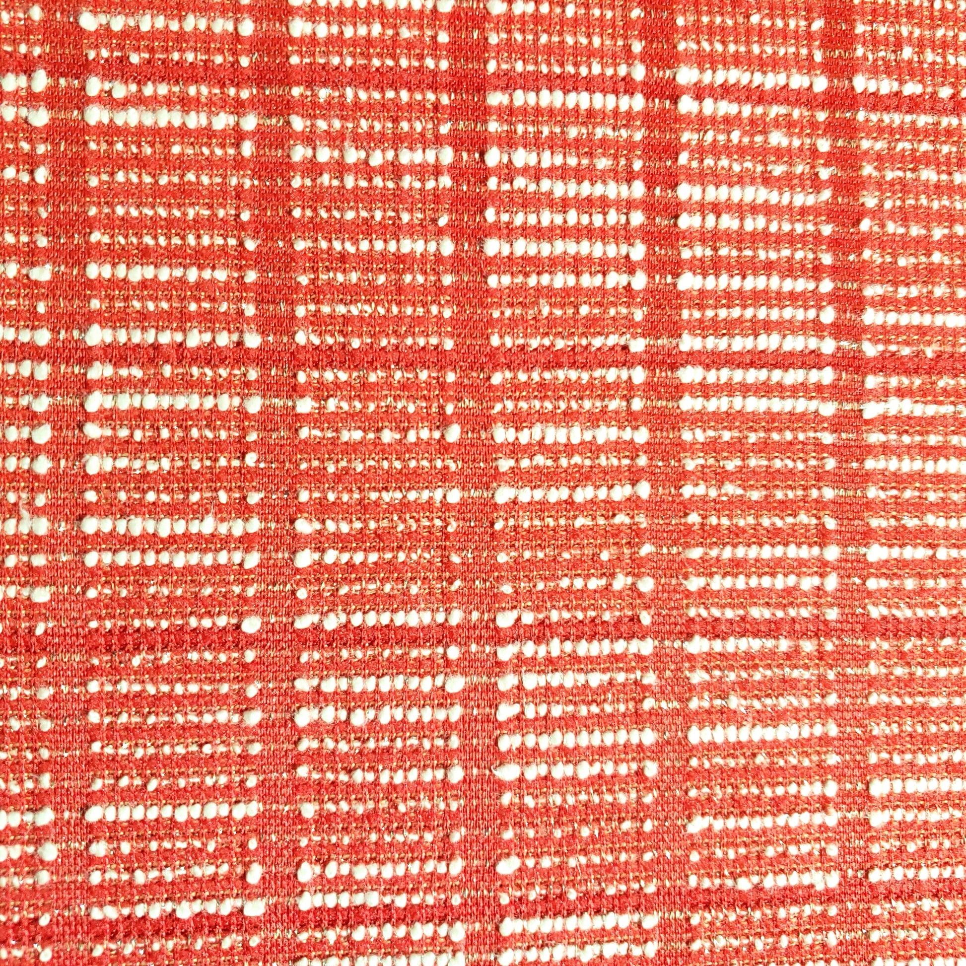 This medium weight knit fabric features a plaid tile design in orange, off white and a metallic silver shimmer threaded into the weave. The white squares are made with embossed white stripes of rustic weave multi size dots. The silver shimmer does not appear in the photos but it is there. We would be happy to send out a free swatch.