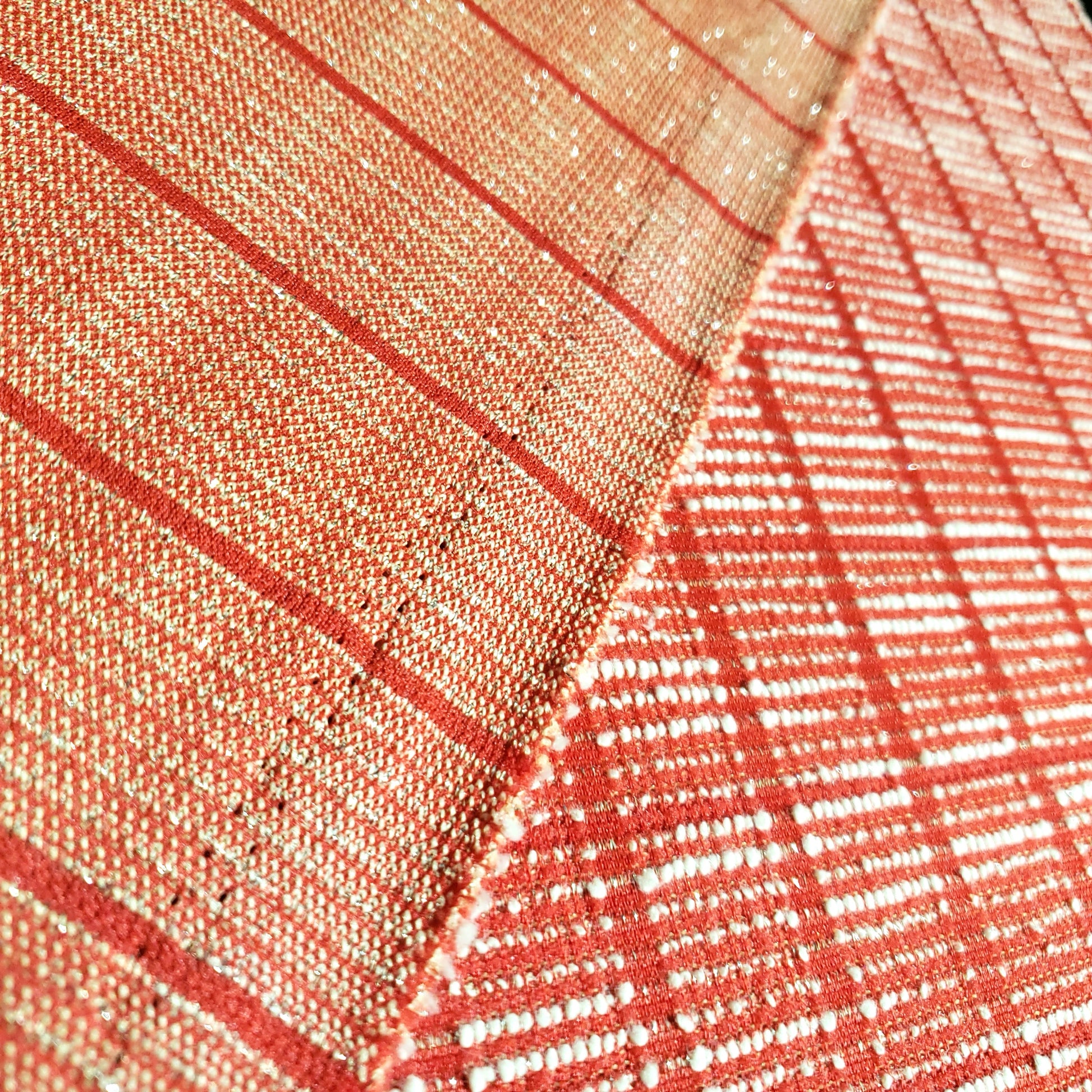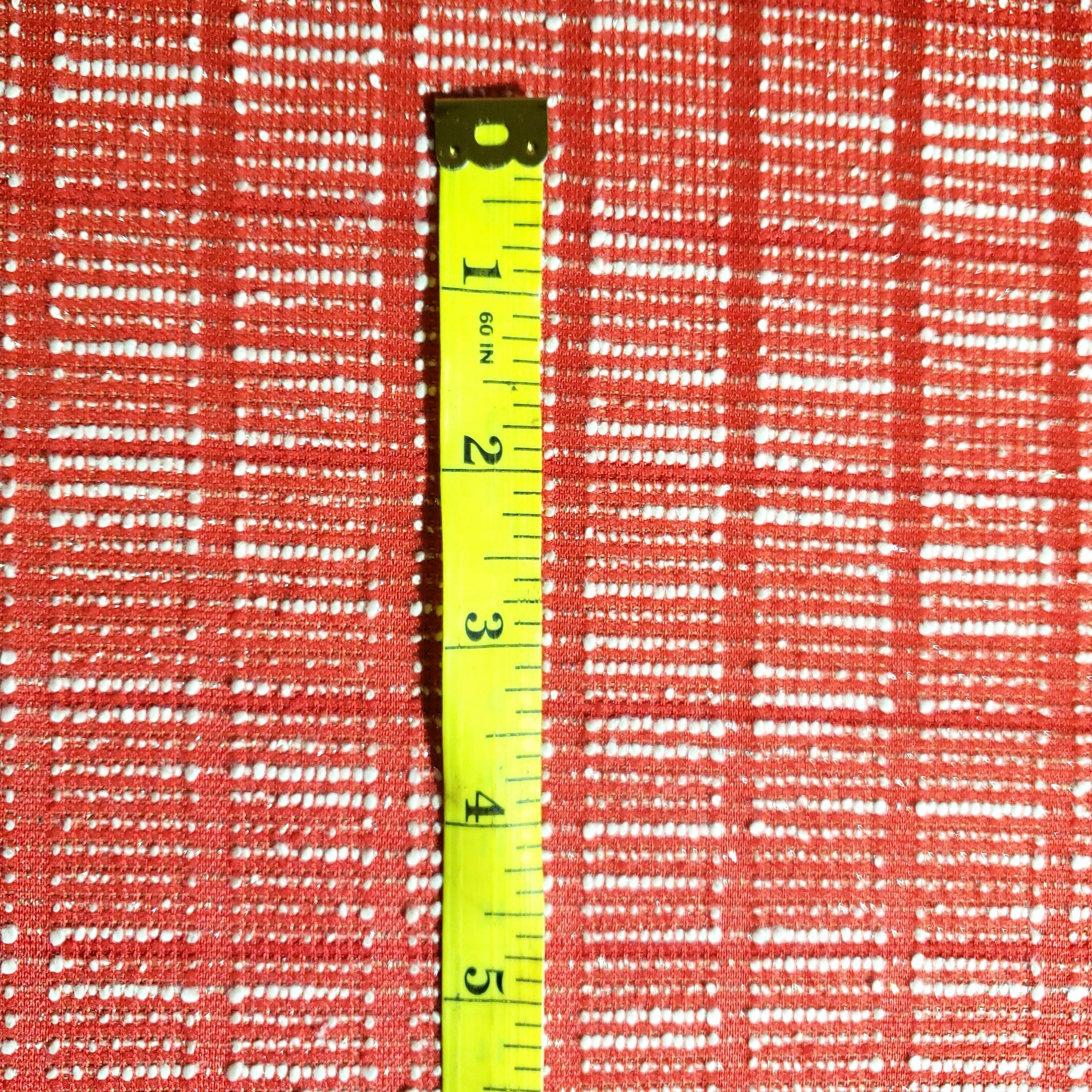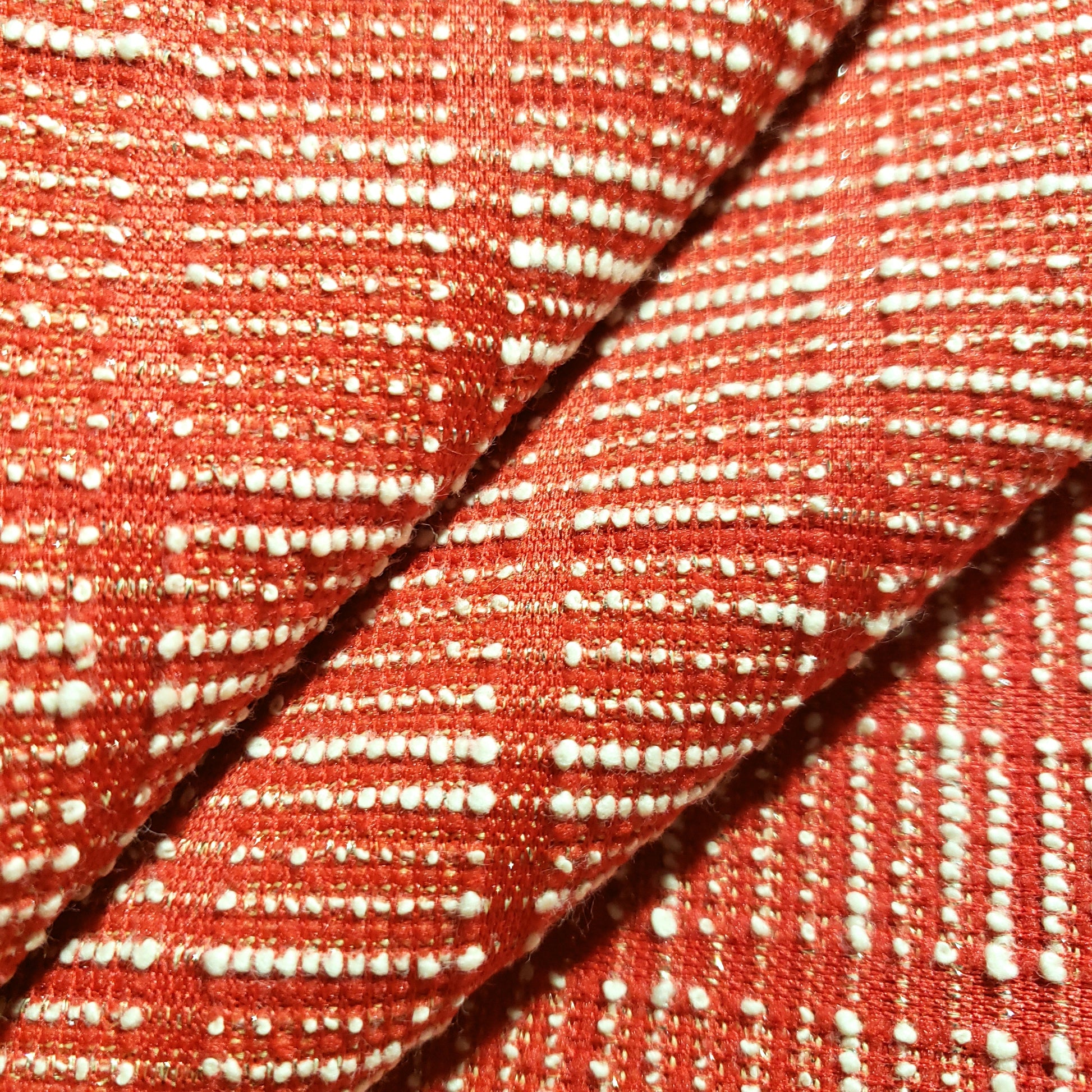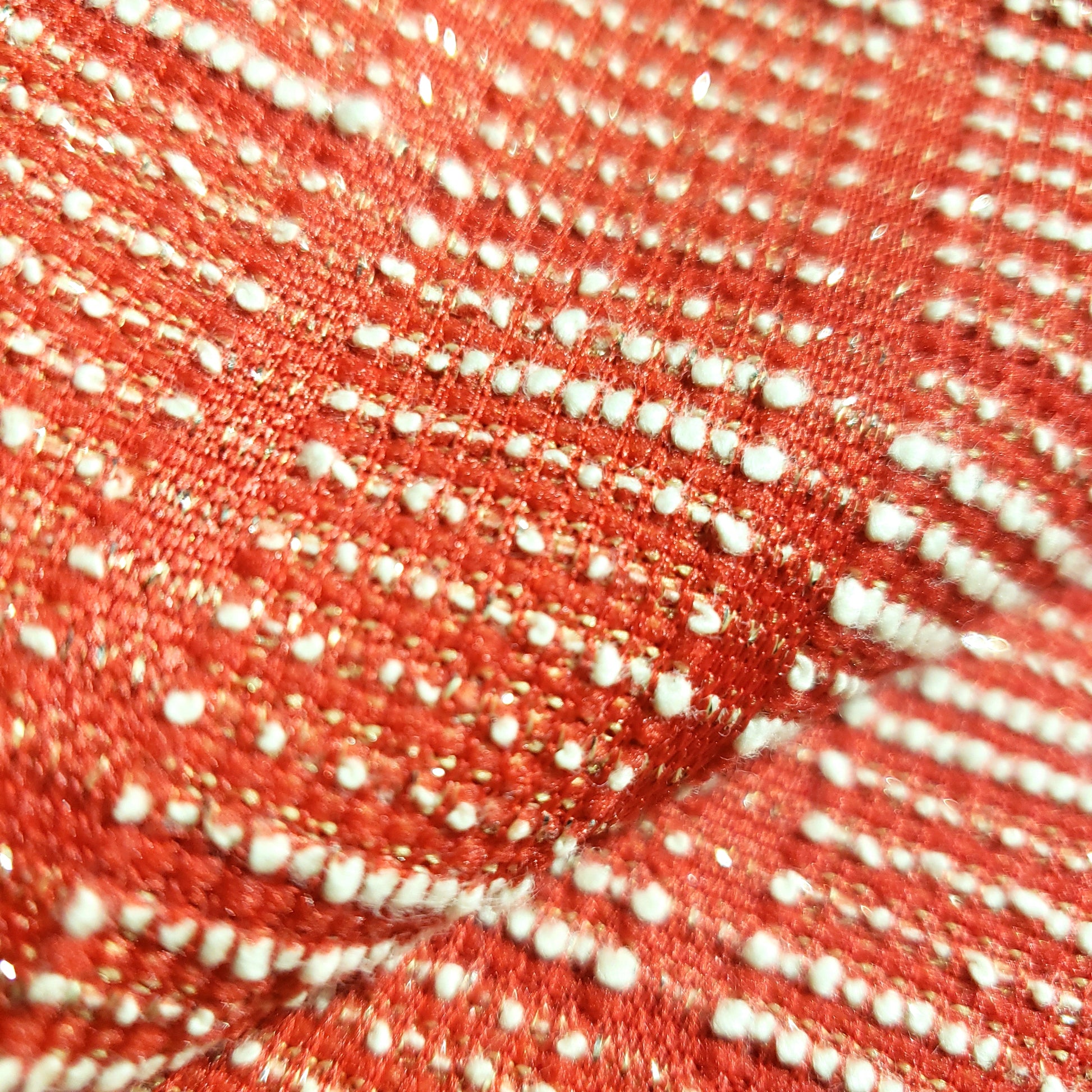 This medium weight knit fabric features a plaid tile design in orange, off white and a metallic silver shimmer threaded into the weave. The white squares are made with embossed white stripes of rustic weave multi size dots. The silver shimmer does not appear in the photos but it is there. We would be happy to send out a free swatch.