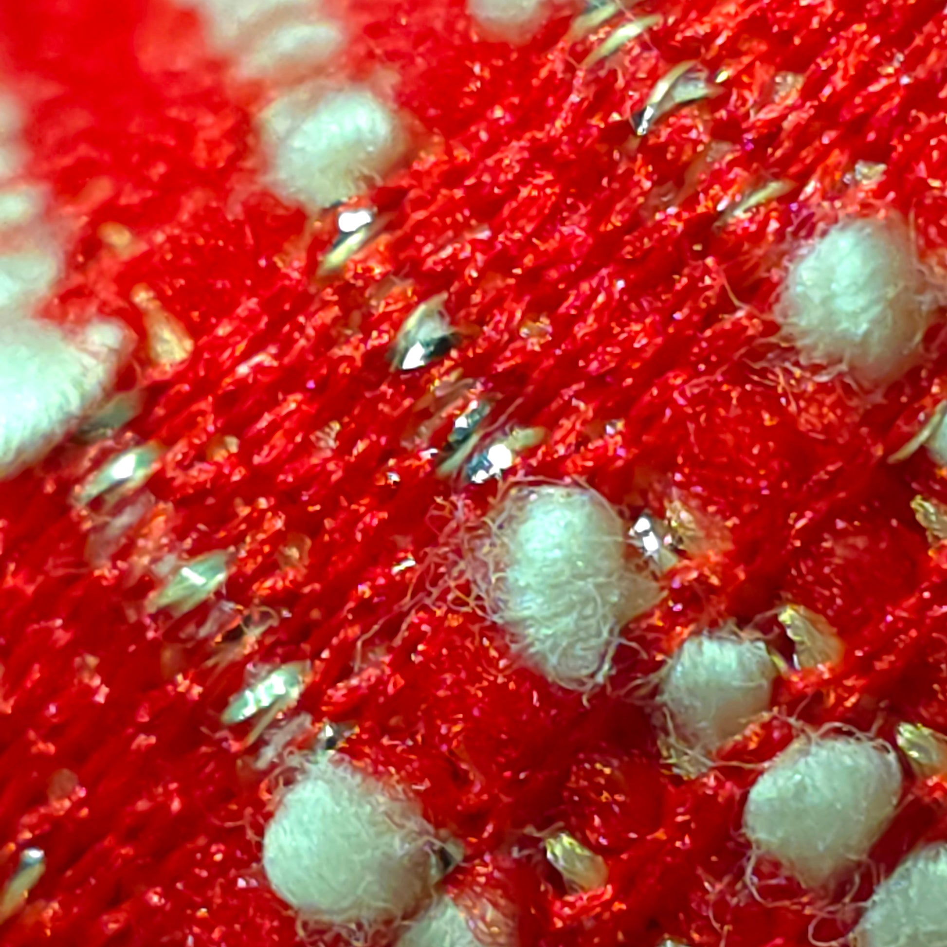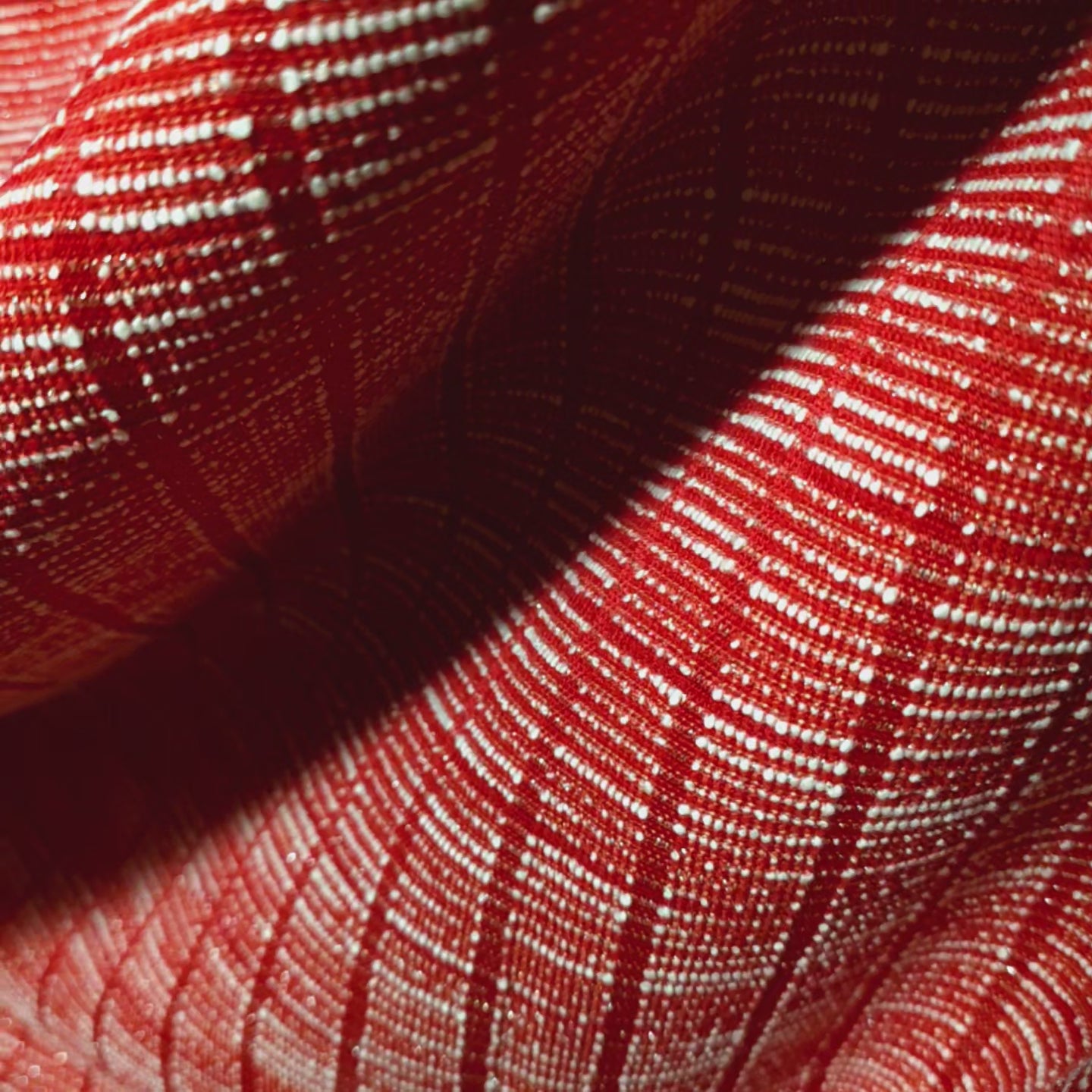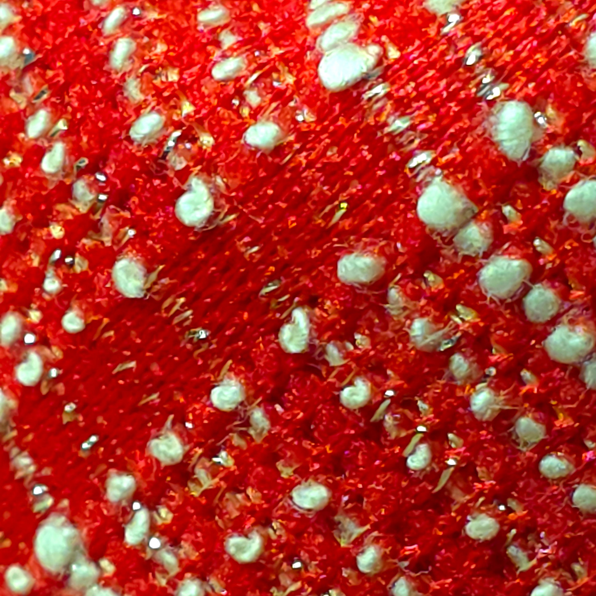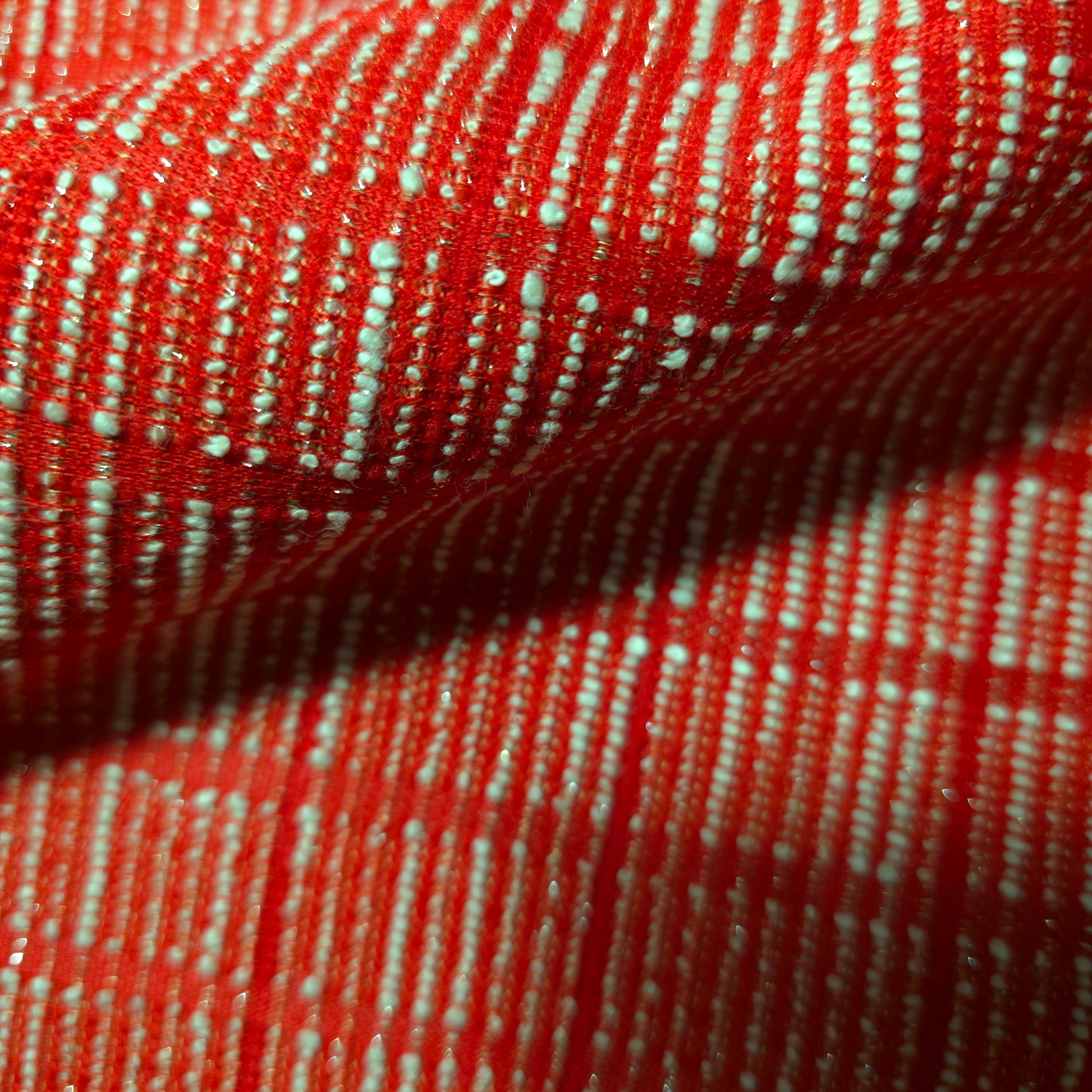 This medium weight knit fabric features a plaid tile design in orange, off white and a metallic silver shimmer threaded into the weave. The white squares are made with embossed white stripes of rustic weave multi size dots. The silver shimmer does not appear in the photos but it is there. We would be happy to send out a free swatch.