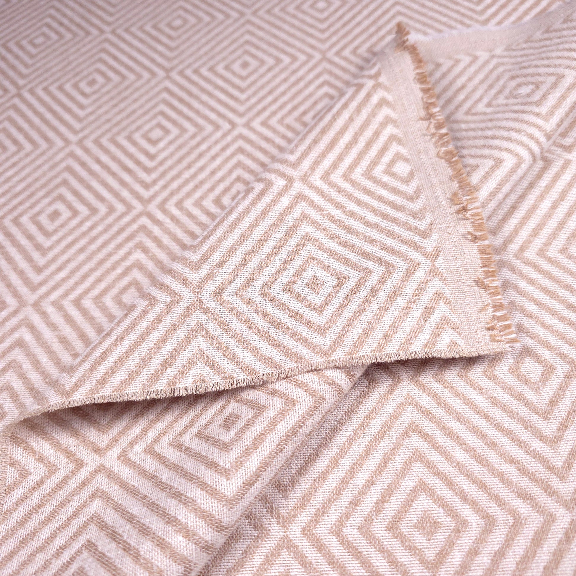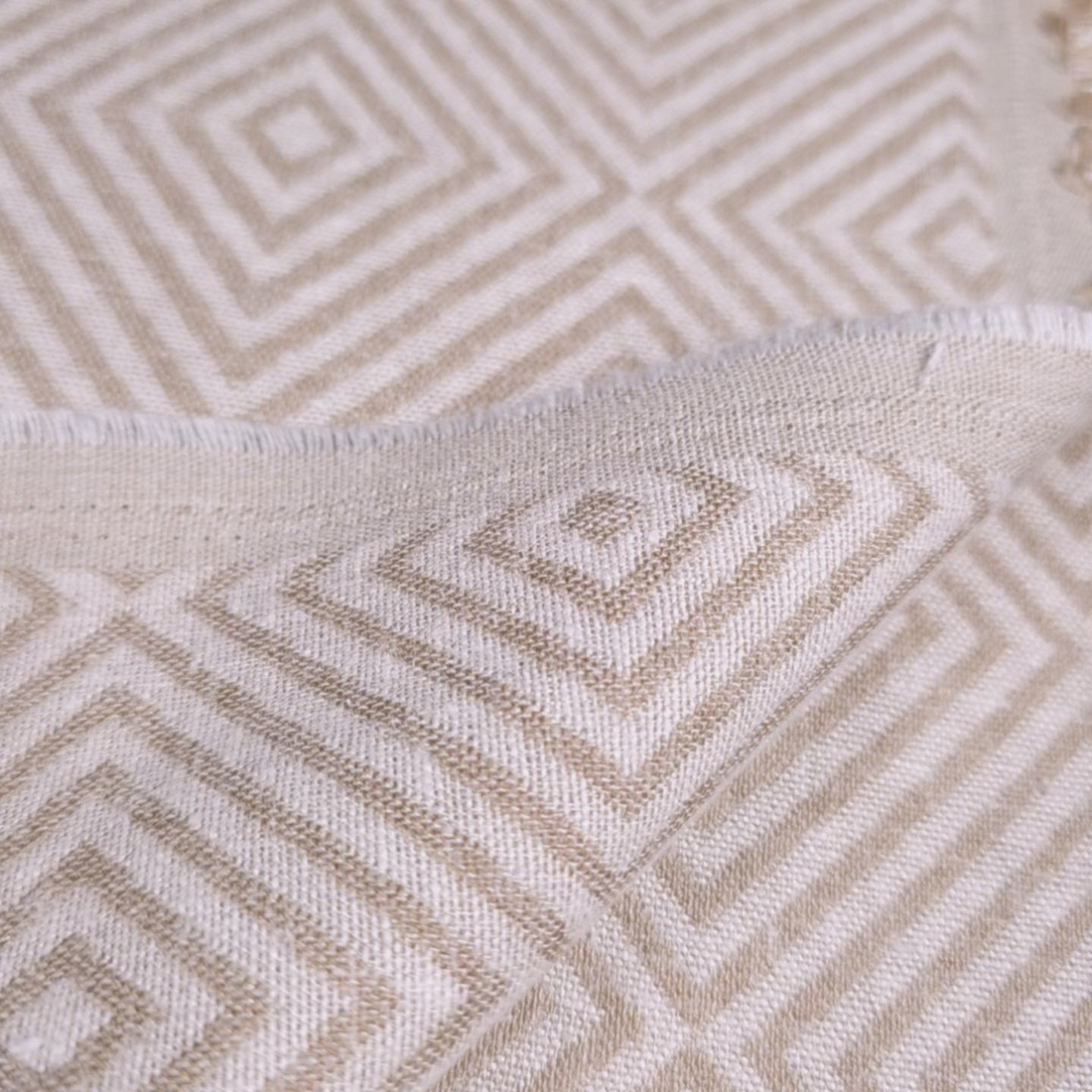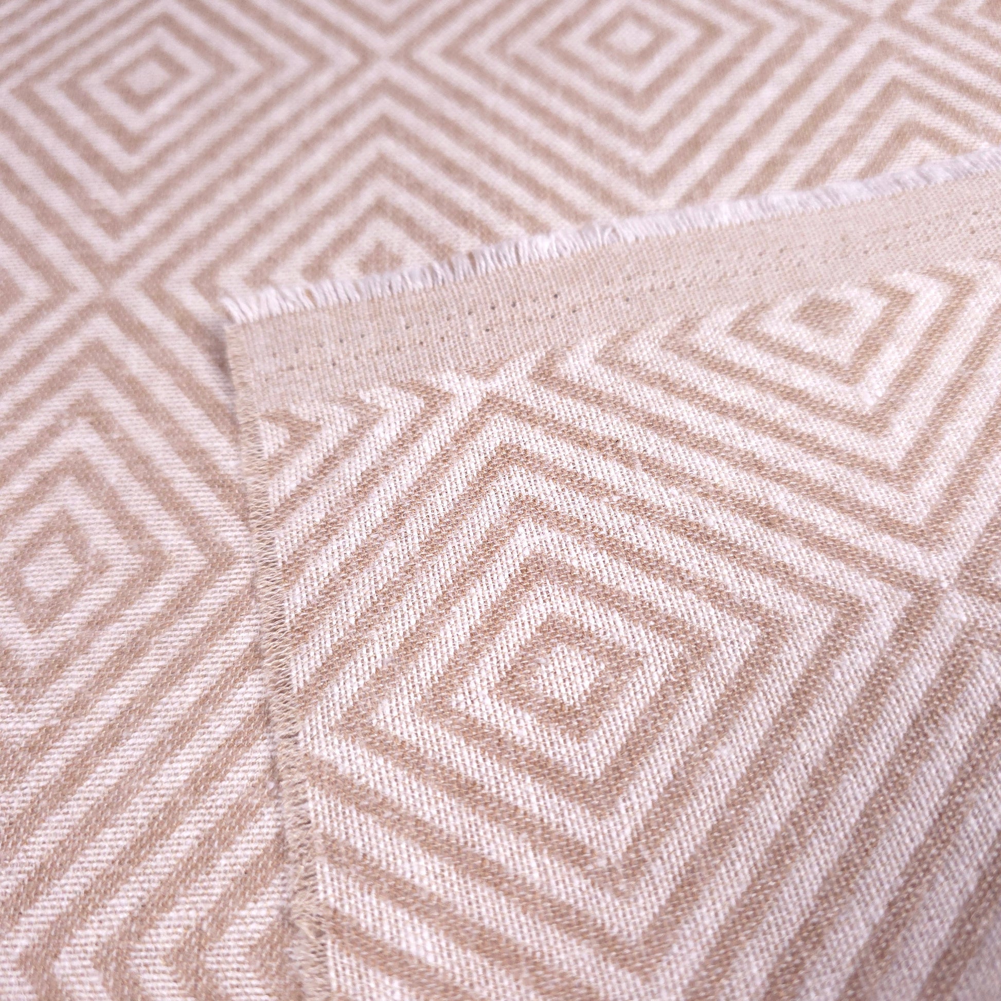 This is a durable, heavyweight cotton upholstery fabric featuring a woven geometric pattern. The design consists of concentric diamonds in a versatile, two-tone neutral palette of beige and off-white, creating a sophisticated and textured look. As a pure cotton upholstery-grade material, this fabric is strong and resilient, making it an excellent choice for furniture projects and other applications requiring a sturdy textile. This fabric is sold by the yard.