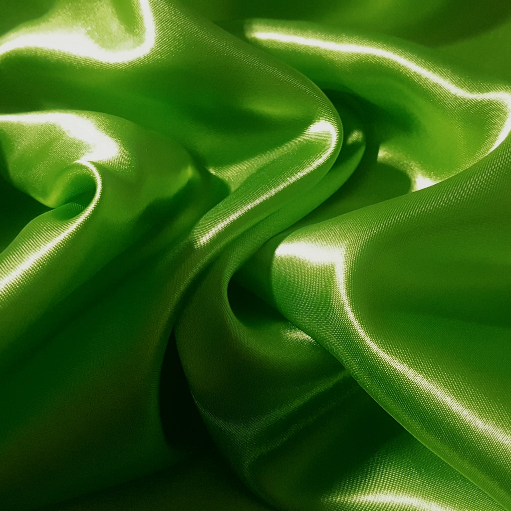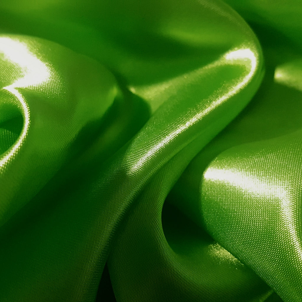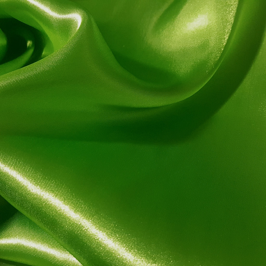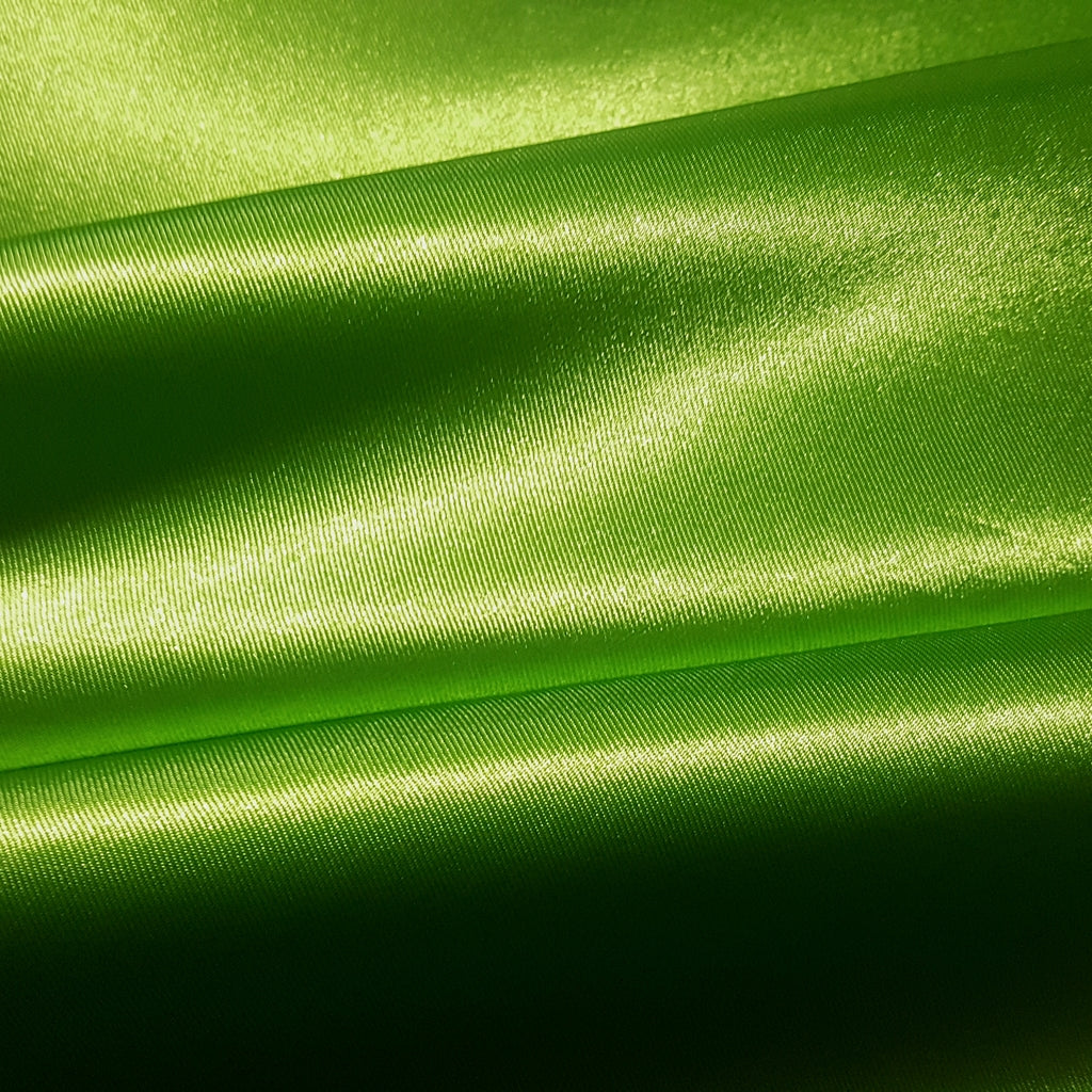 This medium-weight satin is crafted from 100% polyester and measures 58 inches in width. The fabric features a high-gloss, lustrous front face with a contrasting matte finish on the back. It is a stable, non-stretch material, making it easy to handle for various sewing projects. The lime hue is consistent and richly saturated, ideal for applications that require a pop of brilliant color.