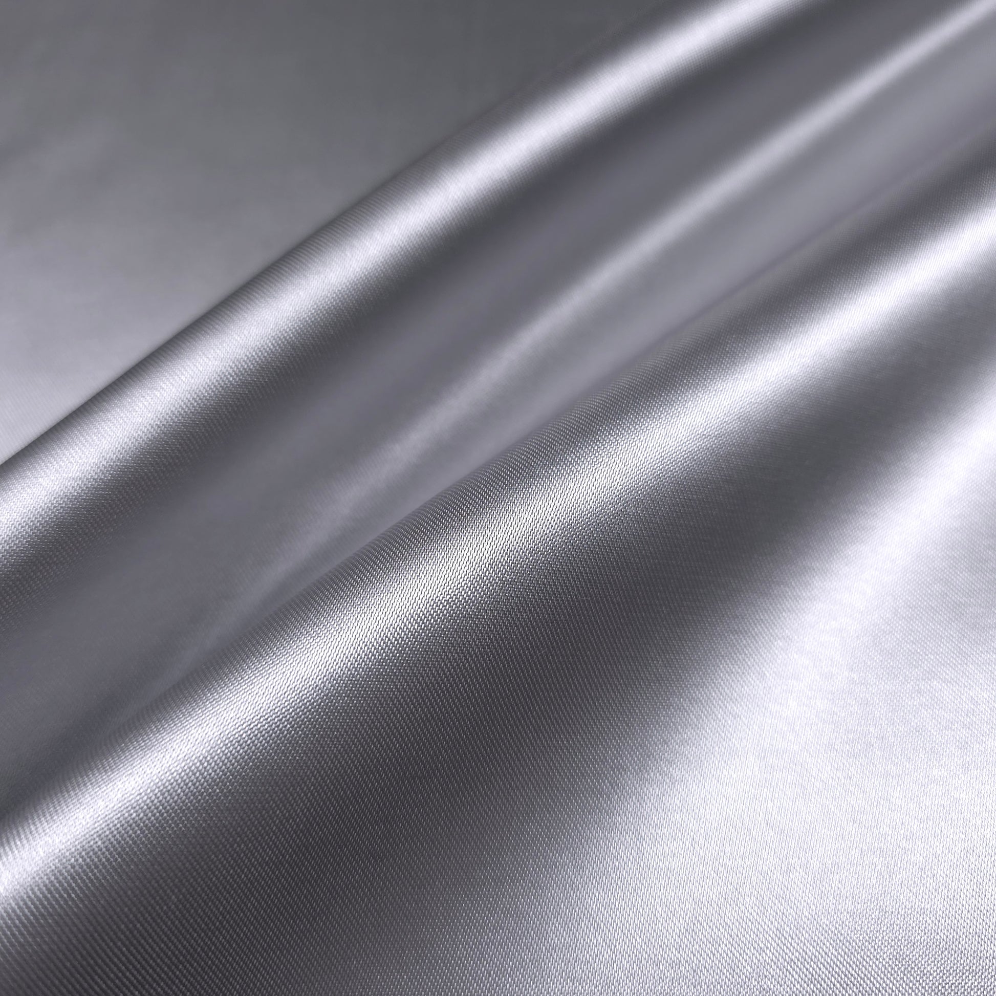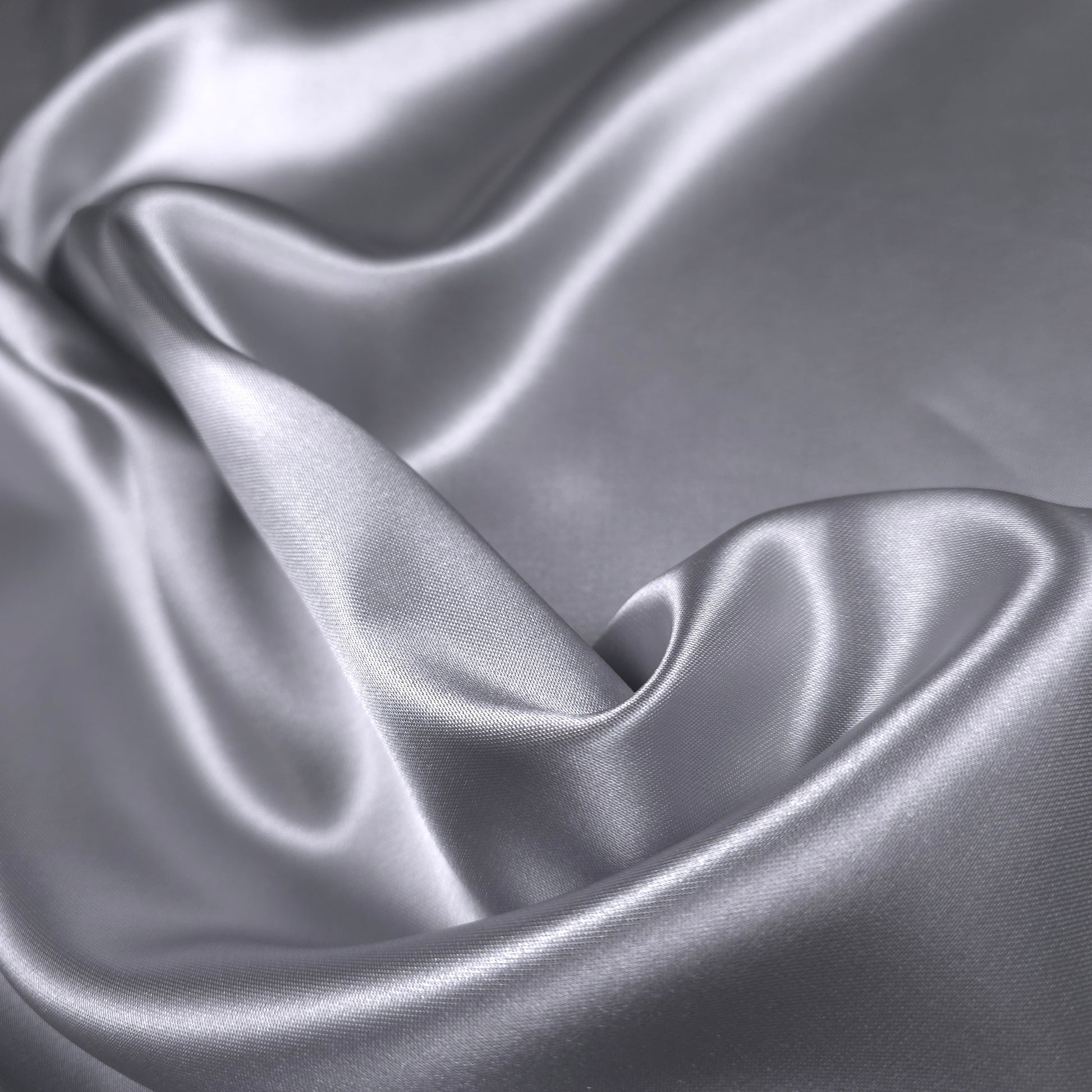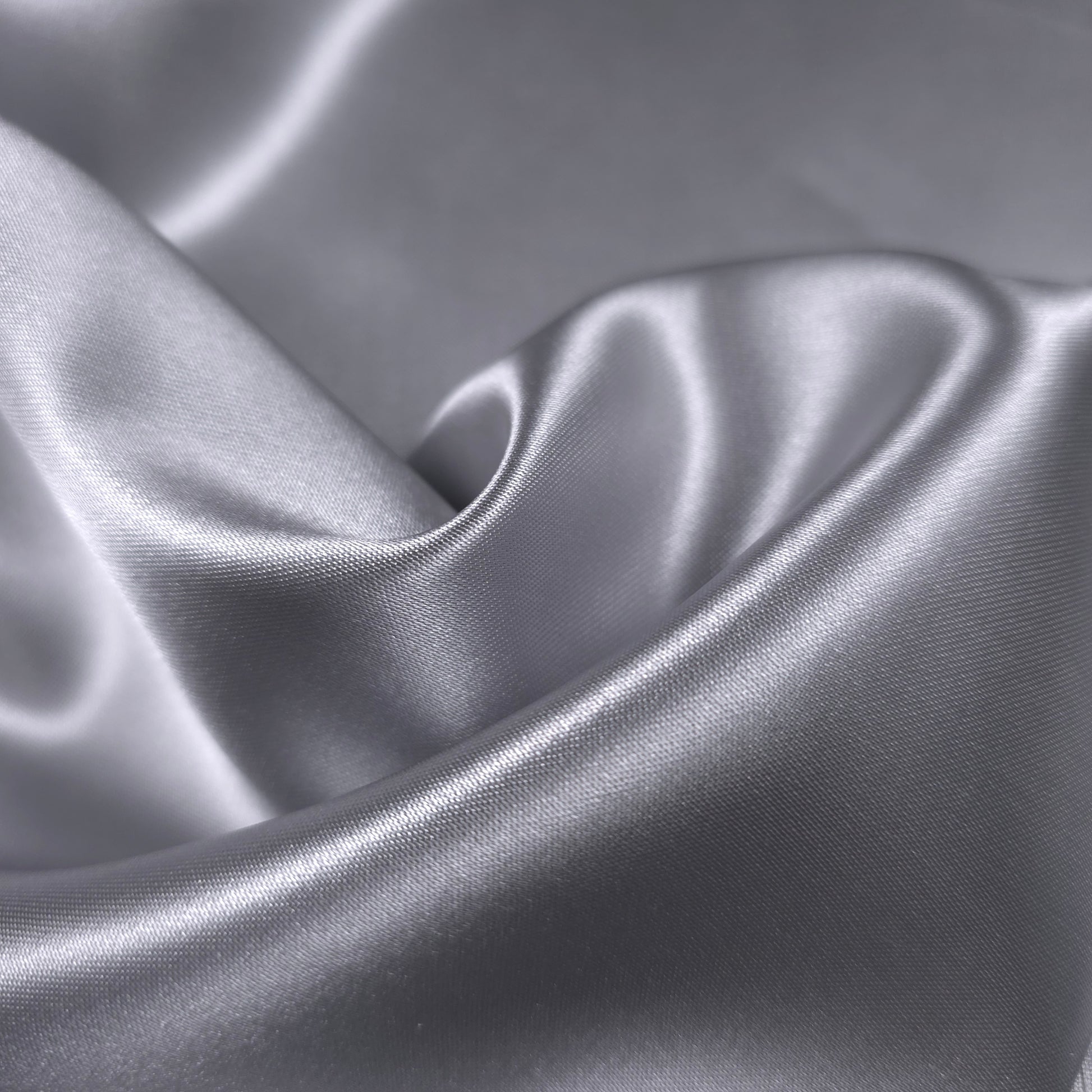 This medium-weight satin is crafted from 100% polyester and measures 58 inches in width. The fabric features a high-gloss, lustrous front face with a contrasting matte finish on the back. It is a stable, non-stretch material, making it easy to handle for various sewing projects. The light silver hue is consistent.