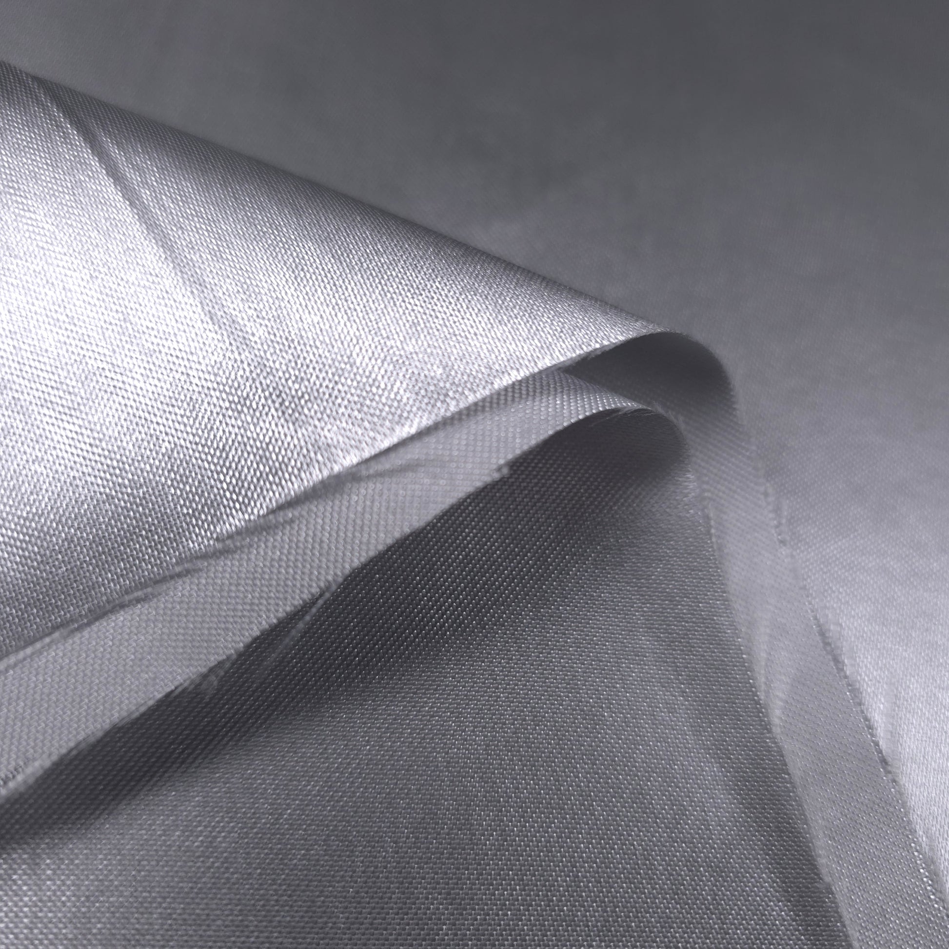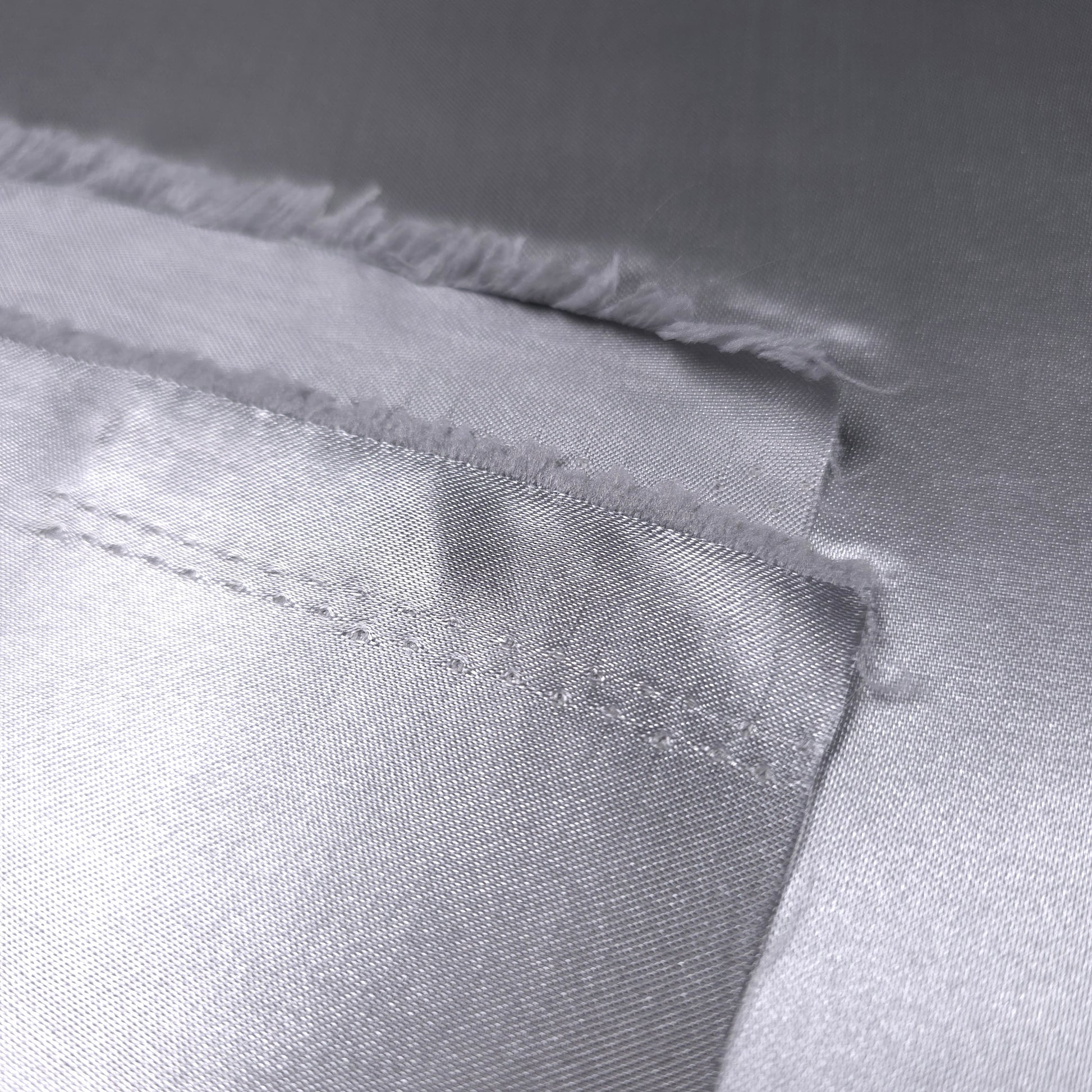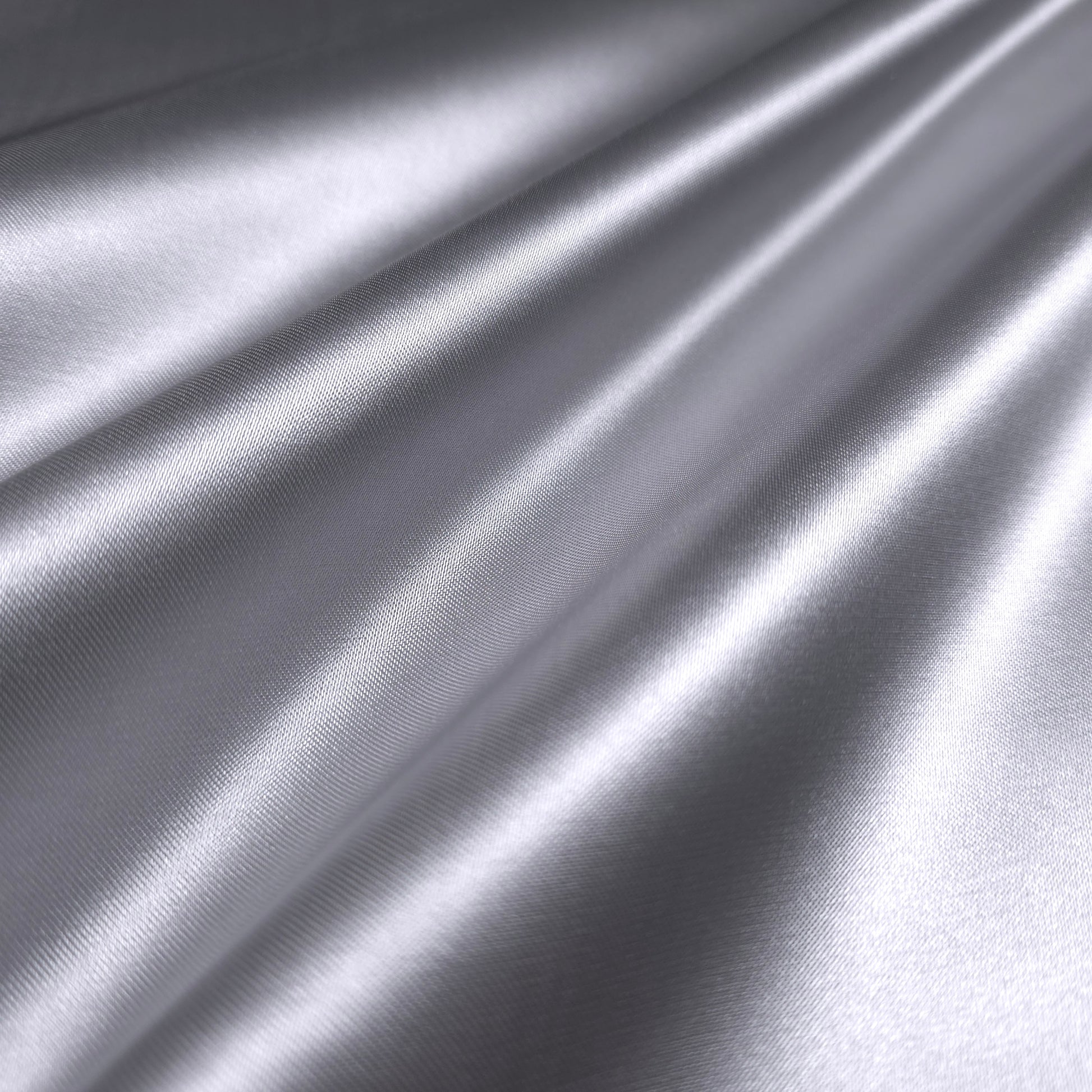This medium-weight satin is crafted from 100% polyester and measures 58 inches in width. The fabric features a high-gloss, lustrous front face with a contrasting matte finish on the back. It is a stable, non-stretch material, making it easy to handle for various sewing projects. The light silver hue is consistent.