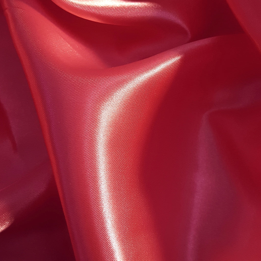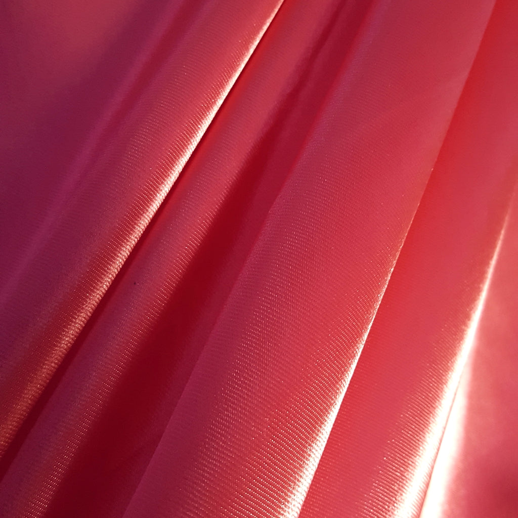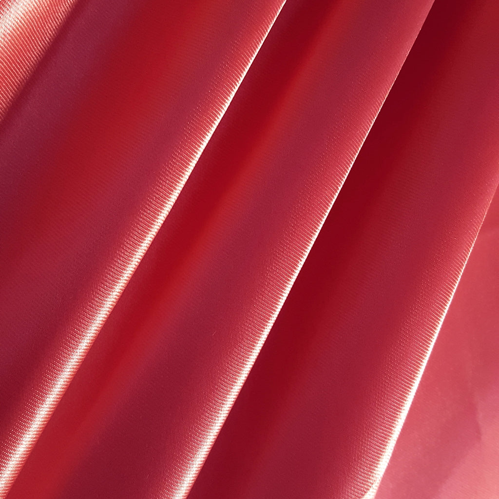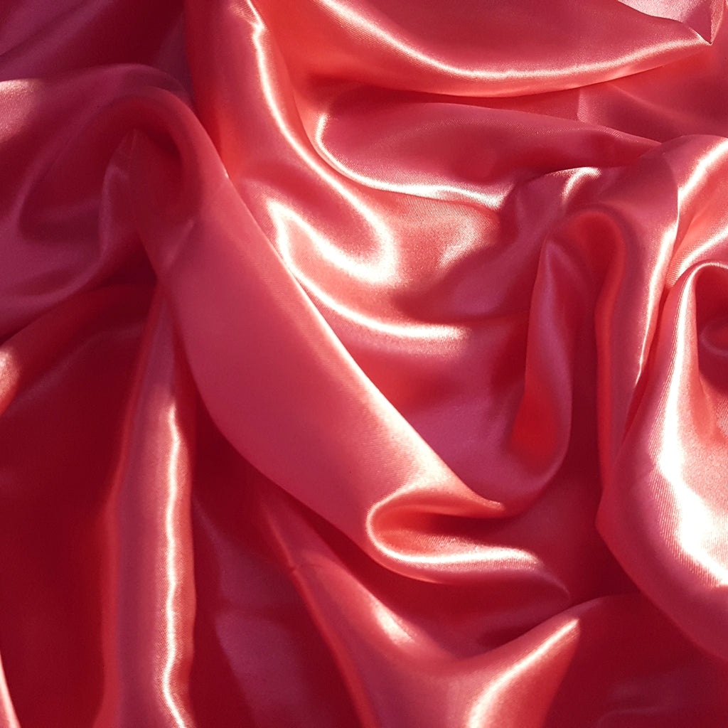 This medium-weight satin is crafted from 100% polyester and measures 58 inches in width. The fabric features a high-gloss, lustrous front face with a contrasting matte finish on the back. It is a stable, non-stretch material, making it easy to handle for various sewing projects. The pink coral hue is consistent and richly saturated, ideal for applications that require a pop of brilliant color.
