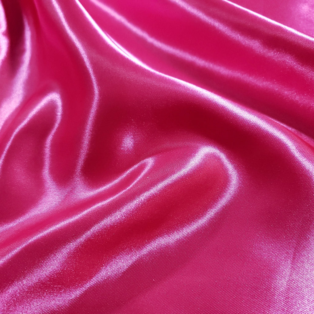 This medium-weight satin is crafted from 100% polyester and measures 58 inches in width. The fabric features a high-gloss, lustrous front face with a contrasting matte finish on the back. It is a stable, non-stretch material, making it easy to handle for various sewing projects. The soft fuchsia pink hue is consistent and richly saturated, ideal for applications that require a pop of brilliant color.