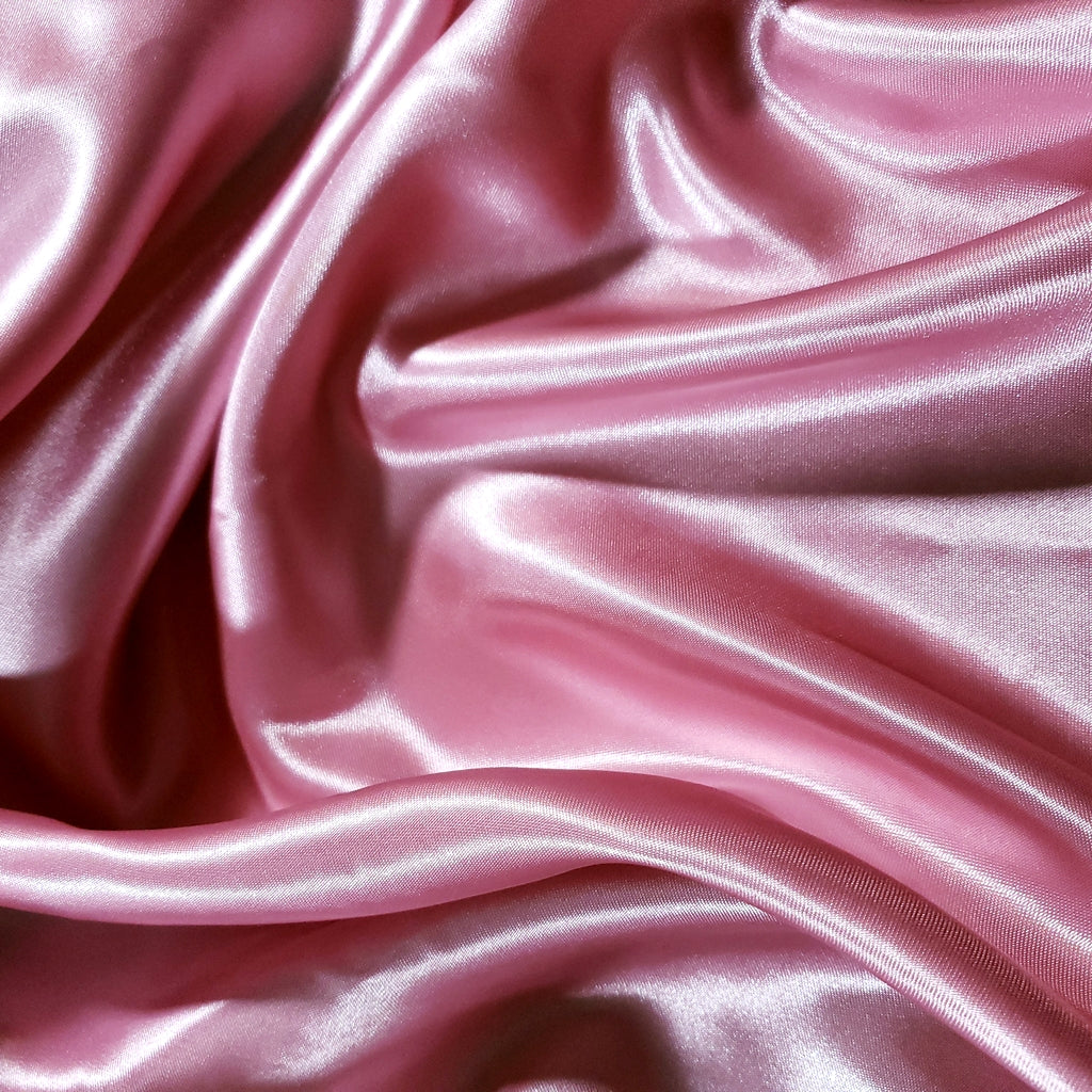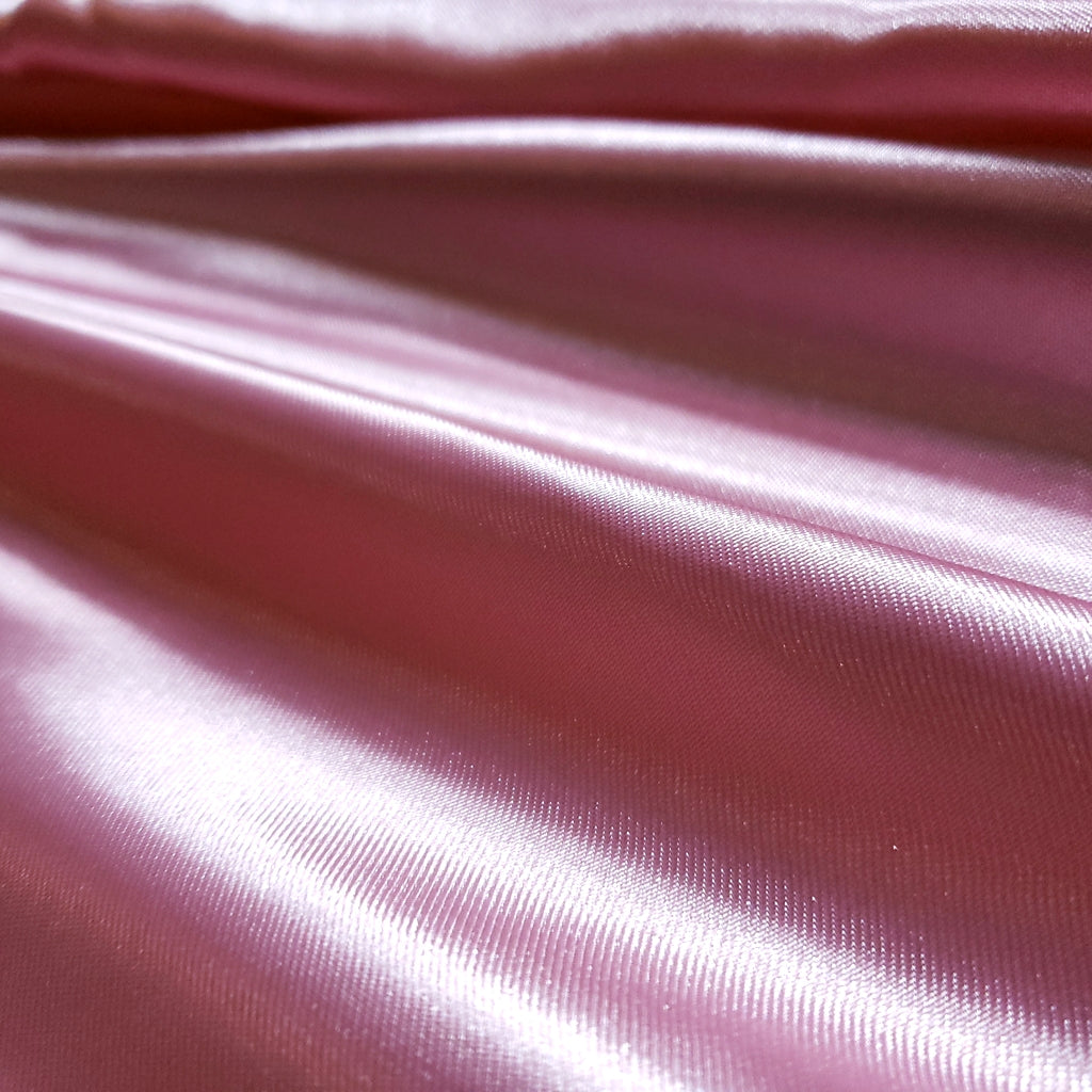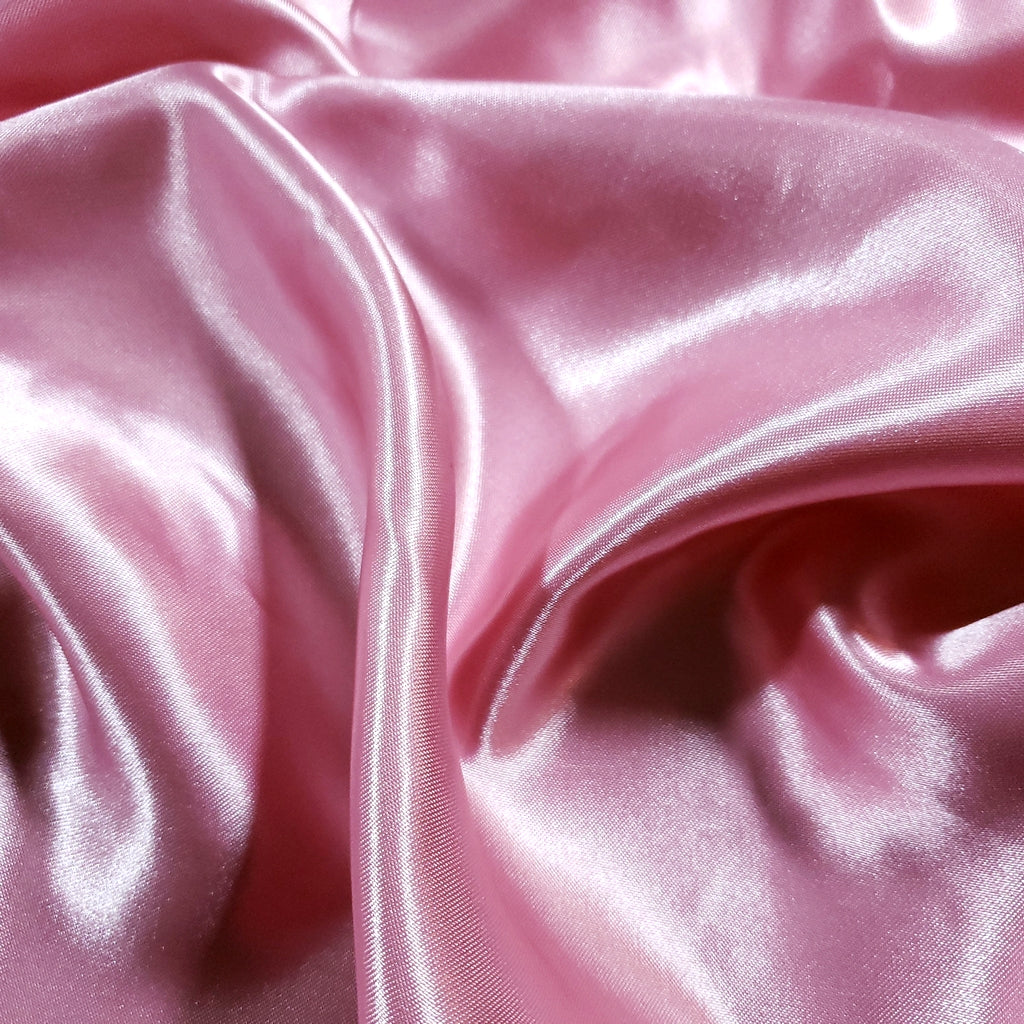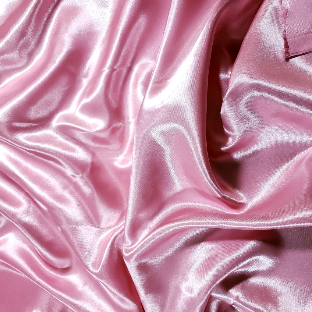 This medium-weight satin is crafted from 100% polyester and measures 58 inches in width. The fabric features a high-gloss, lustrous front face with a contrasting matte finish on the back. It is a stable, non-stretch material, making it easy to handle for various sewing projects. The soft baby pink hue is consistent and richly saturated, ideal for applications that require a pop of brilliant color.