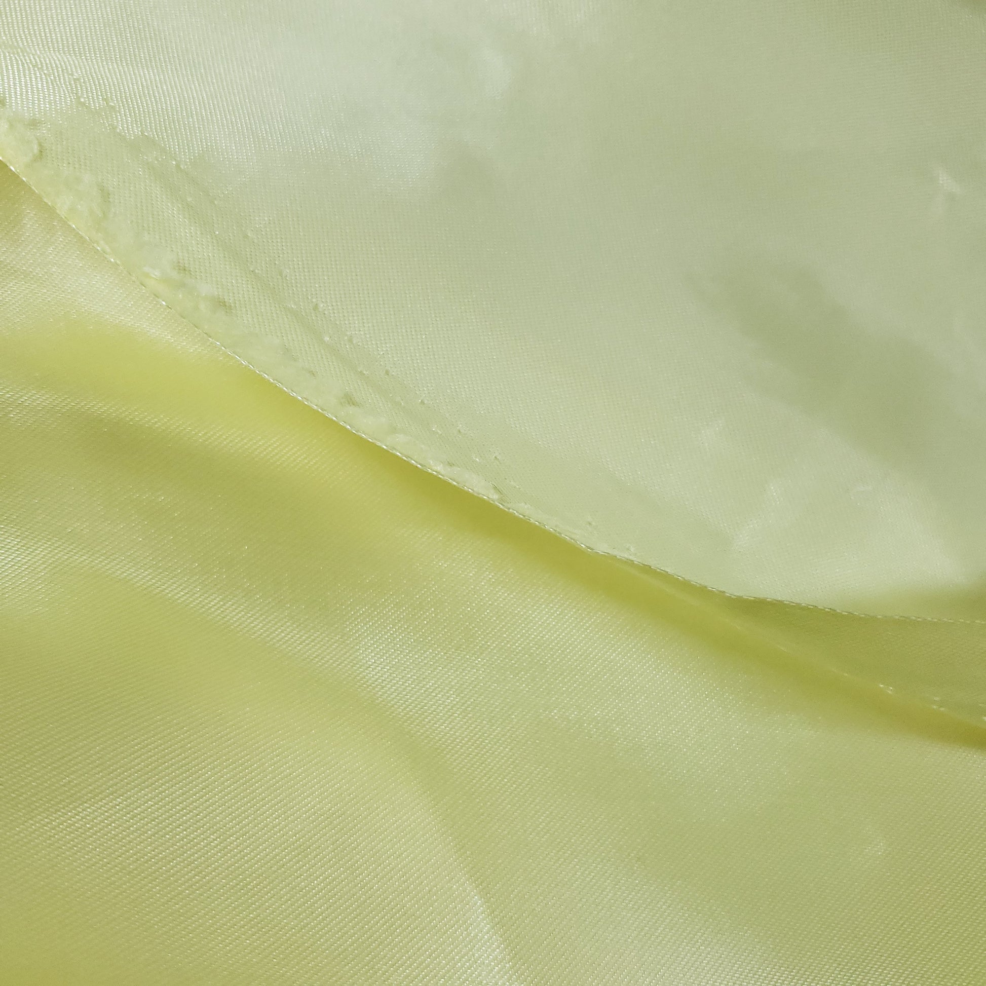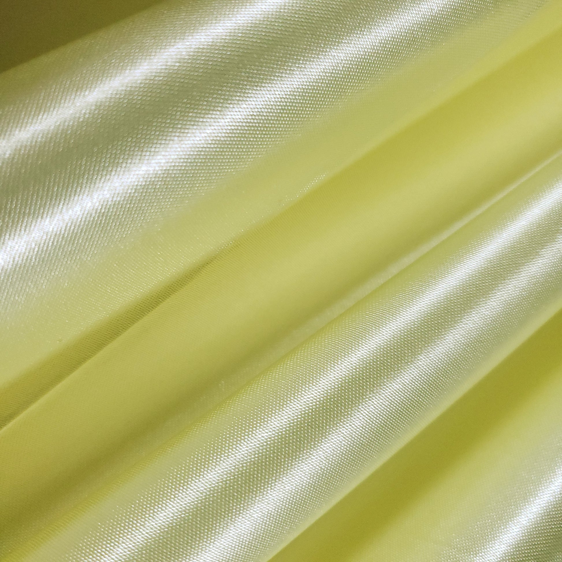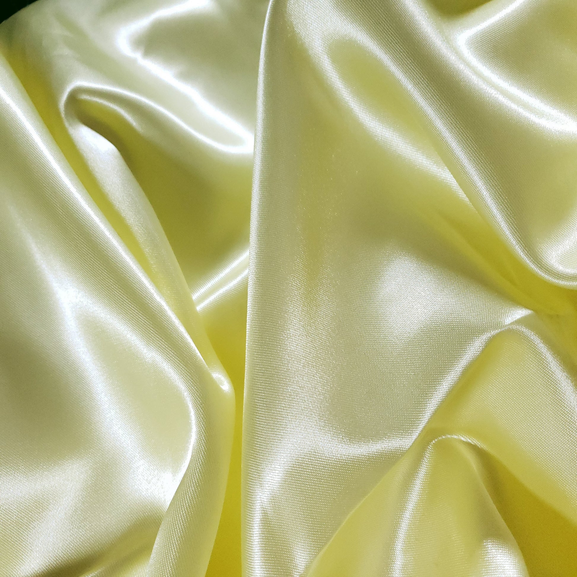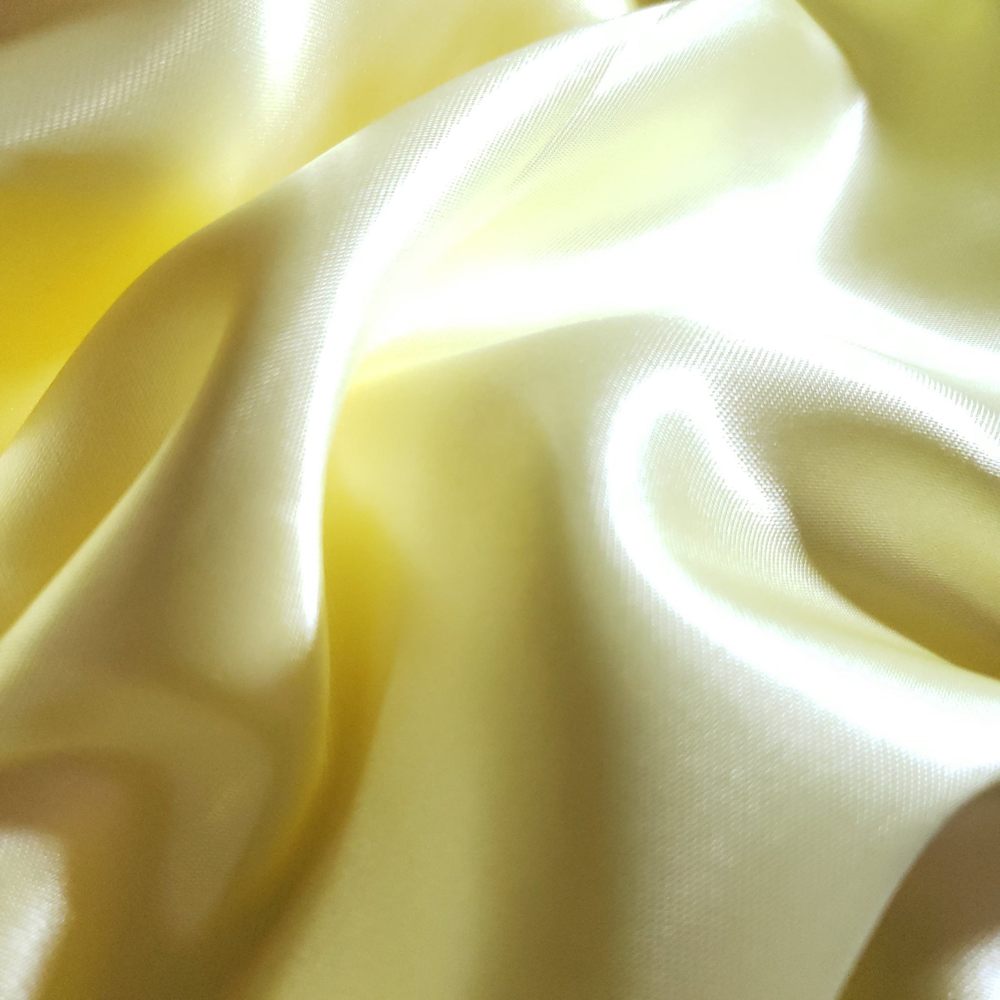 This medium-weight satin is crafted from 100% polyester and measures 58 inches in width. The fabric features a high-gloss, lustrous front face with a contrasting matte finish on the back. It is a stable, non-stretch material, making it easy to handle for various sewing projects. The soft baby yellow hue is consistent and richly saturated, ideal for applications that require a pop of brilliant color.
