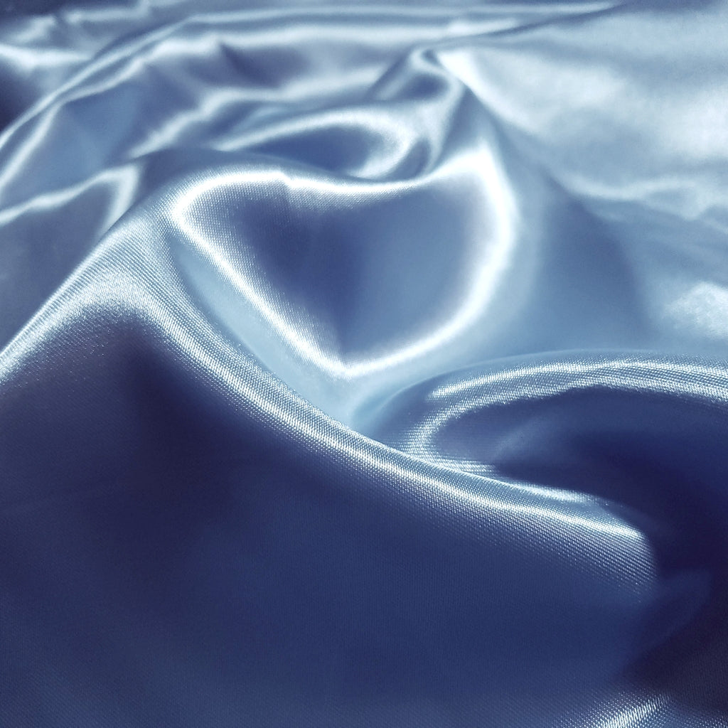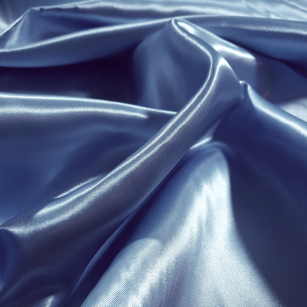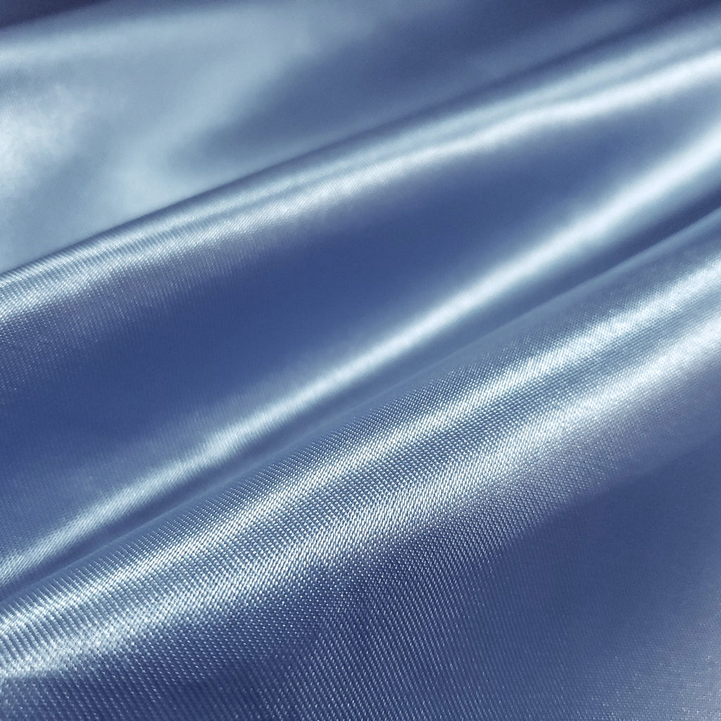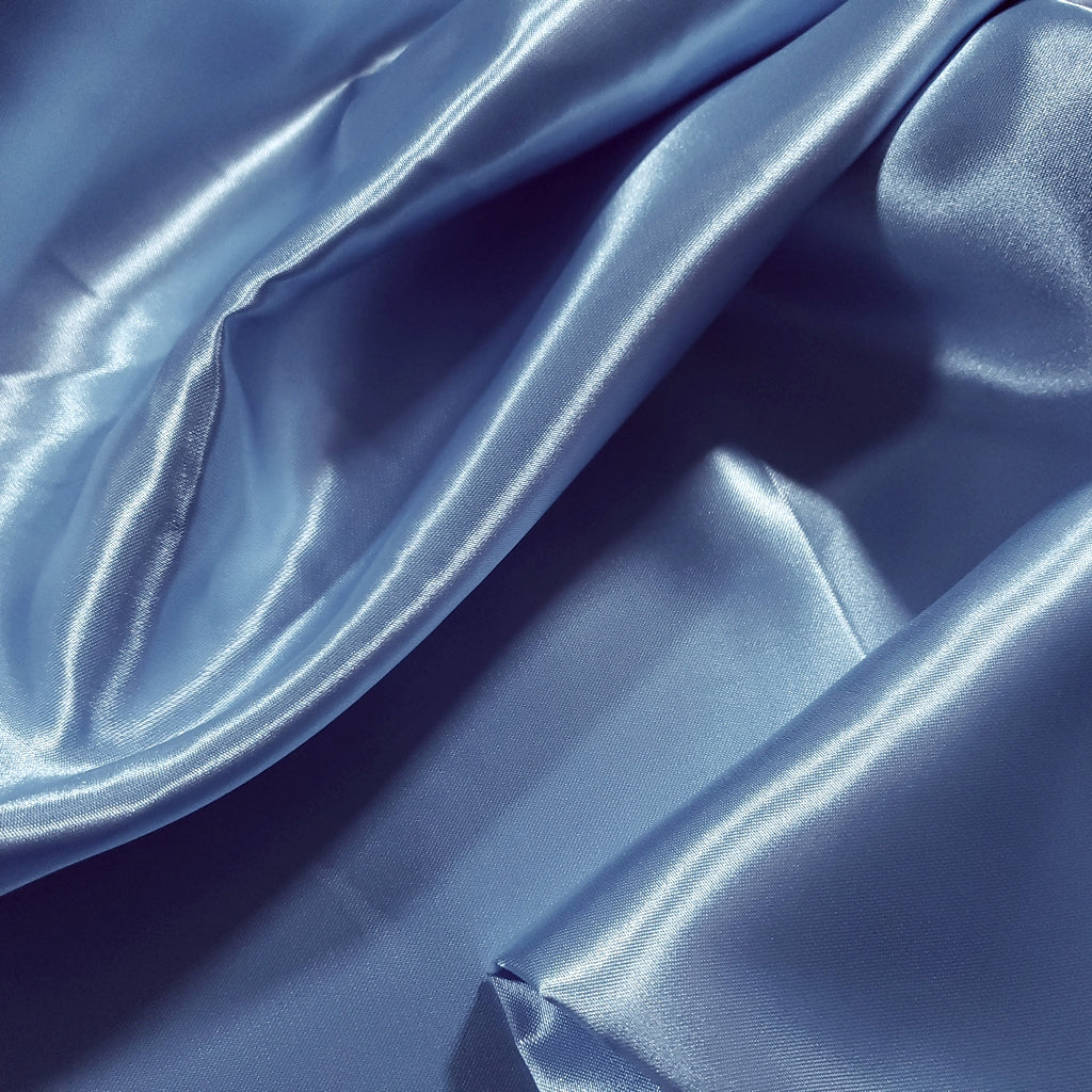 This medium-weight satin is crafted from 100% polyester and measures 58 inches in width. The fabric features a high-gloss, lustrous front face with a contrasting matte finish on the back. It is a stable, non-stretch material, making it easy to handle for various sewing projects. The soft baby blue hue is consistent and richly saturated, ideal for applications that require a pop of brilliant color.