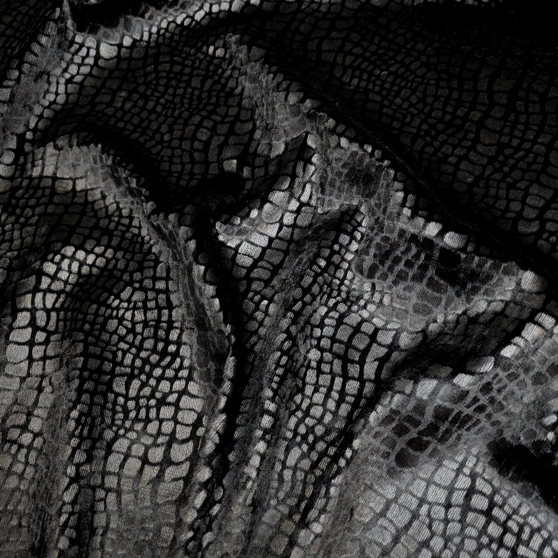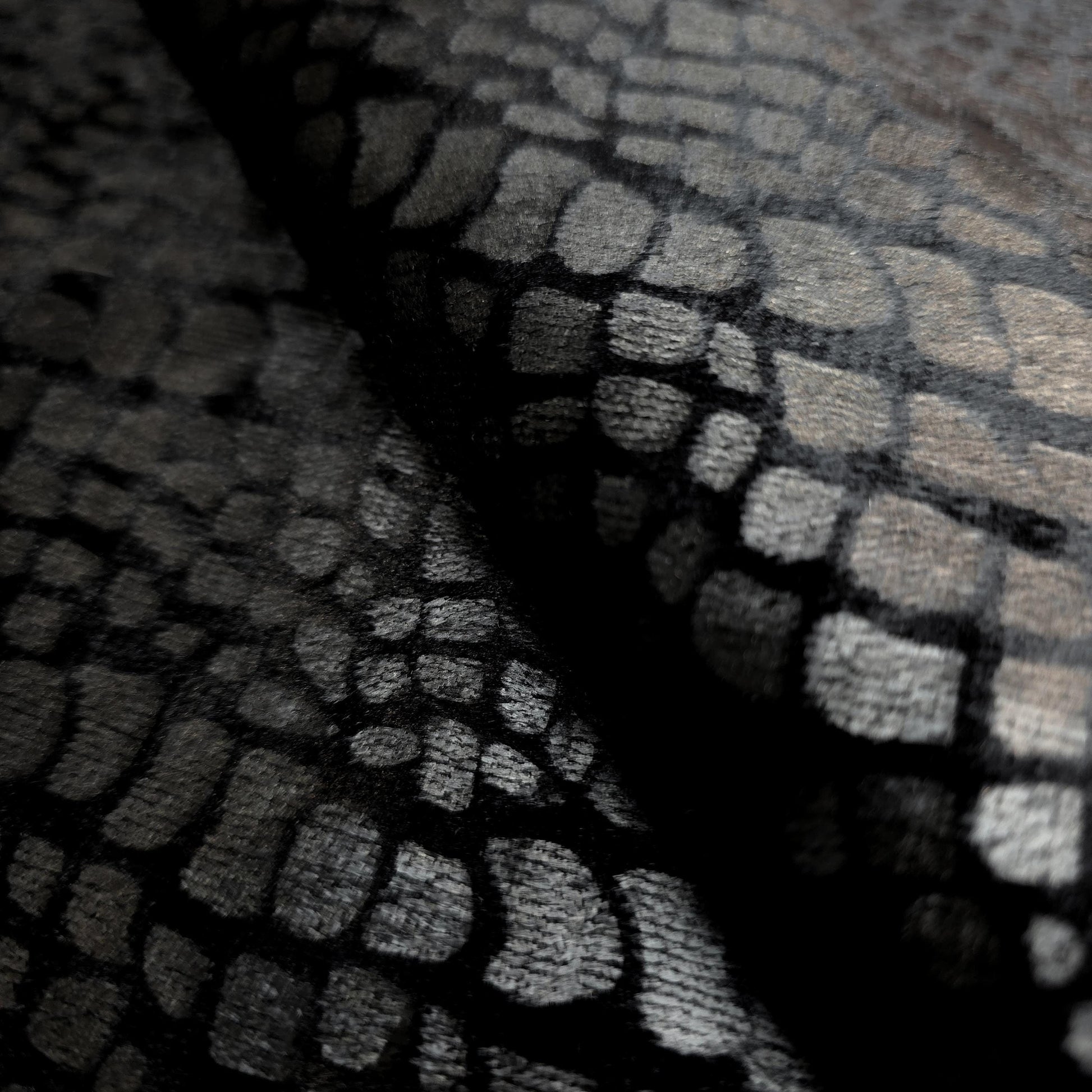 This semi-gloss velvet fabric showcases a crocodile print with a textured overlay that catches the light. Its foundation is a plush velvet, creating a tactile contrast against the raised, reflective scale pattern. The design mimics crocodile skin with a gentle sheen, while the medium-weight velvet offers durability suitable for upholstery. It features a flexible hand and excellent drape, making it both functional and visually striking.