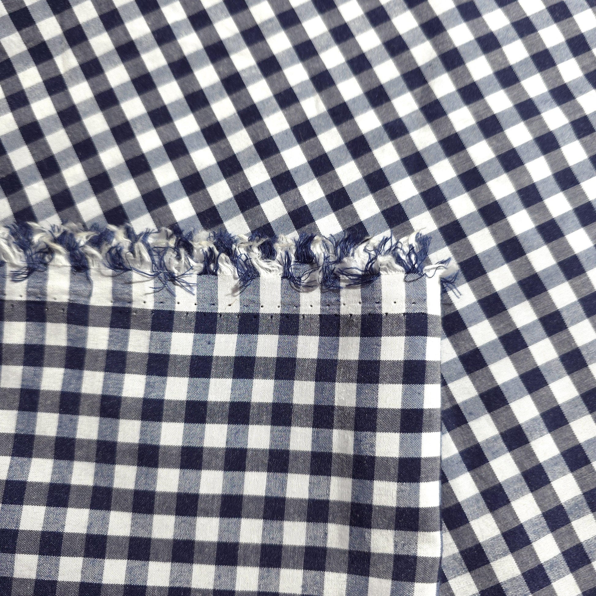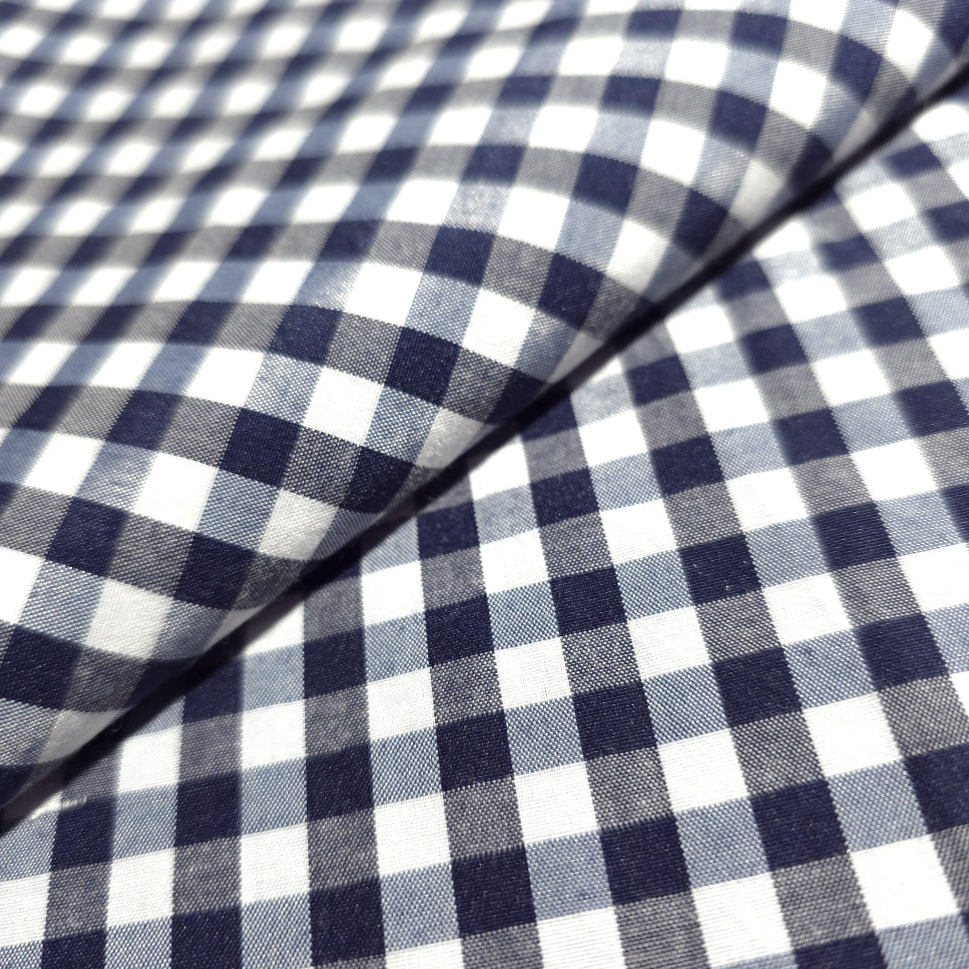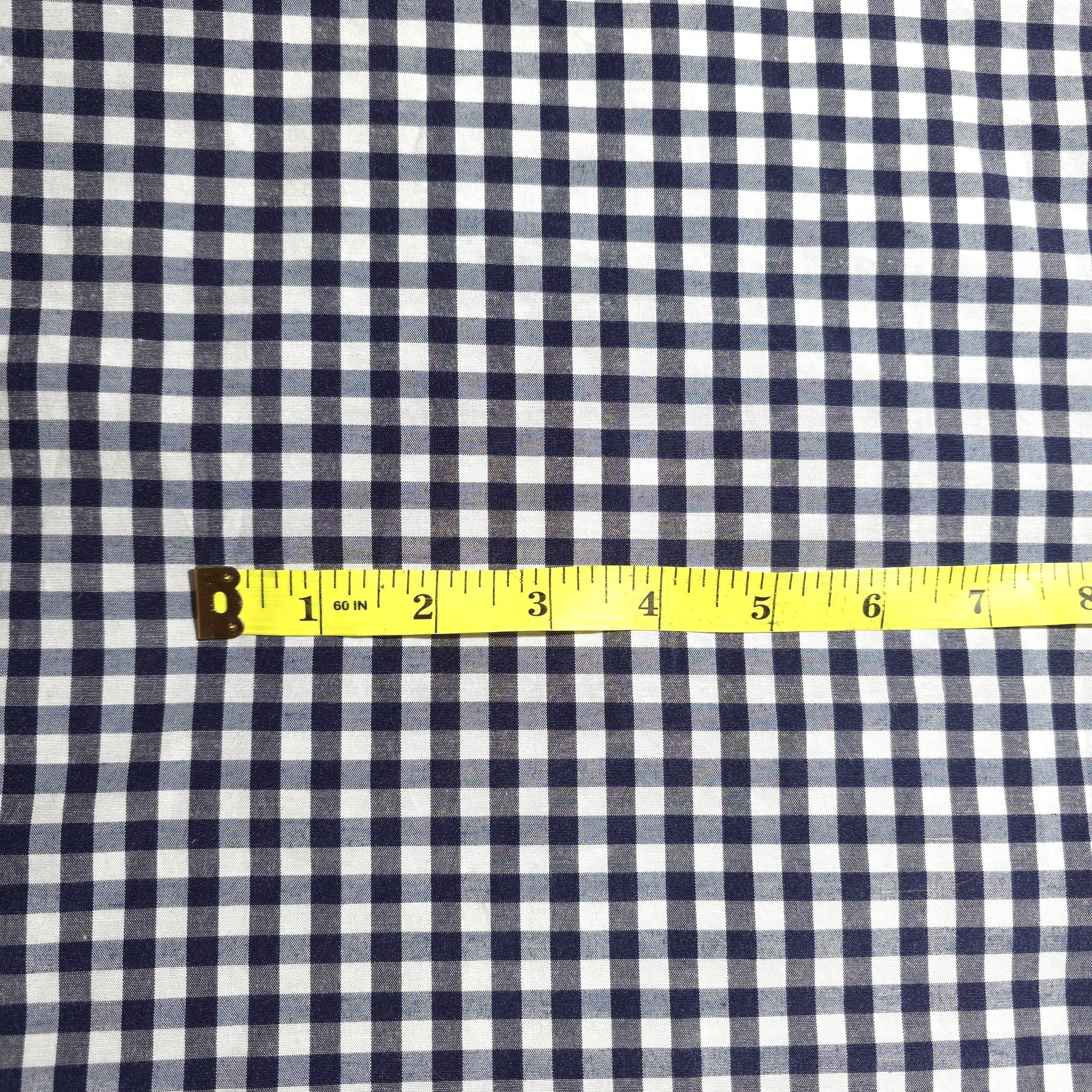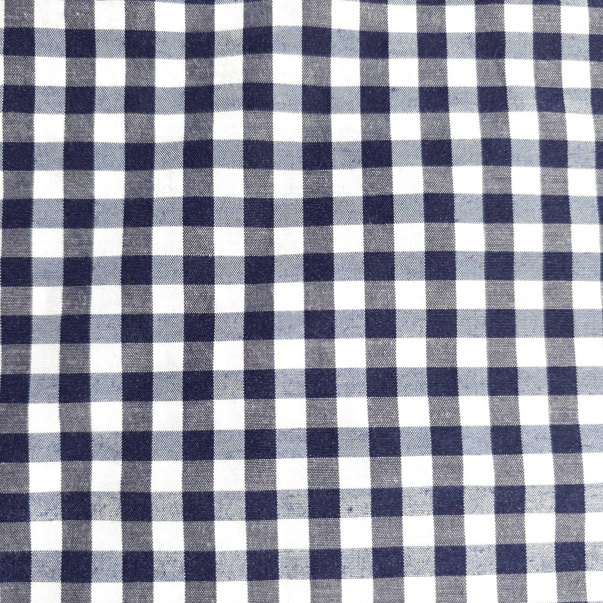 This is a Dark Blue gingham poly cotton fabric. It features a classic 1/4 inch checkered pattern, made up of alternating squares of vibrant blue and crisp white. The poly cotton blend combines the softness and breathability of cotton with the durability and wrinkle-resistance of polyester. The colors are bright and consistent, offering a fresh and cheerful aesthetic.