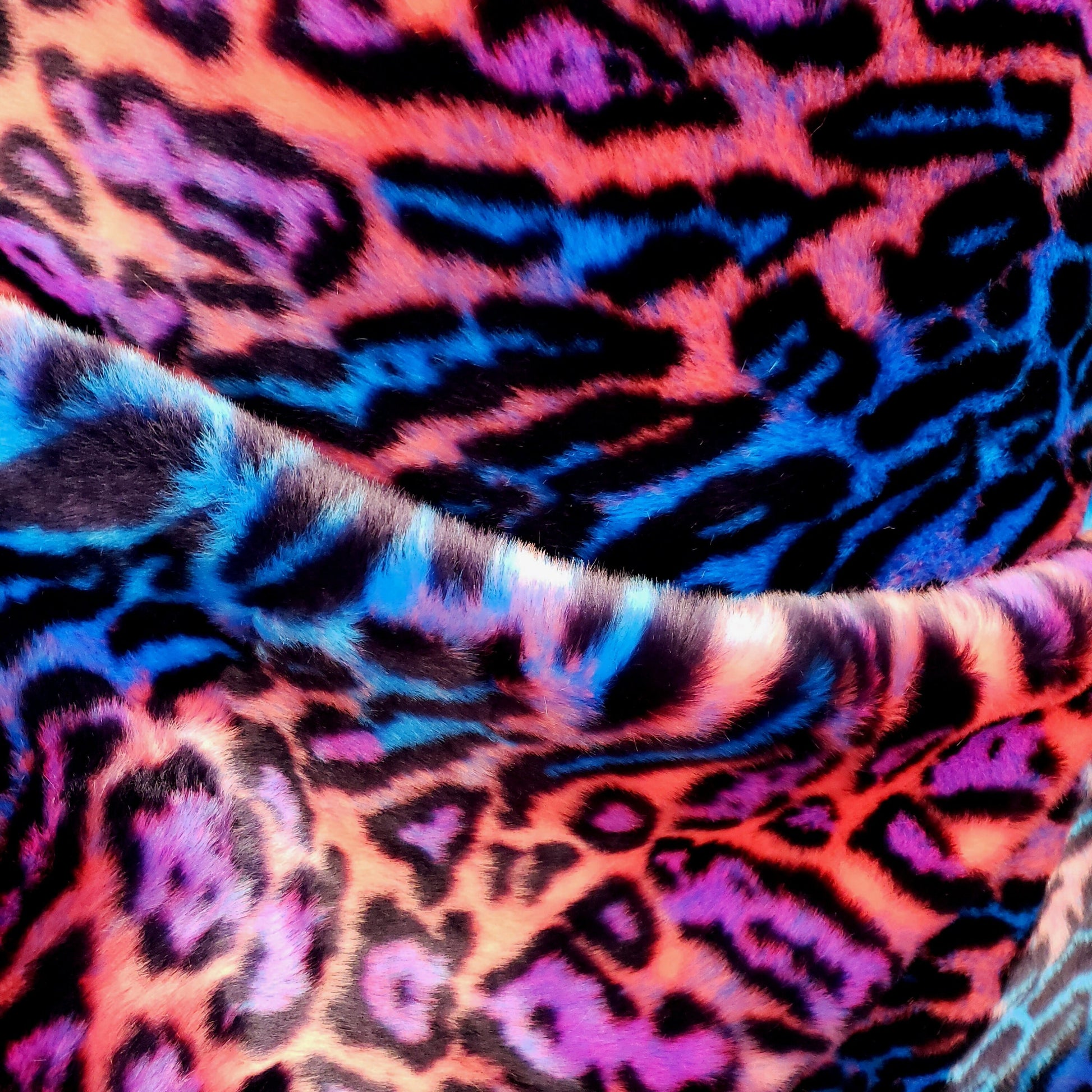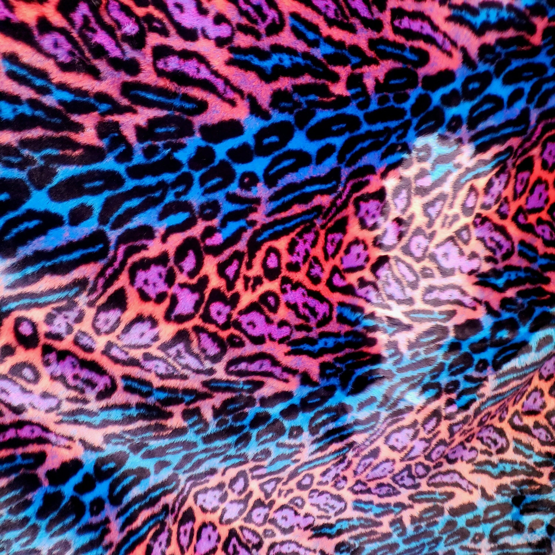 ACID LEOPARD FUN FUR SHERBERT HUES is a striking short pile faux fur that brings a bold, contemporary edge to any project. Featuring a dynamic striped leopard print in vivid sherbert tones, this fabric captures attention with its vibrant color palette. The fur fibers are securely adhered to a flat woven backing, ensuring durability and ease of handling. This construction allows for straightforward lining or adhesion to various surfaces, making it ideal for fashion, upholstery, or creative crafts. Its unique combination of texture and color offers designers a versatile material to elevate their work with a playful yet sophisticated flair.