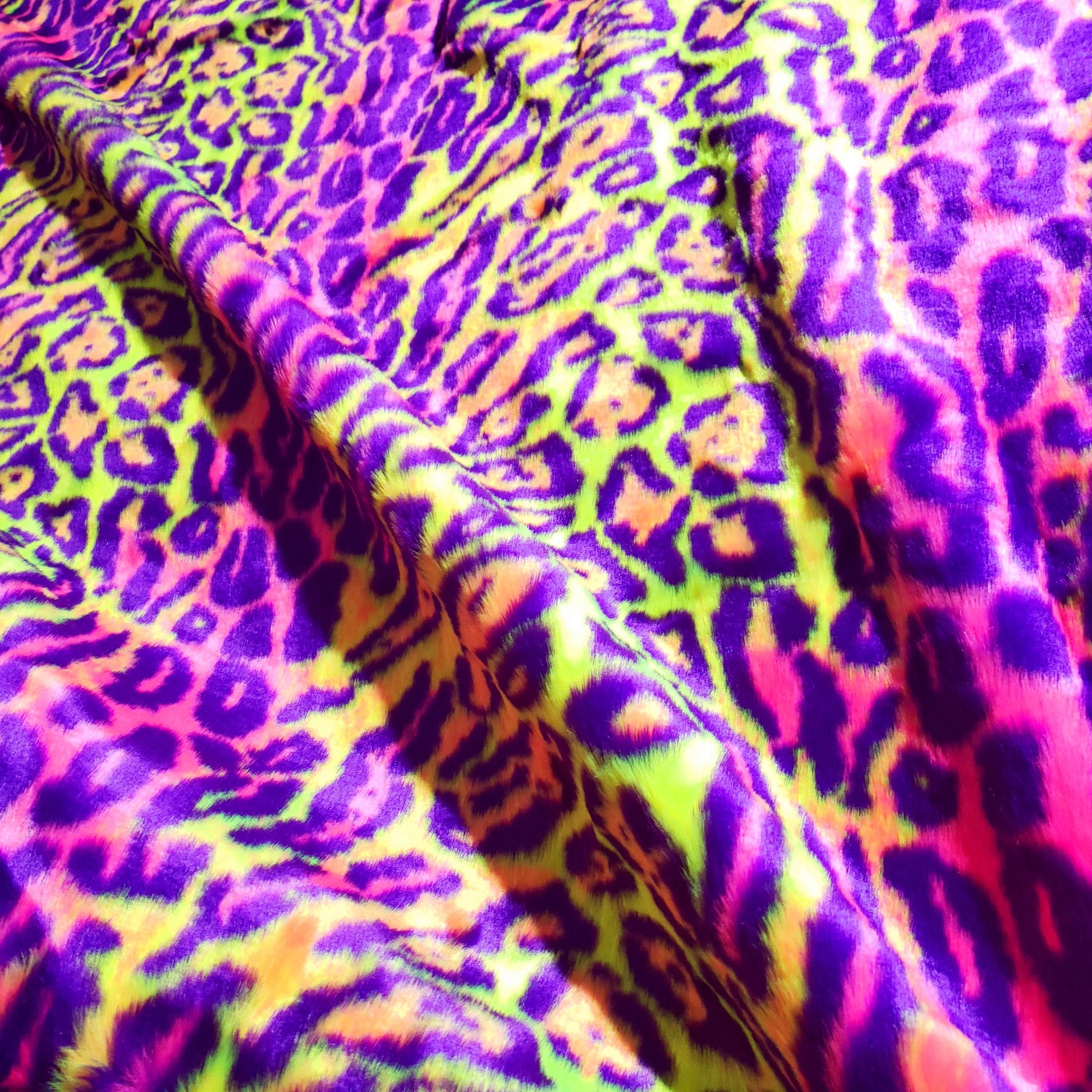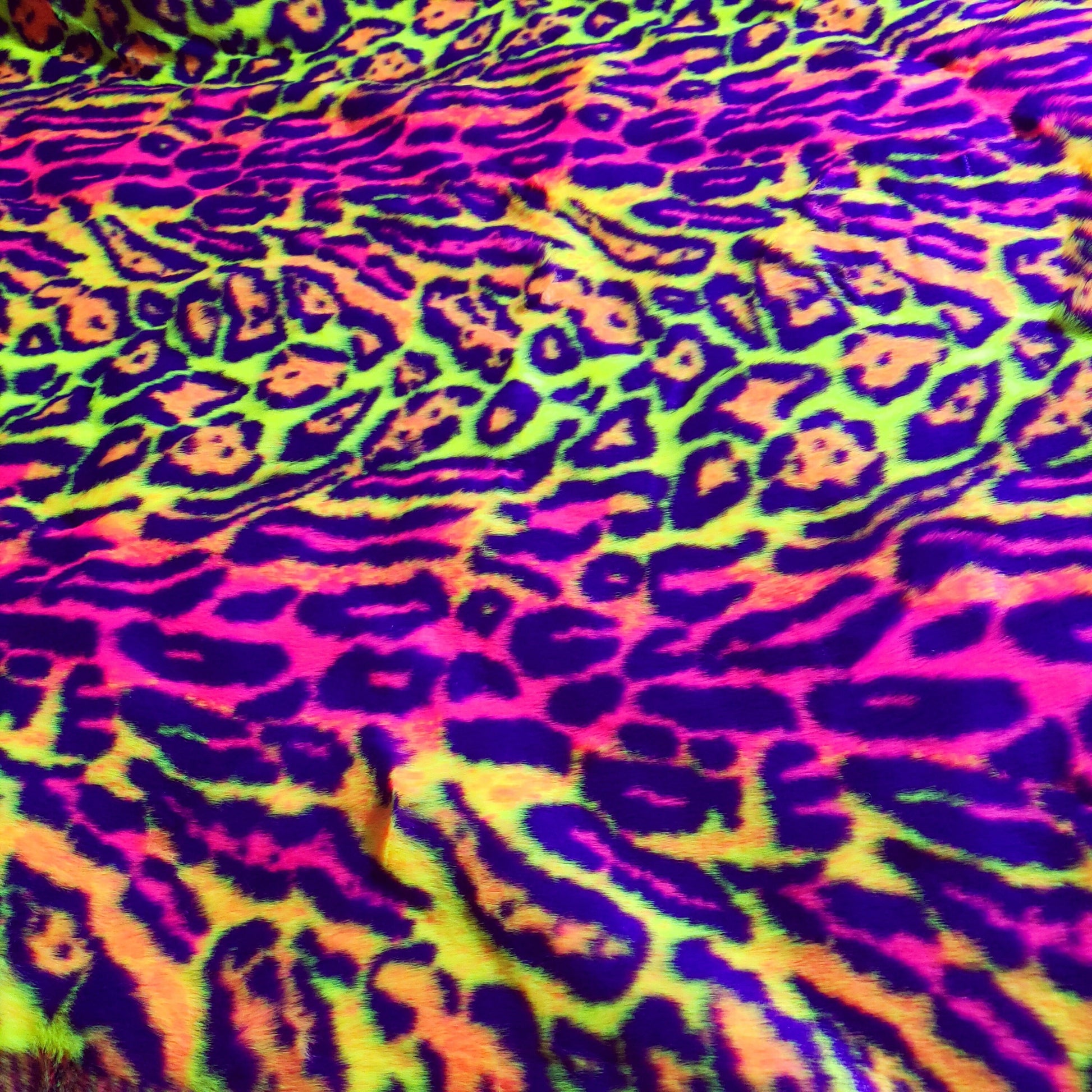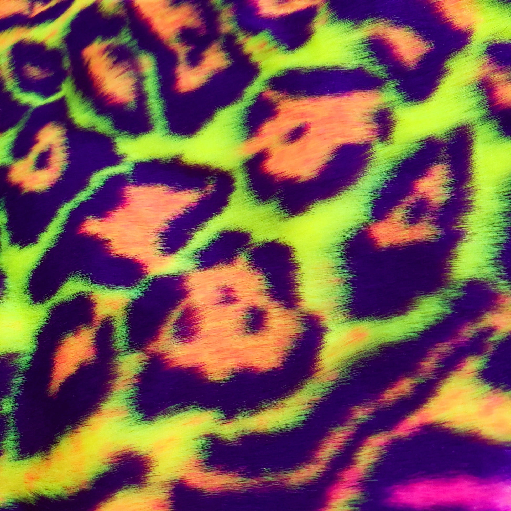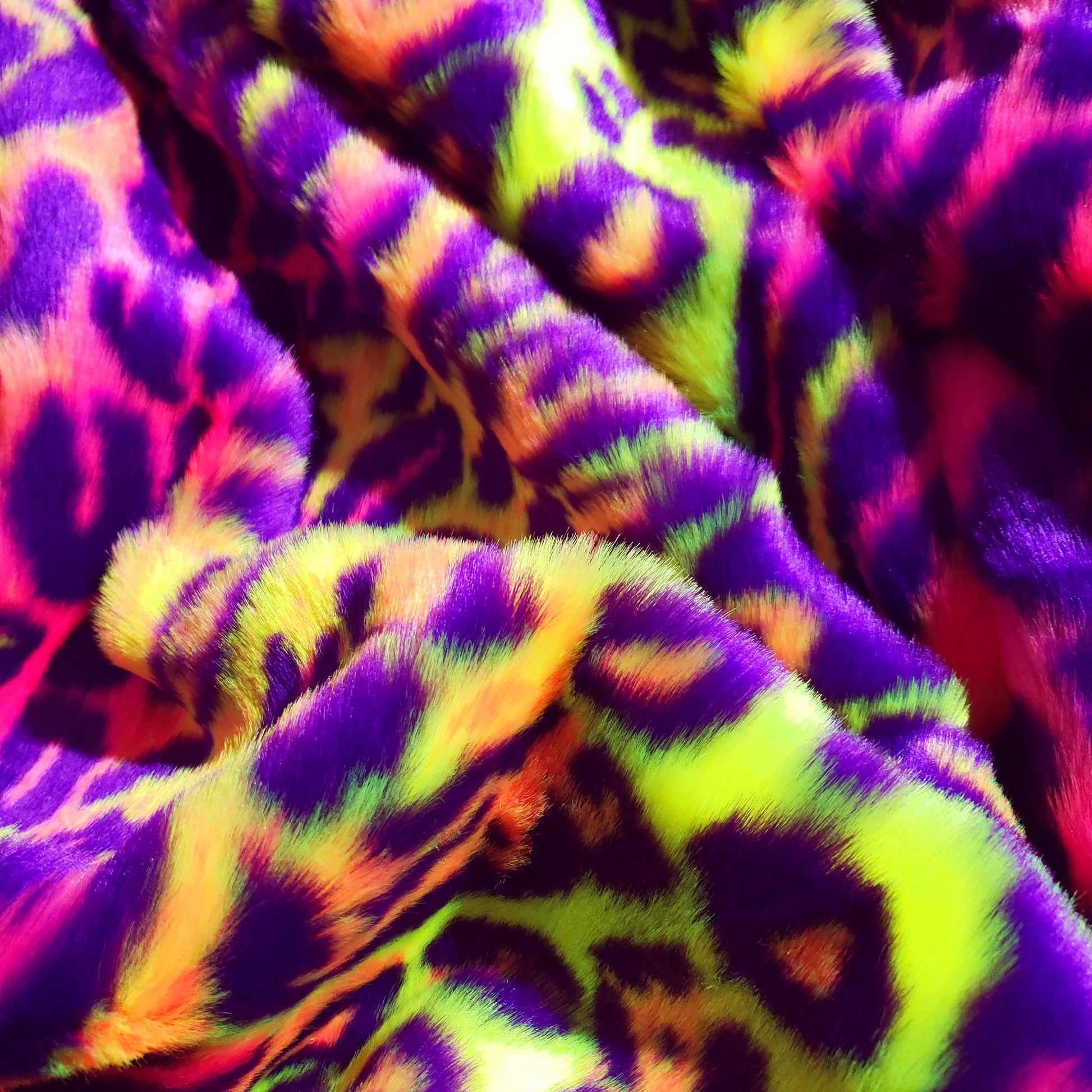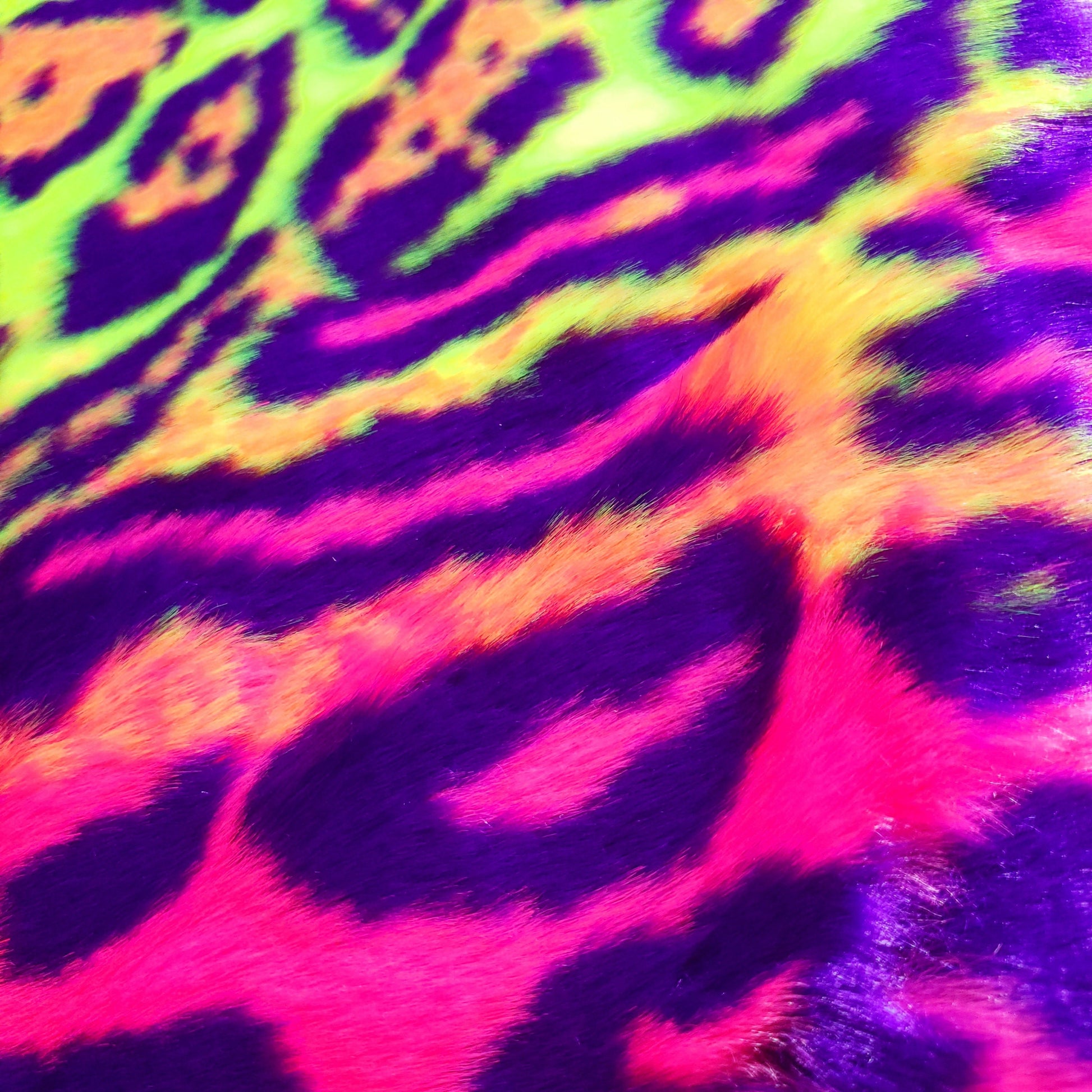 This short pile faux fur fabric features a vibrant and eye-catching striped leopard print in bold neon orange and complementary 90s-inspired colors, perfect for making a statement in fashion or décor projects. The fur fibers are densely and securely attached to a durable flat woven backing, ensuring stability and ease of use whether you are lining garments, upholstering, or applying it to other surfaces. Its unique pattern and vivid hues offer a fresh take on classic animal prints, ideal for designers seeking to infuse retro flair with modern durability and versatility.