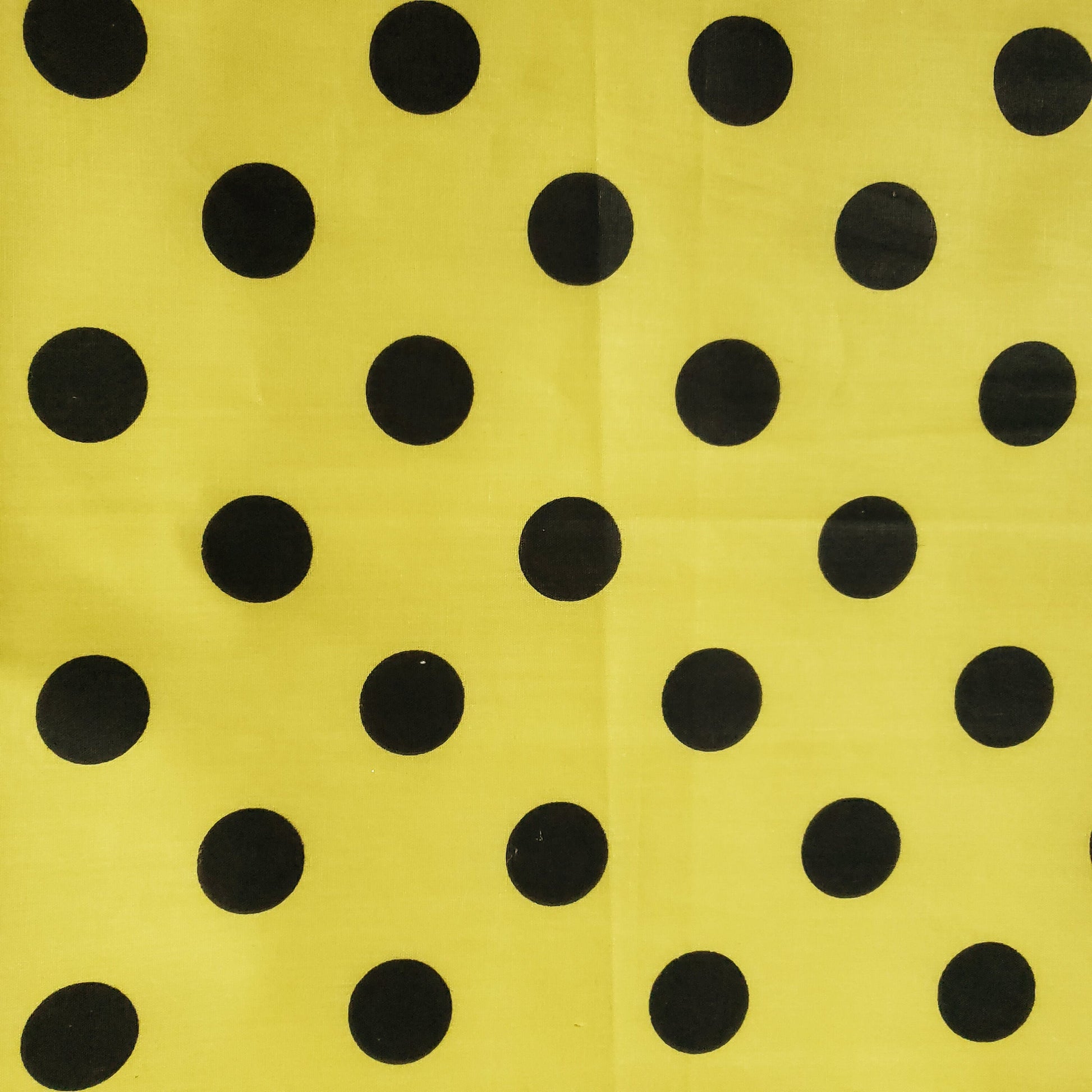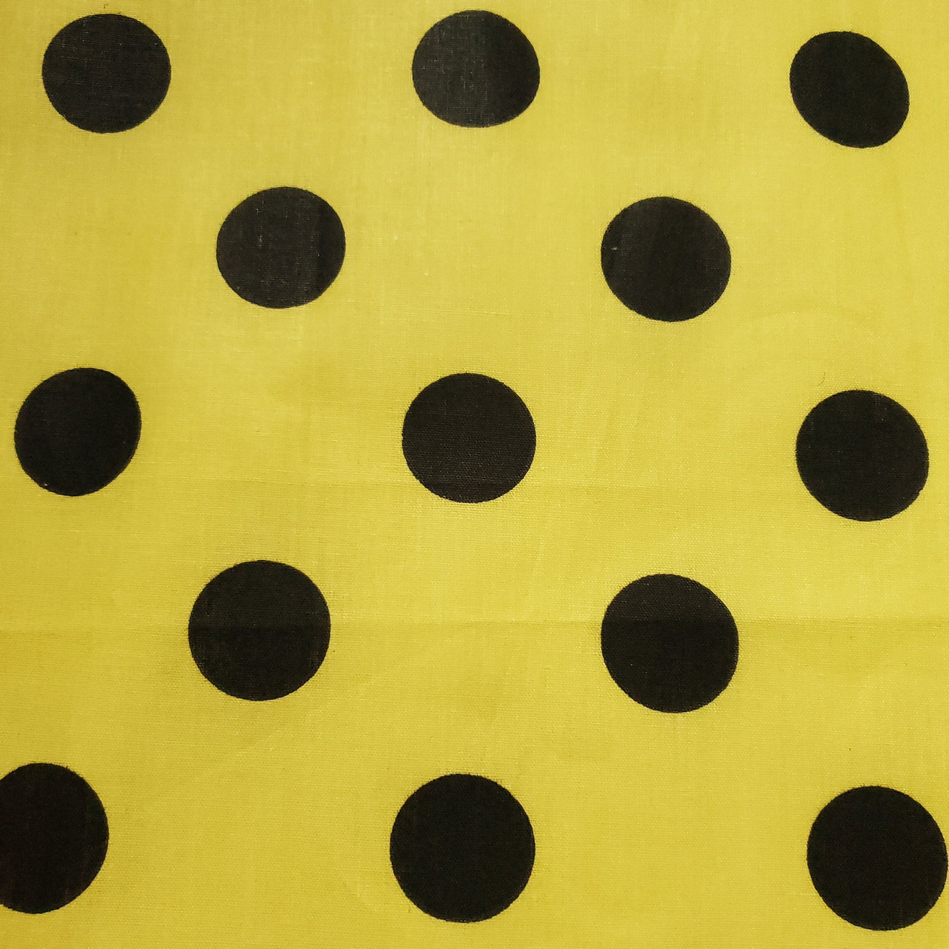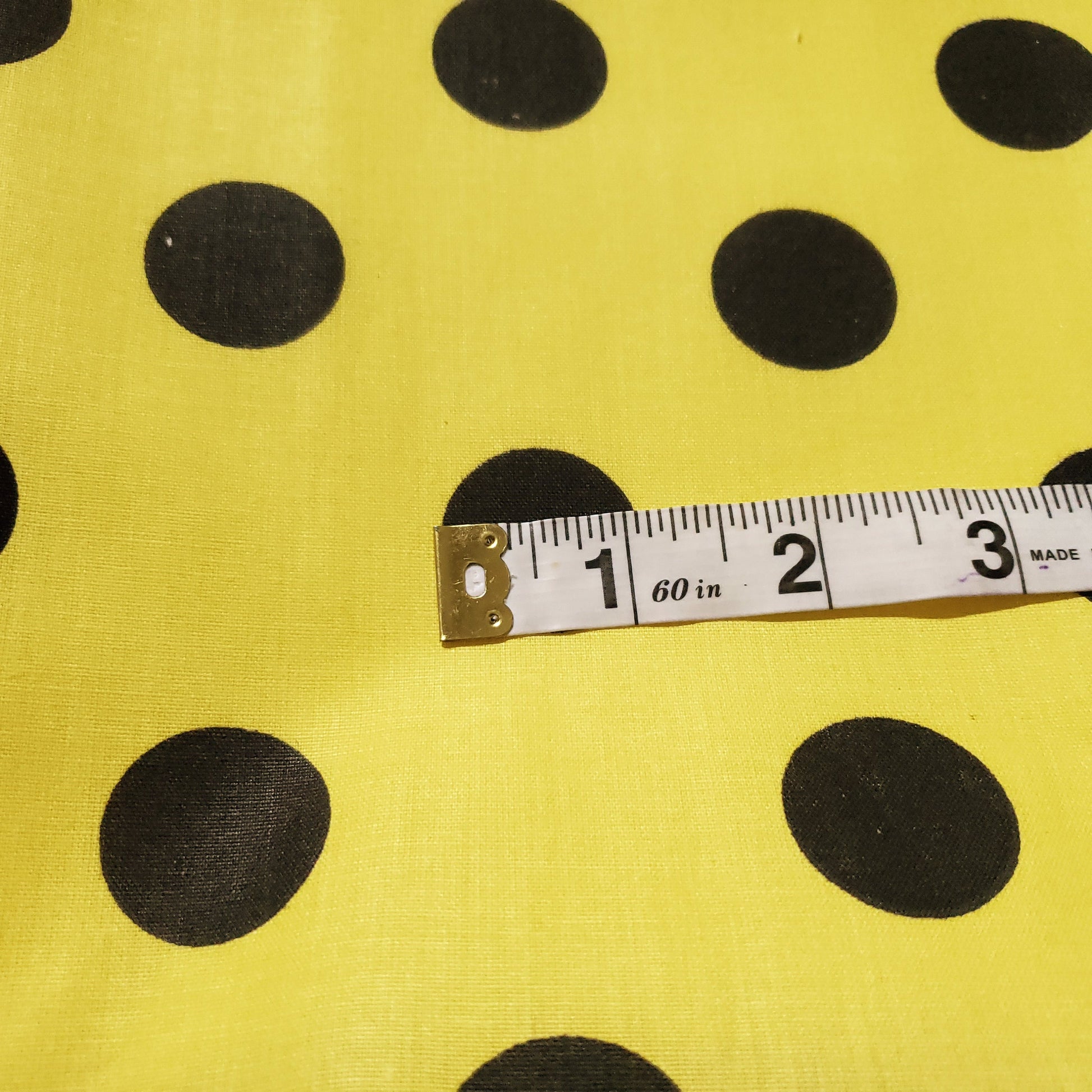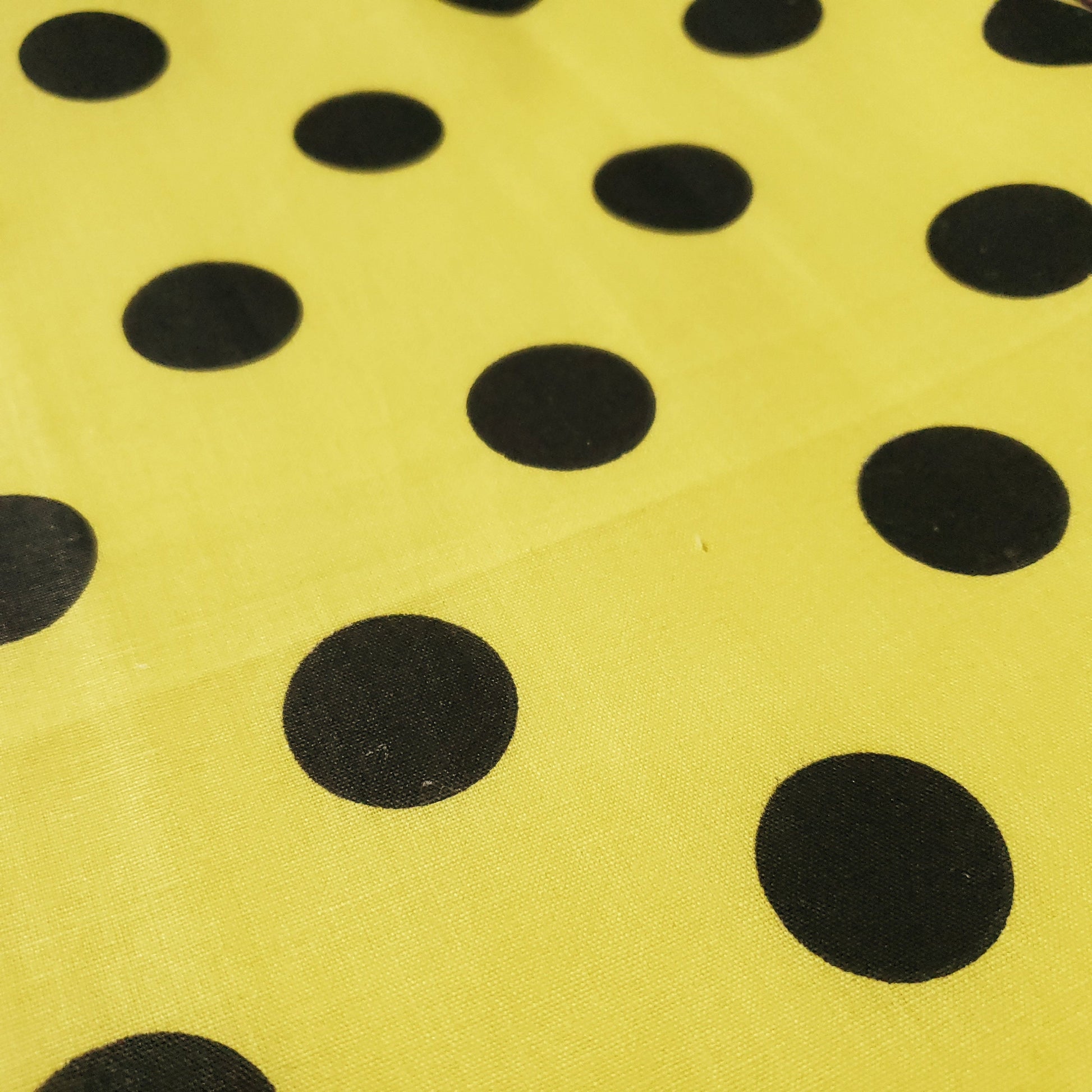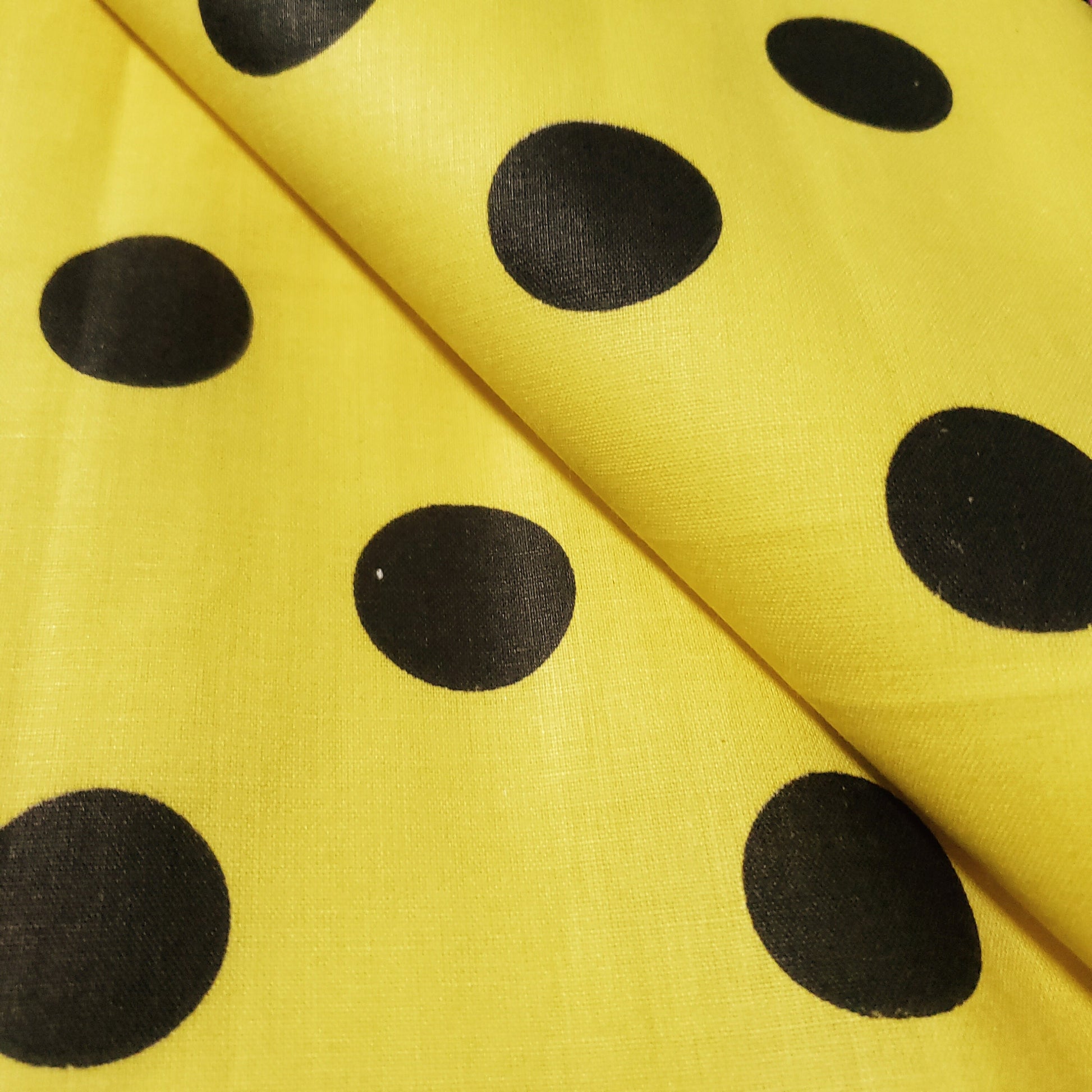 This fabric showcases black polka dots measuring about one inch in diameter, arranged on a vibrant yellow backdrop. Crafted from a lightweight cotton blend, it offers excellent drape and breathability, making it ideal for various applications.