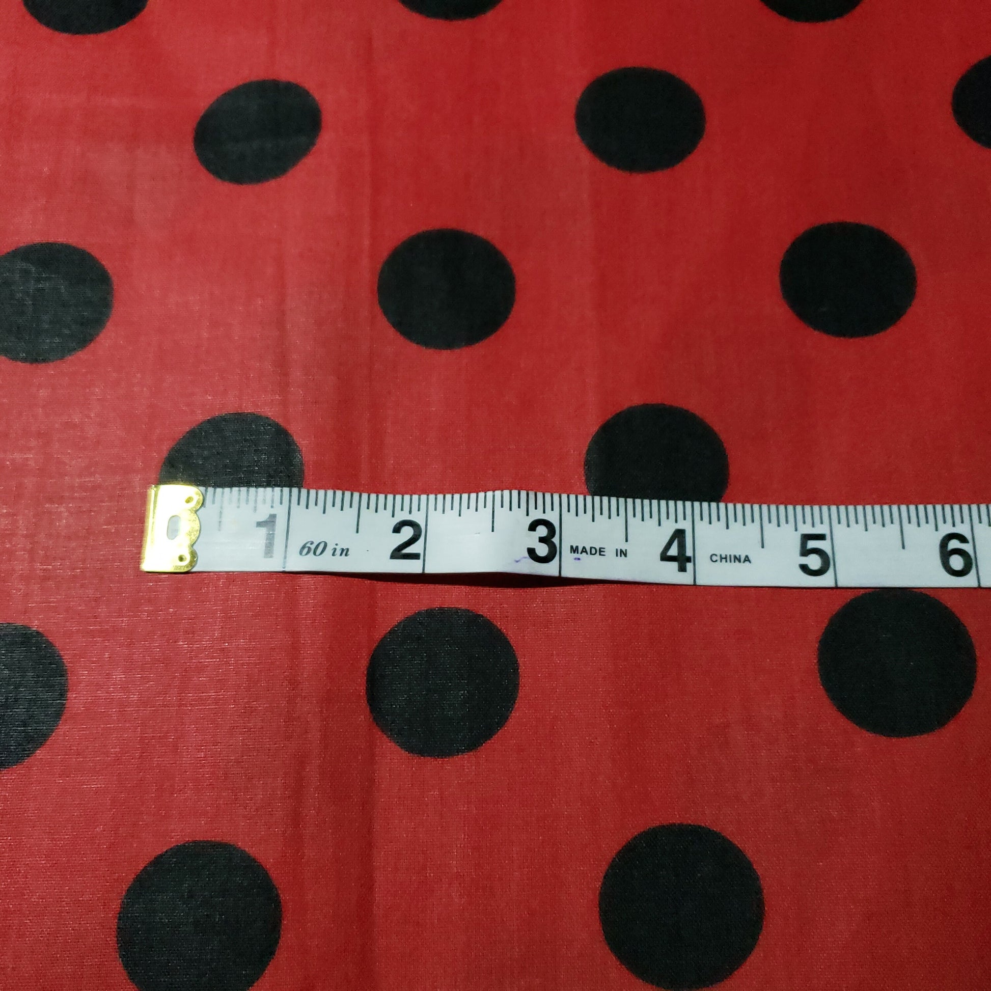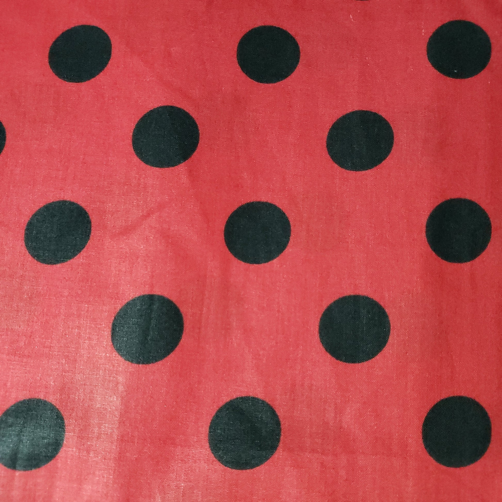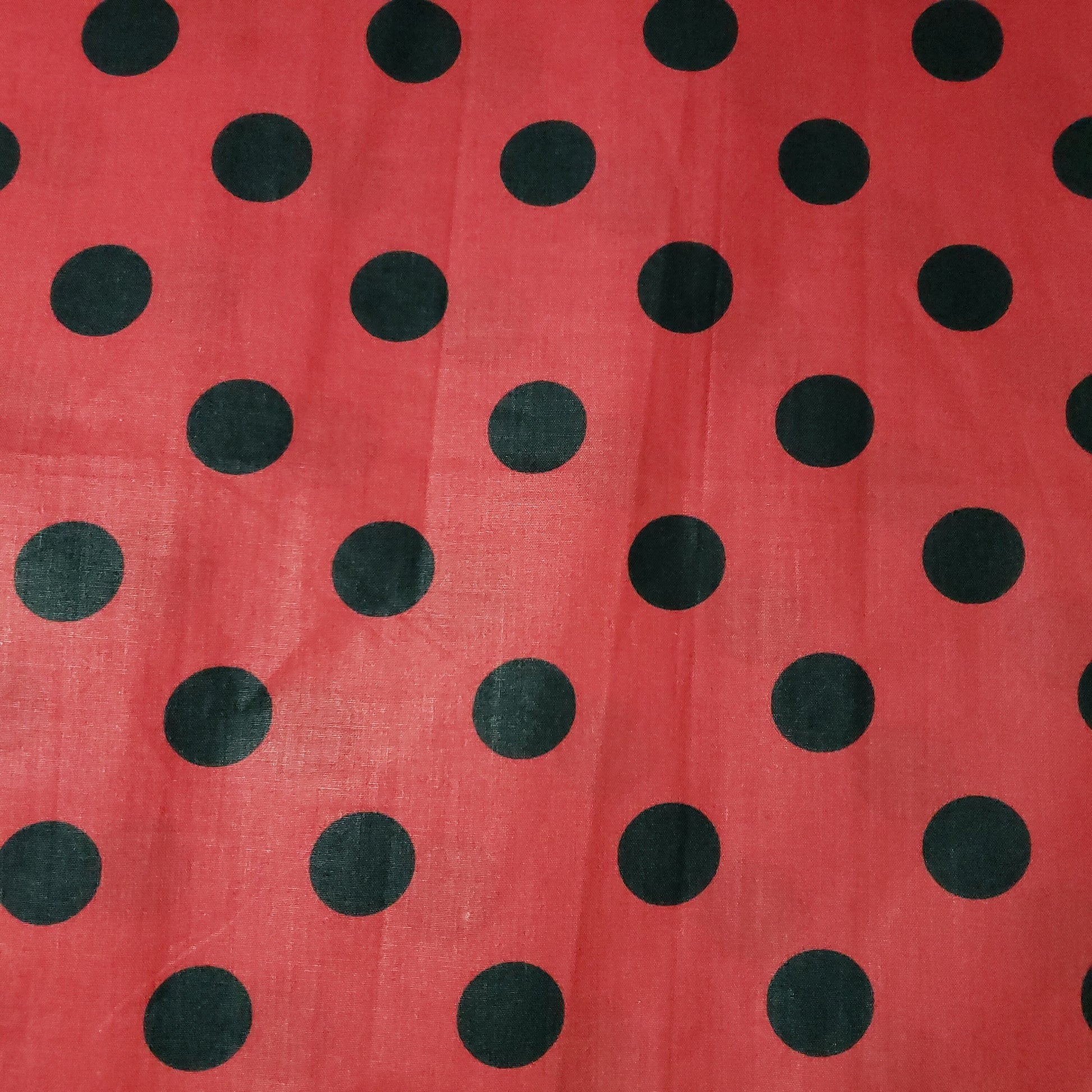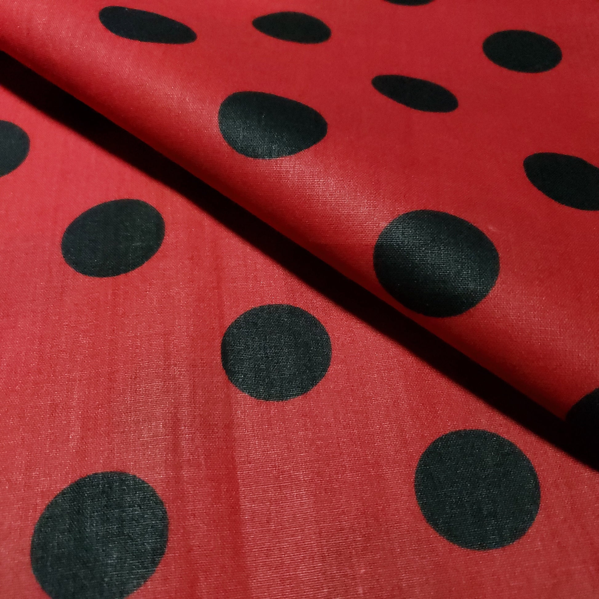 This fabric showcases black polka dots roughly one inch in diameter against a vibrant red background. Crafted from a lightweight poly-cotton blend, it offers excellent drape and breathability, making it suitable for a variety of sewing and crafting applications.
