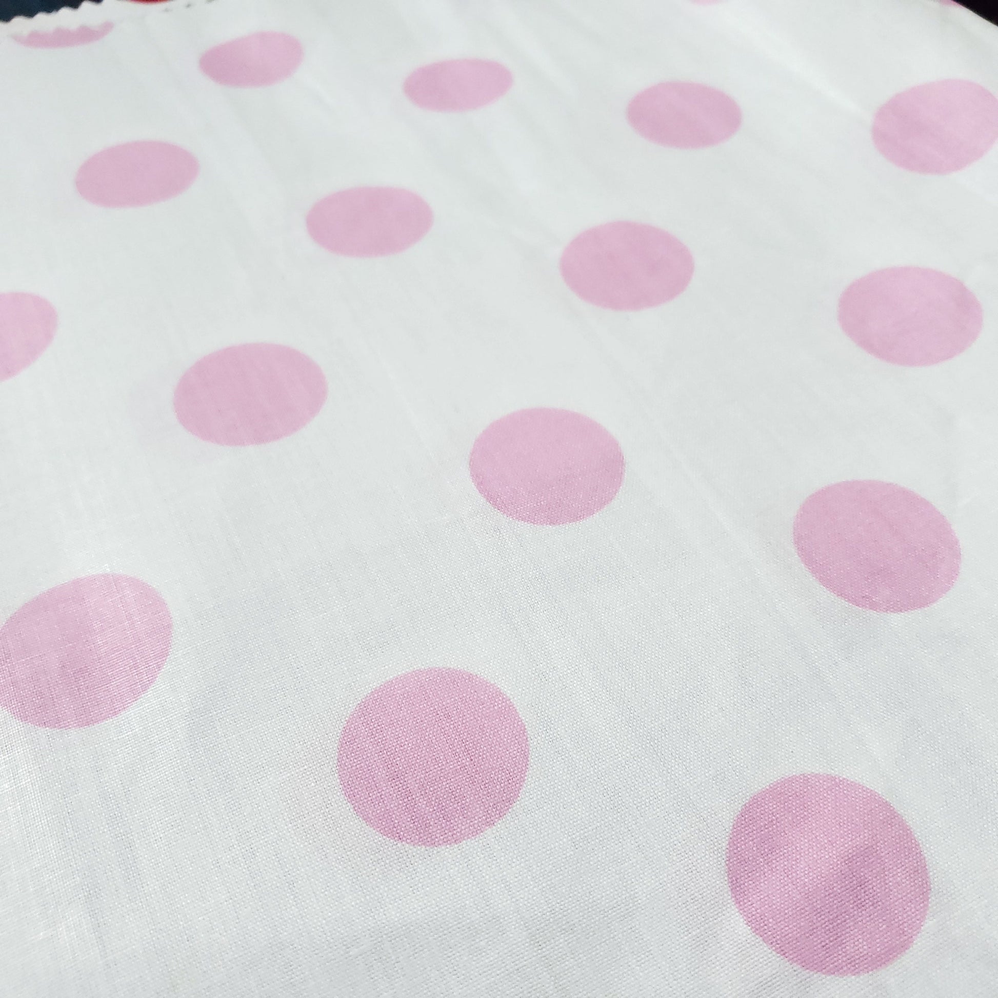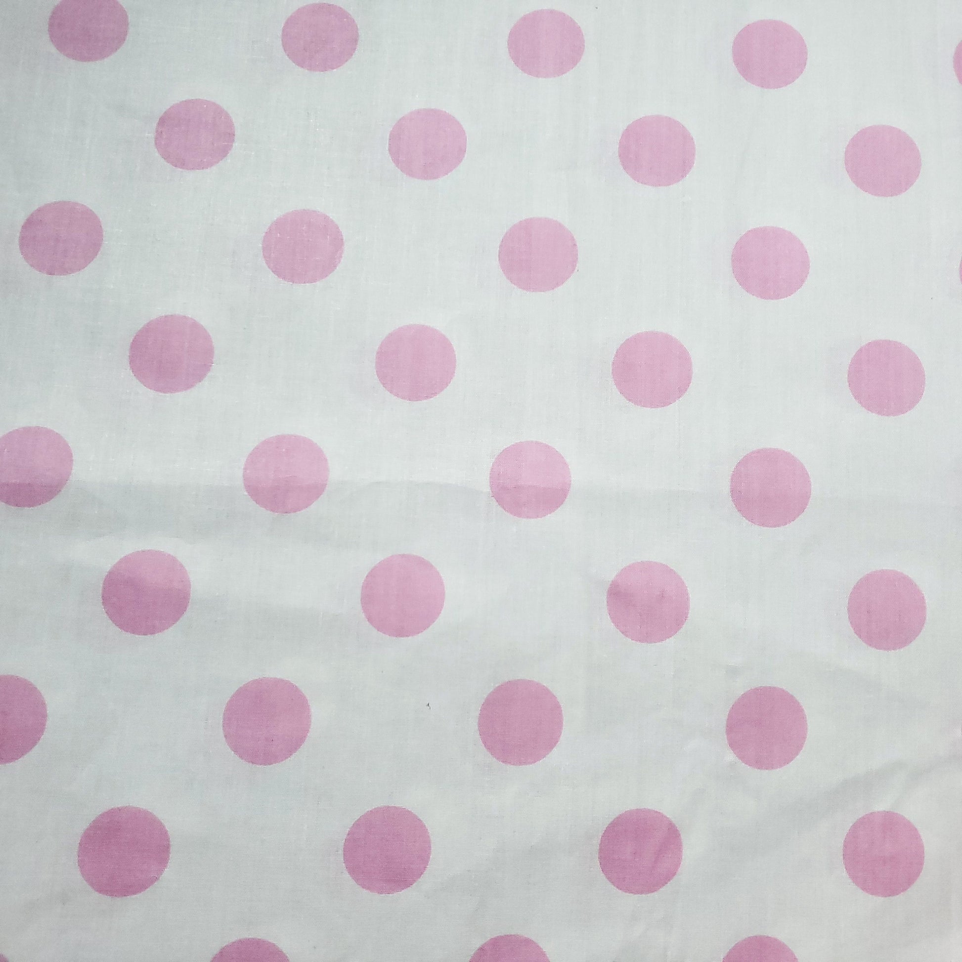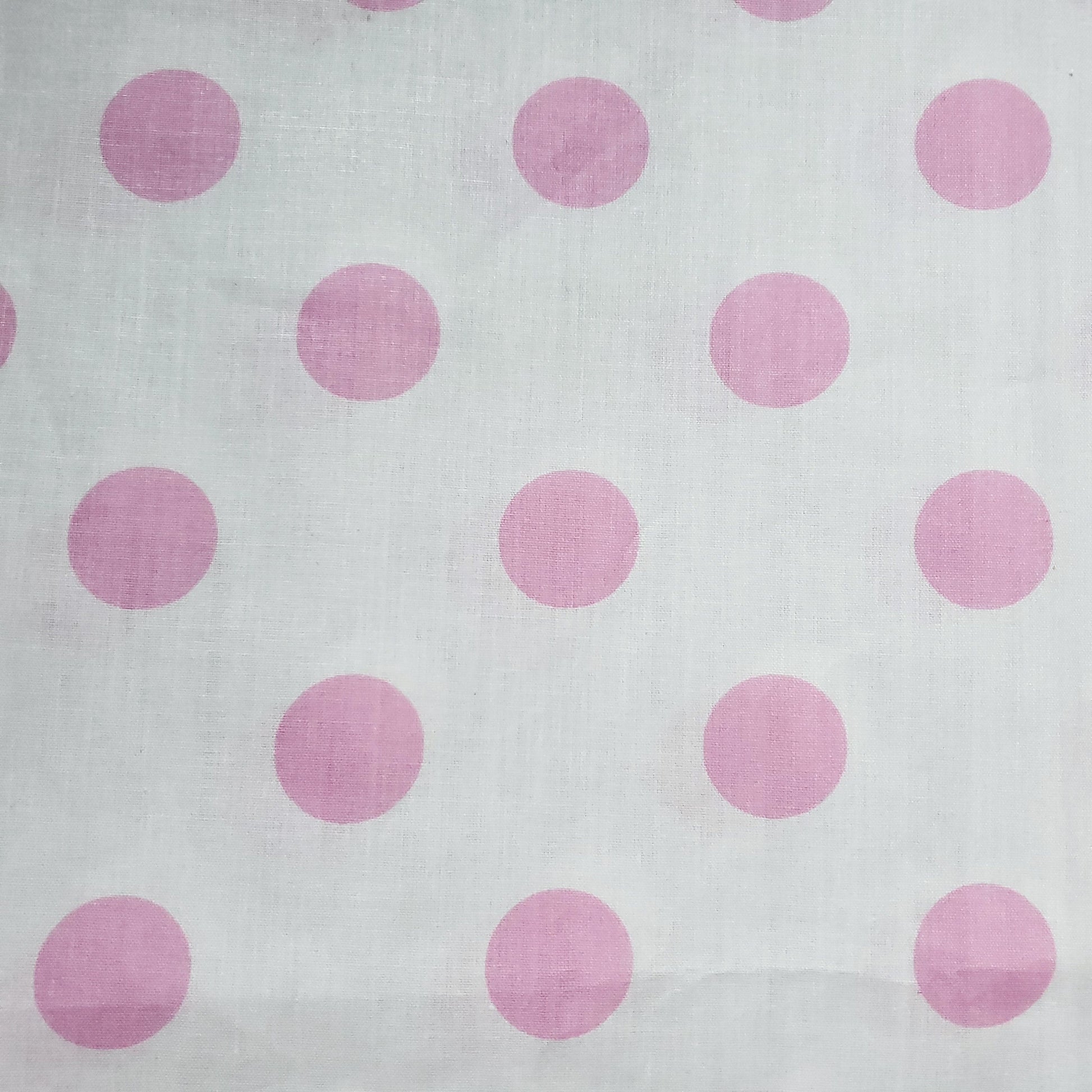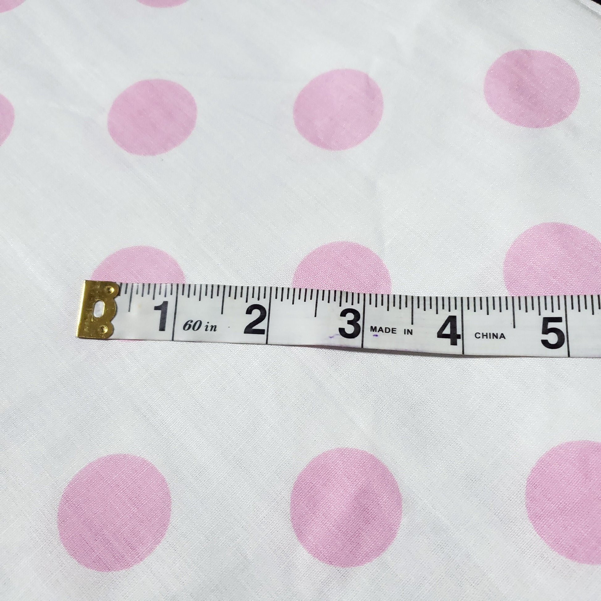 This fabric showcases one-inch light pink polka dots arranged on a crisp white background. Crafted from a lightweight cotton blend, it offers excellent drape and breathability, making it ideal for various sewing projects.