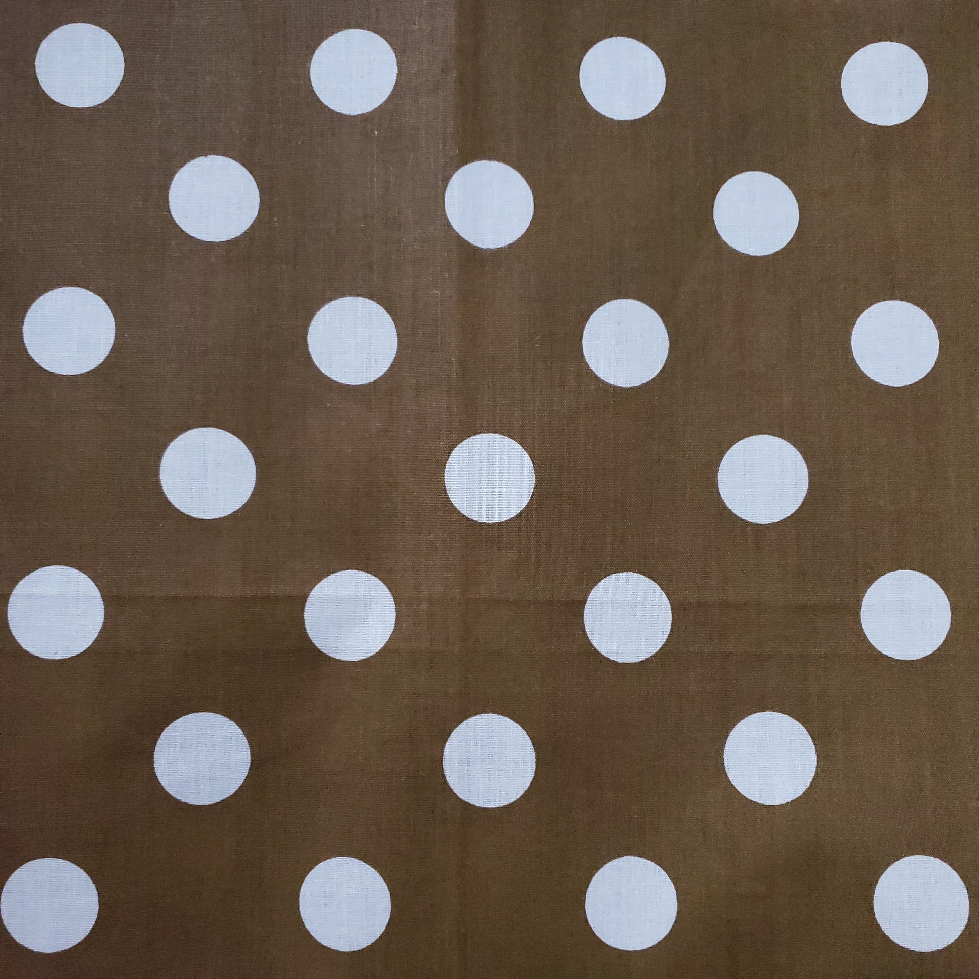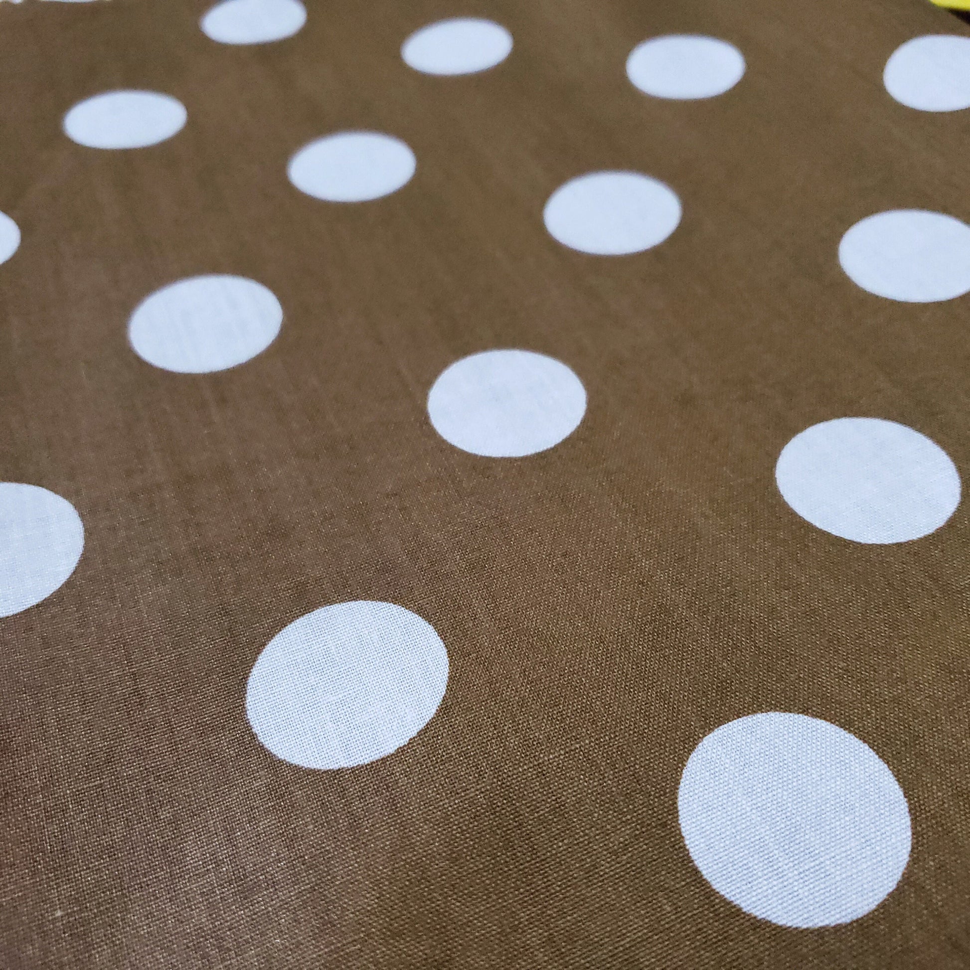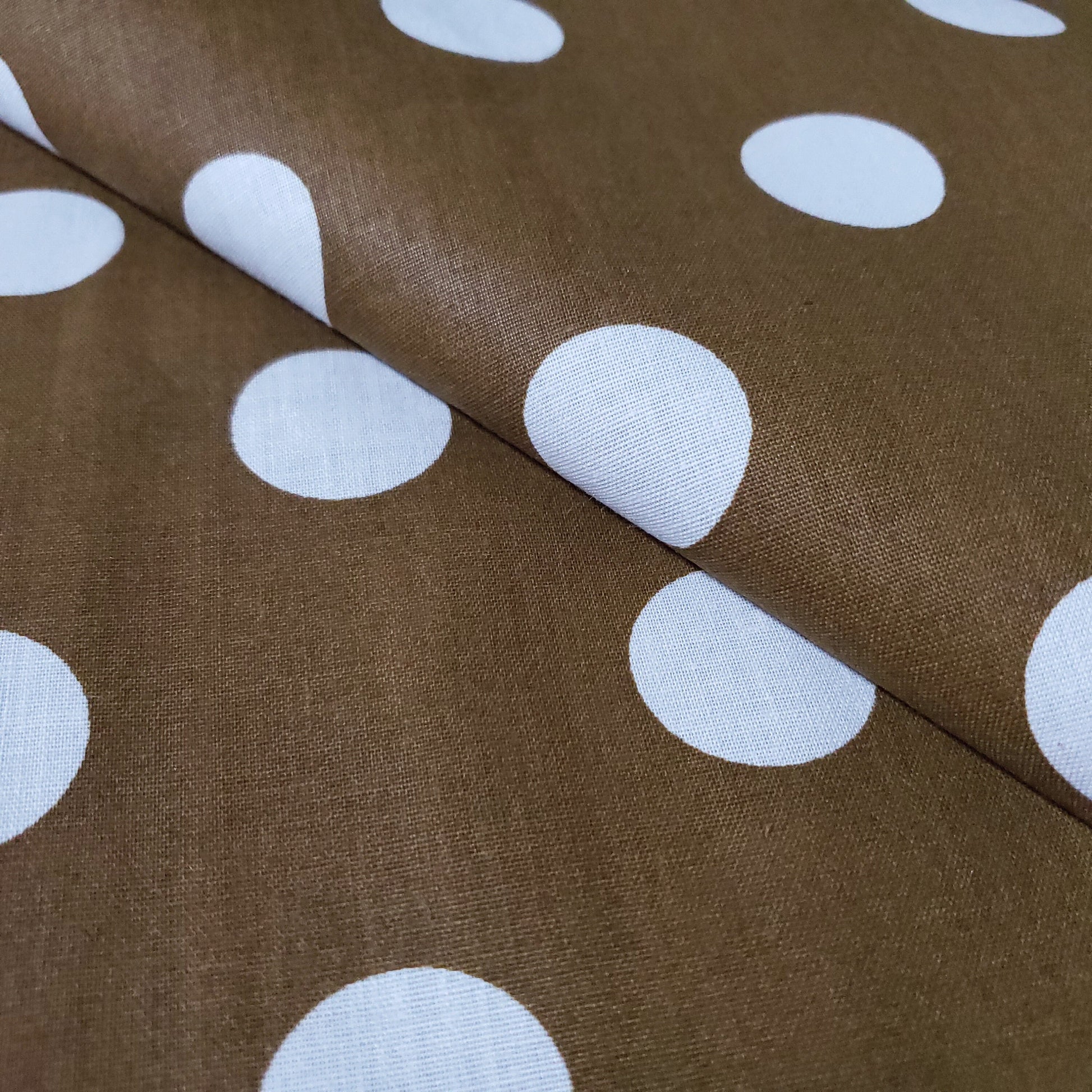 This fabric showcases white polka dots measuring about one inch in diameter, arranged on a rich Bronze Gold backdrop. Crafted from a lightweight cotton blend, it offers excellent drape and breathability, making it ideal for refined, comfortable garments.