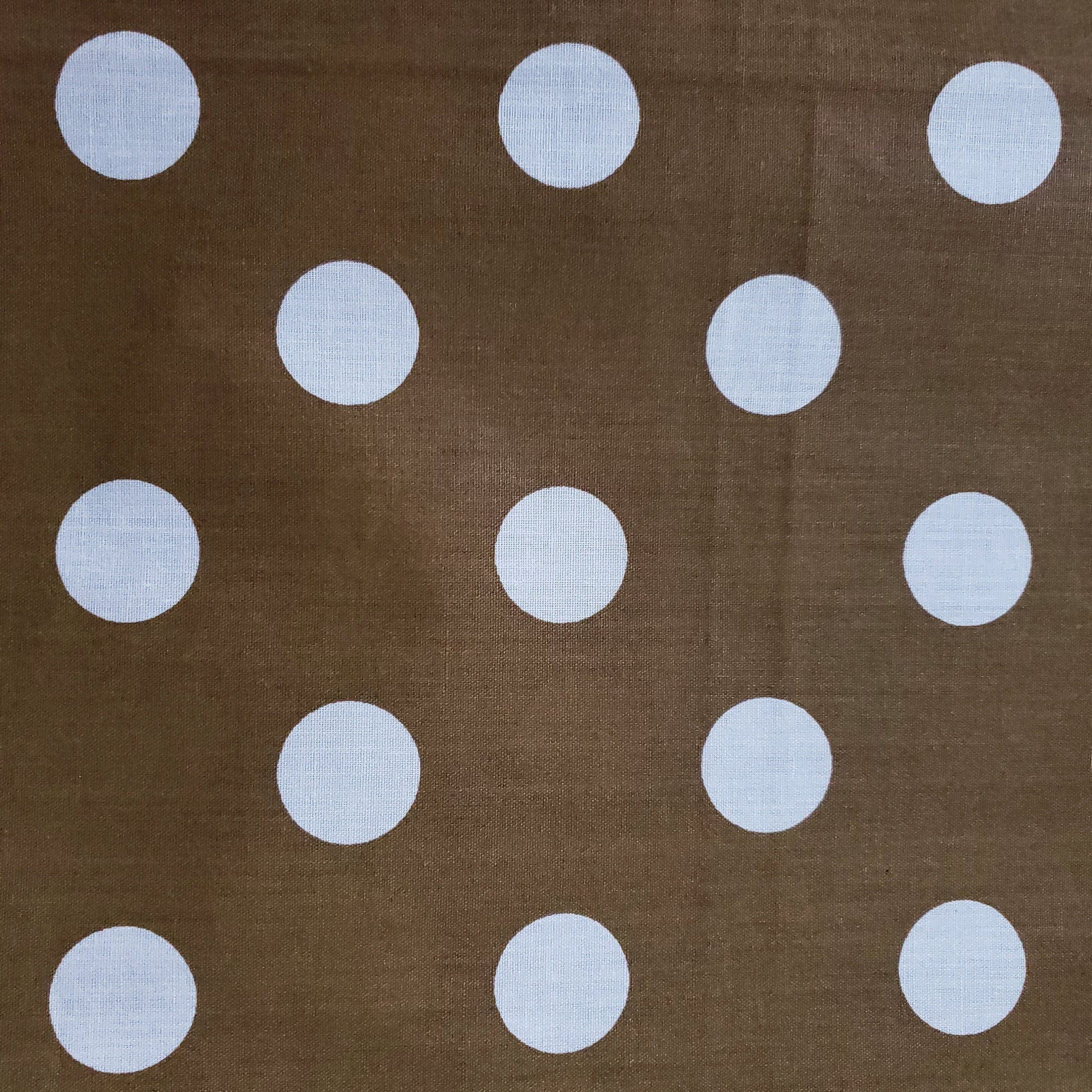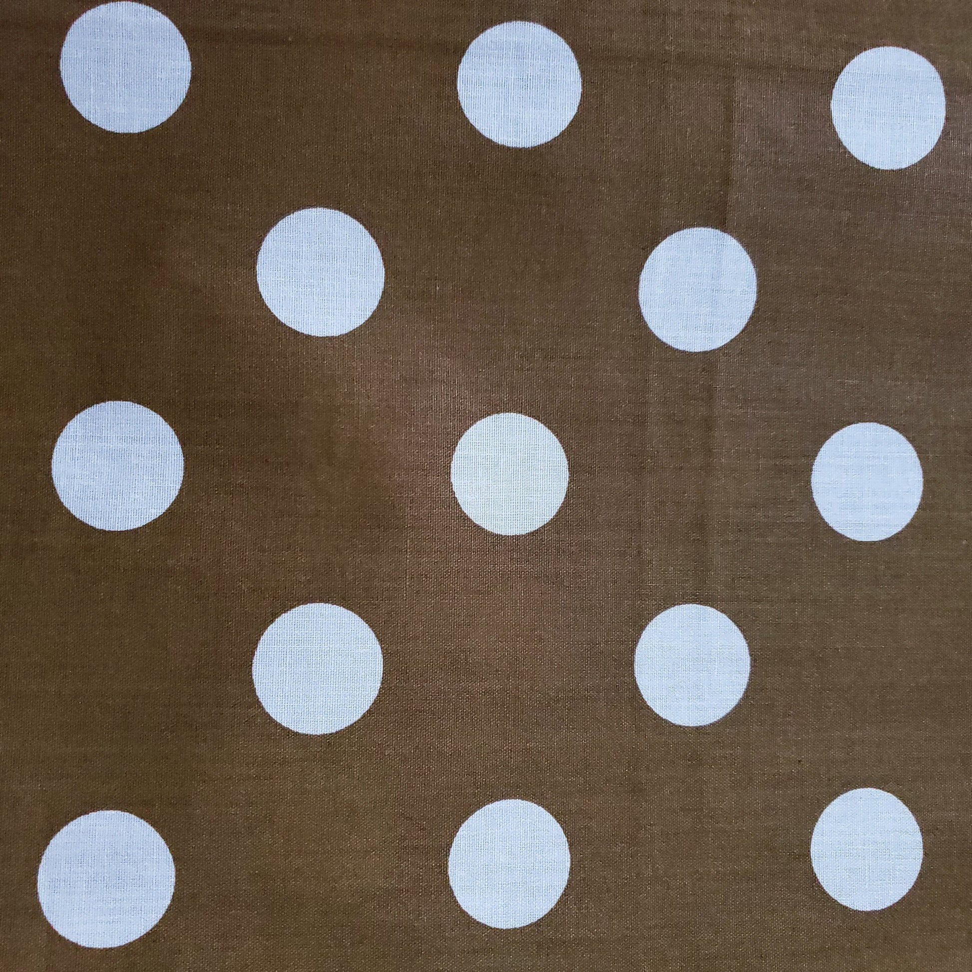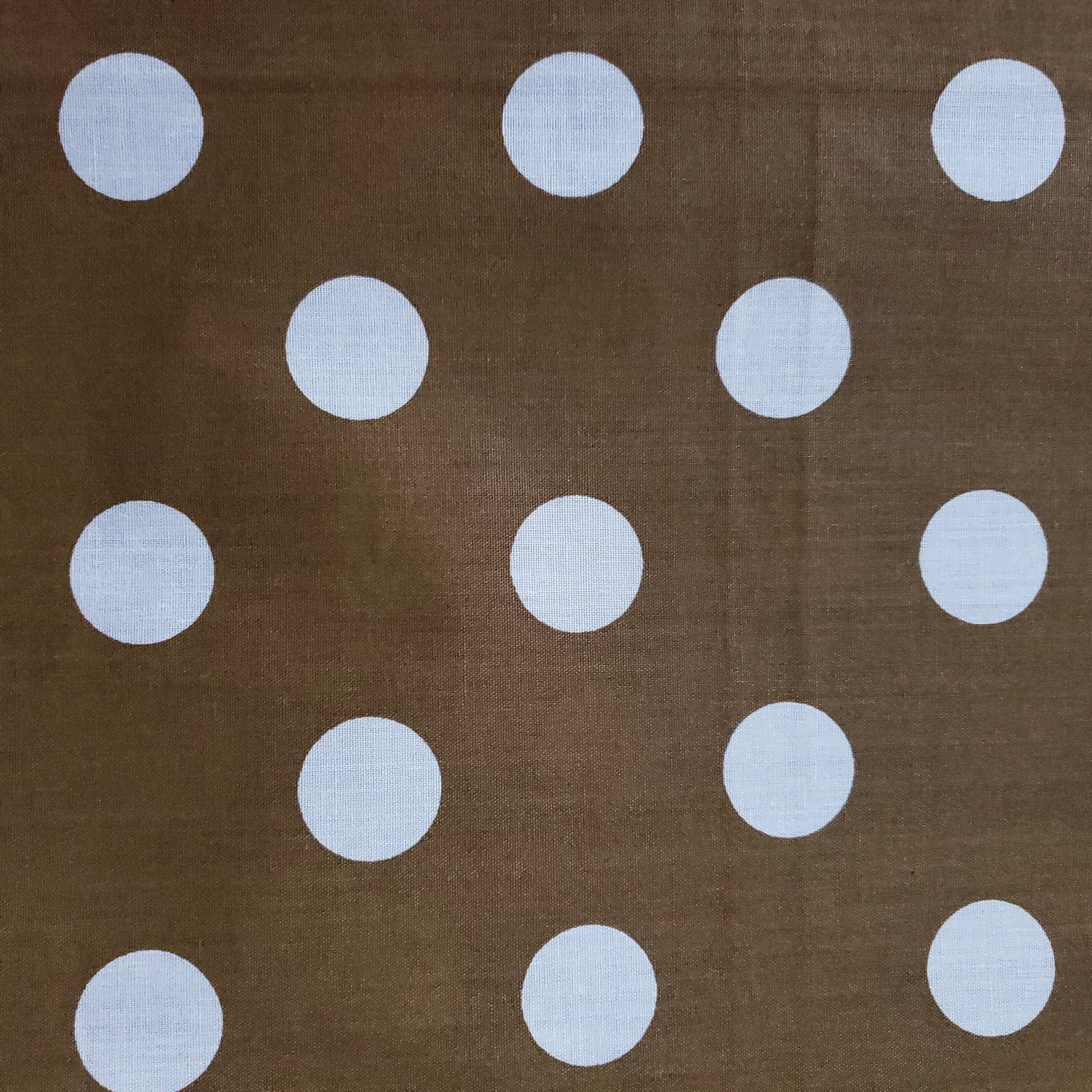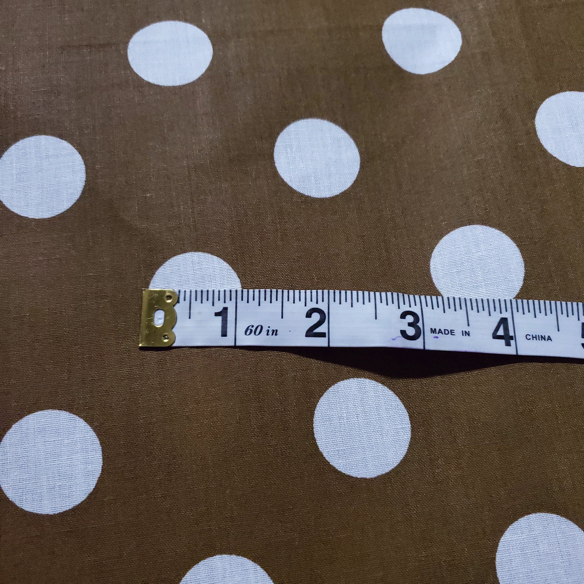 This fabric showcases white polka dots measuring about one inch in diameter, arranged on a rich Bronze Gold backdrop. Crafted from a lightweight cotton blend, it offers excellent drape and breathability, making it ideal for refined, comfortable garments.
