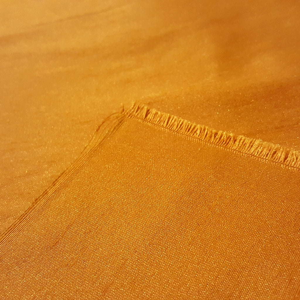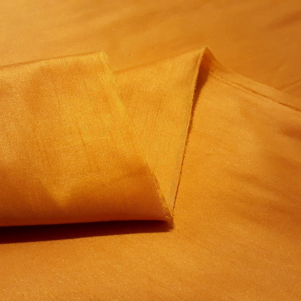 Crafted to emulate genuine silk Dupioni, this polyester fabric offers luxurious aesthetics at a fraction of the cost. The muted orange base interwoven with fine yellow yarns creates a subtle two-tone appearance reminiscent of butternut squash. Its distinctive plain-weave construction features fine warp and uneven weft yarns, producing characteristic raised stripes and a gentle iridescence. This lightweight, crisp fabric billows elegantly rather than drapes, making it ideal for sophisticated apparel, home décor, and special occasion projects where visual texture and refined sheen are desired.