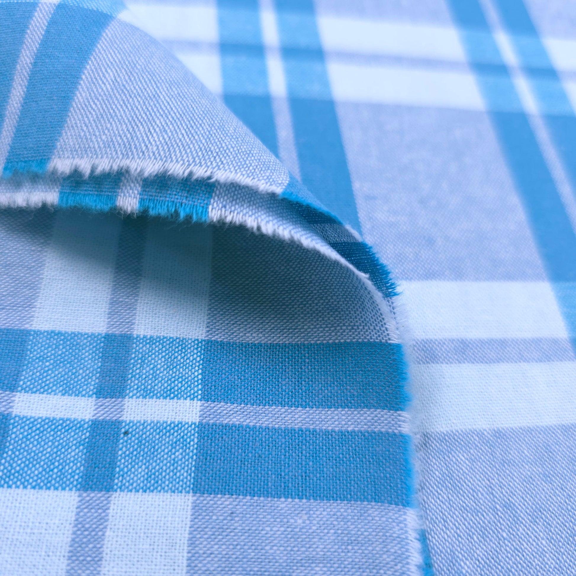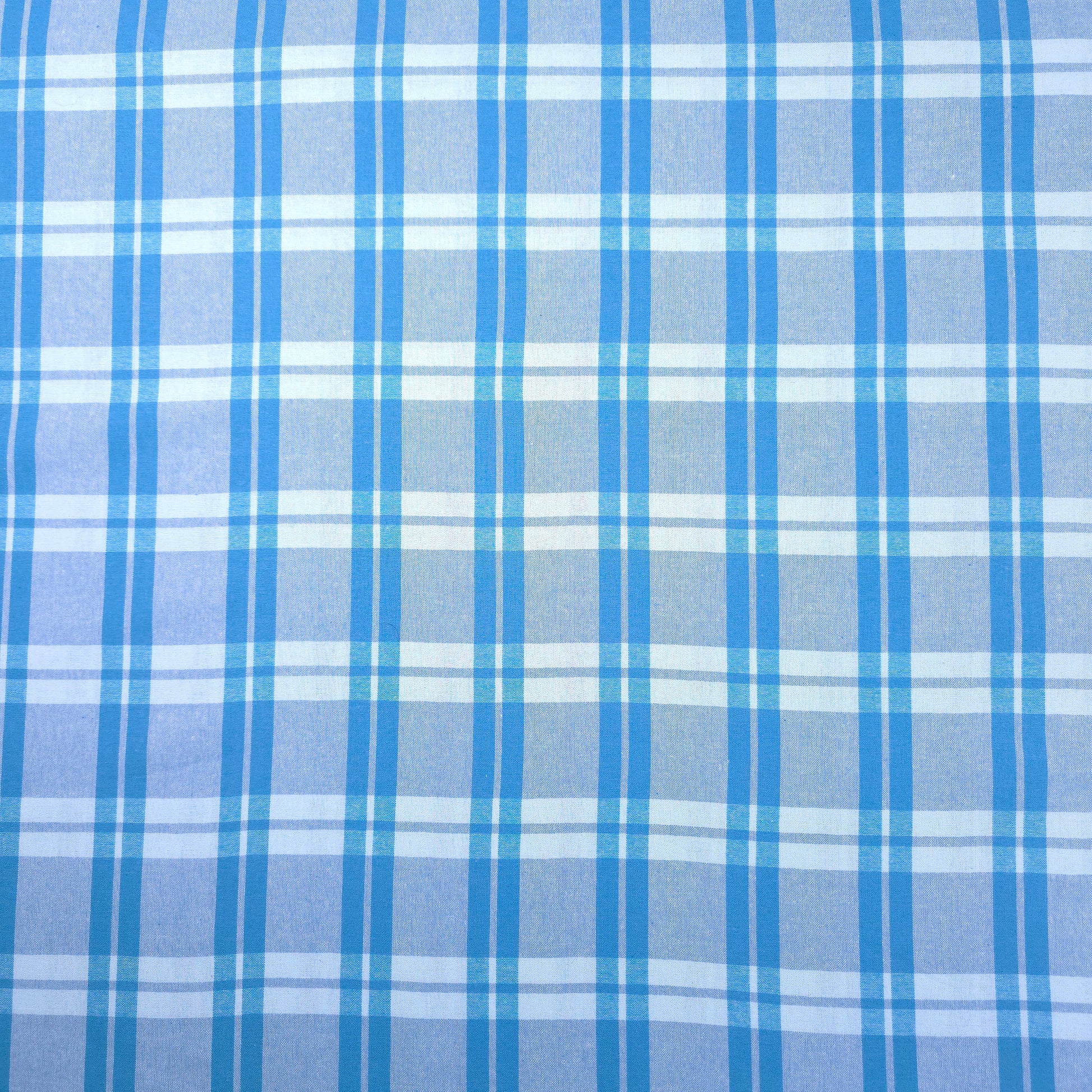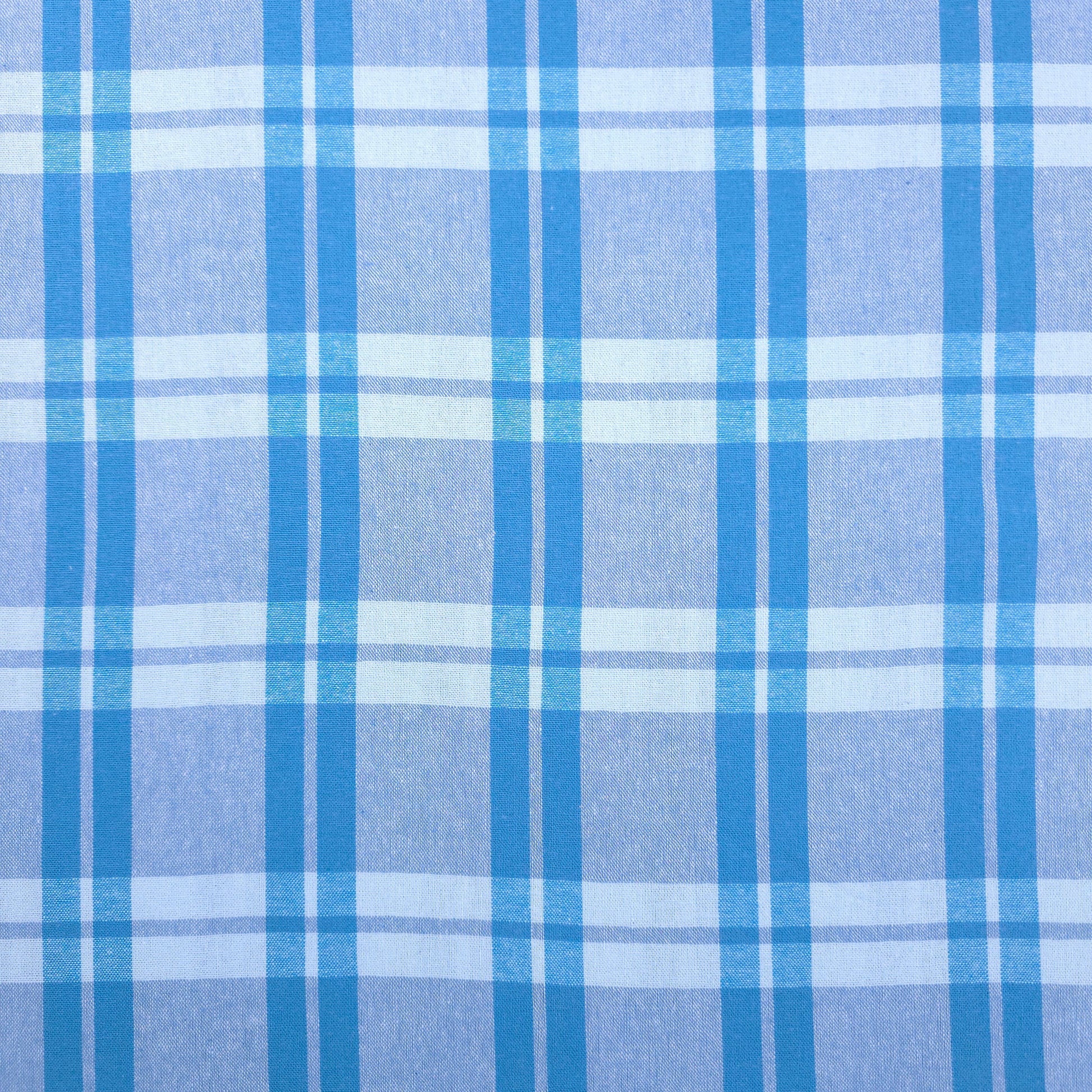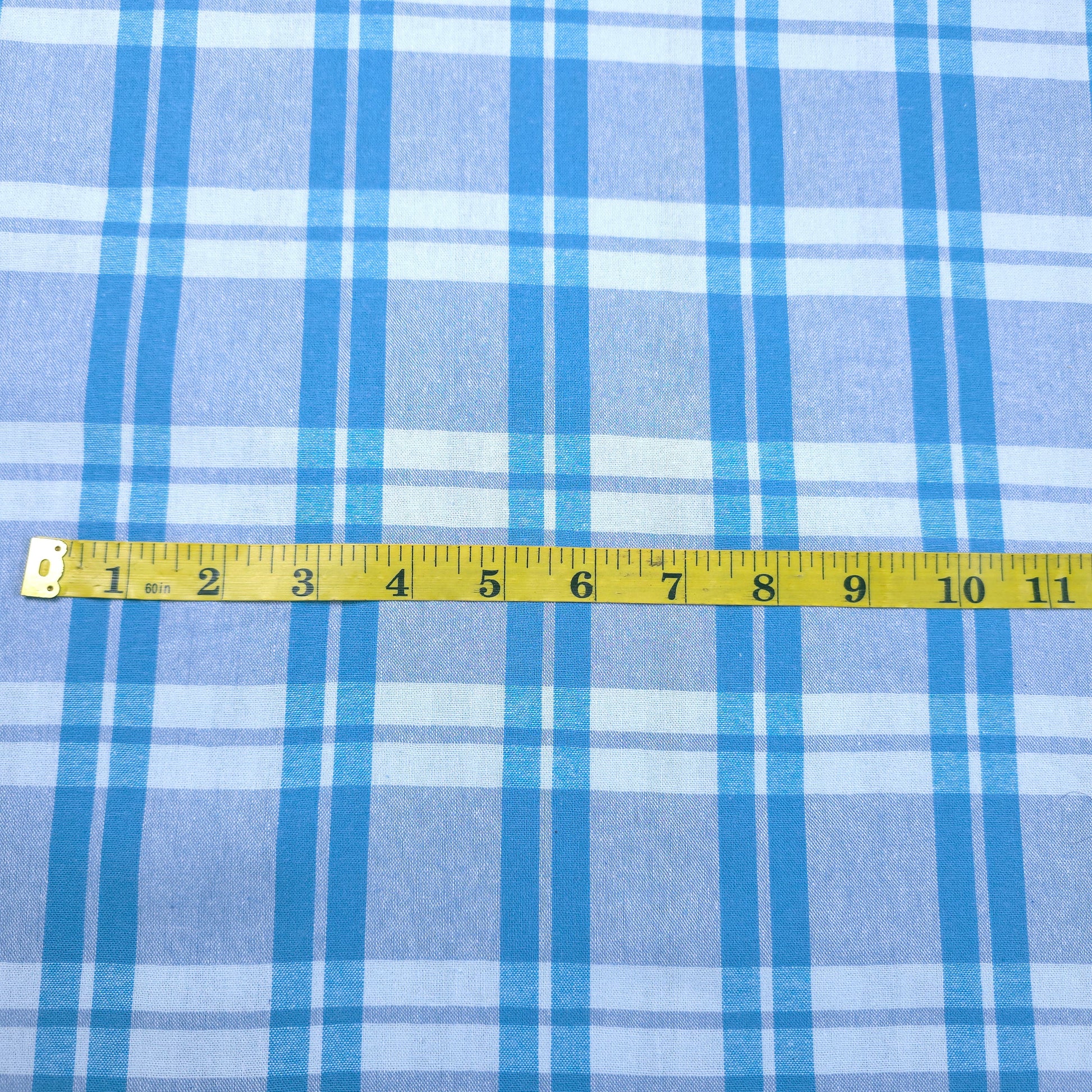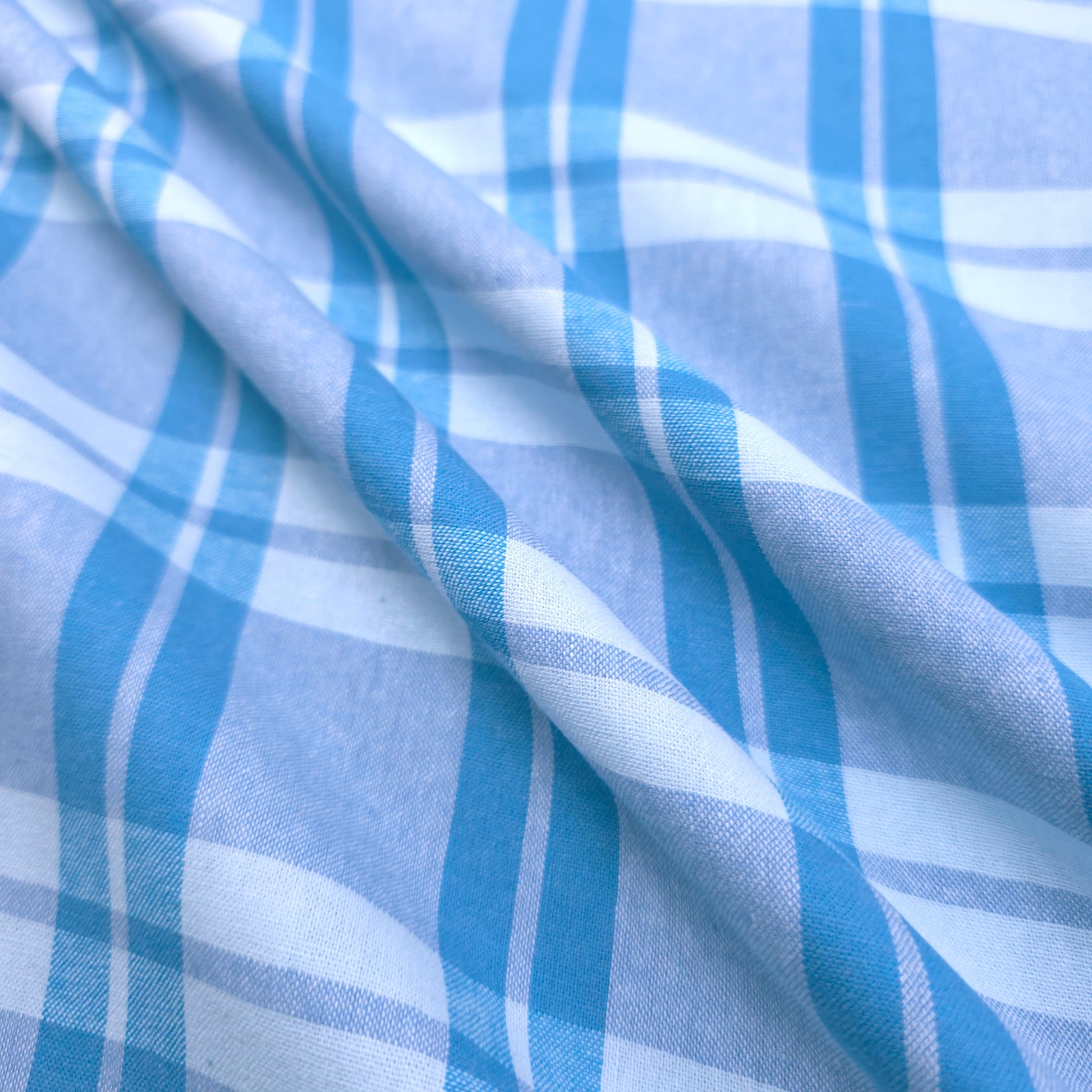 This 58-inch wide, lightweight cotton chambray fabric features a classic plaid pattern. The construction combines a light blue base with intersecting stripes of turquoise and white, creating a balanced and versatile design. The chambray weave provides a soft hand-feel and breathability, making it comfortable for apparel. This fabric is suitable for a variety of sewing and craft projects.