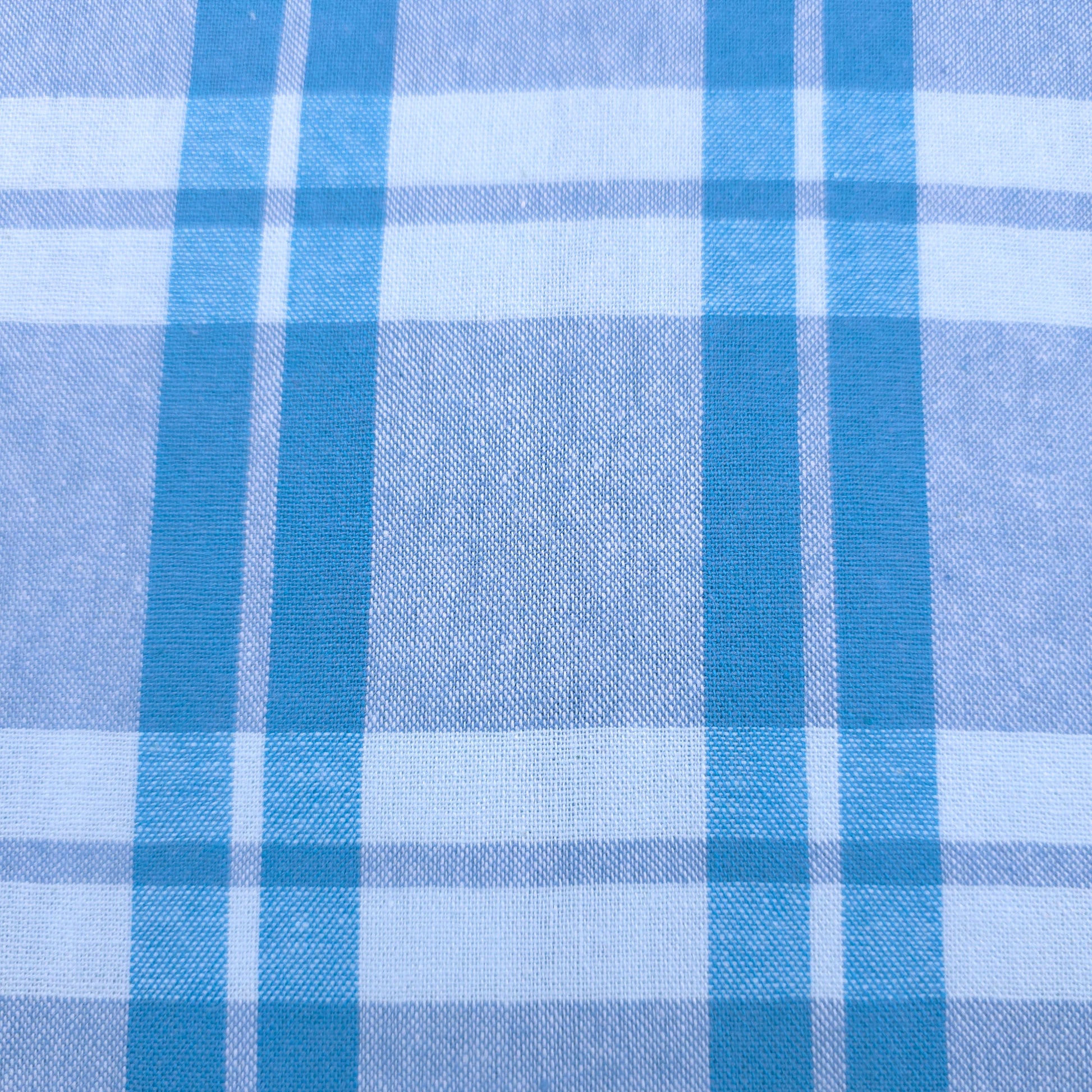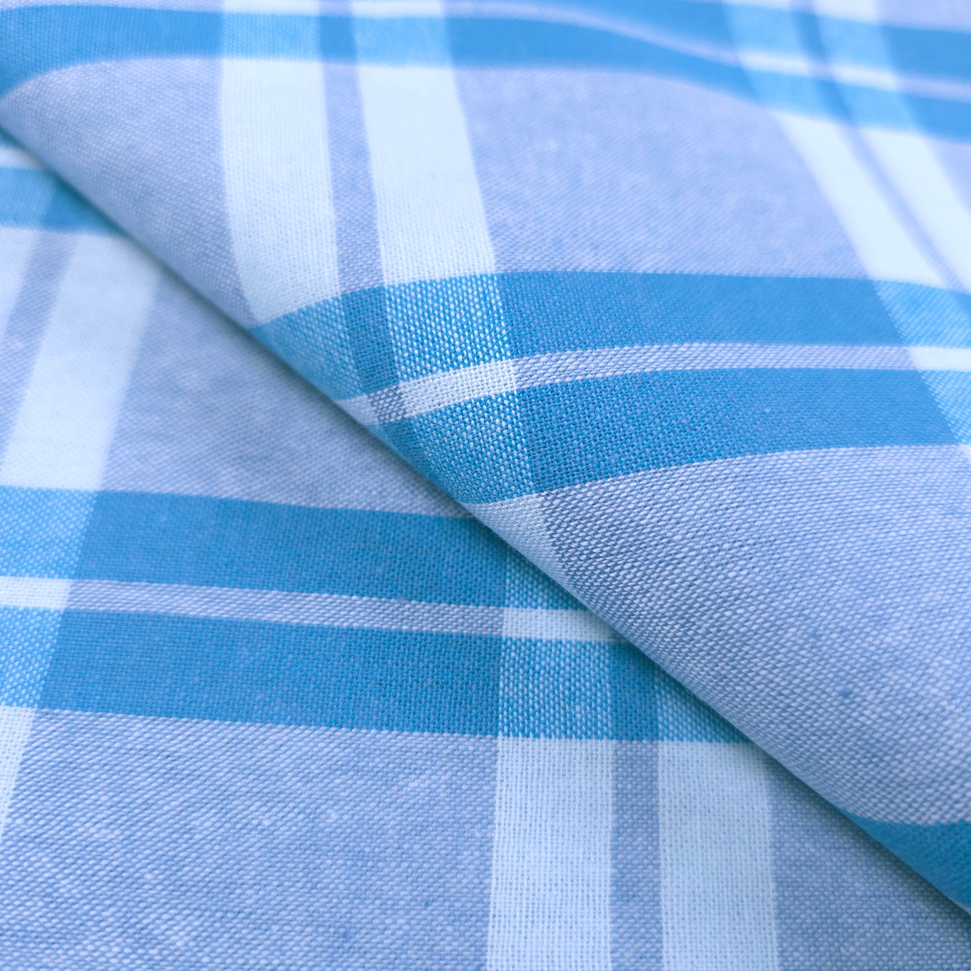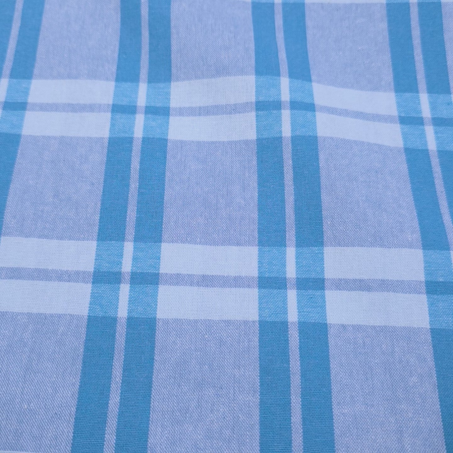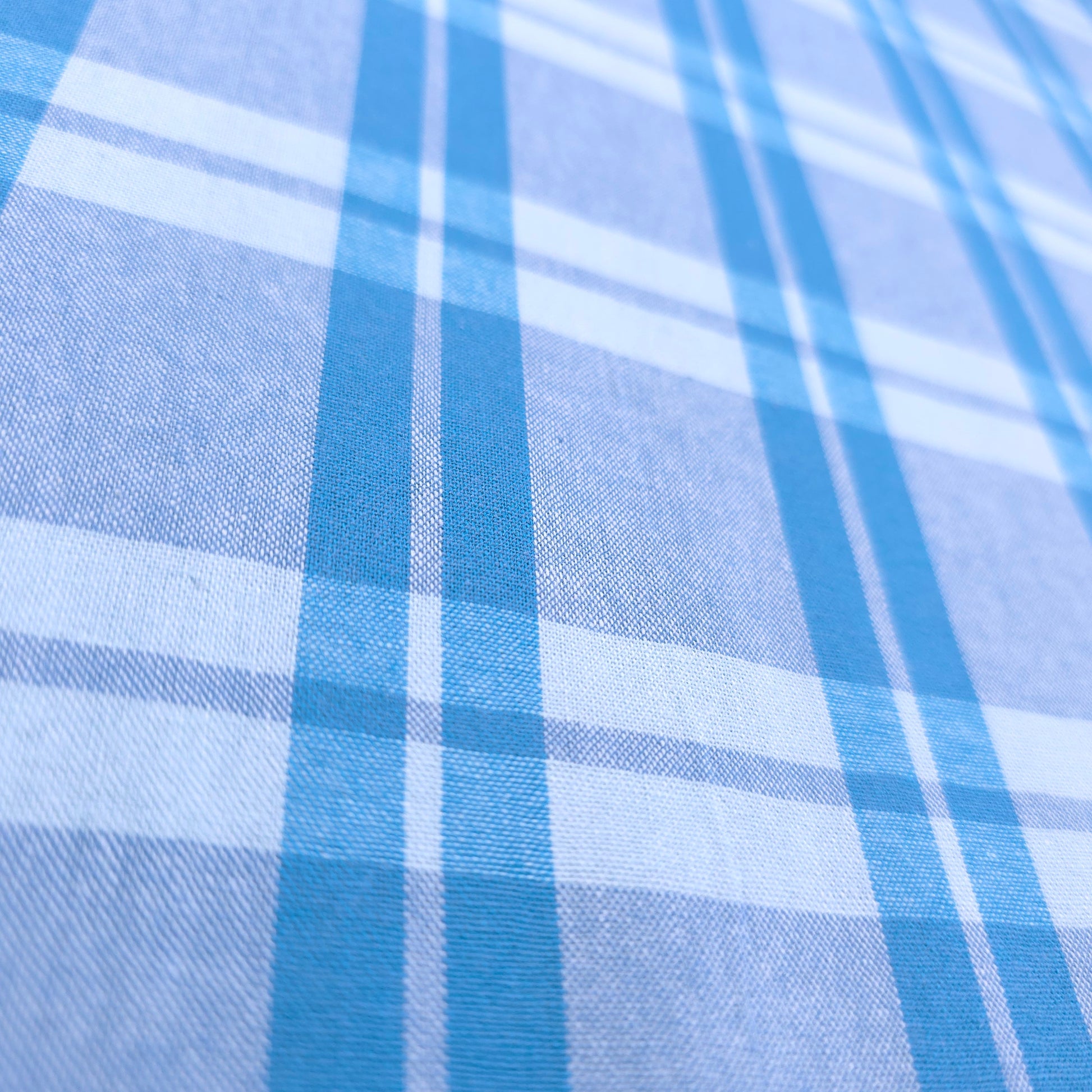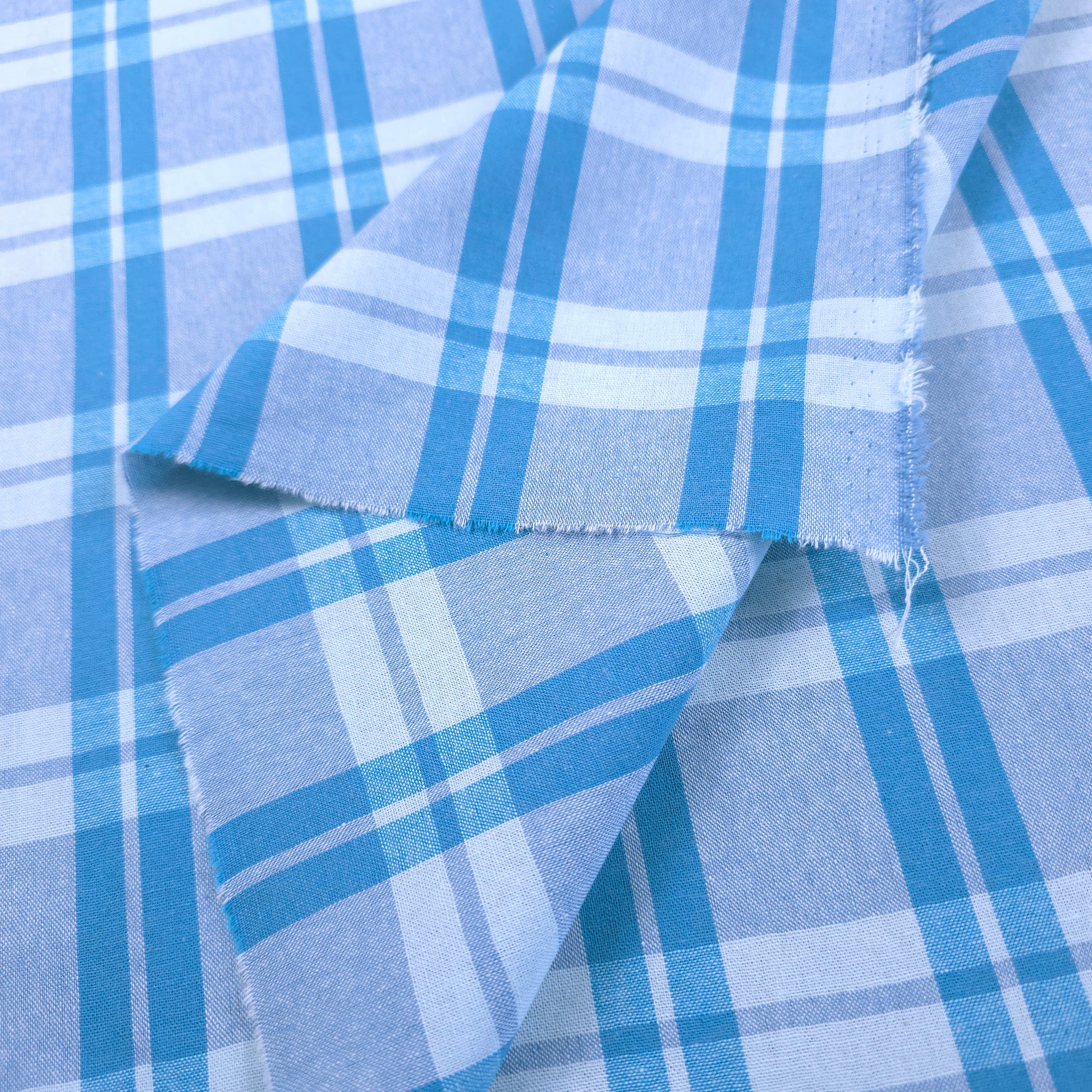 This 58-inch wide, lightweight cotton chambray fabric features a classic plaid pattern. The construction combines a light blue base with intersecting stripes of turquoise and white, creating a balanced and versatile design. The chambray weave provides a soft hand-feel and breathability, making it comfortable for apparel. This fabric is suitable for a variety of sewing and craft projects.