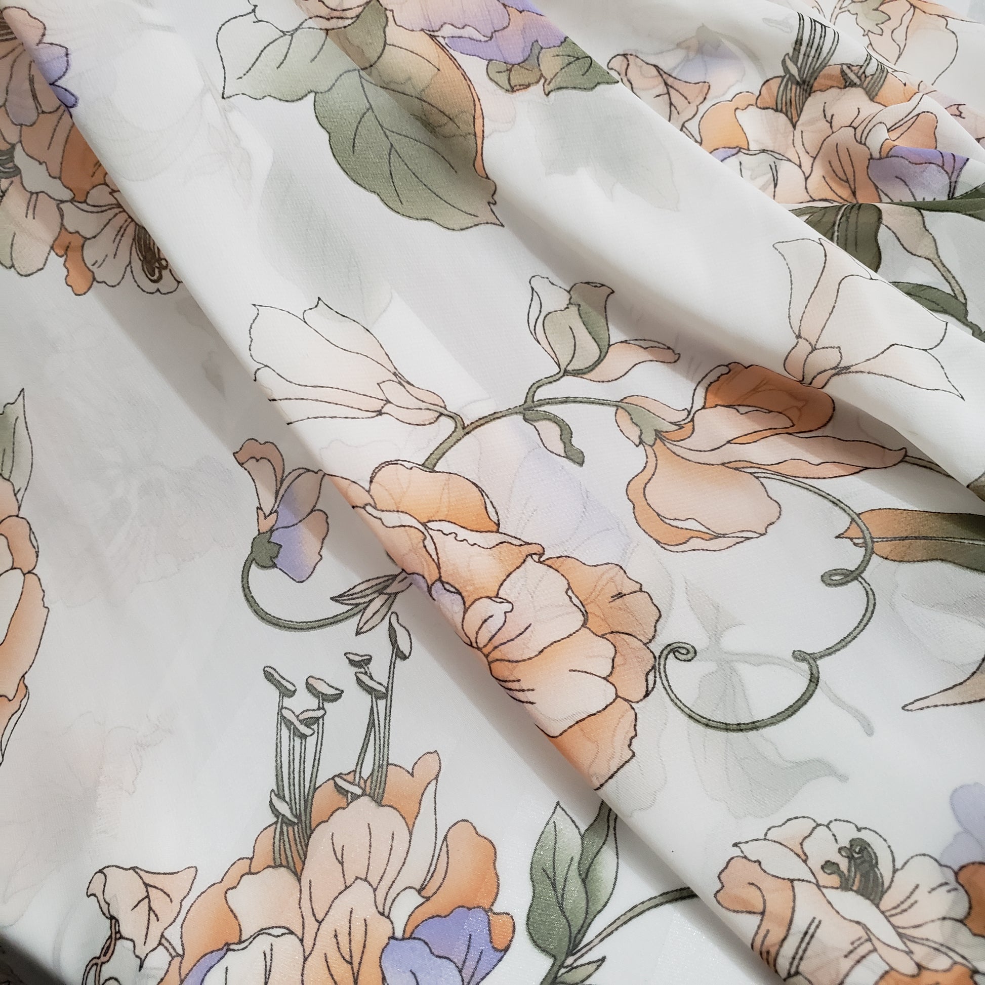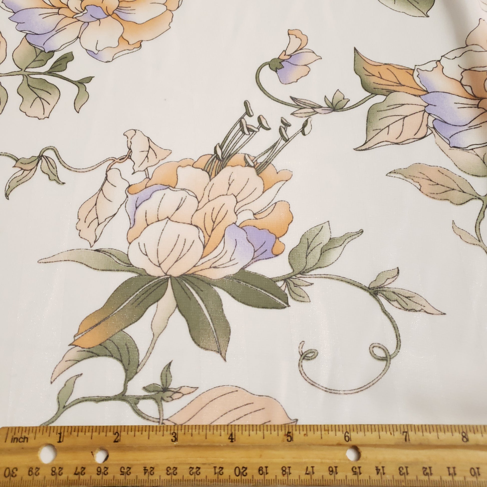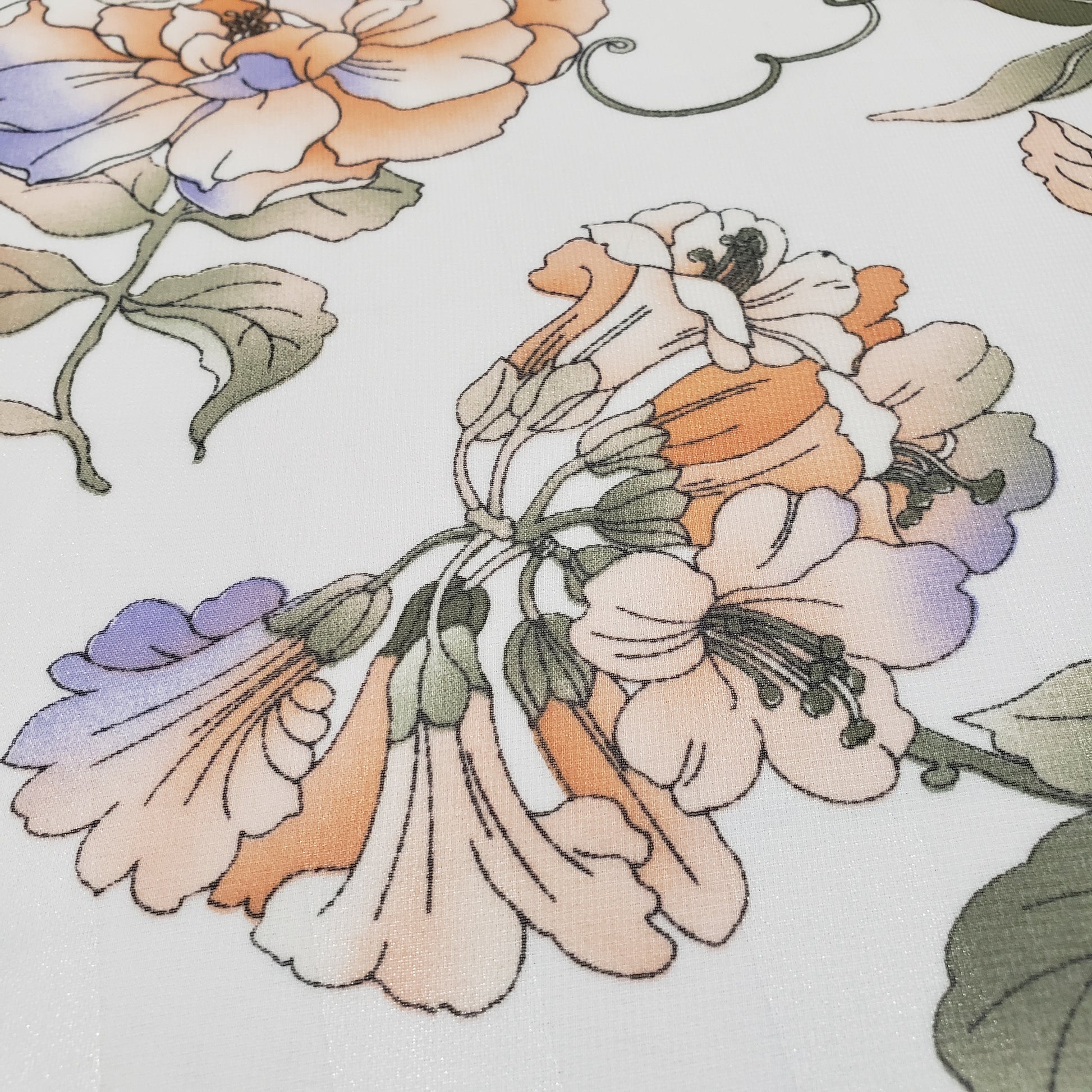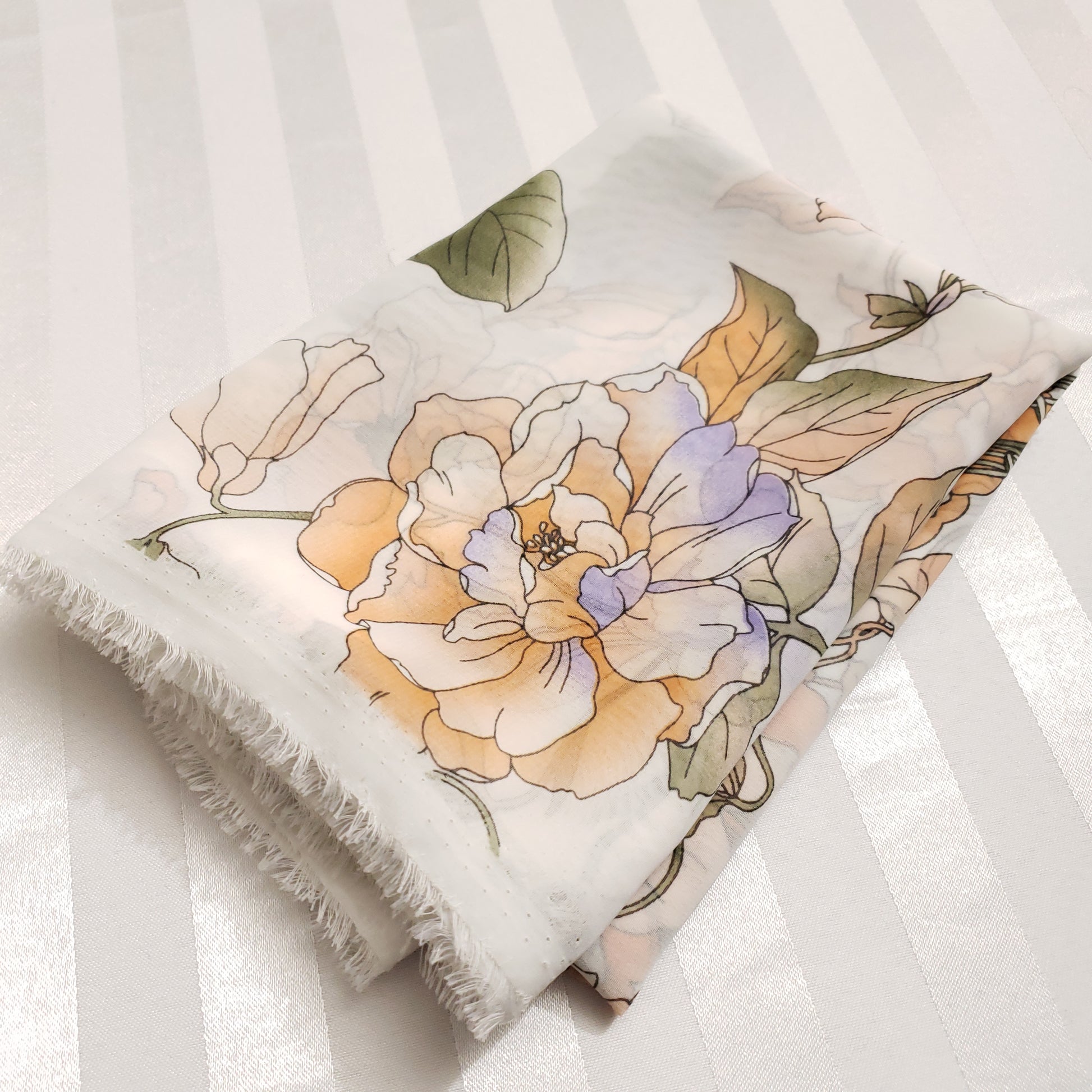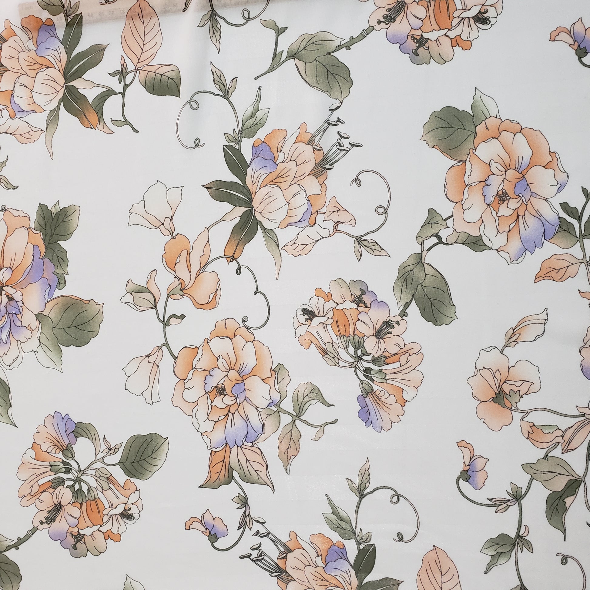 This Beautiful Chiffon fabric features a cascade of falling flowers in light blue, ivory and lilac pink. The design is set onto a midnight navy background. The flowers gather along the bottom border of the fabric to create a border. The border is about 9" wide and only appears on one of the selvages. This makes it ideal for garments or scarves. This is a light weight sheer fabric with an excellent drape. It has a cool touch with a soft surface texture. This is a unique find with limited stock.