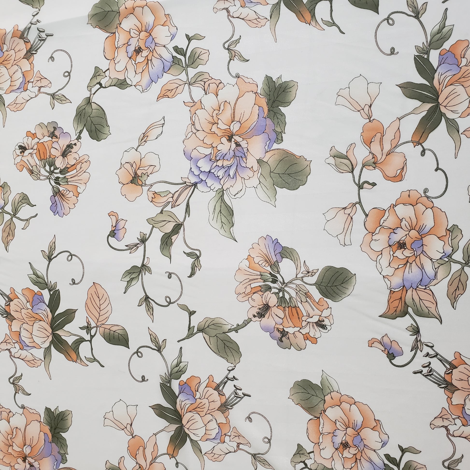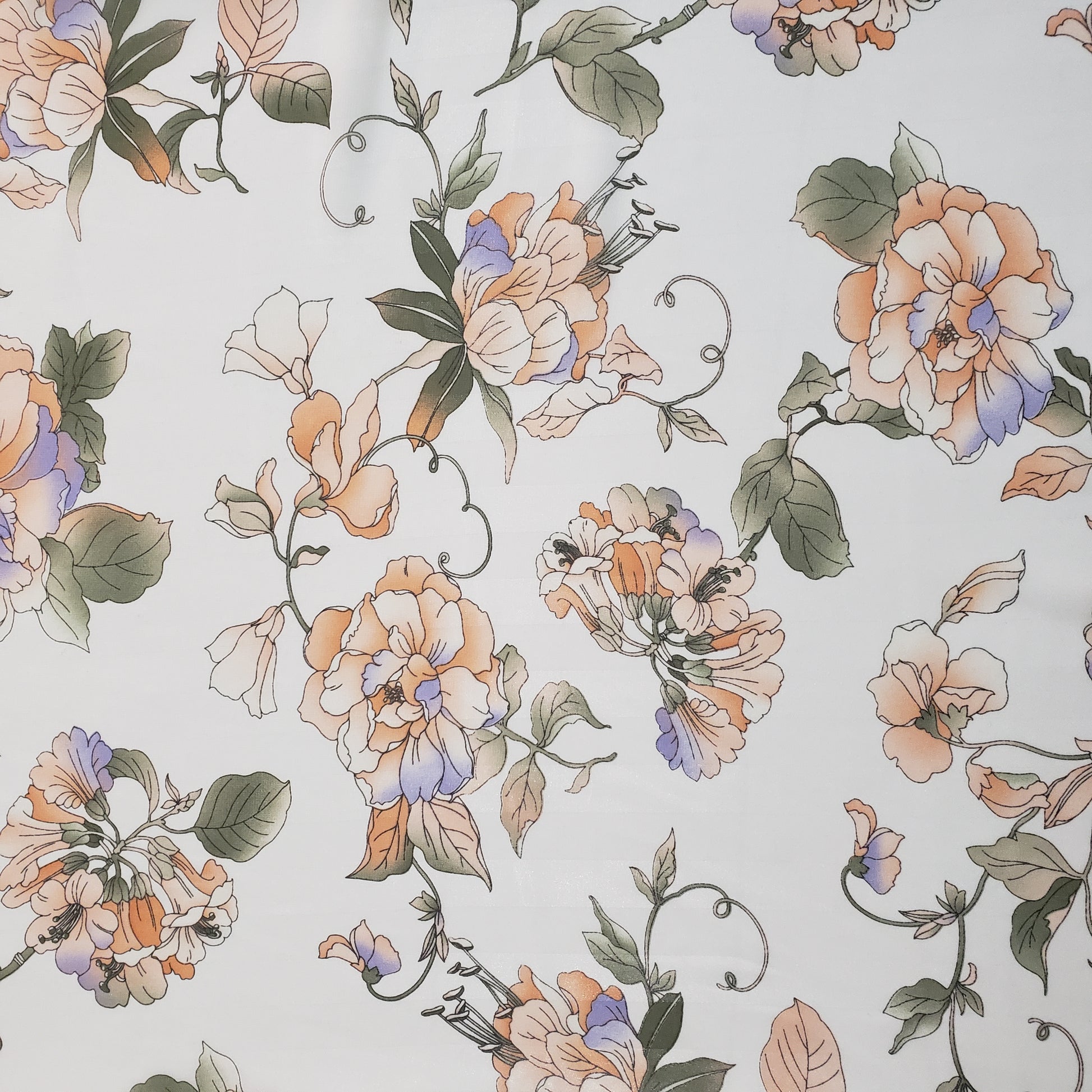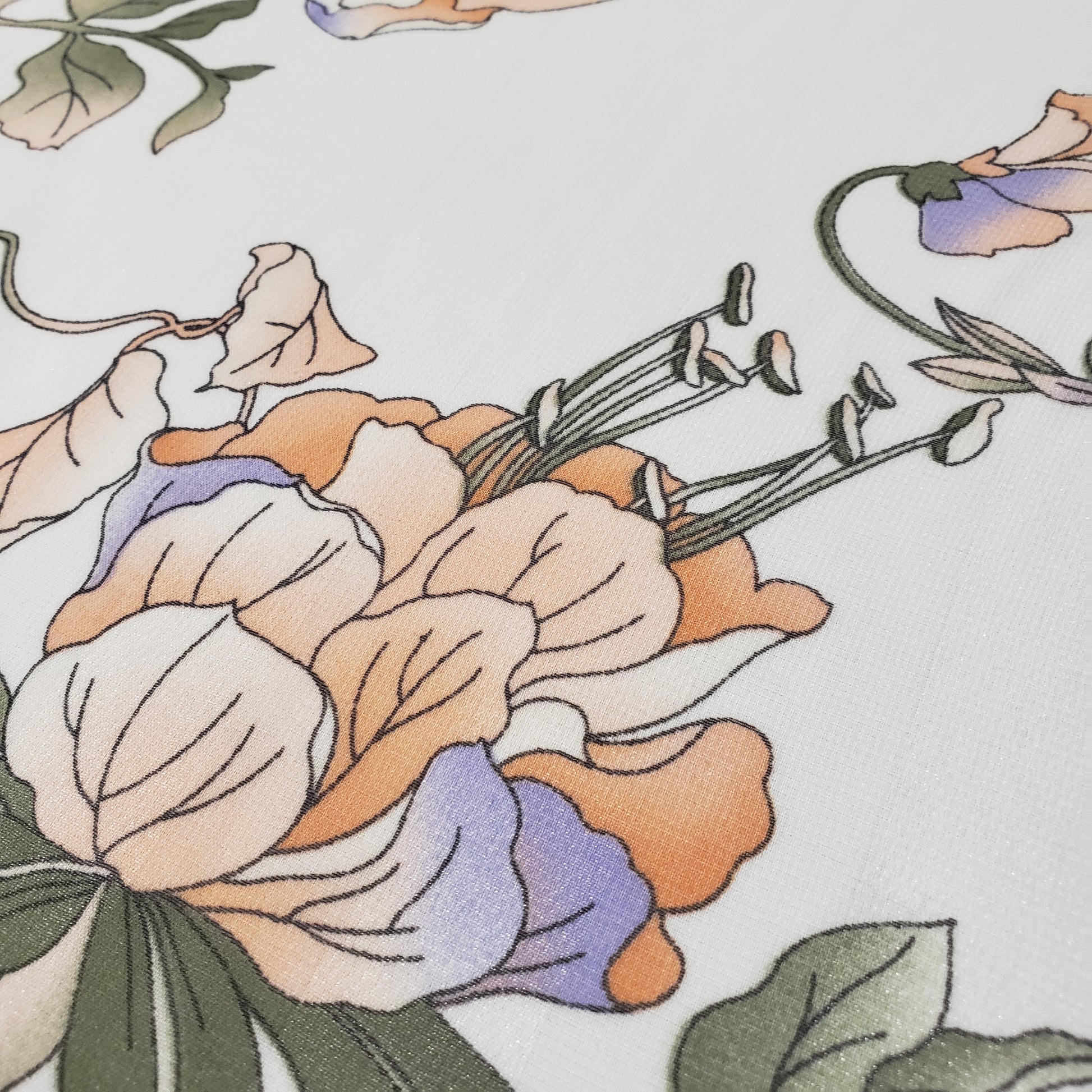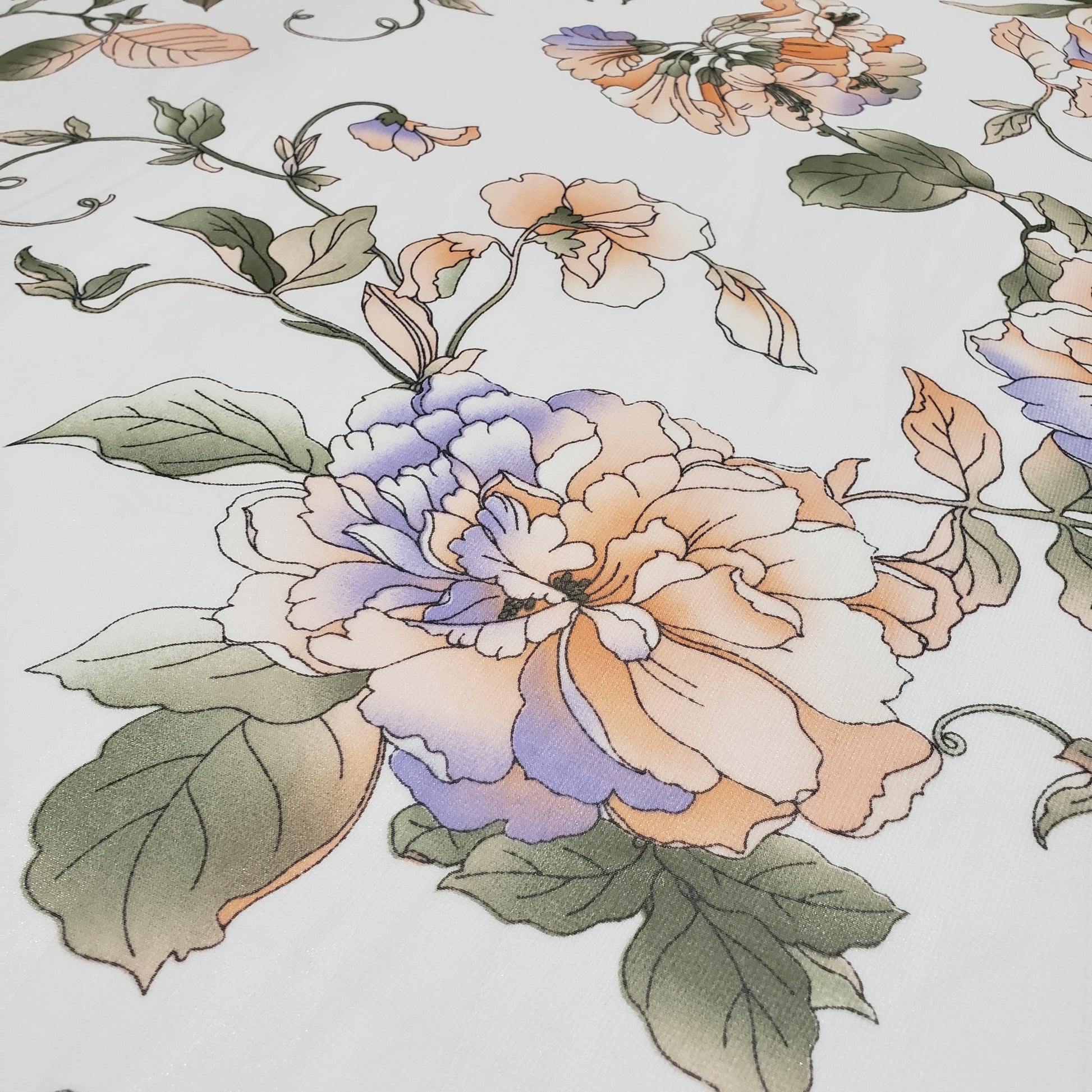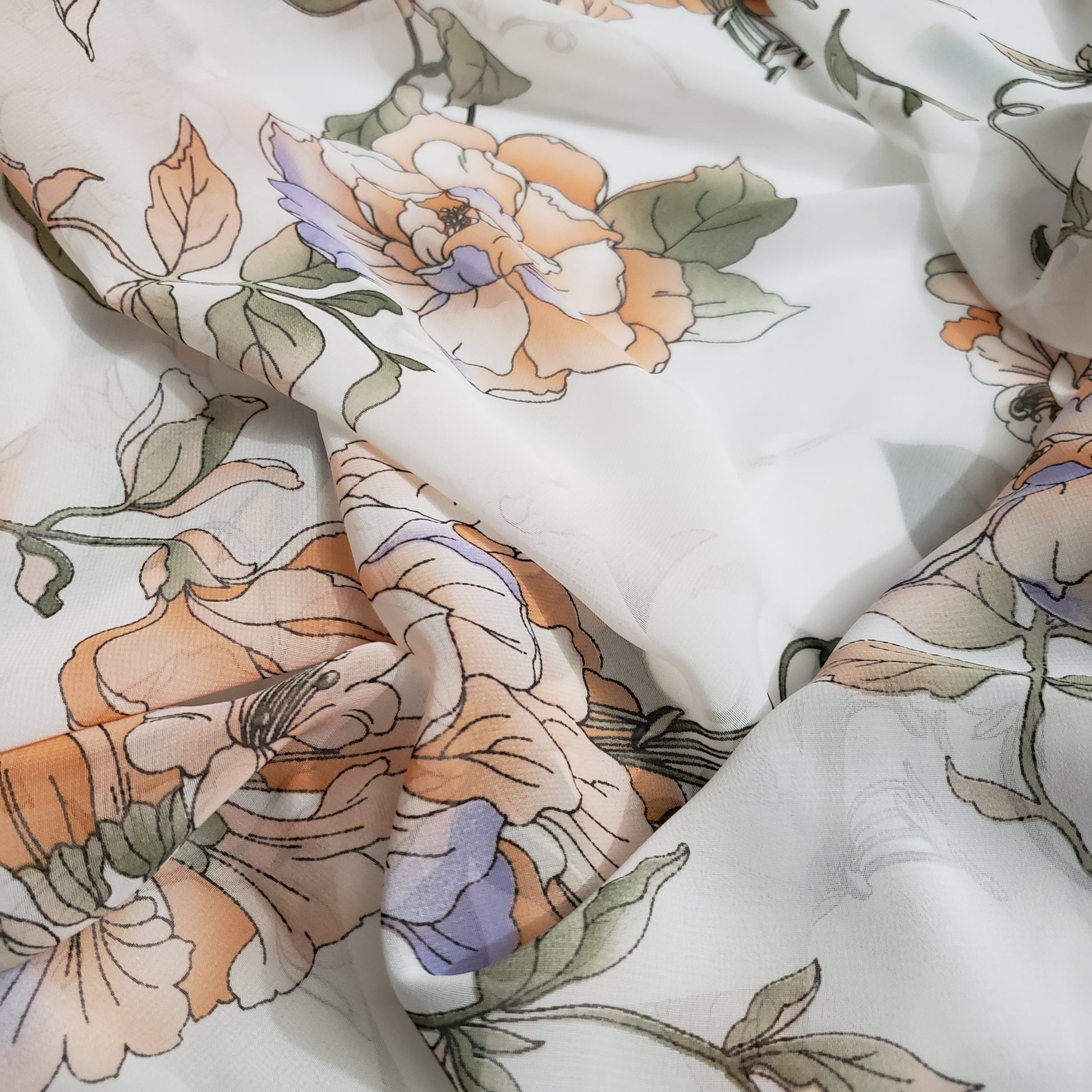 This Beautiful Chiffon fabric features a cascade of falling flowers in light blue, ivory and lilac pink. The design is set onto a midnight navy background. The flowers gather along the bottom border of the fabric to create a border. The border is about 9" wide and only appears on one of the selvages. This makes it ideal for garments or scarves. This is a light weight sheer fabric with an excellent drape. It has a cool touch with a soft surface texture. This is a unique find with limited stock.